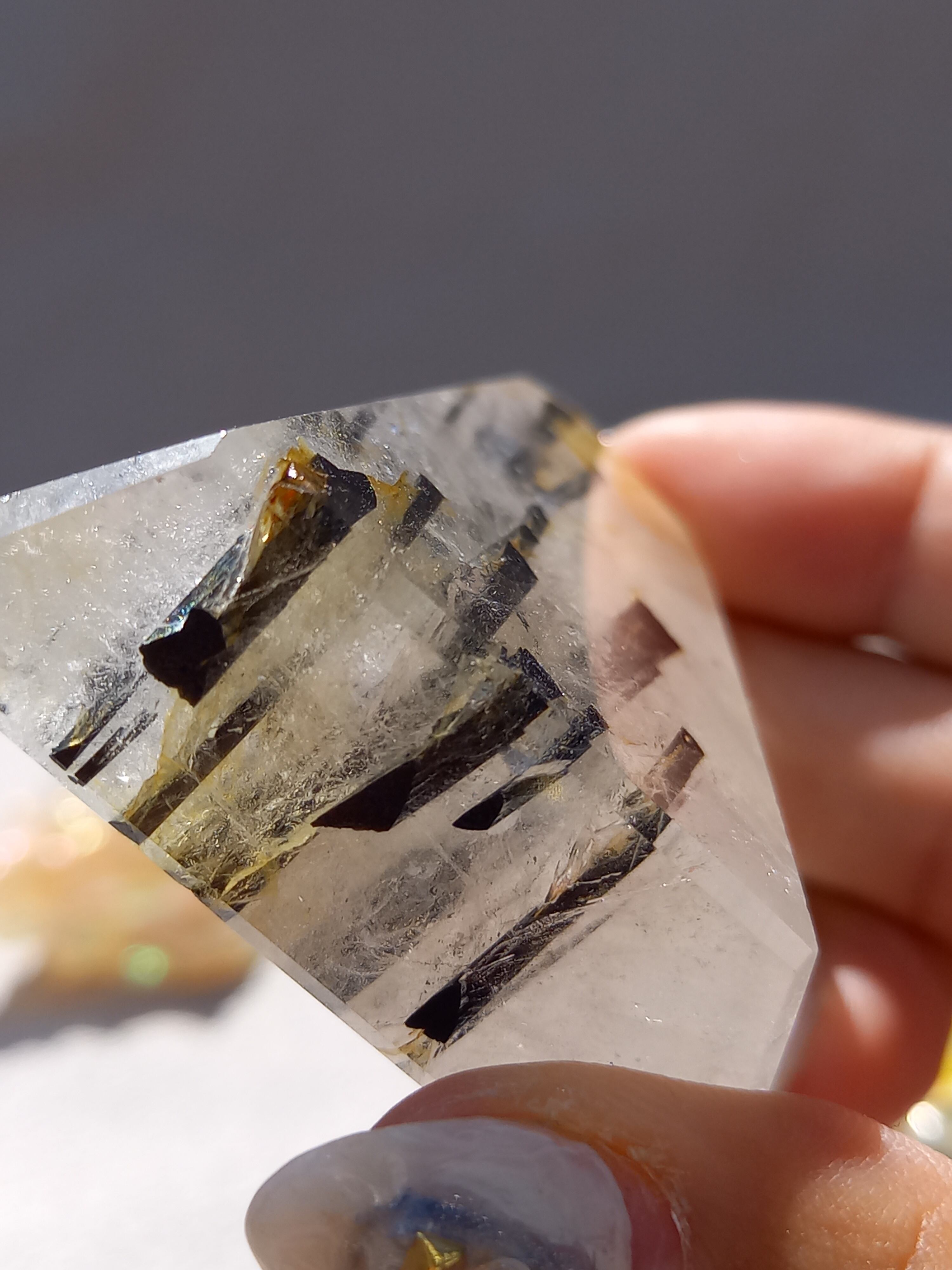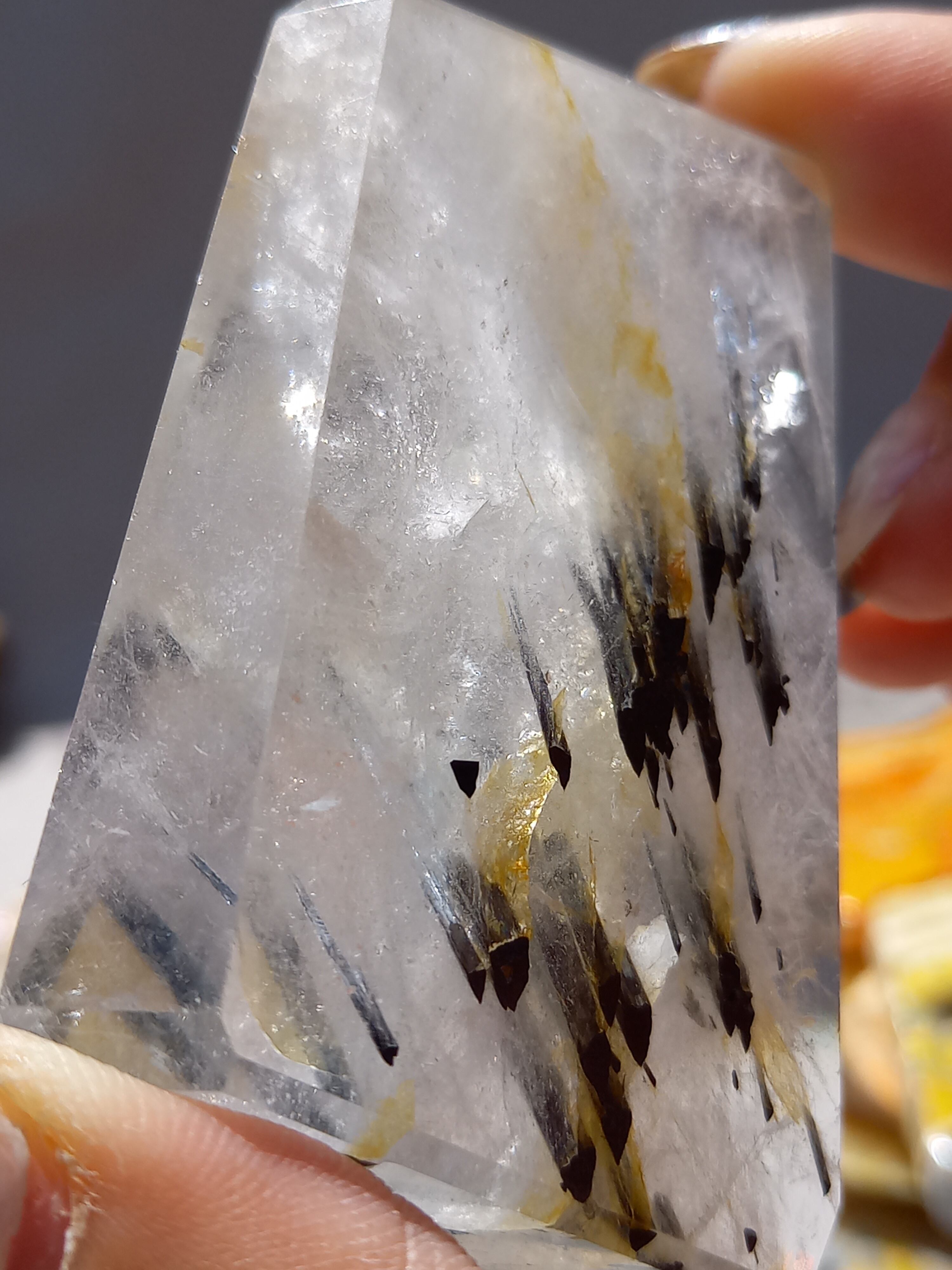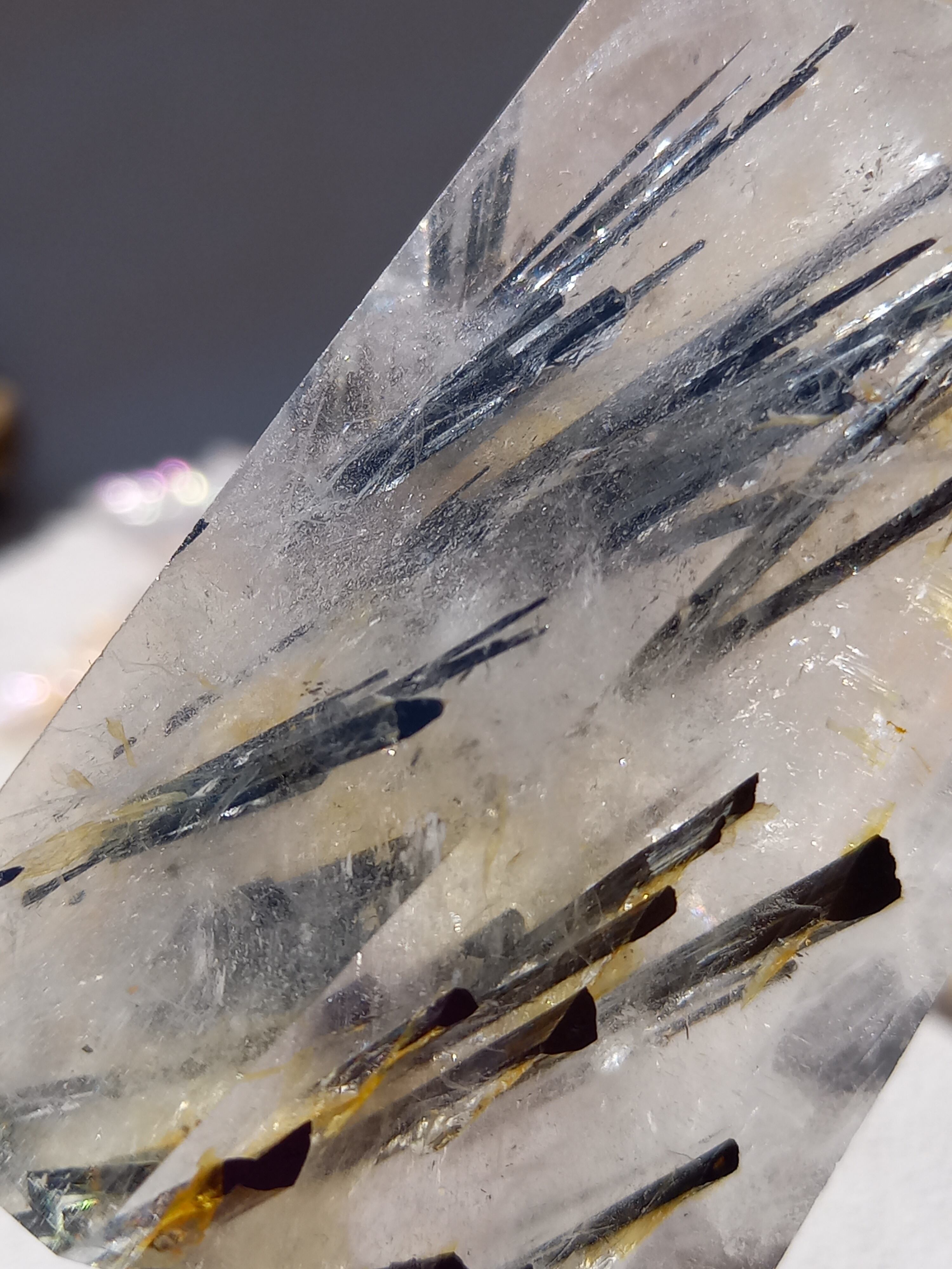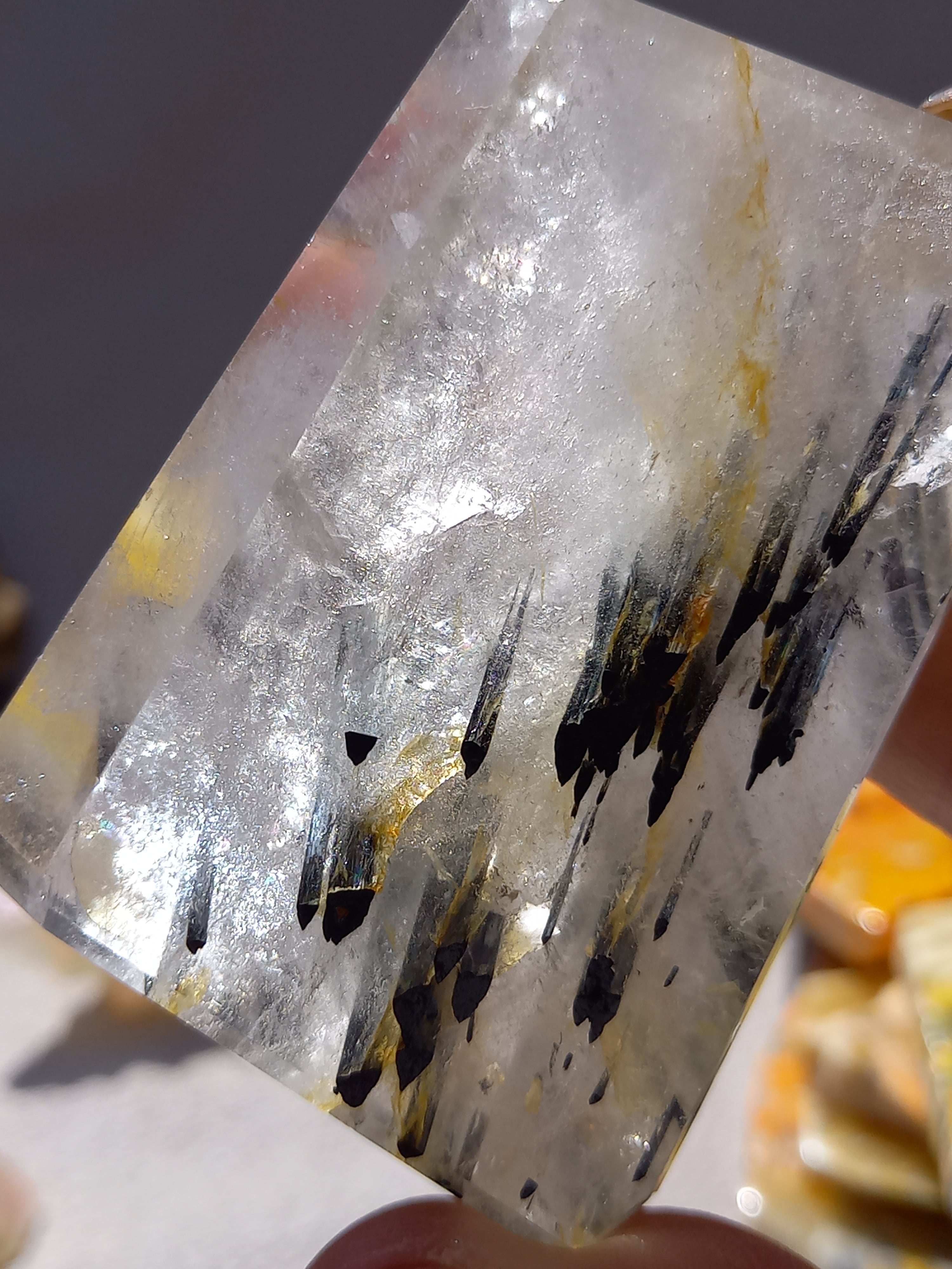透明感ある水晶に、力強く入り込んだブラックトルマリンがかっこいいです。トルマリンの周りにはシラーや煌めきも出ていて、素敵なフリーフォームになります。