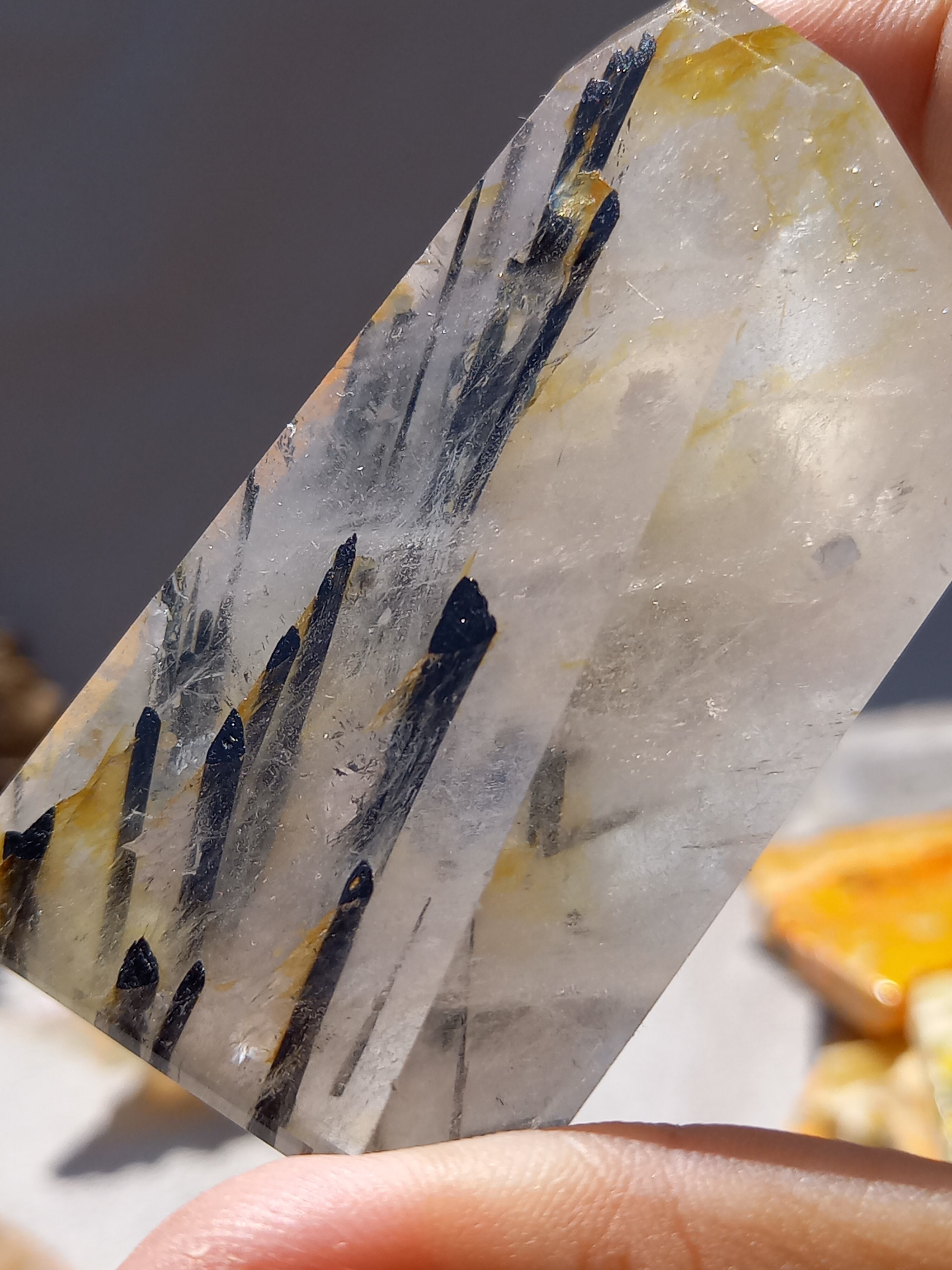太いブラックトルマリンが沢山と入り込んだ水晶フリーフォームです。