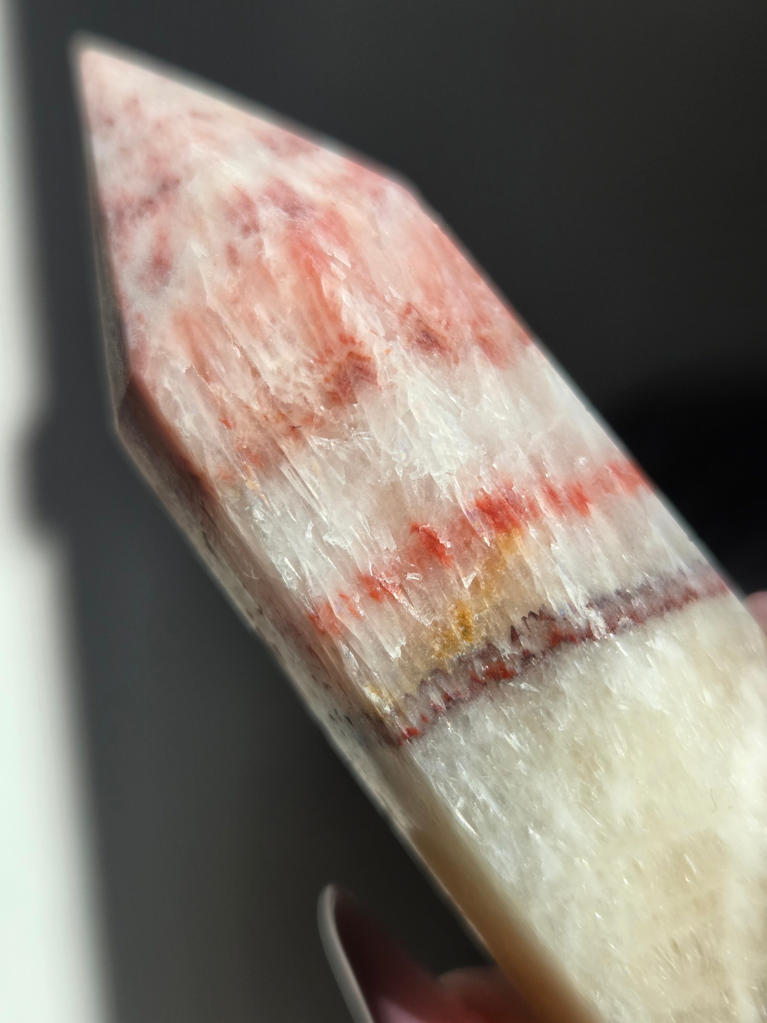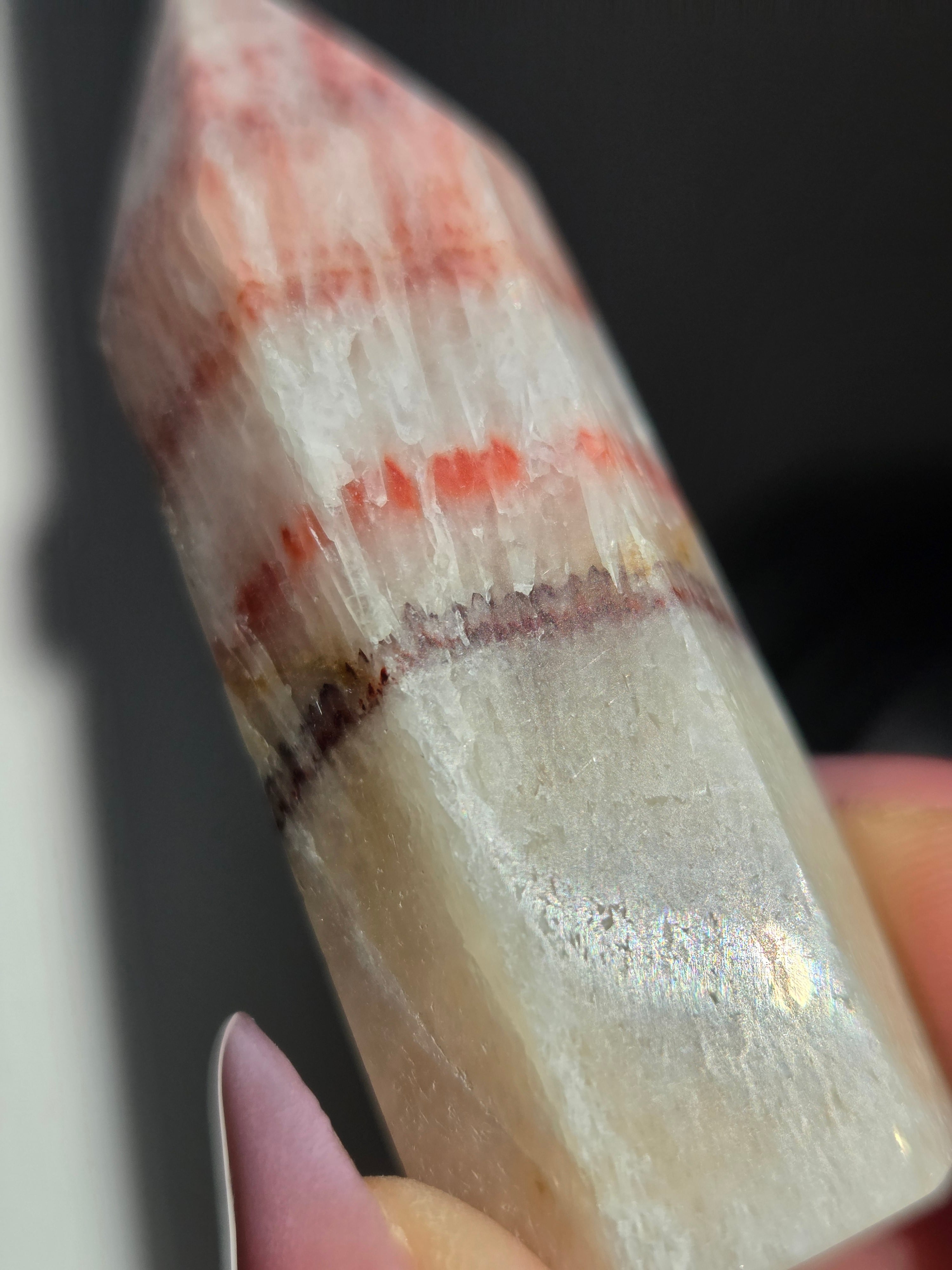 ポークストーンとは、カルサイトの一種で、赤色の部分は酸化鉄の影響で色づいており、アラゴナイト化していると言われてます。