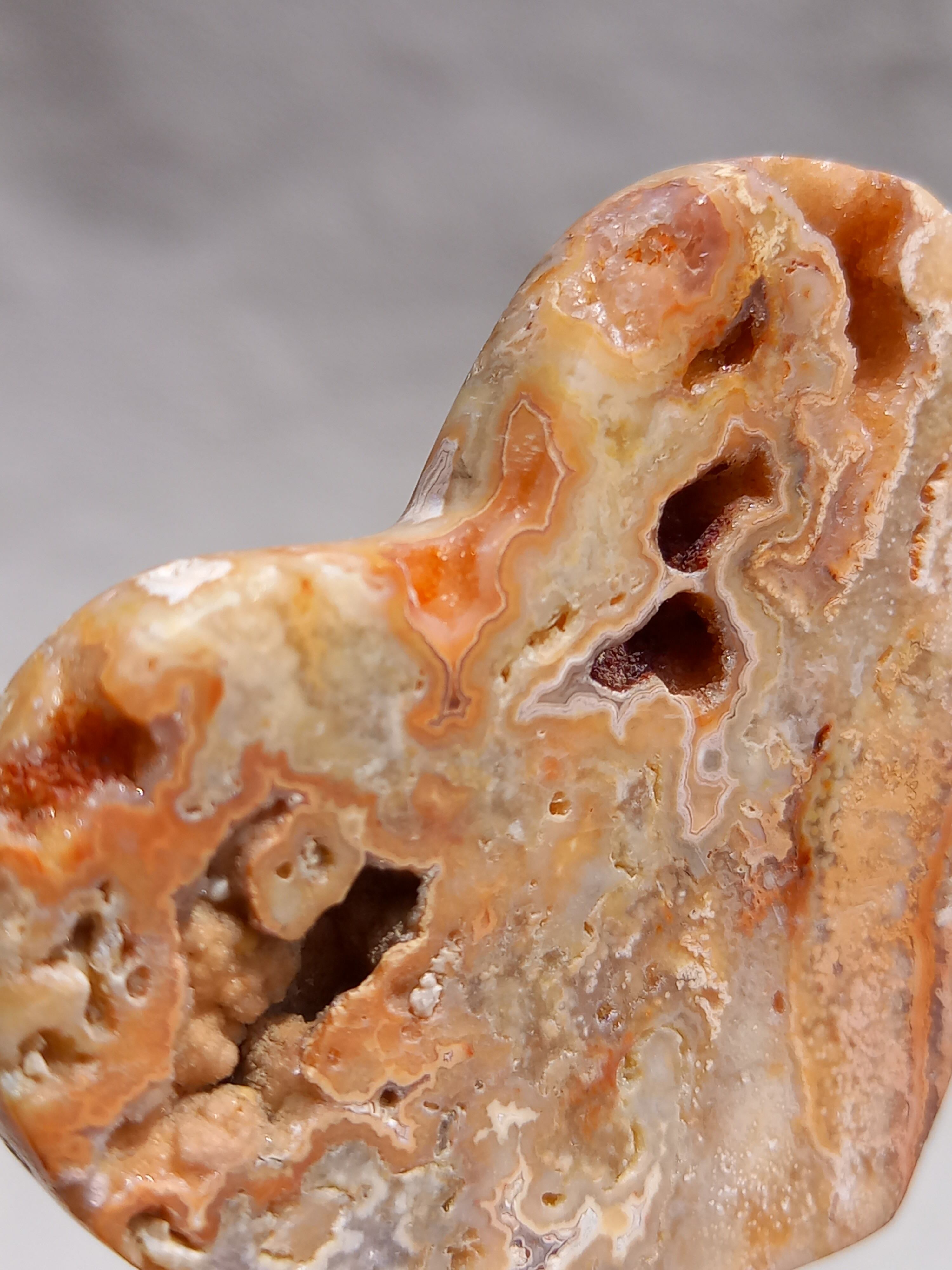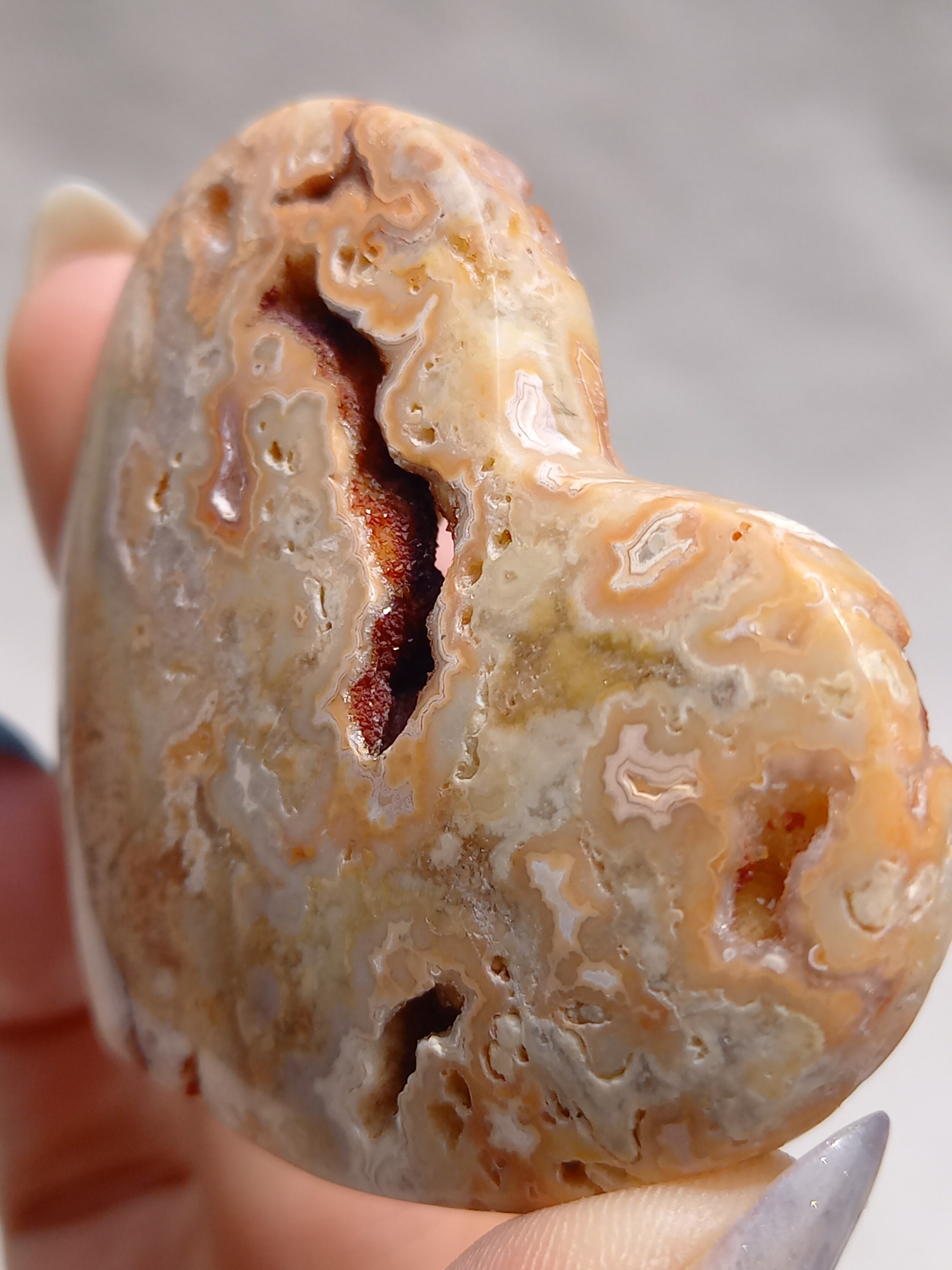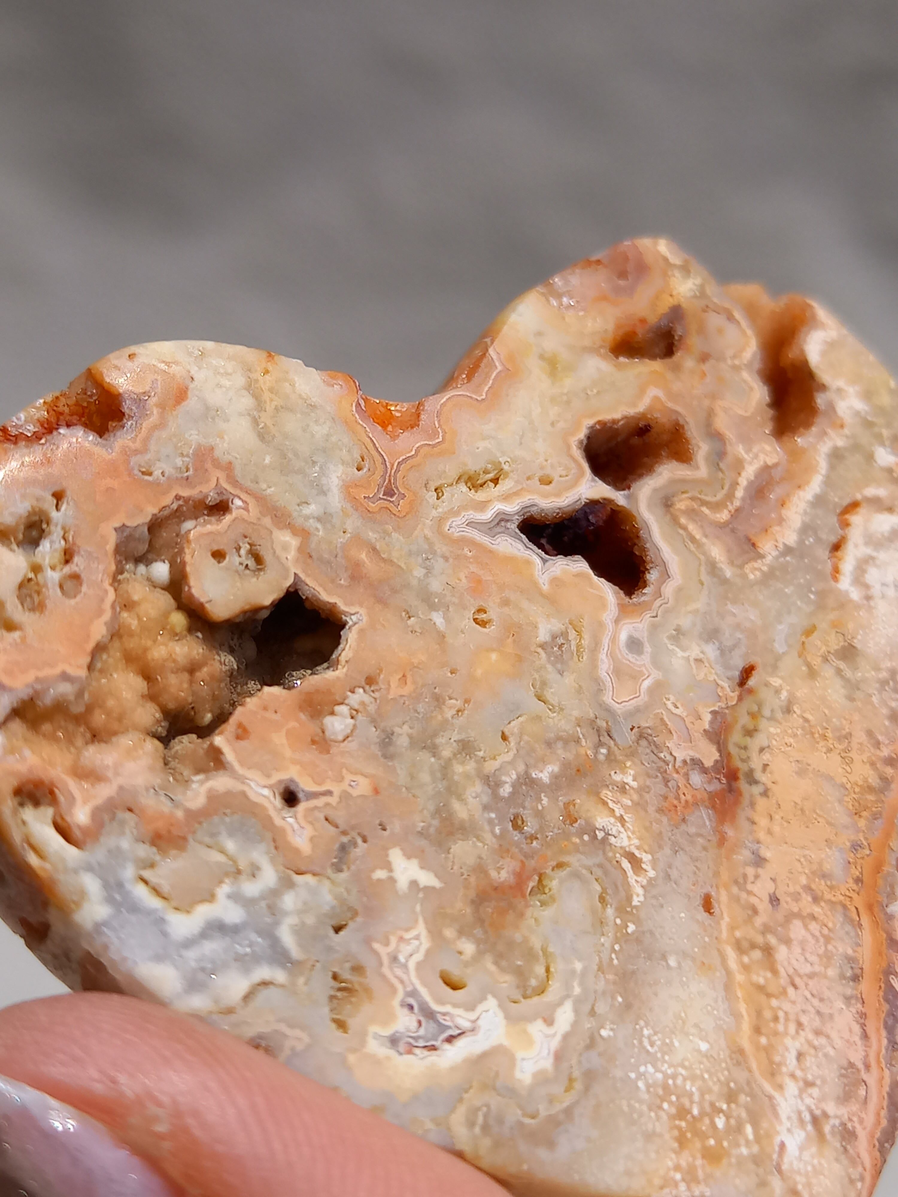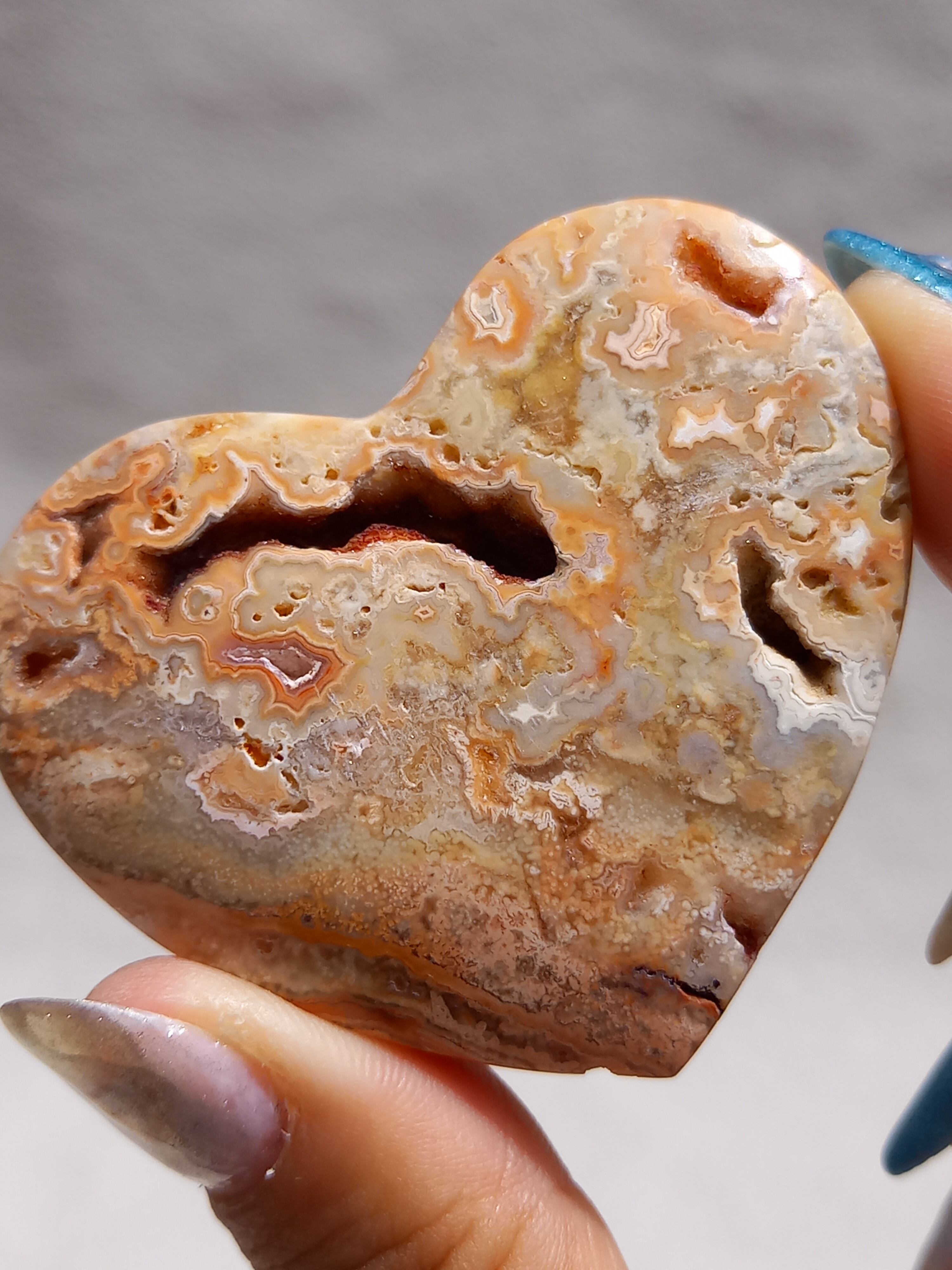 クレイジーレースアゲートは、ヒーリングストーンの一つで、幾層にも重なった模様から発せられる些細な波動が心身にやさしく働きかけ、持ち主の精神的な痛みを和らげ、感情的な負担を解放してくれるといわれています。