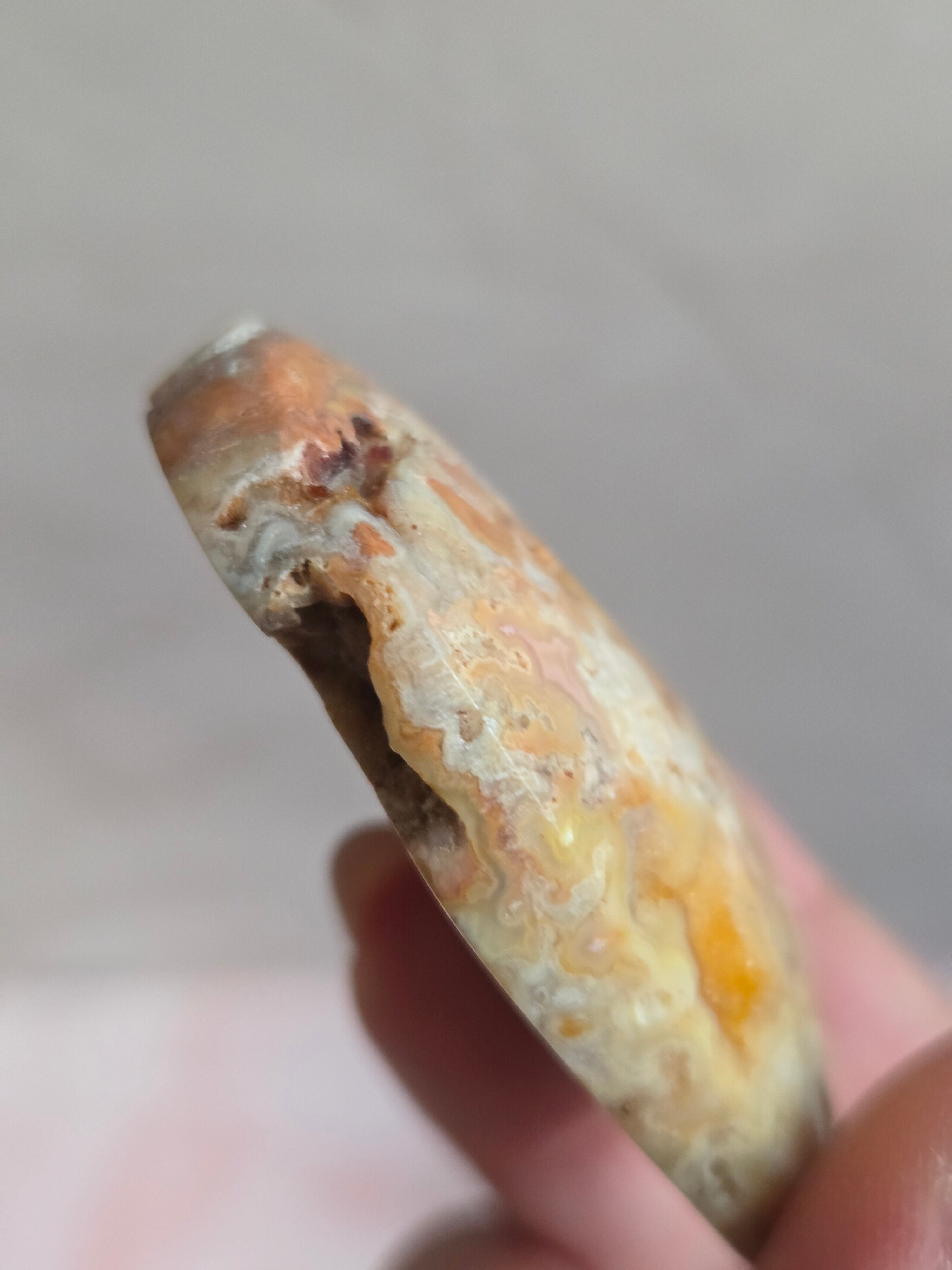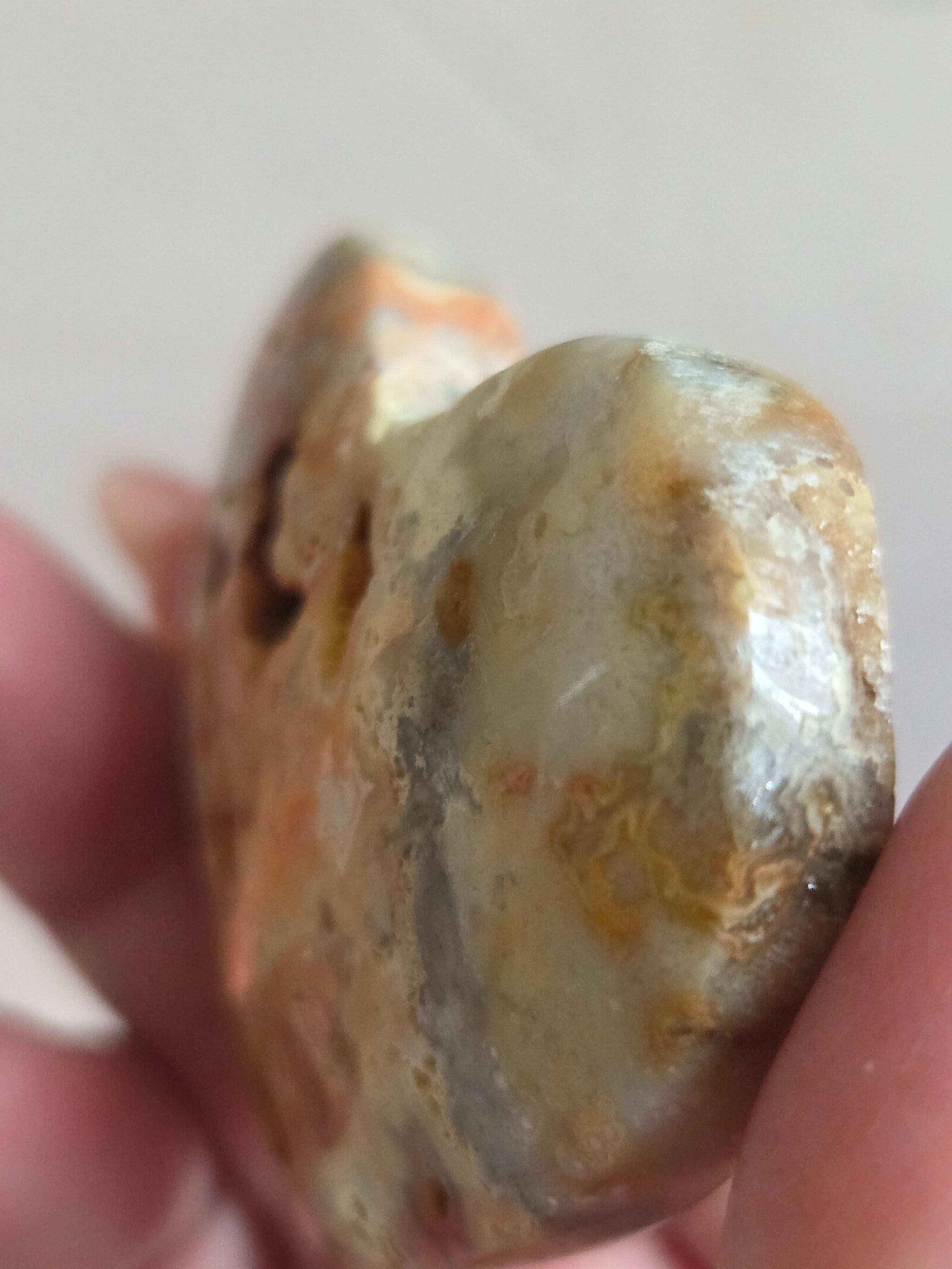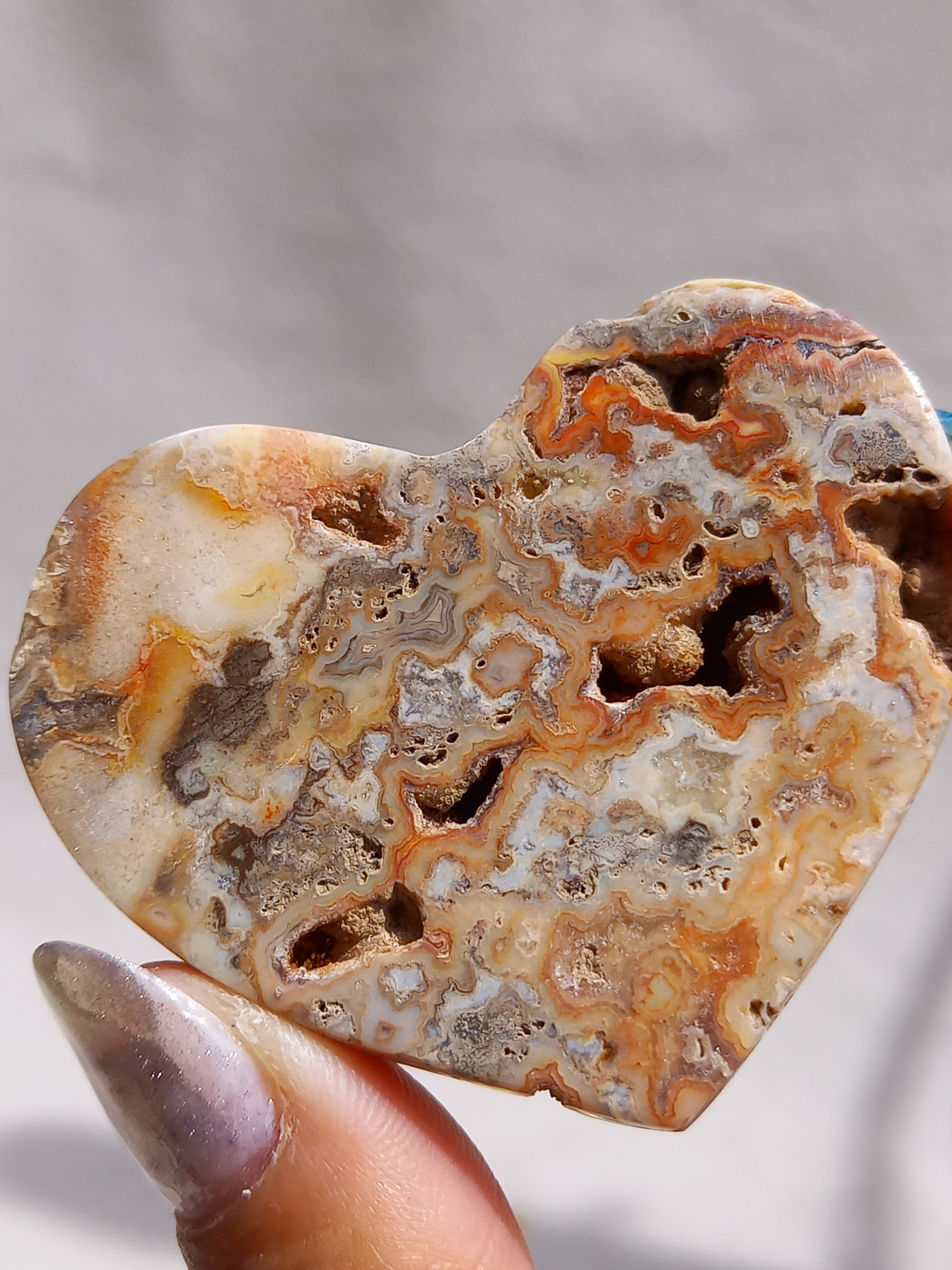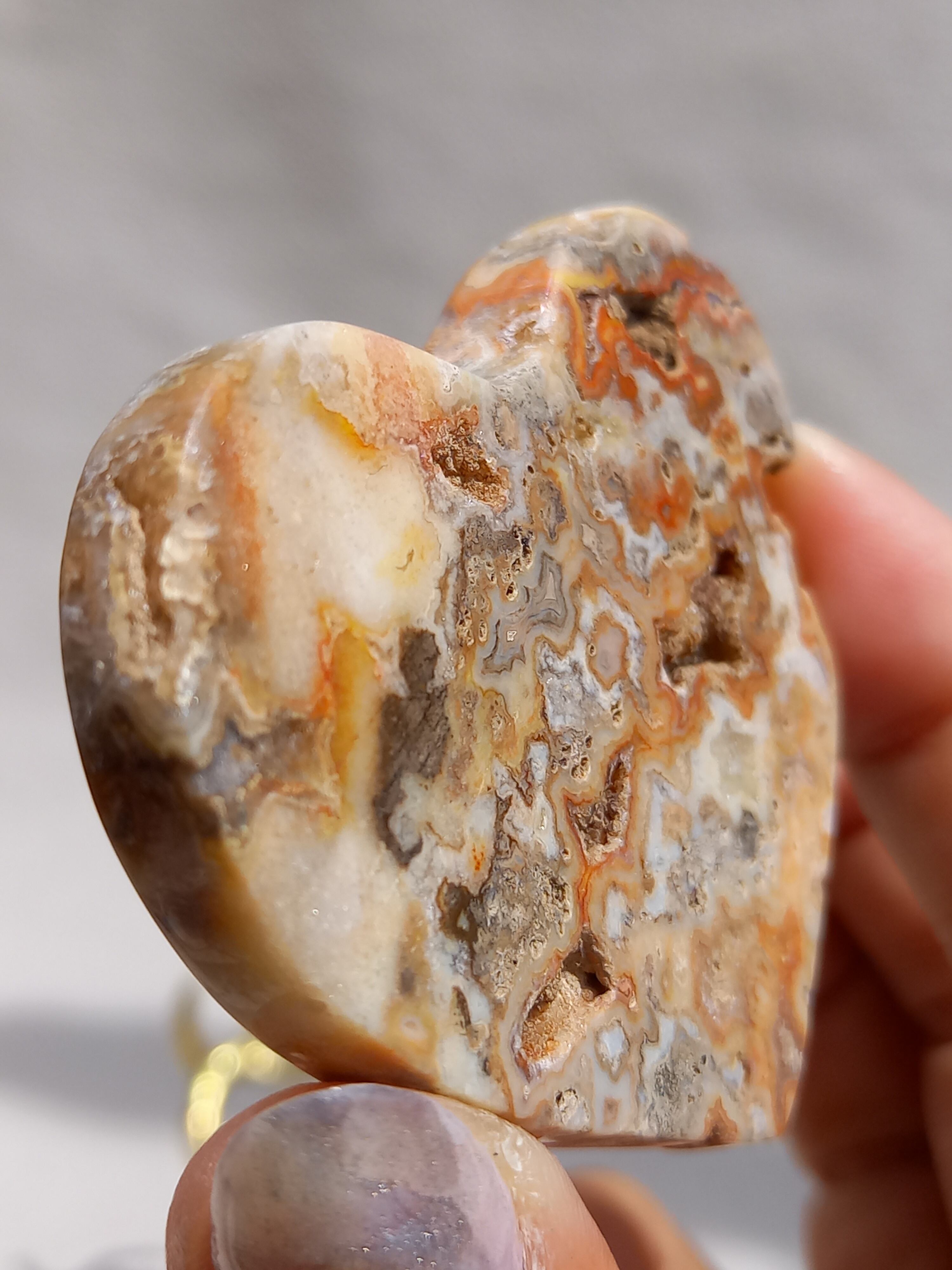 クレイジーレースアゲートは、ヒーリングストーンの一つで、幾層にも重なった模様から発せられる些細な波動が心身にやさしく働きかけ、持ち主の精神的な痛みを和らげ、感情的な負担を解放してくれるといわれています。