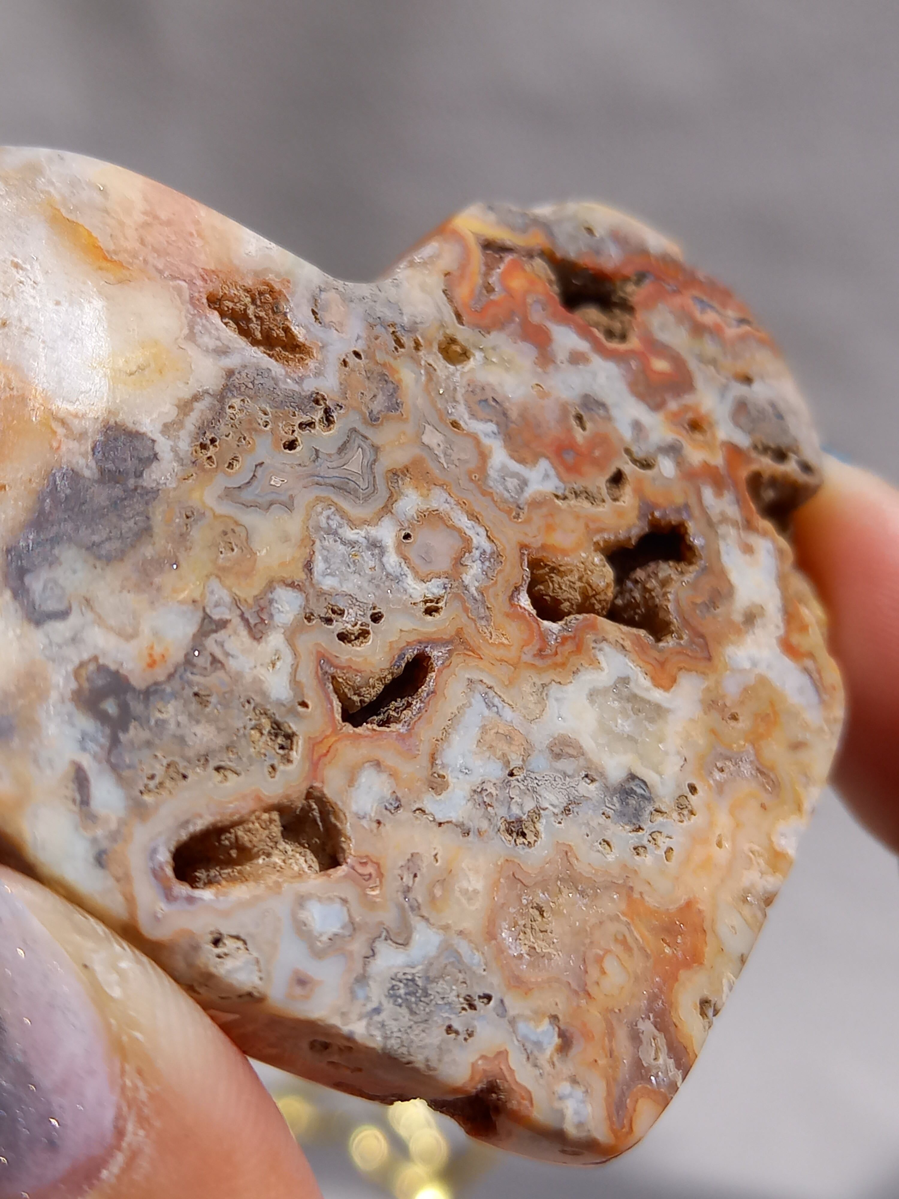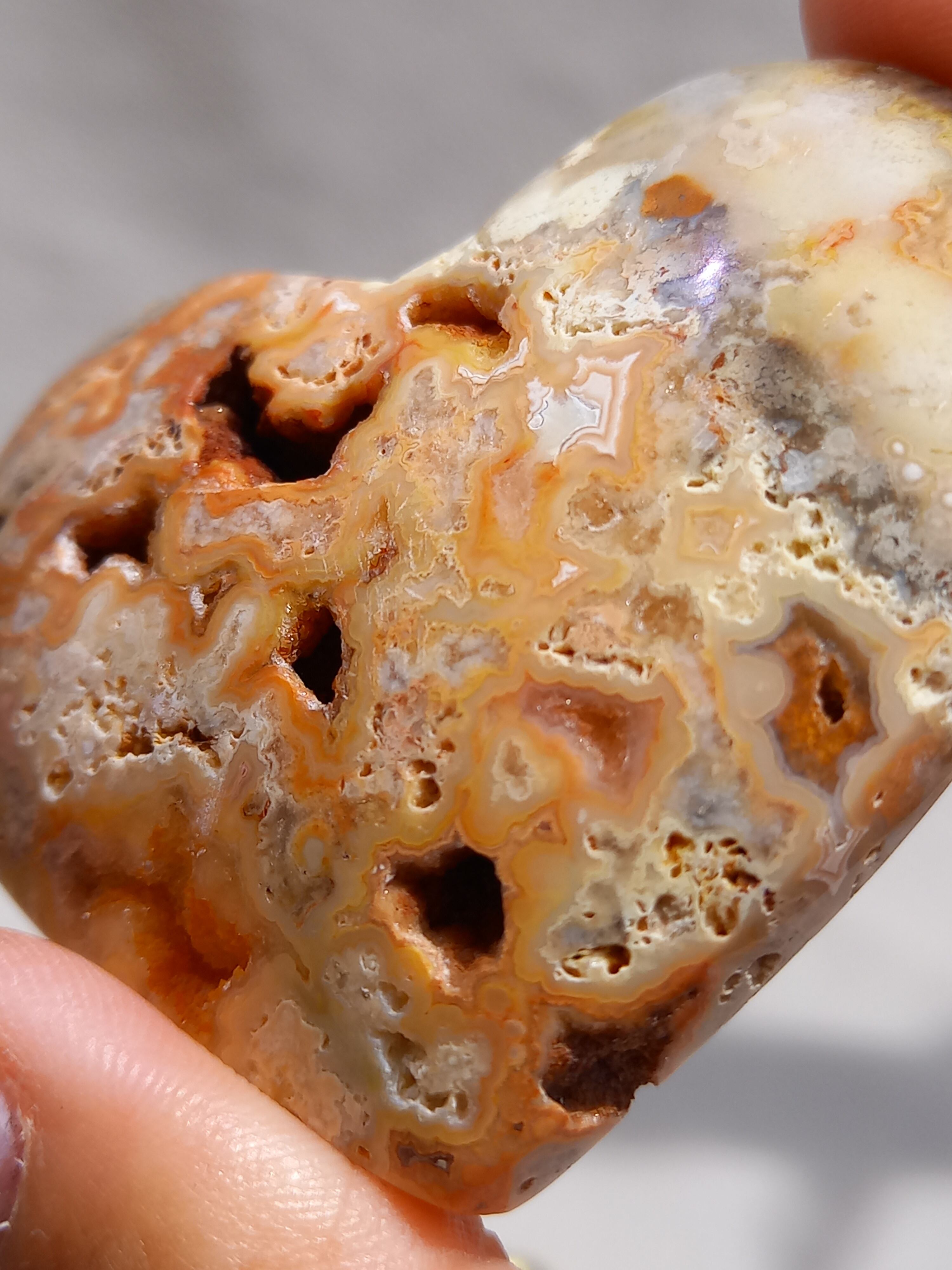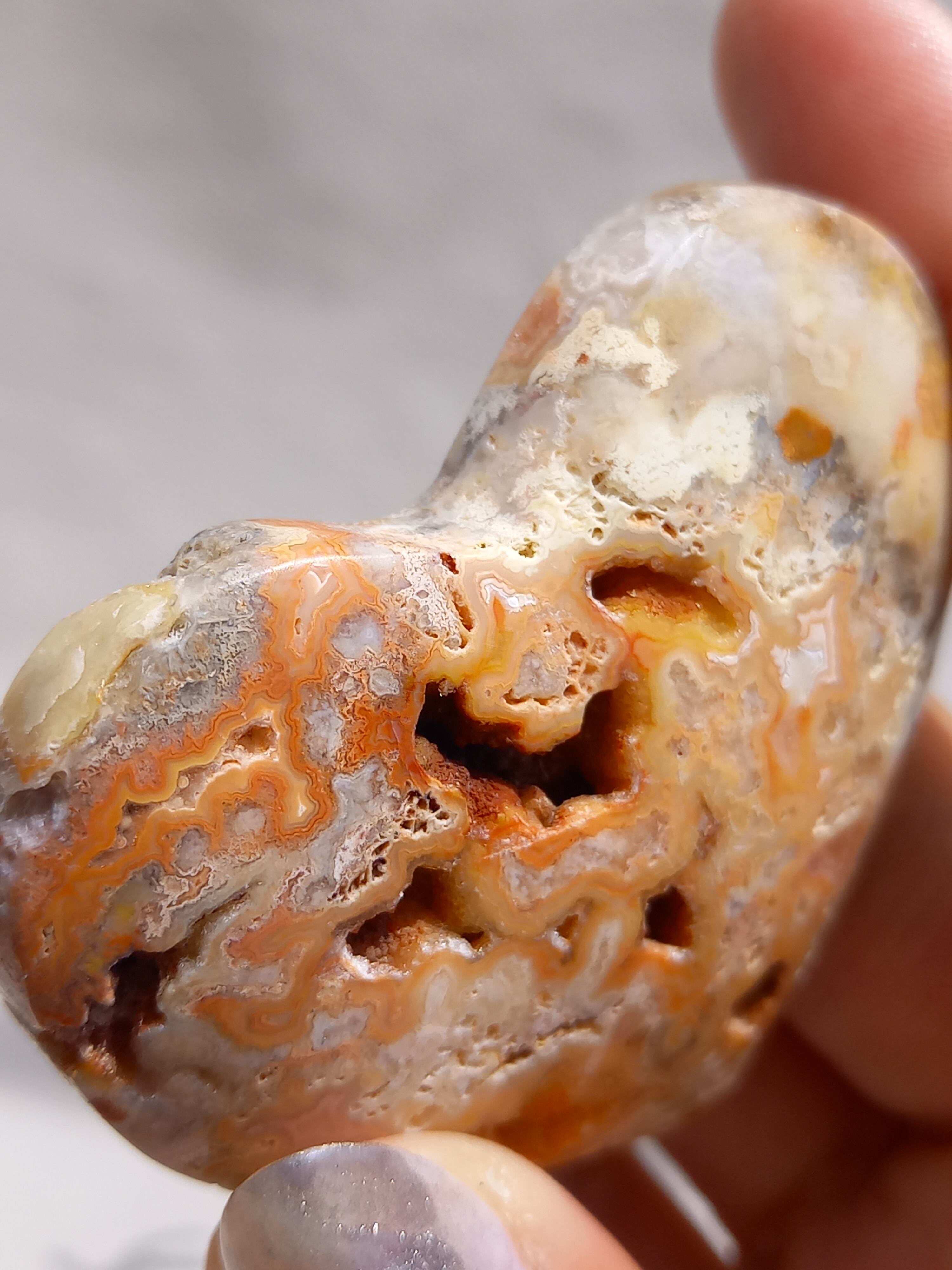 クレイジーレースアゲートは、ヒーリングストーンの一つで、幾層にも重なった模様から発せられる些細な波動が心身にやさしく働きかけ、持ち主の精神的な痛みを和らげ、感情的な負担を解放してくれるといわれています。