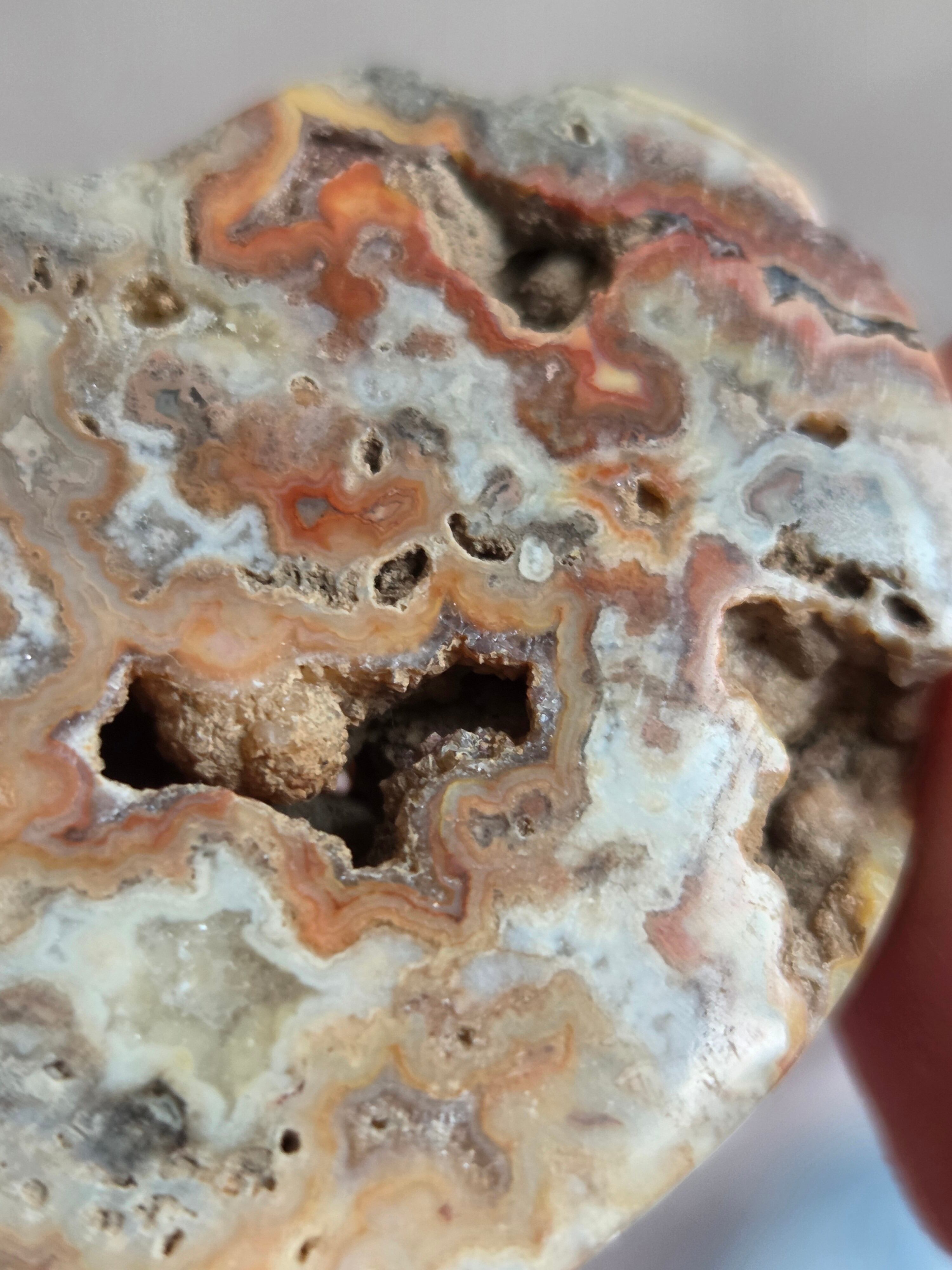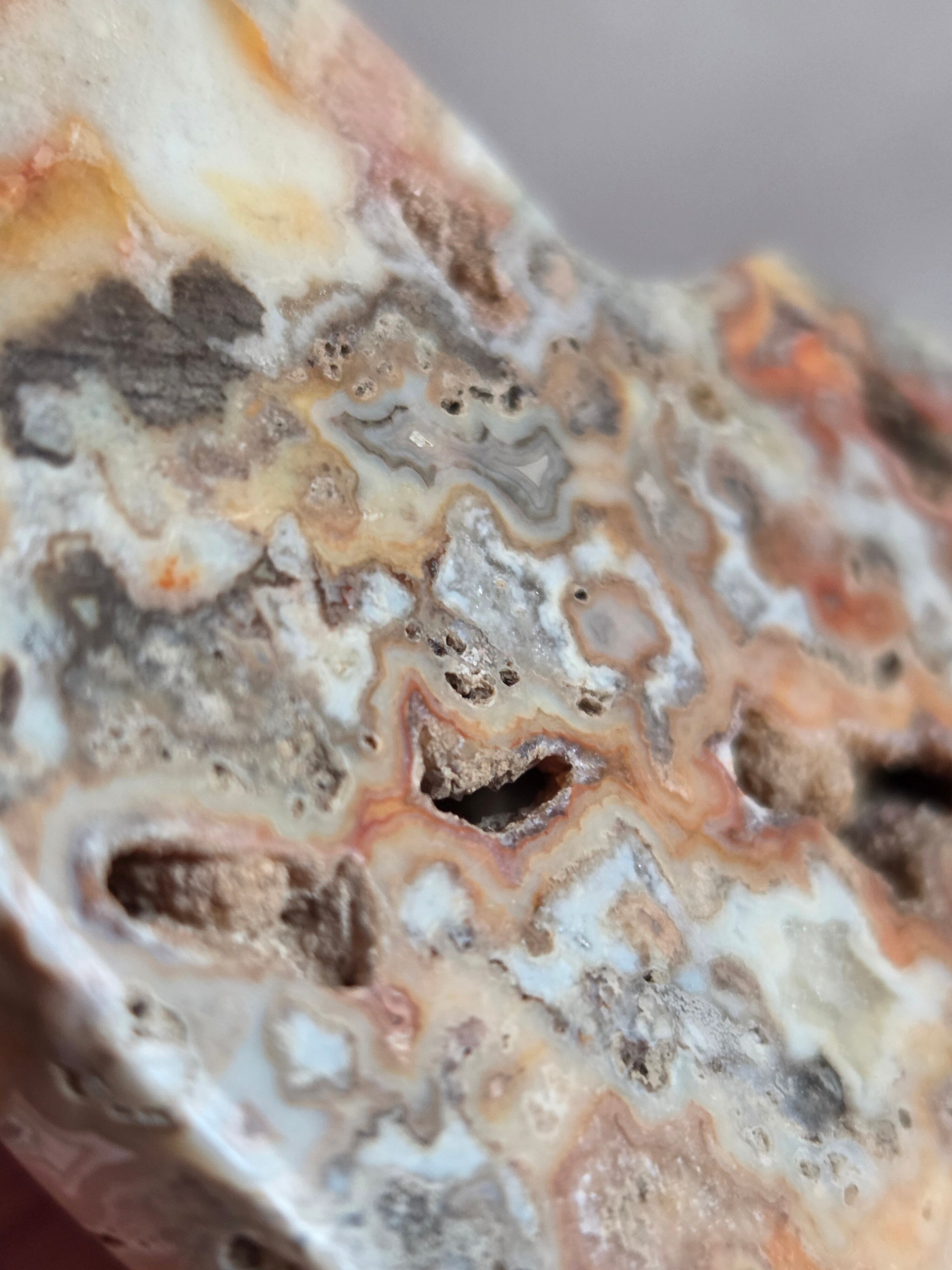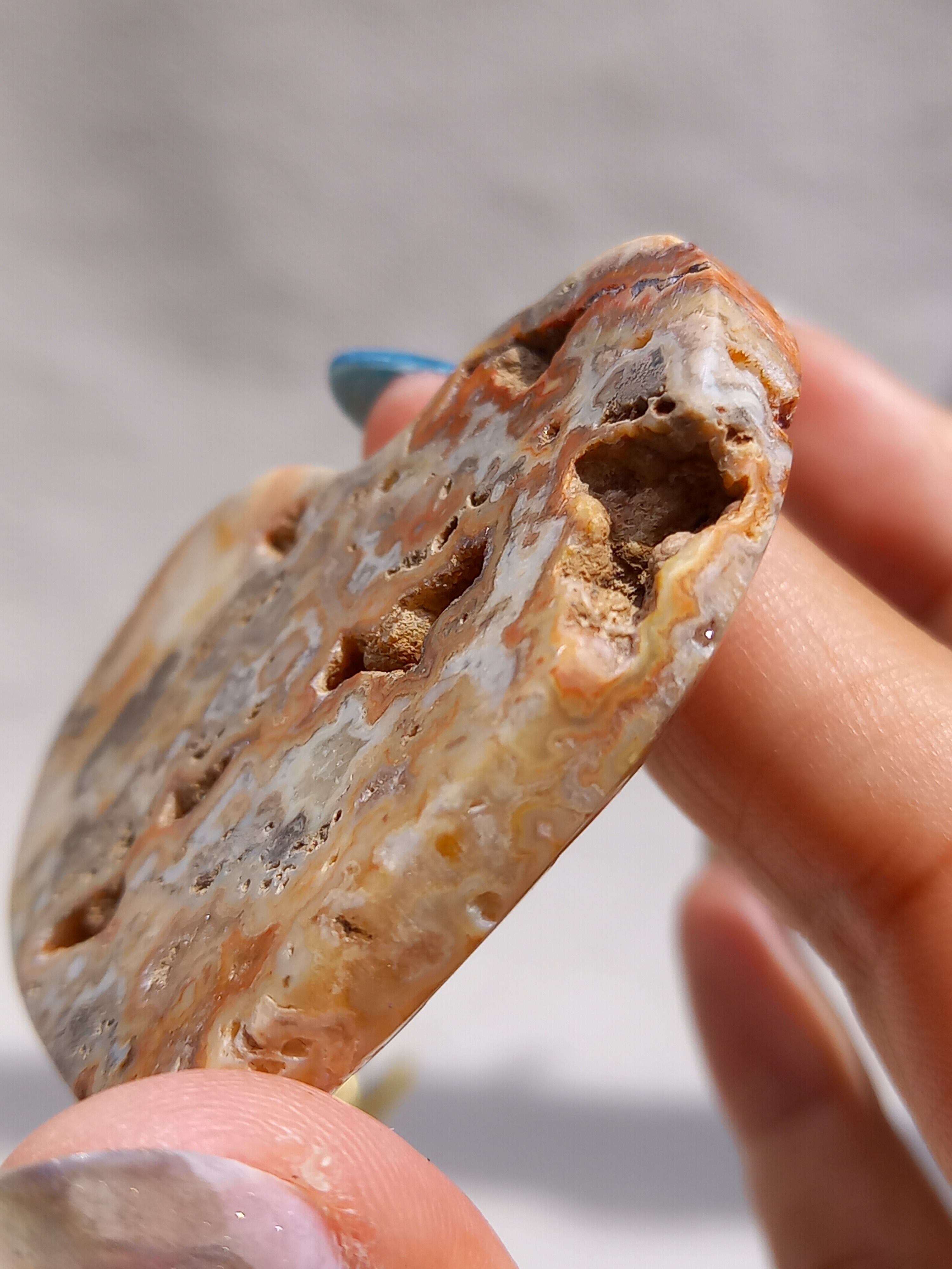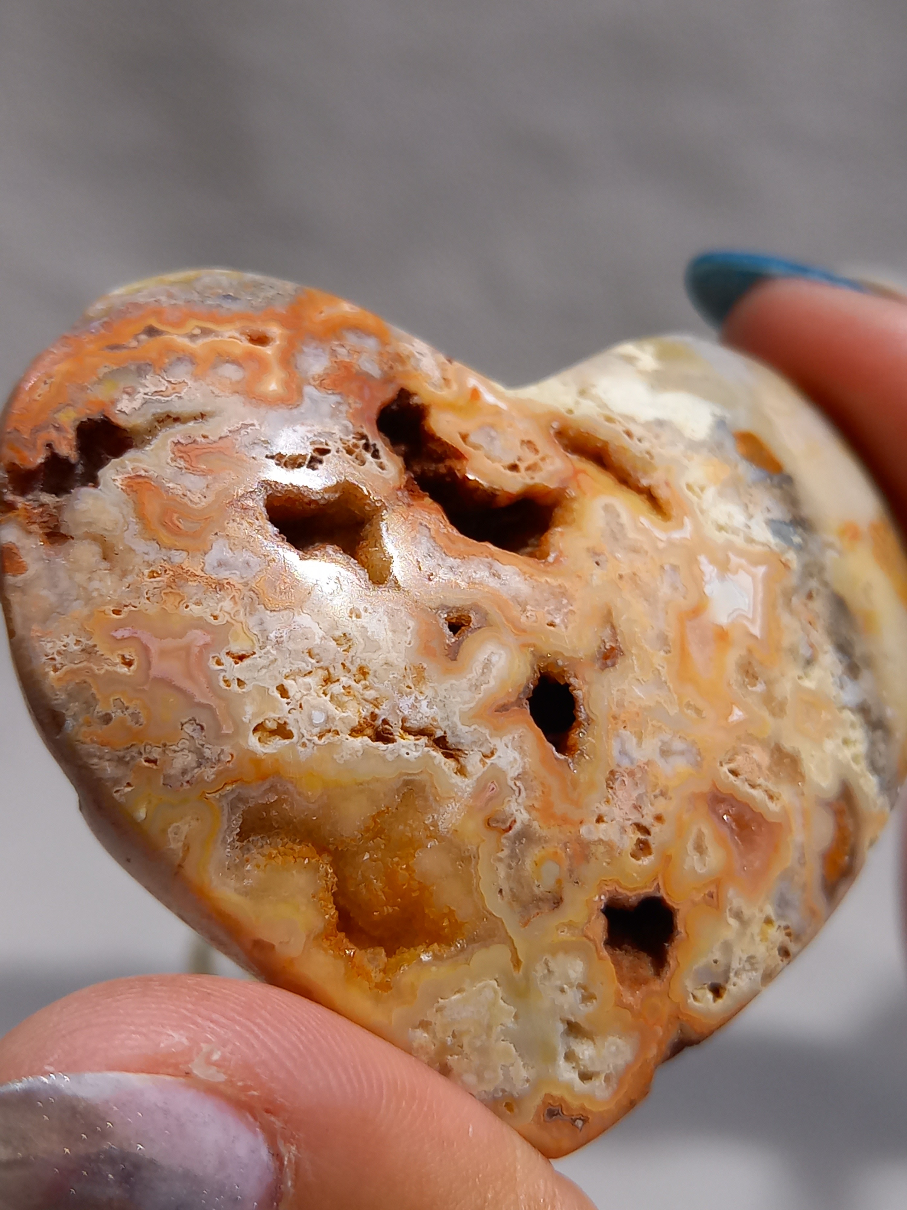 クレイジーレースアゲートは、ヒーリングストーンの一つで、幾層にも重なった模様から発せられる些細な波動が心身にやさしく働きかけ、持ち主の精神的な痛みを和らげ、感情的な負担を解放してくれるといわれています。