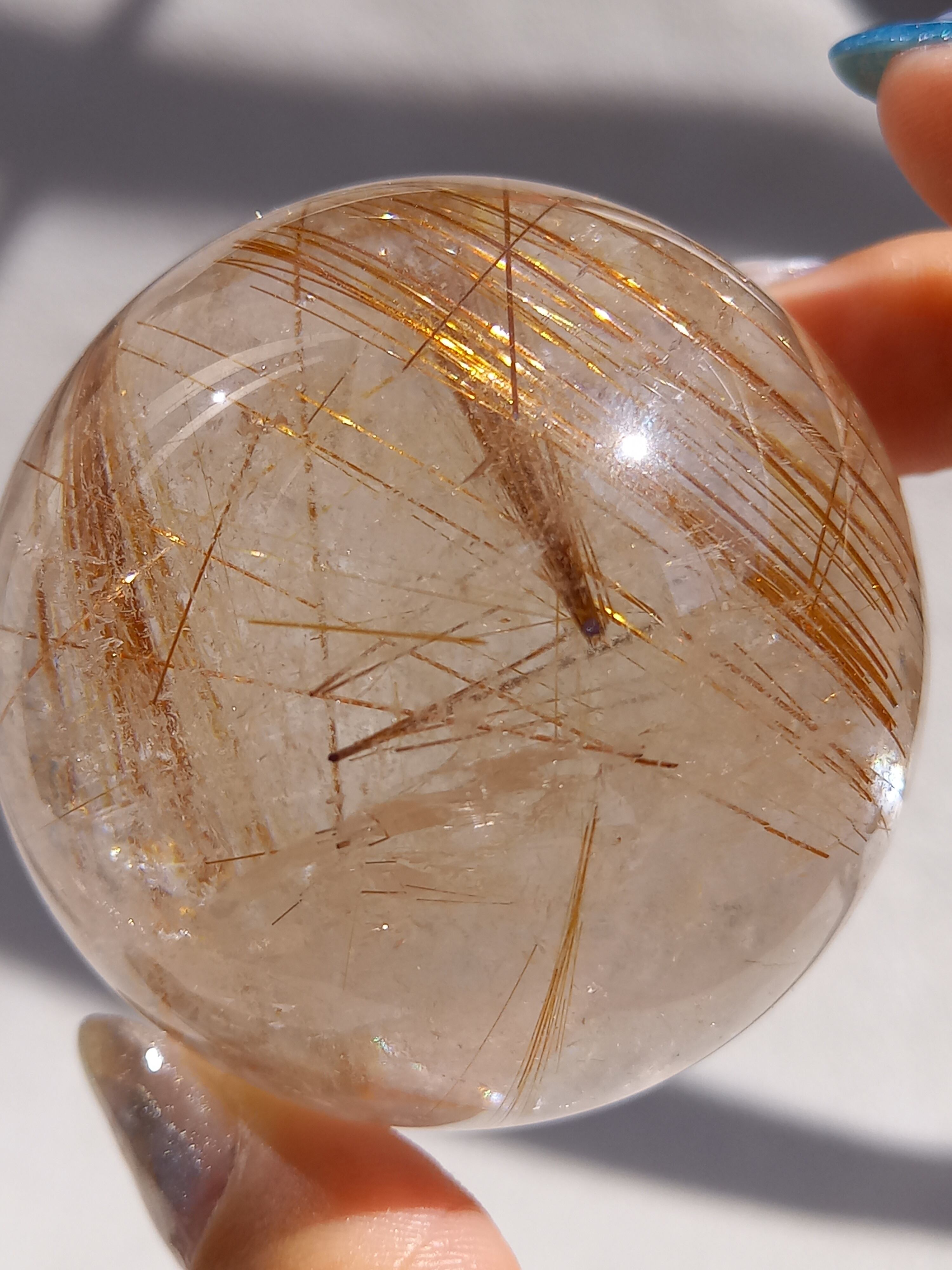 高品質で、水晶の部分も透明感や、煌めきもあり、ゴールドルチルの部分も、黒い部分は綺麗にカットしてあり、太いゴールドルチルクォーツはかっこよく、そしてとんでもなく美しいです。