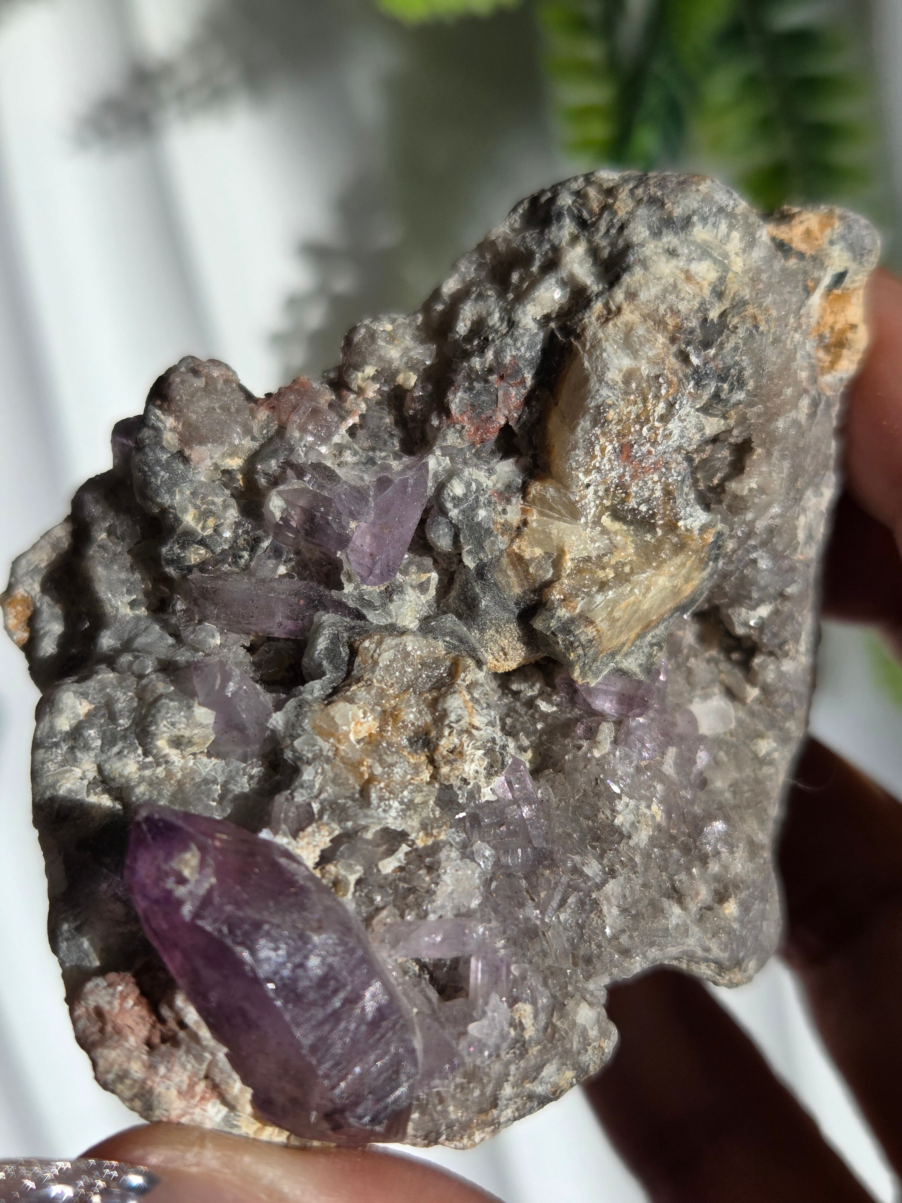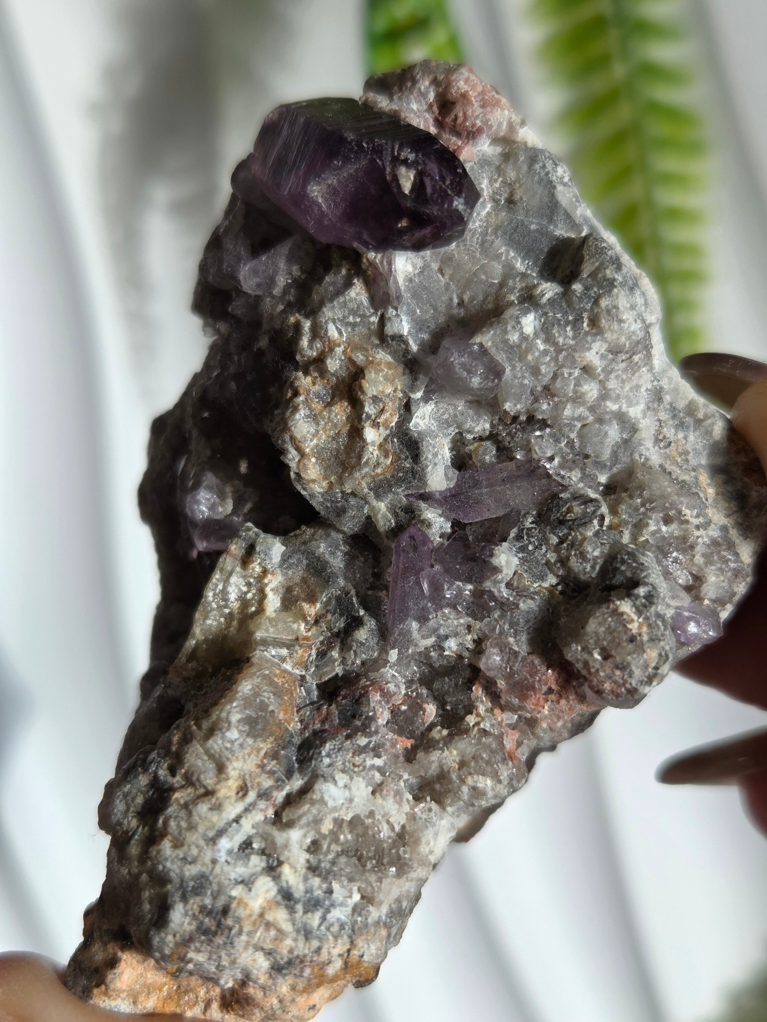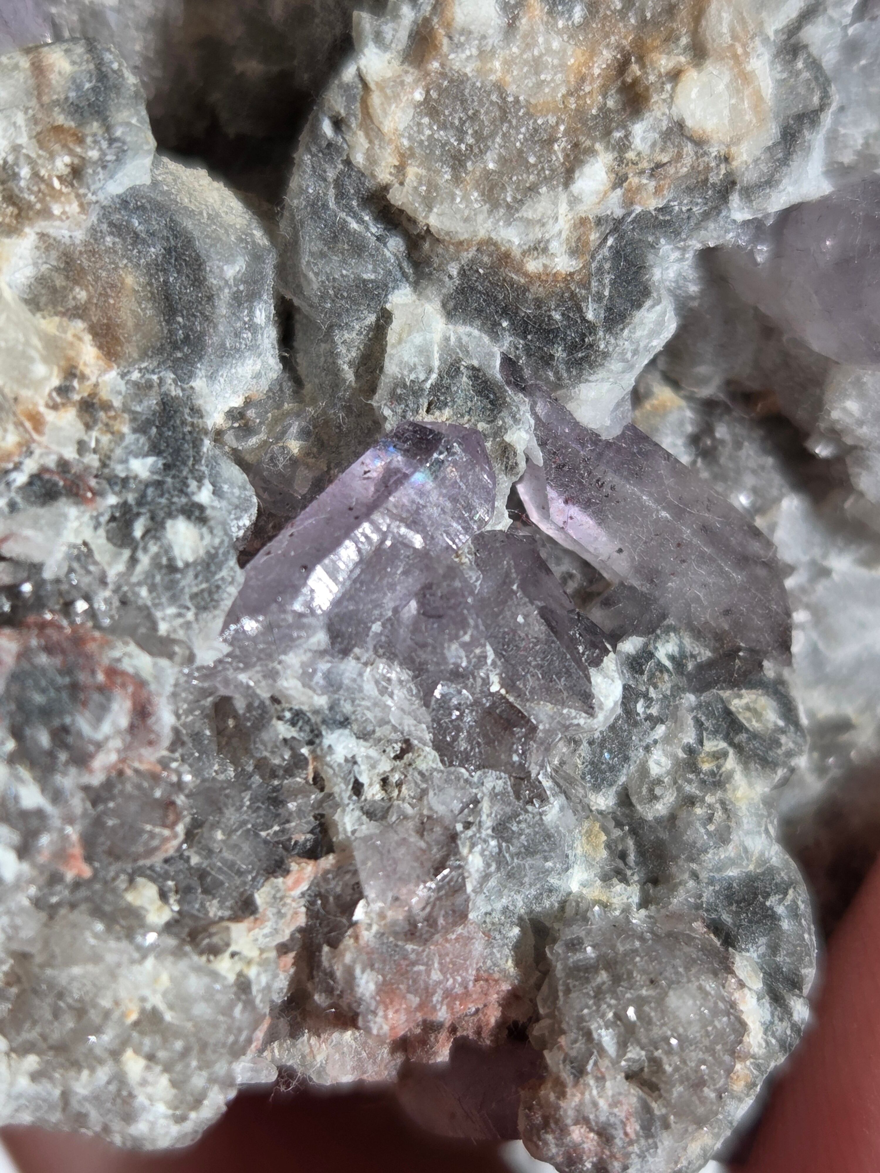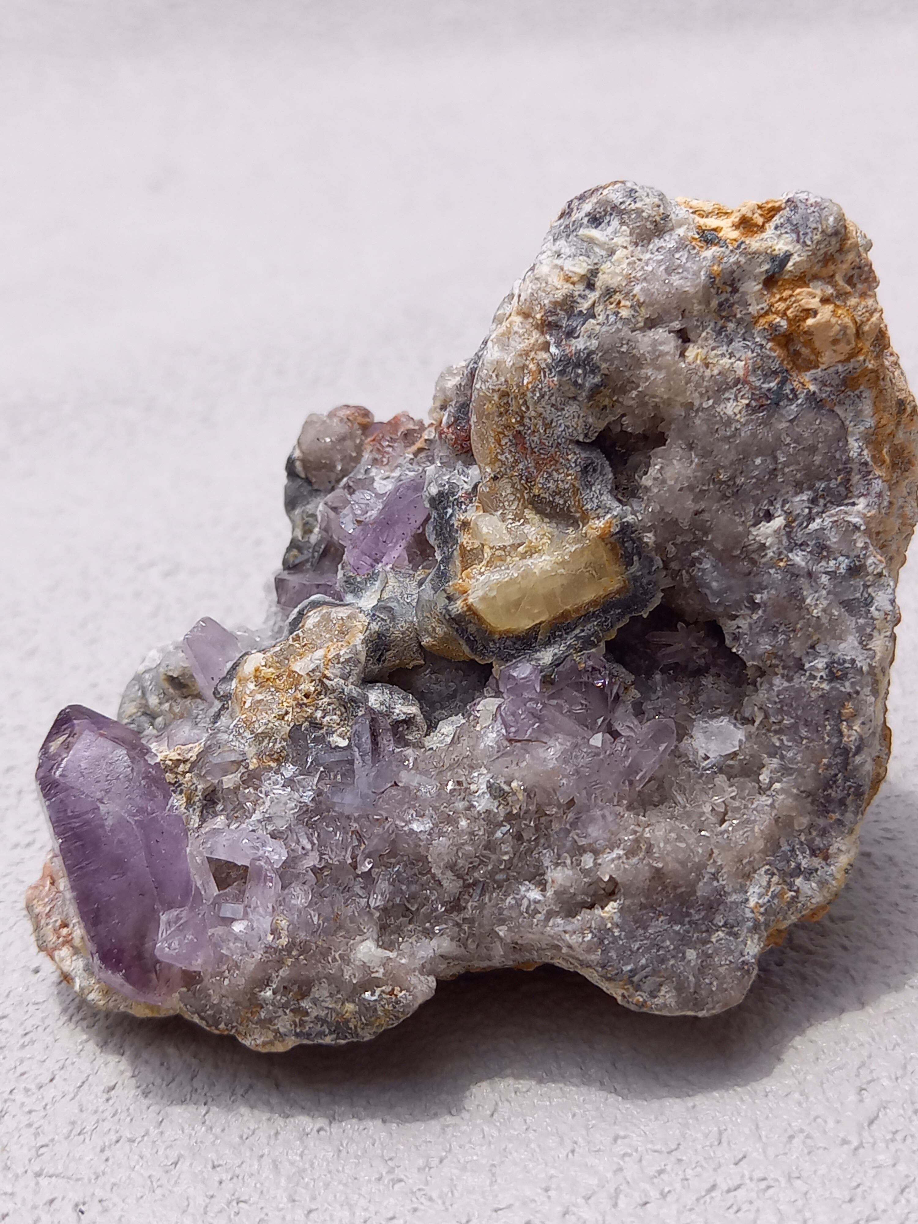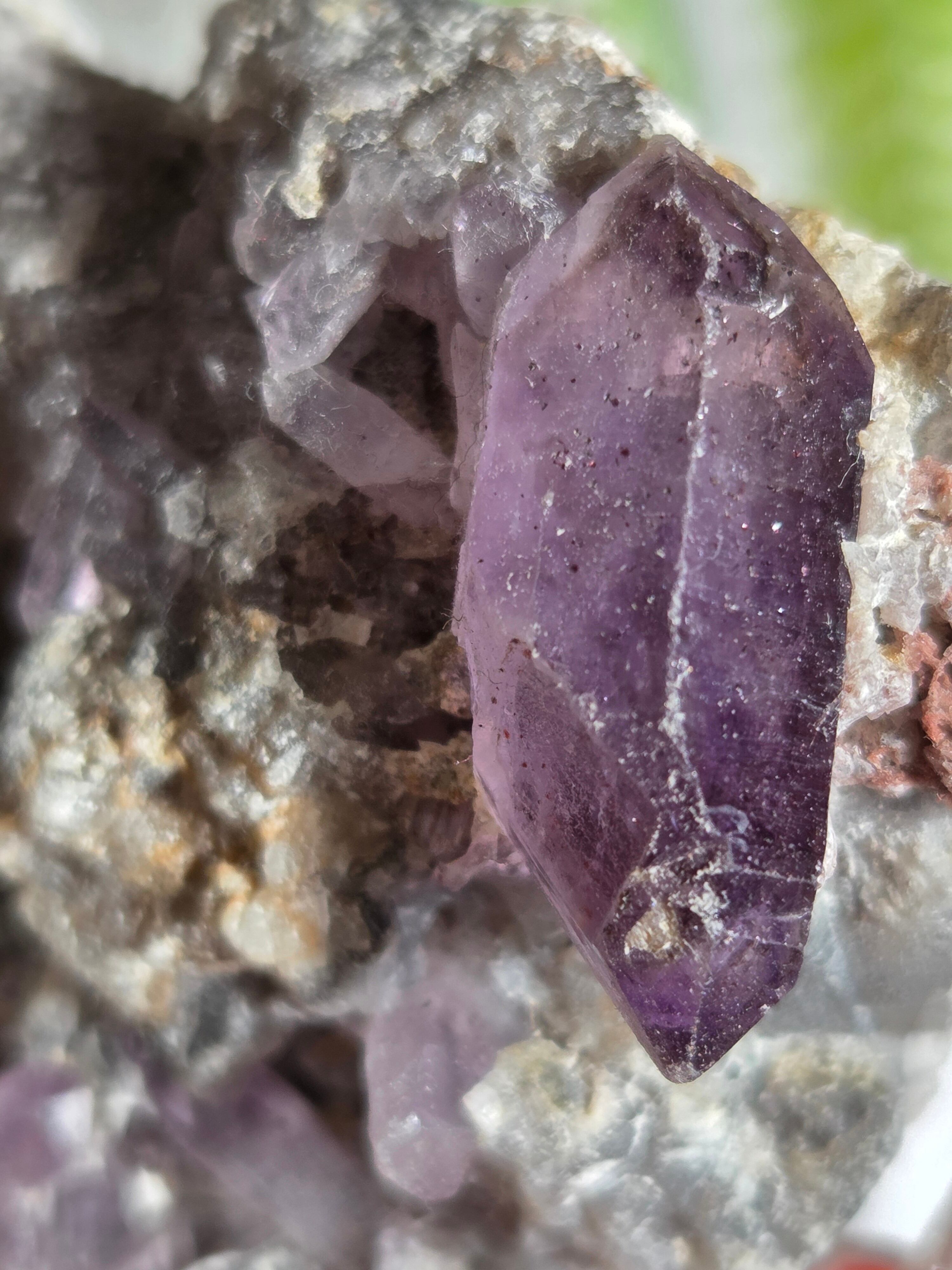 宝石がついたようにポコンと大きな結晶がついていて、そのアメジスト部分がとっても美しいです。中にはレピドクロサイトも見えます。