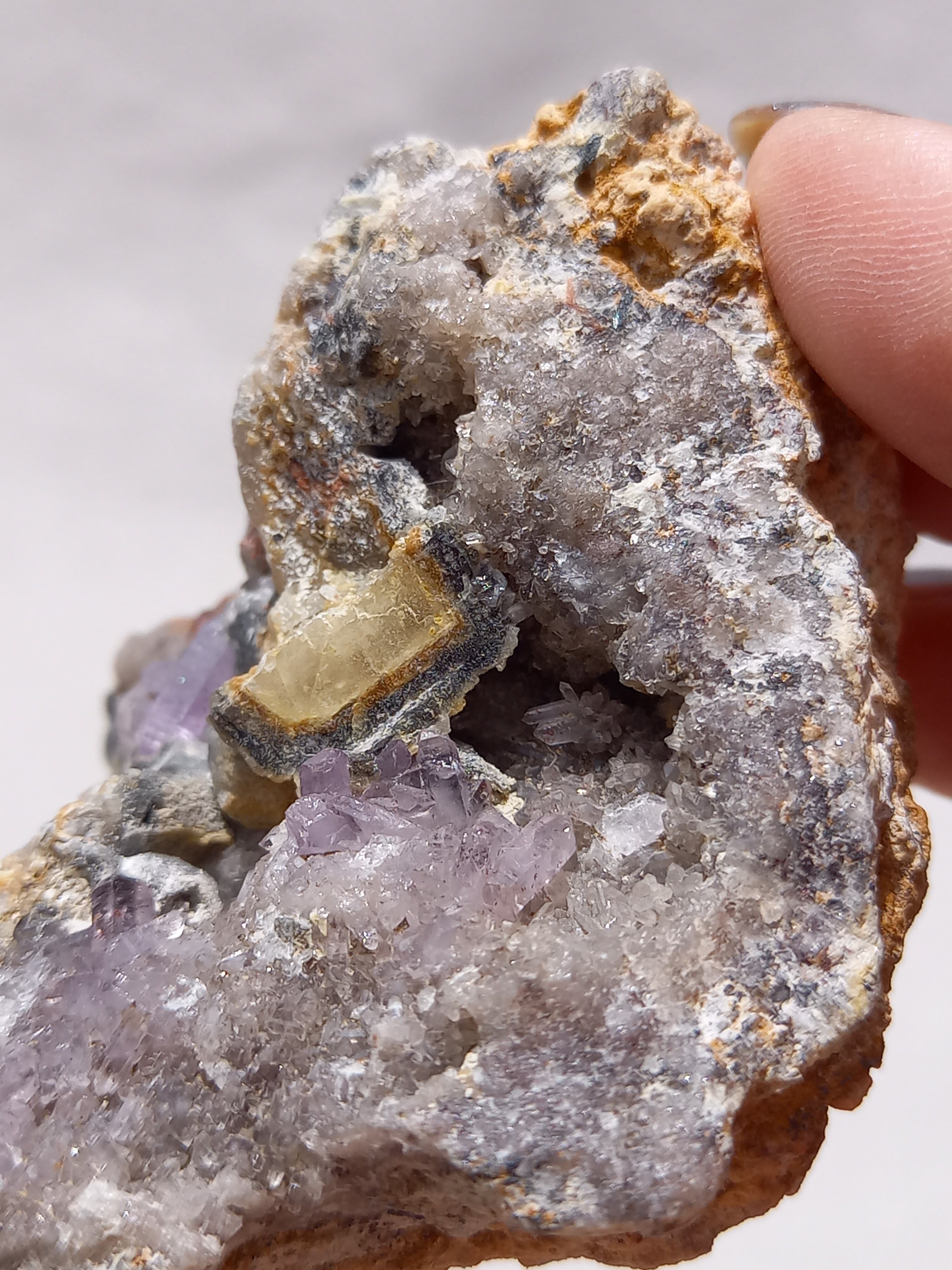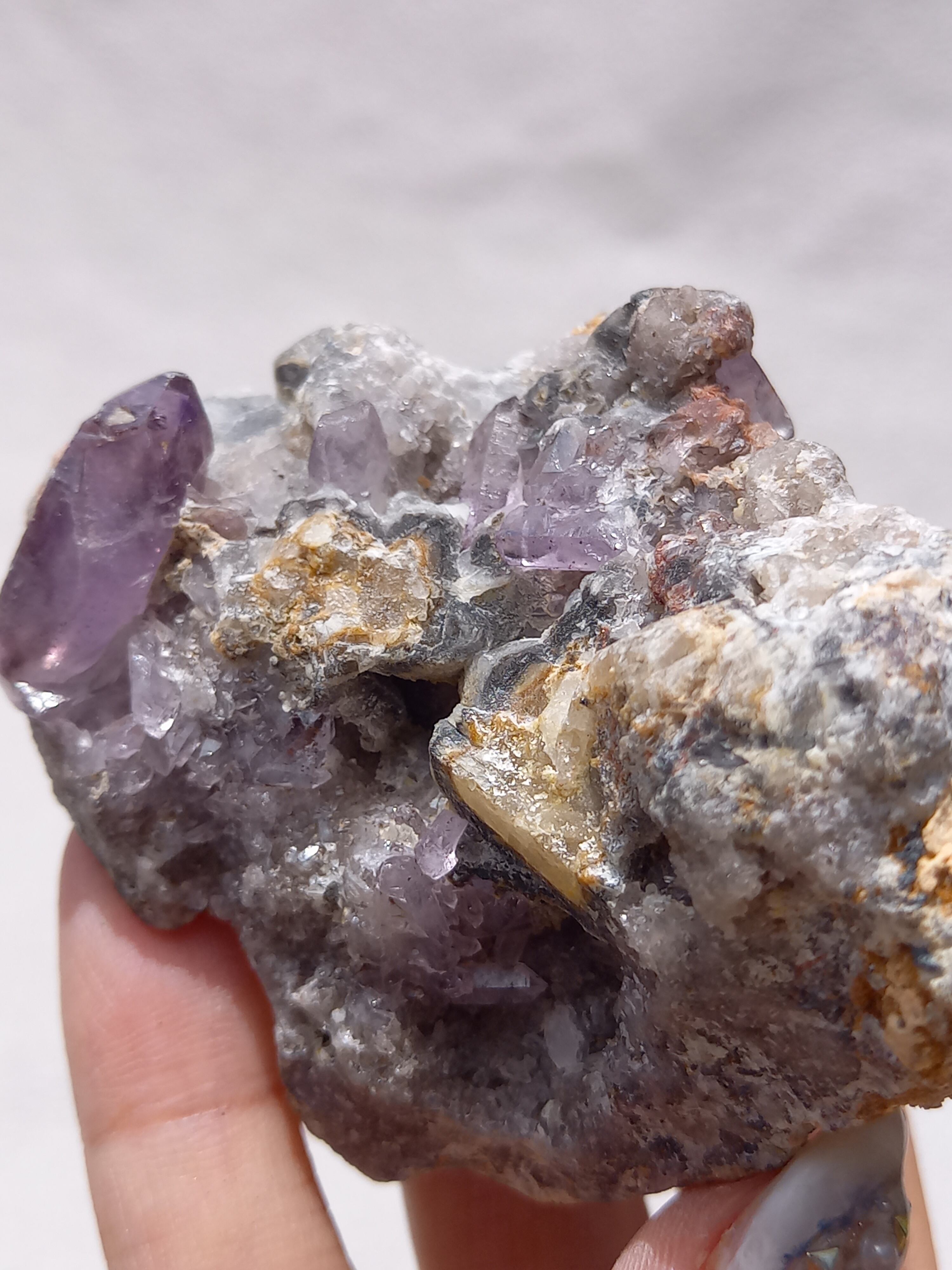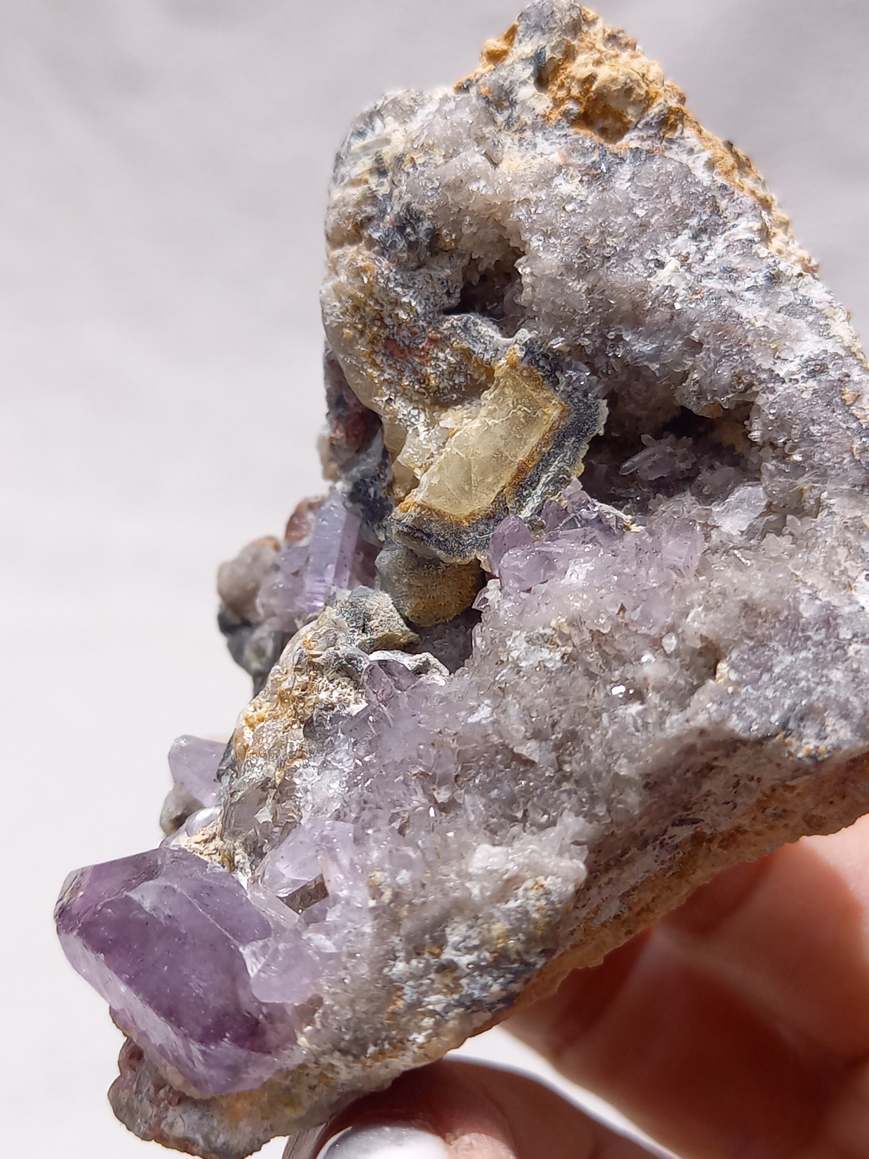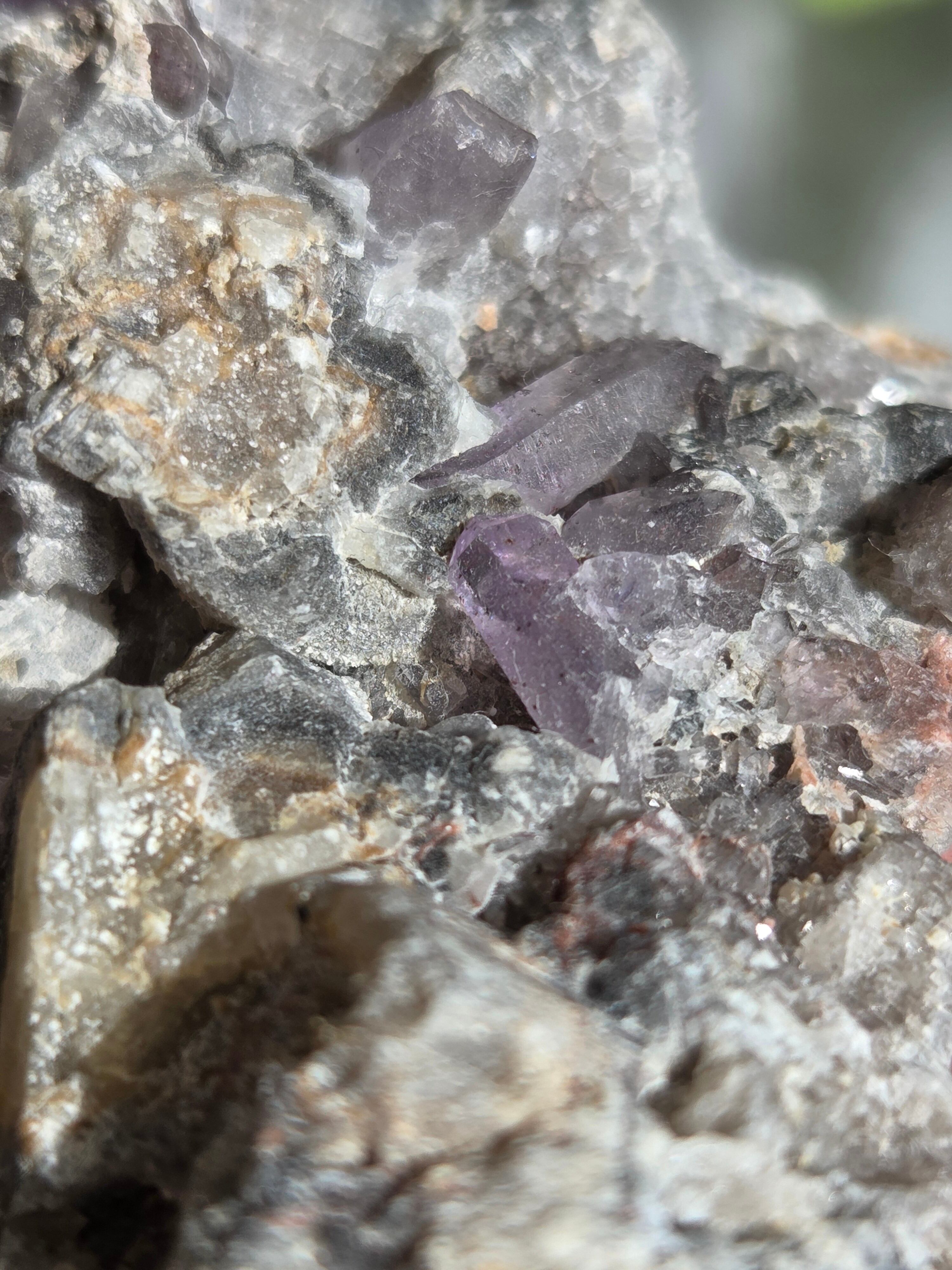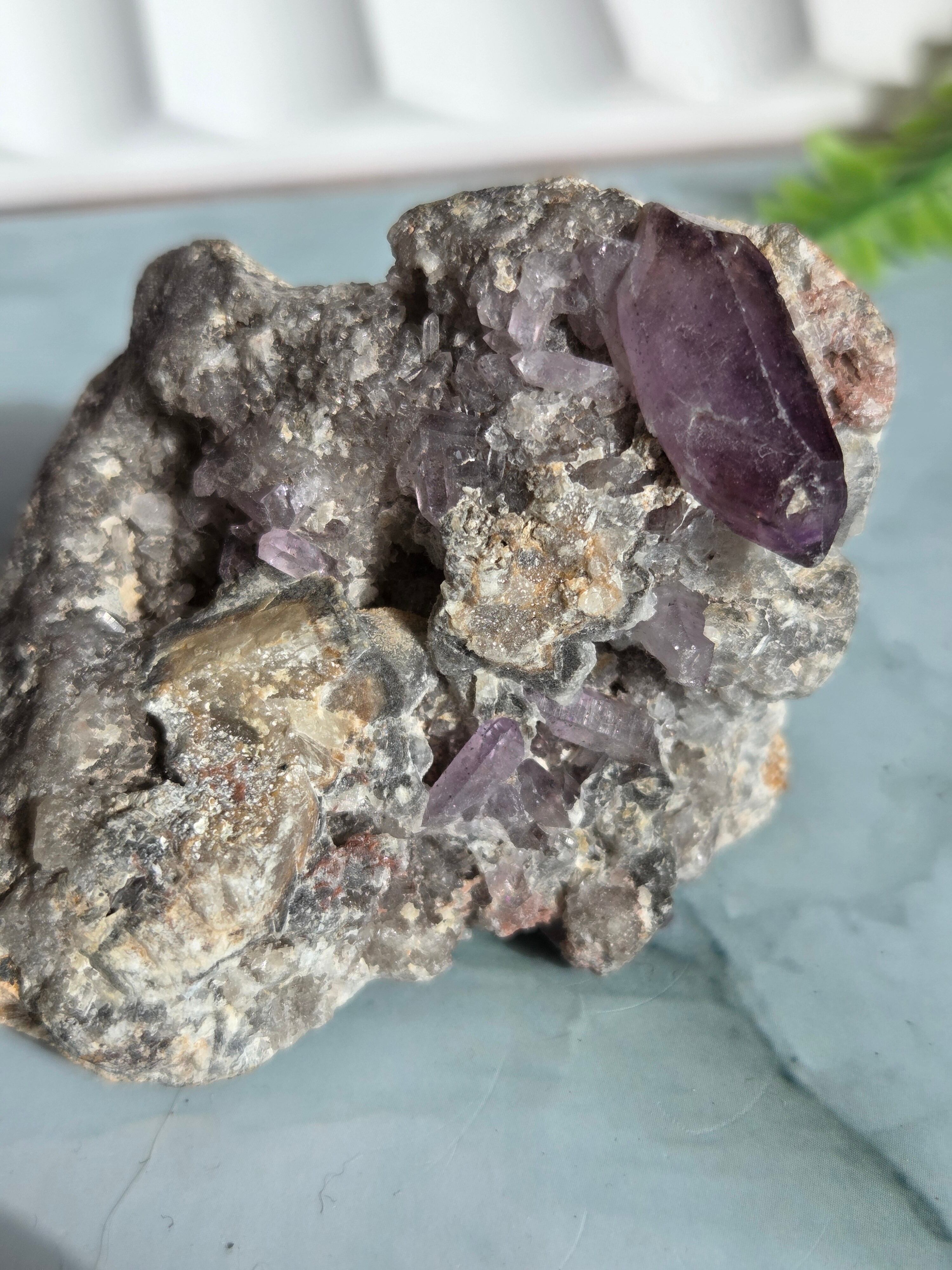宝石がついたようにポコンと大きな結晶がついていて、そのアメジスト部分がとっても美しいです。中にはレピドクロサイトも見えます。