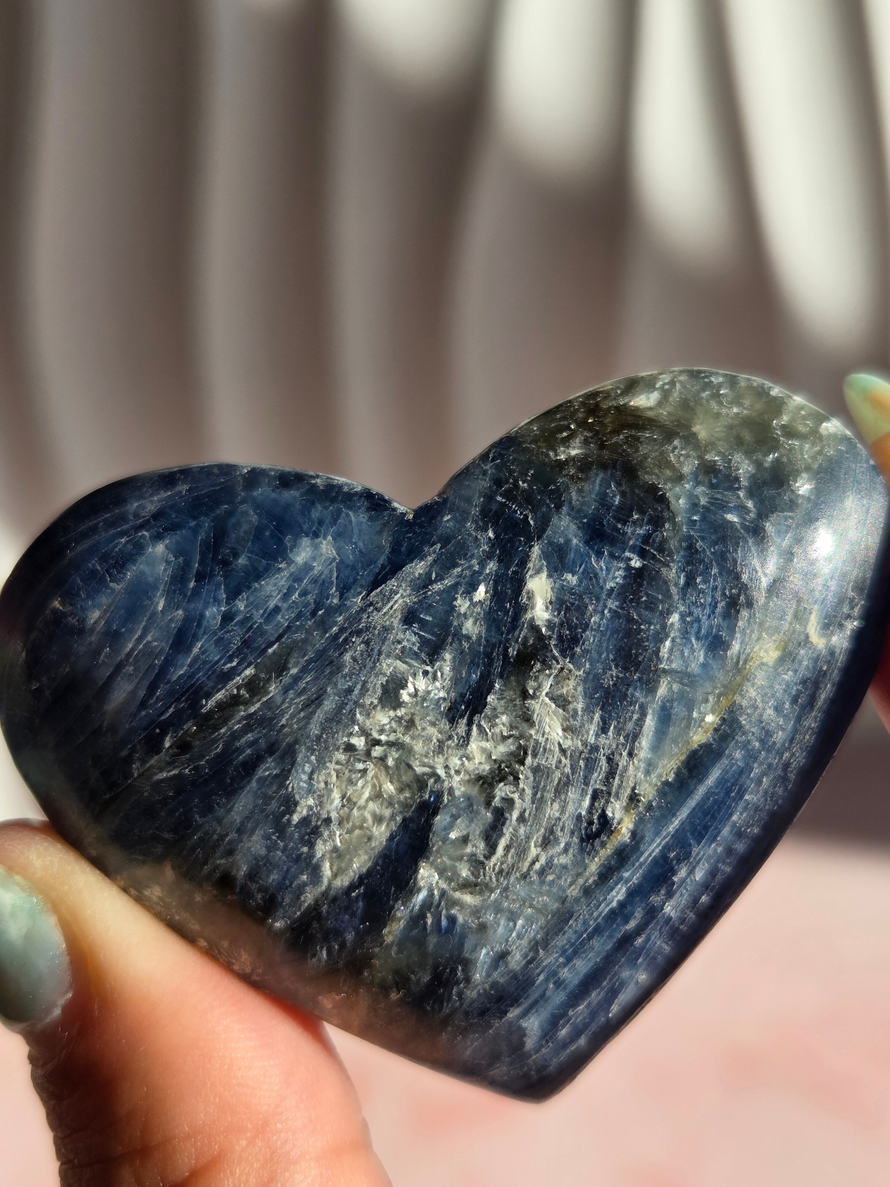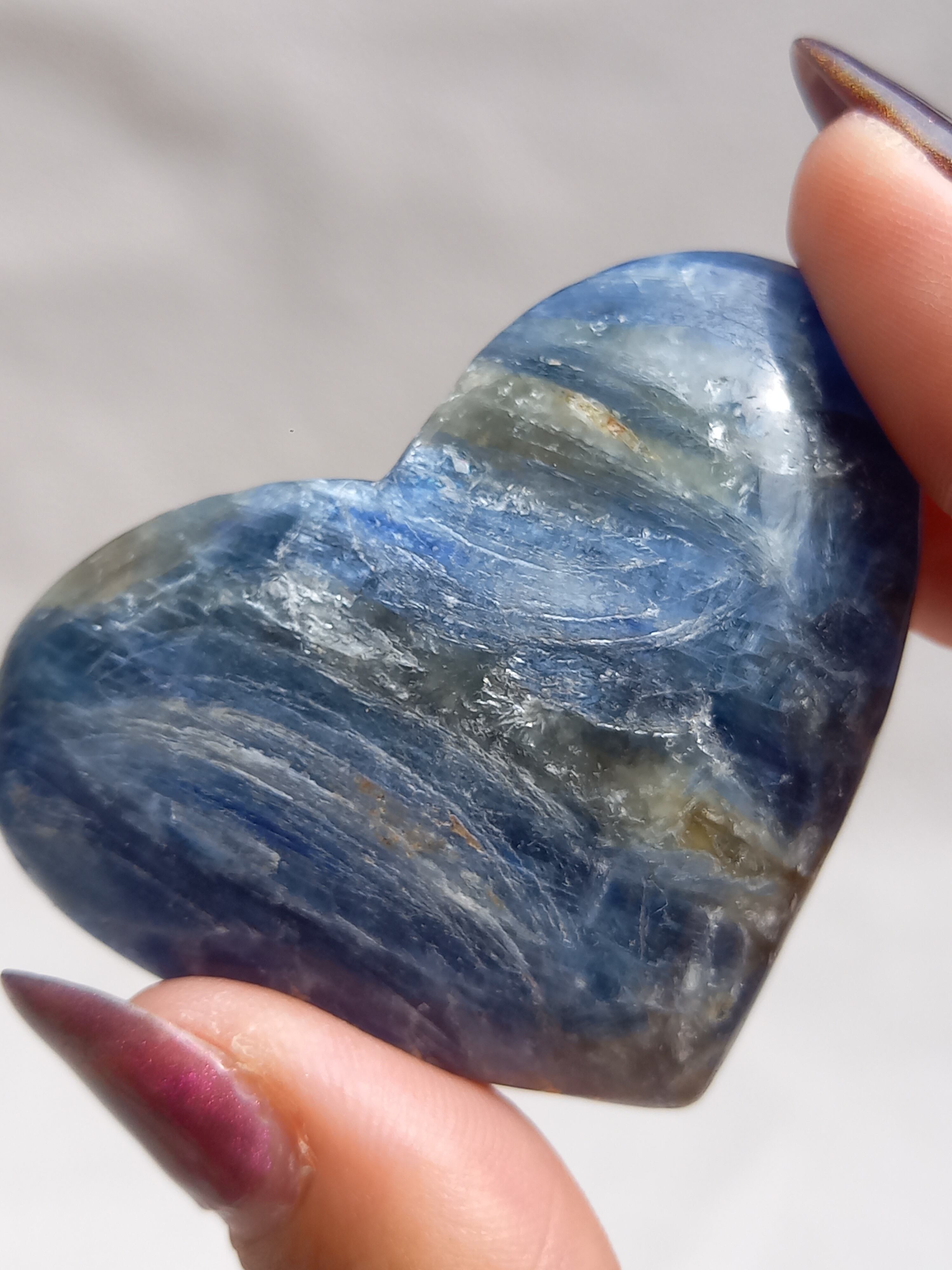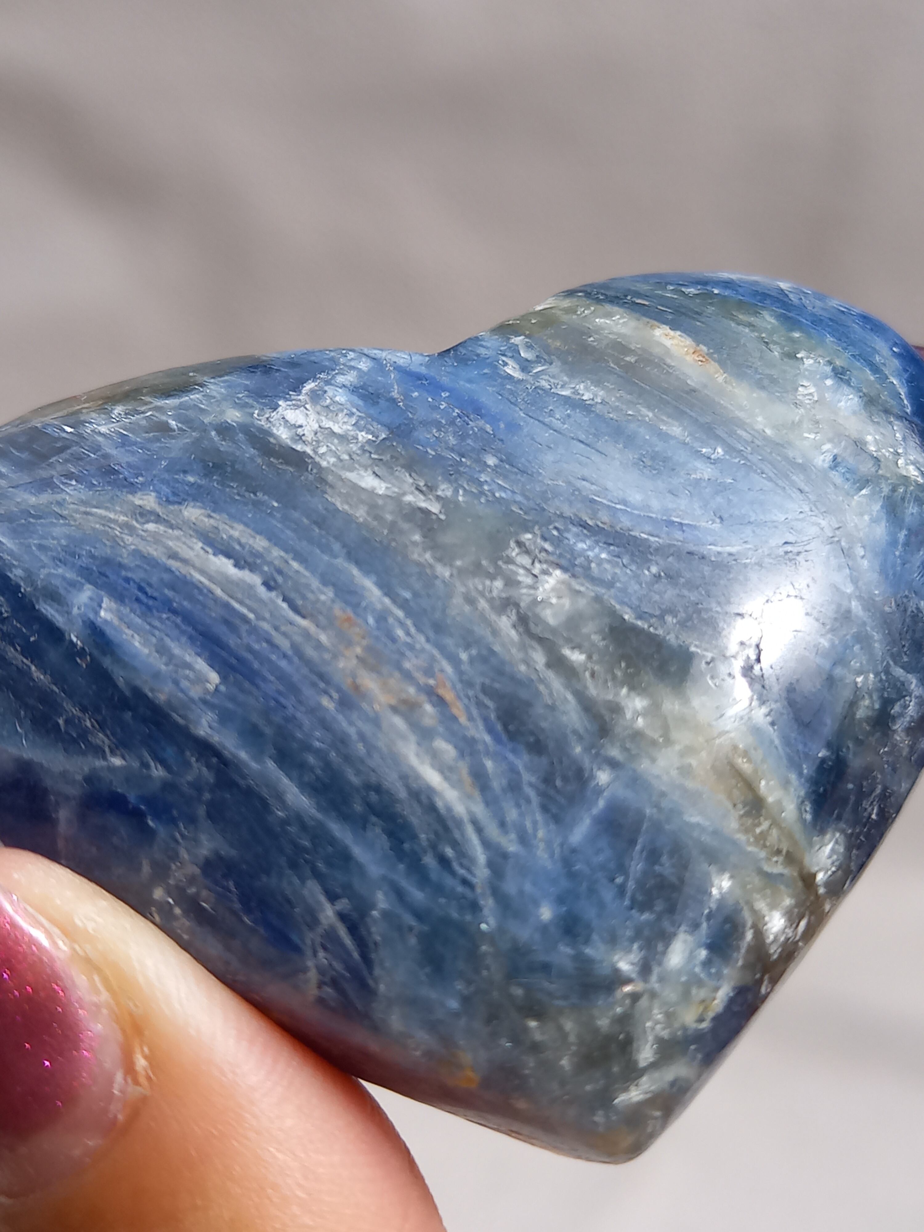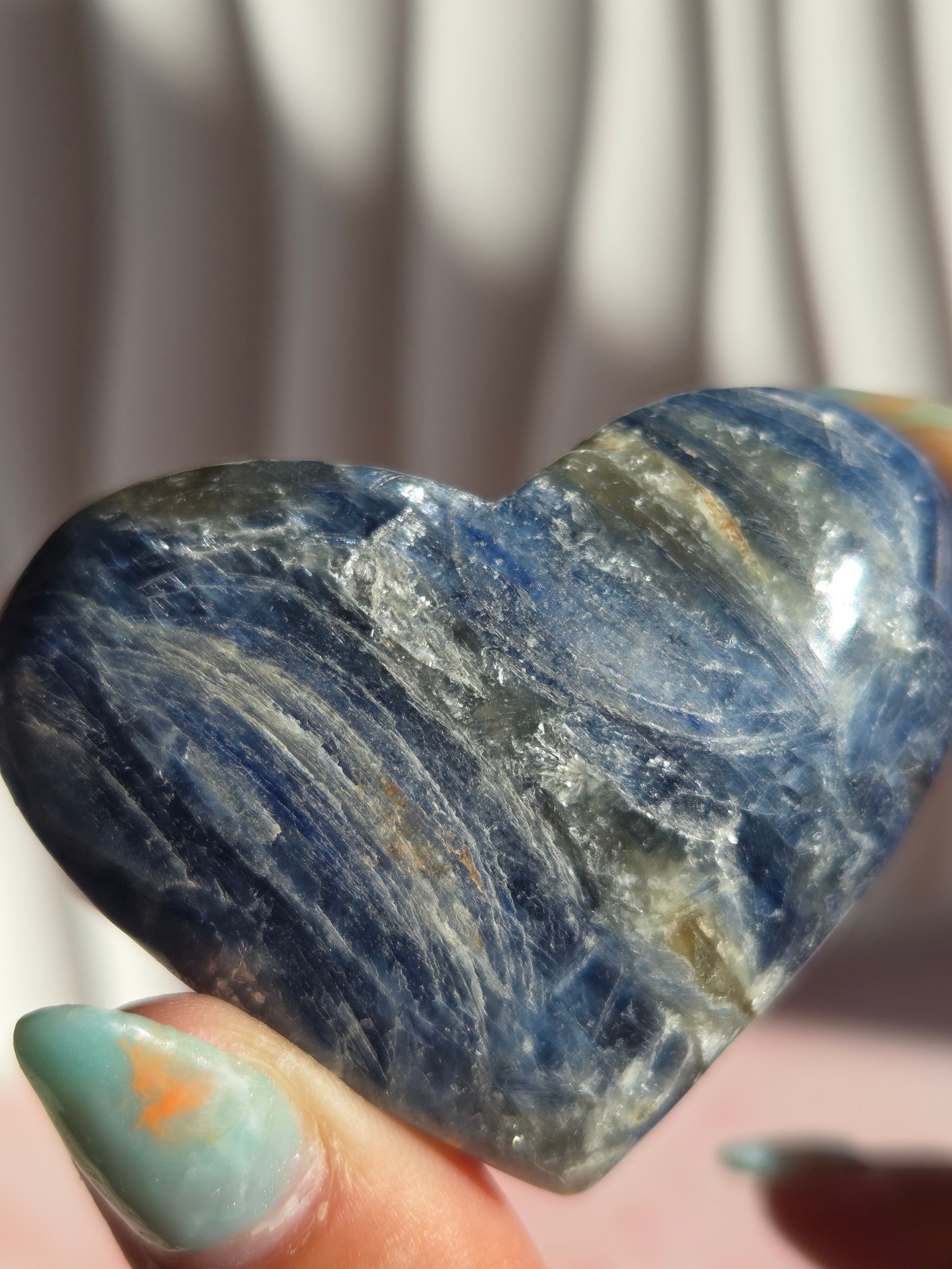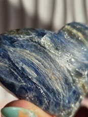 真っ青なブルーが美しいカイヤナイト。シリカと共生しており、カイヤナイトの結晶もしっかり見られる可愛いハートパームです。
