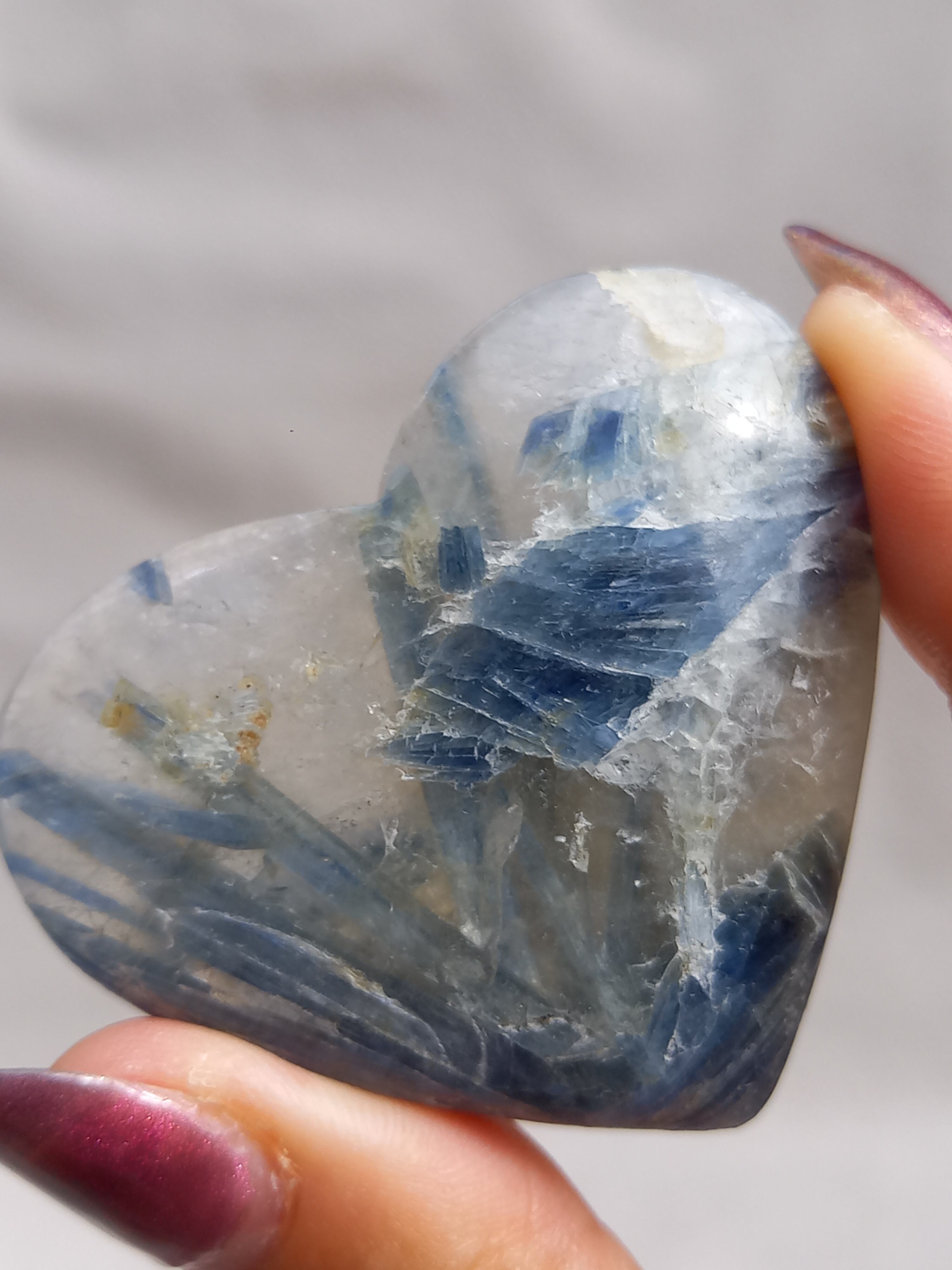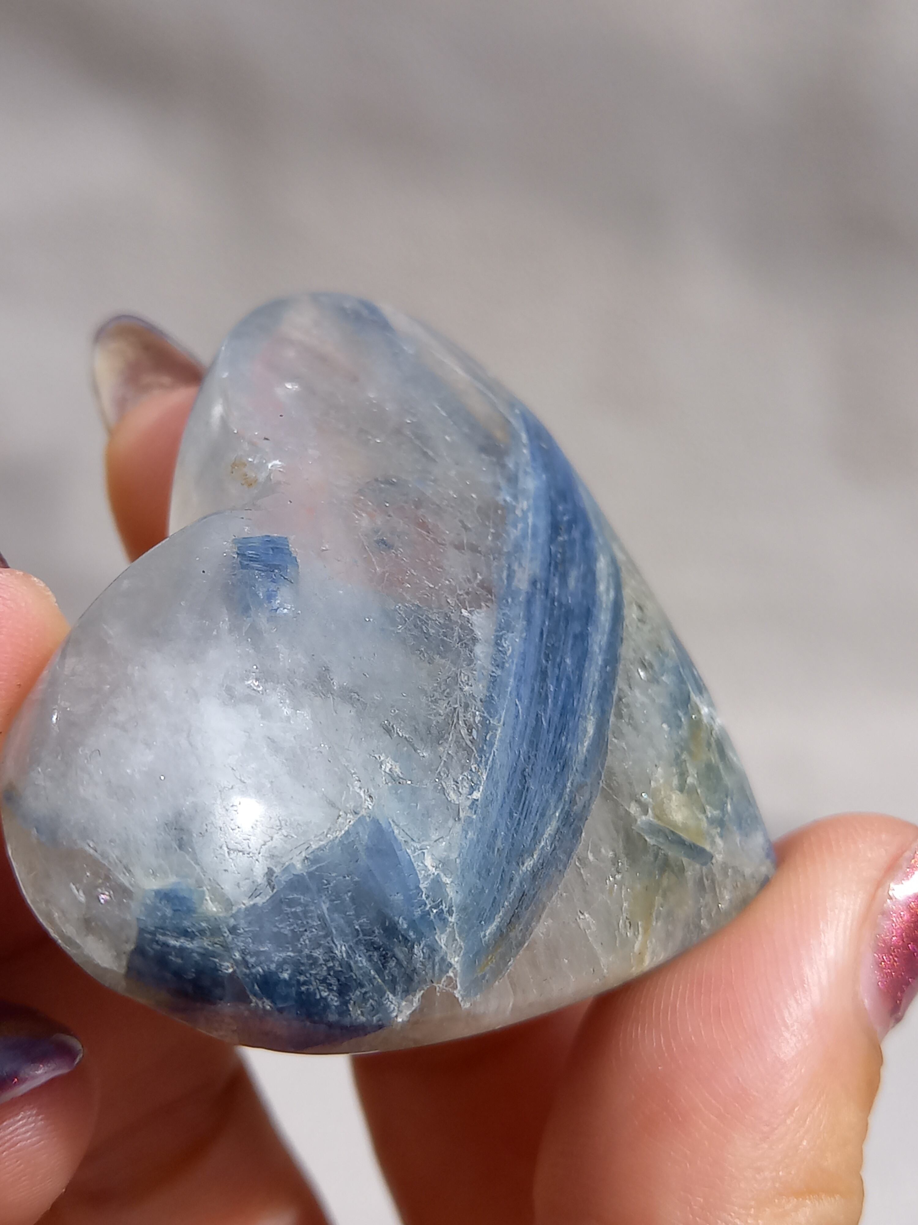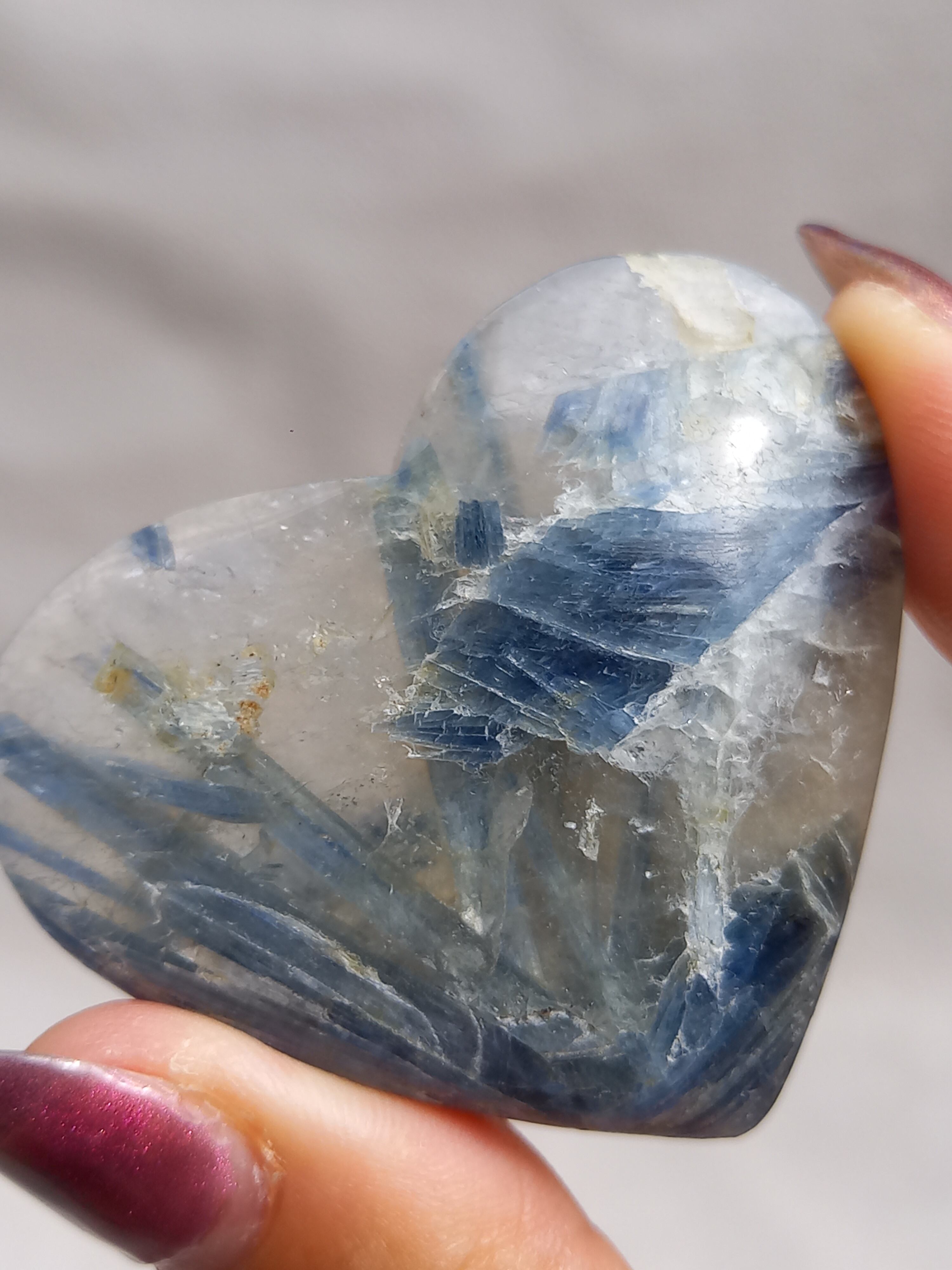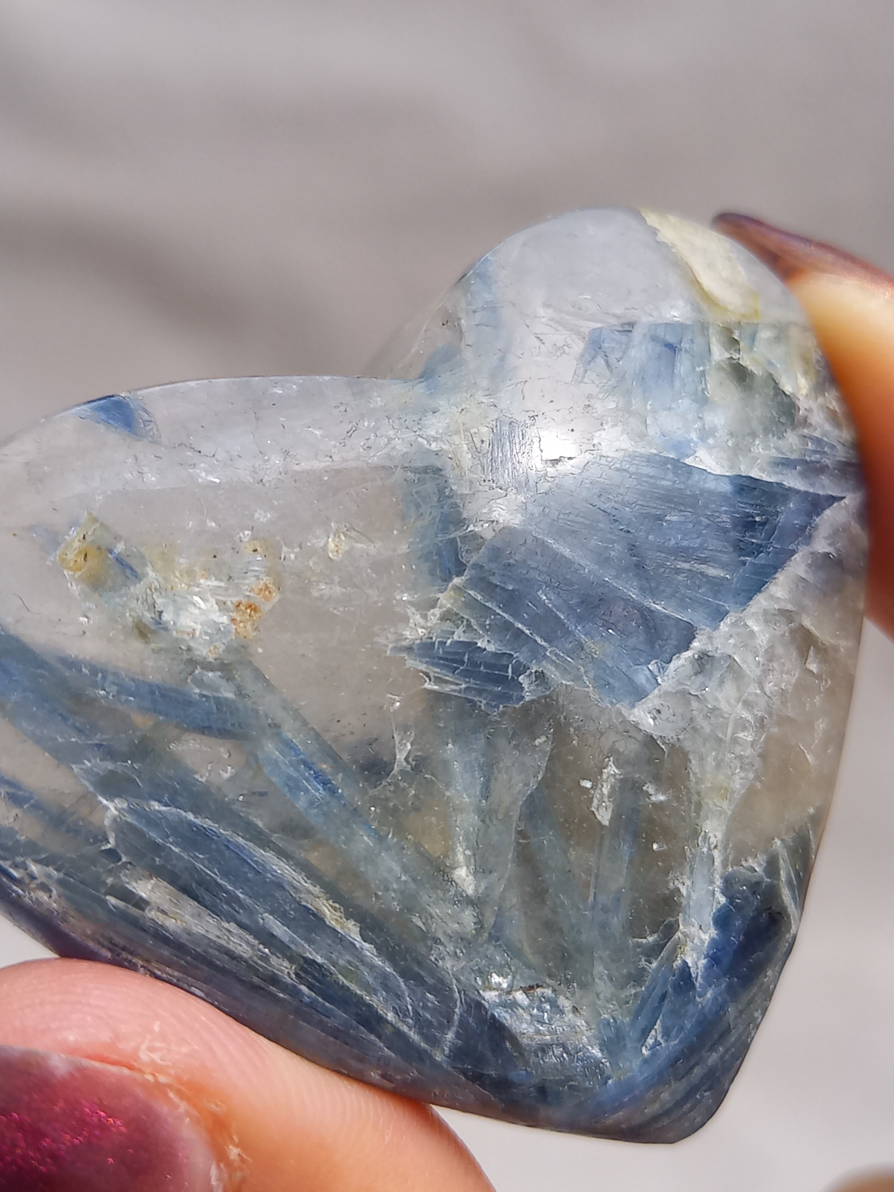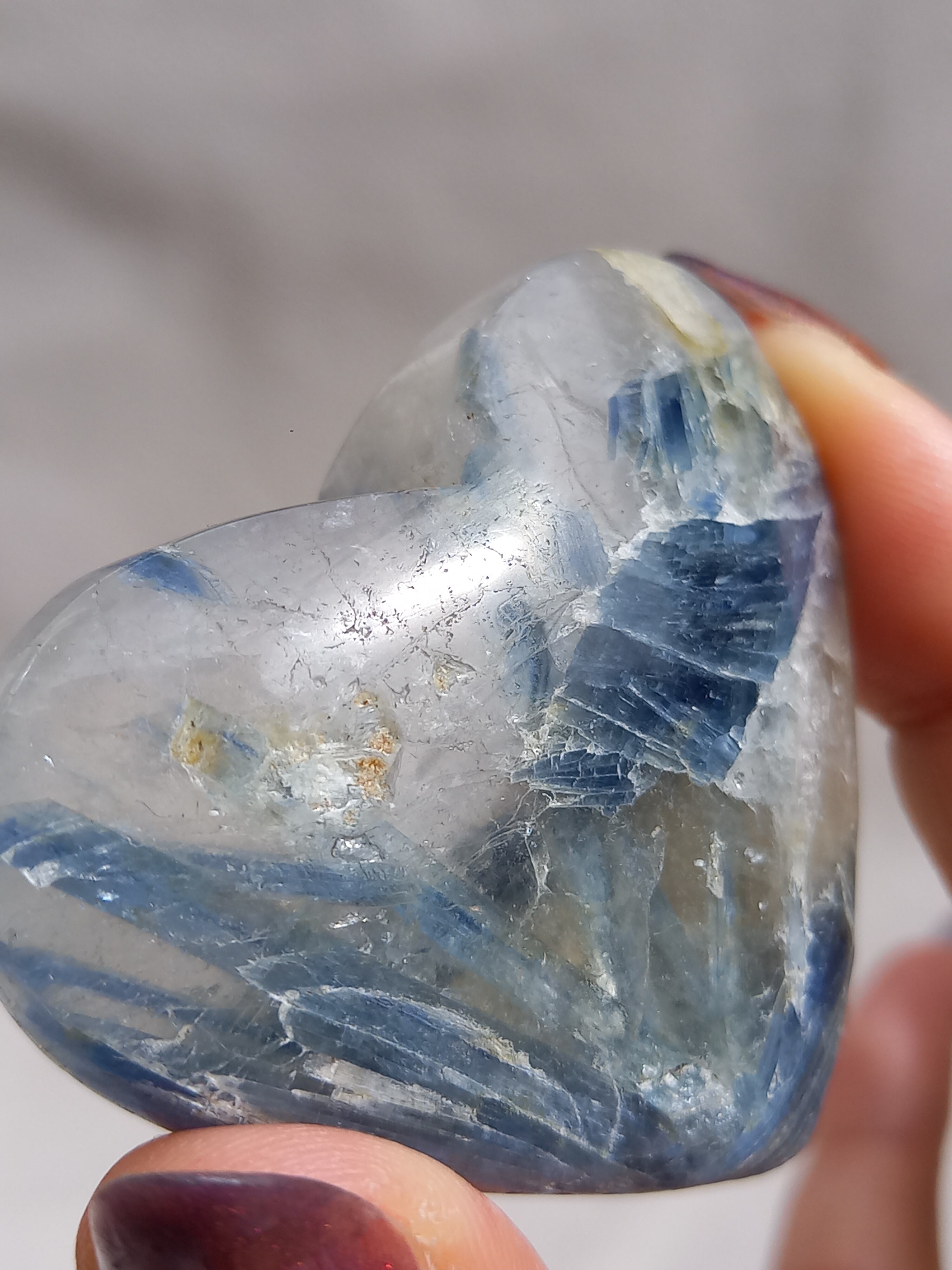 真っ青なブルーが美しいカイヤナイト。シリカと共生しており、カイヤナイトの結晶もしっかり見られる可愛いハートパームです。