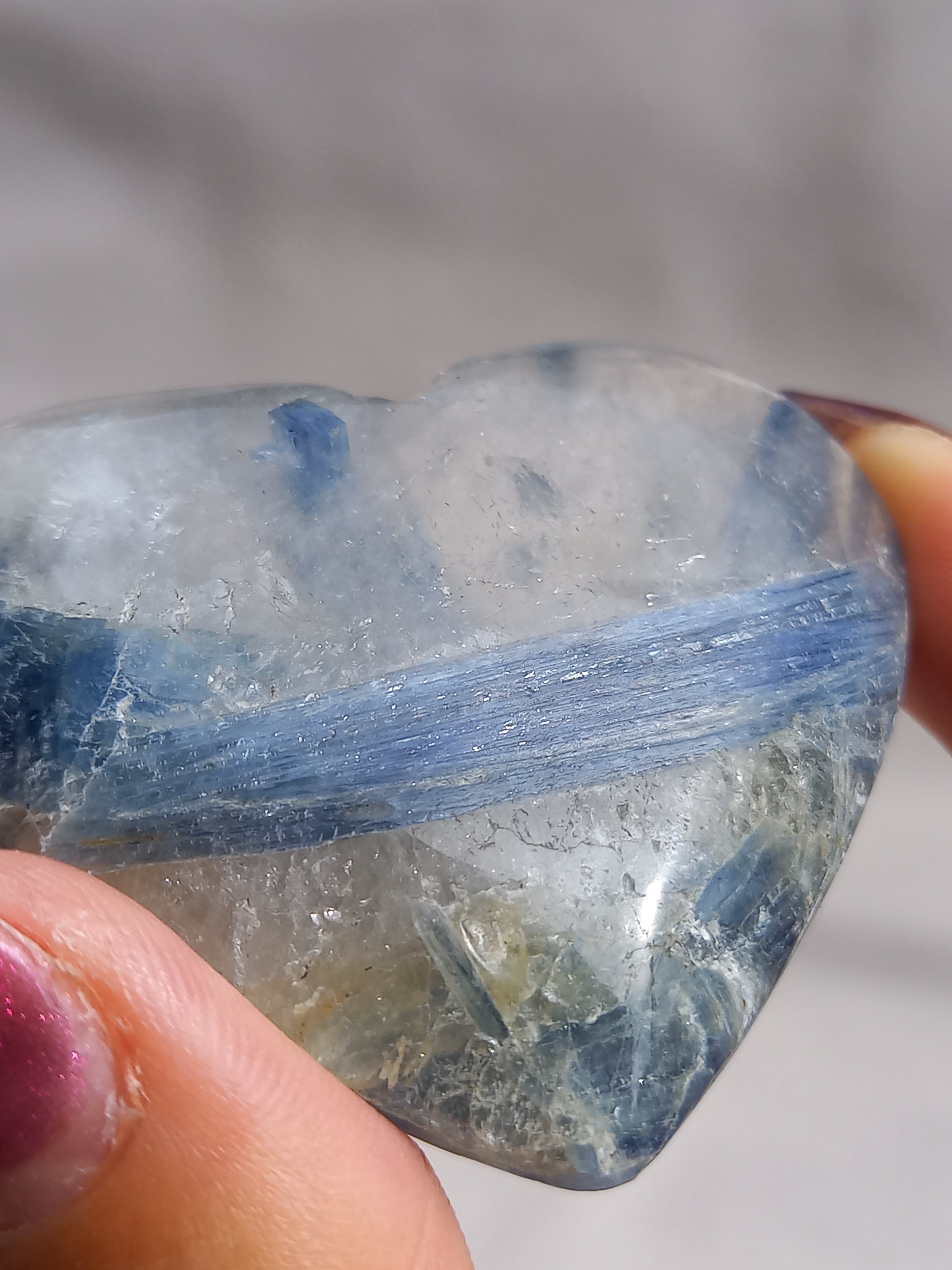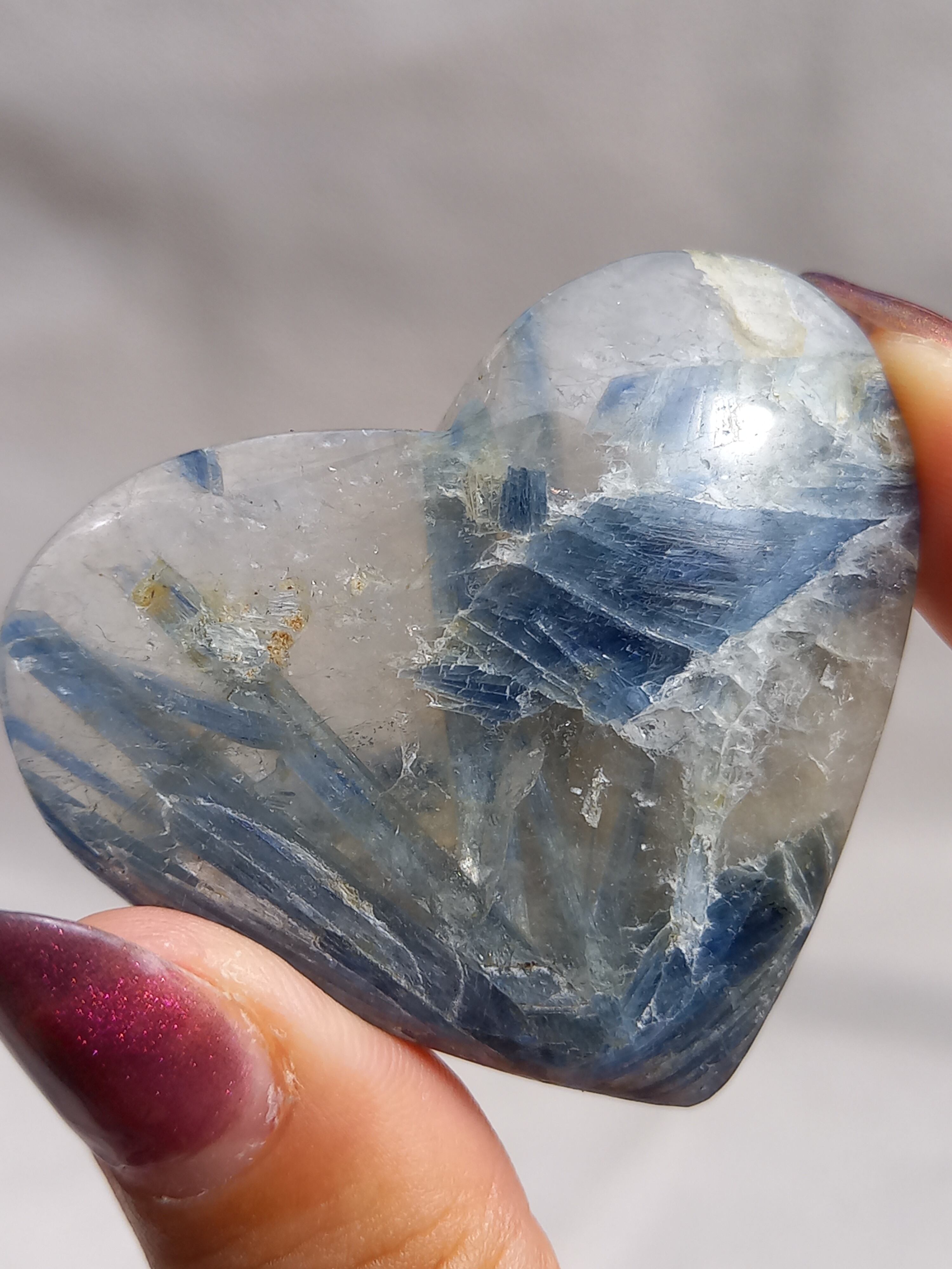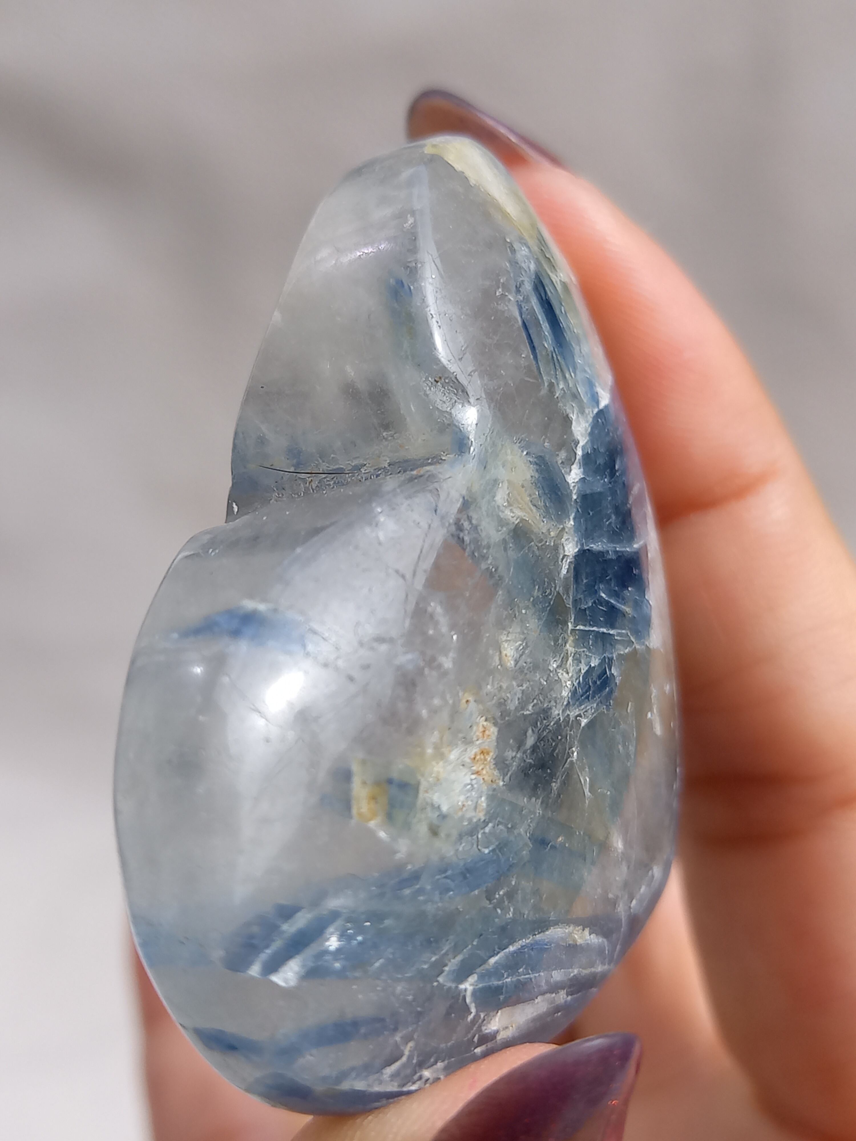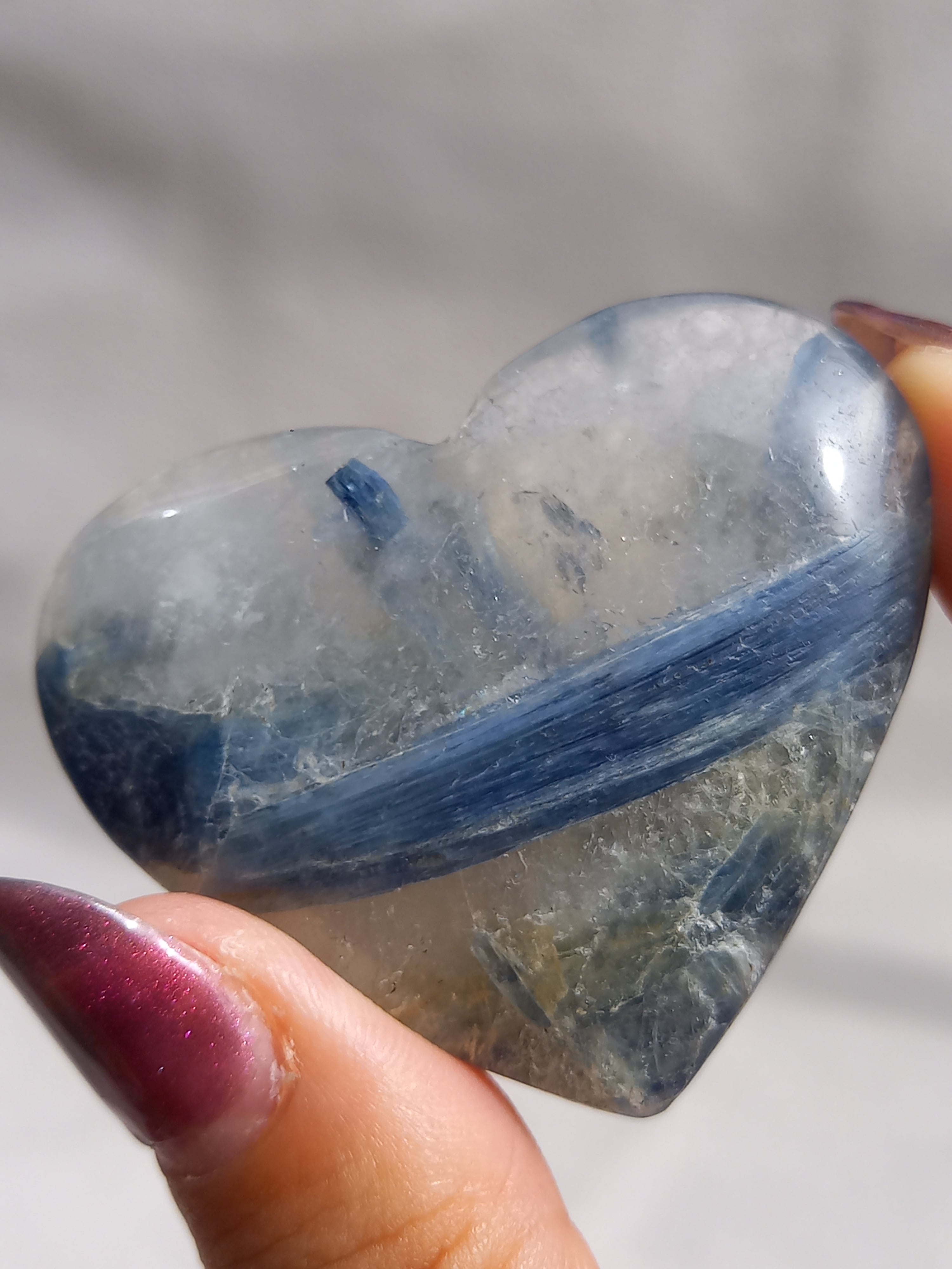 真っ青なブルーが美しいカイヤナイト。シリカと共生しており、カイヤナイトの結晶もしっかり見られる可愛いハートパームです。
