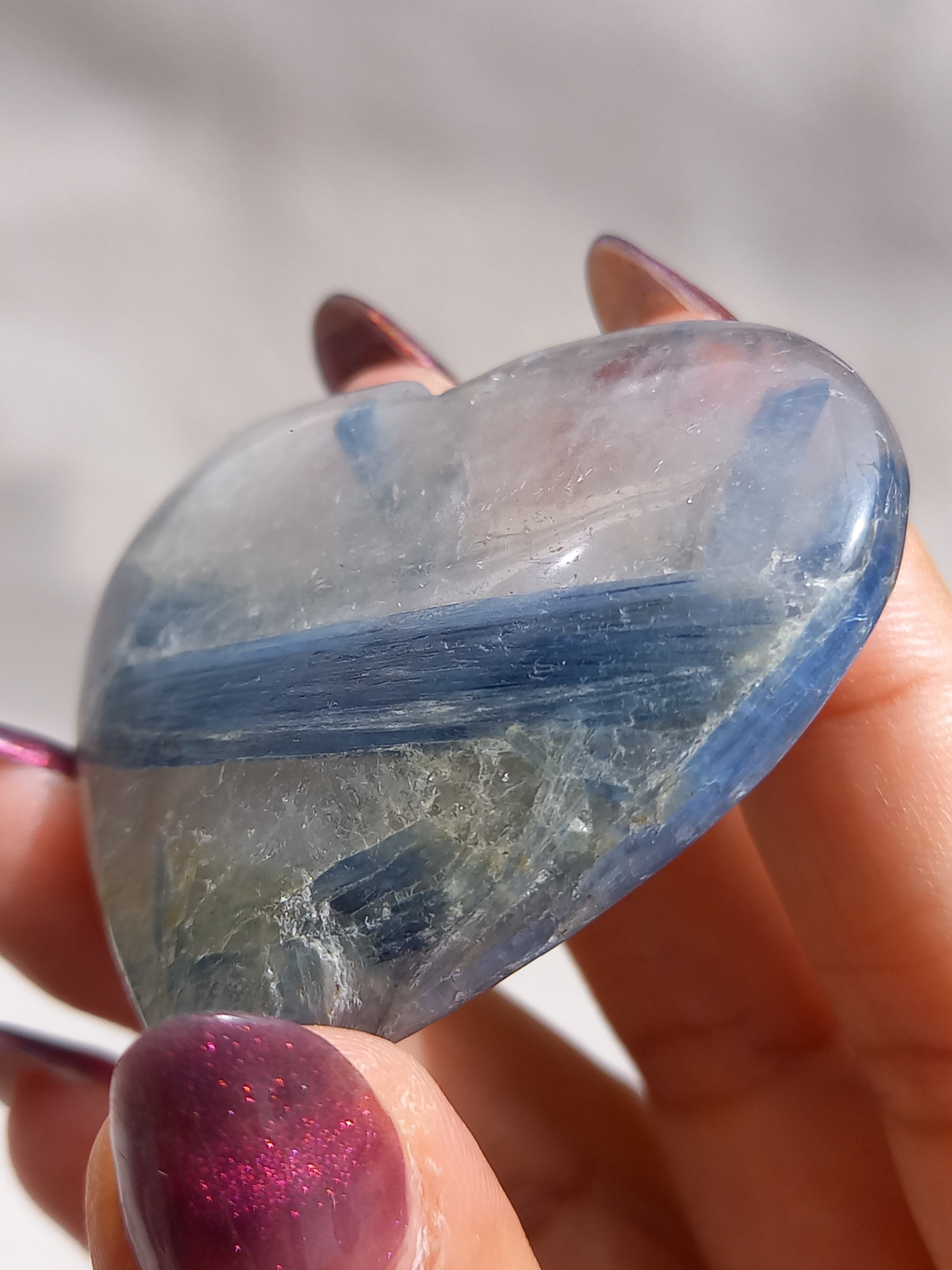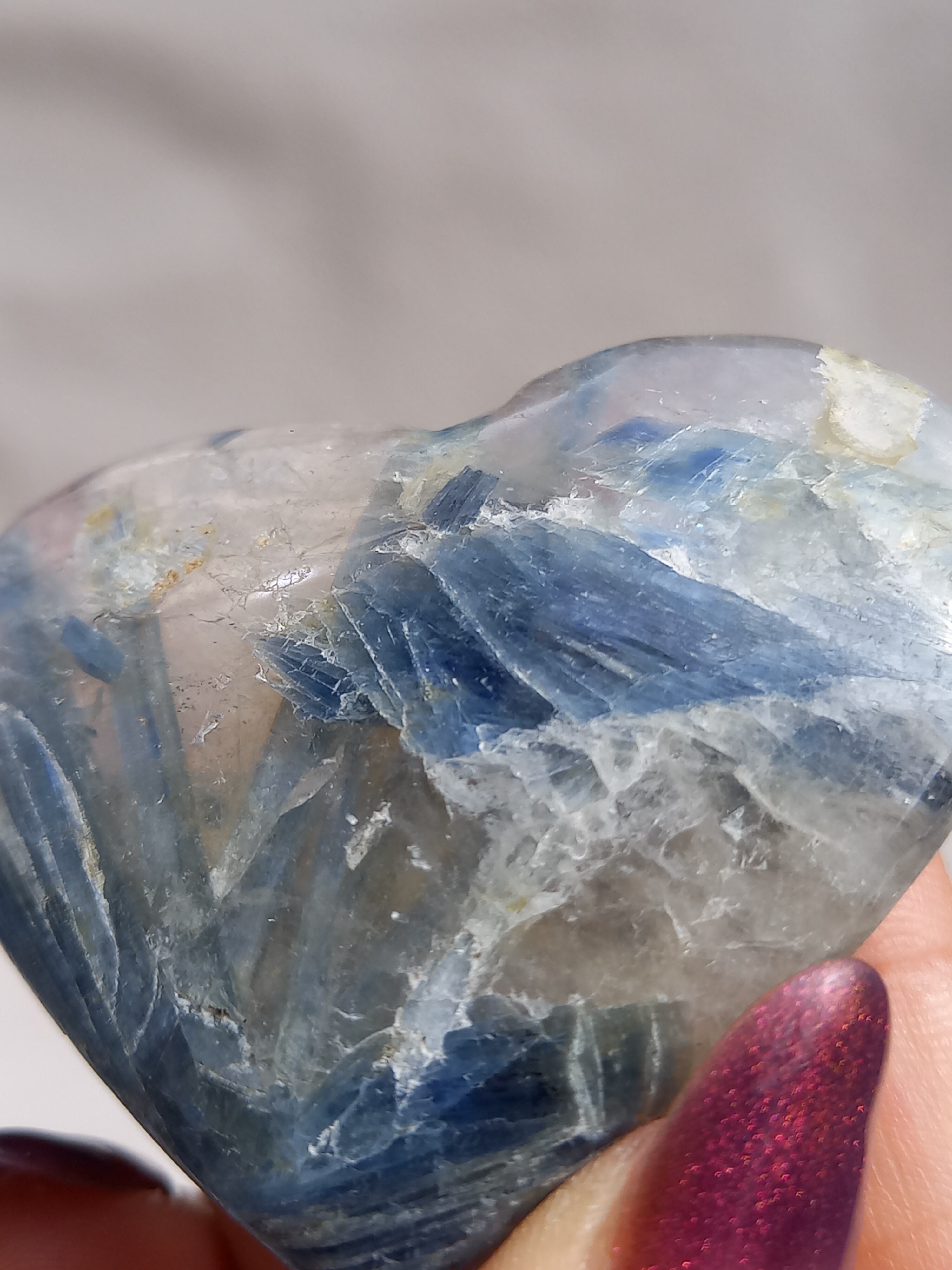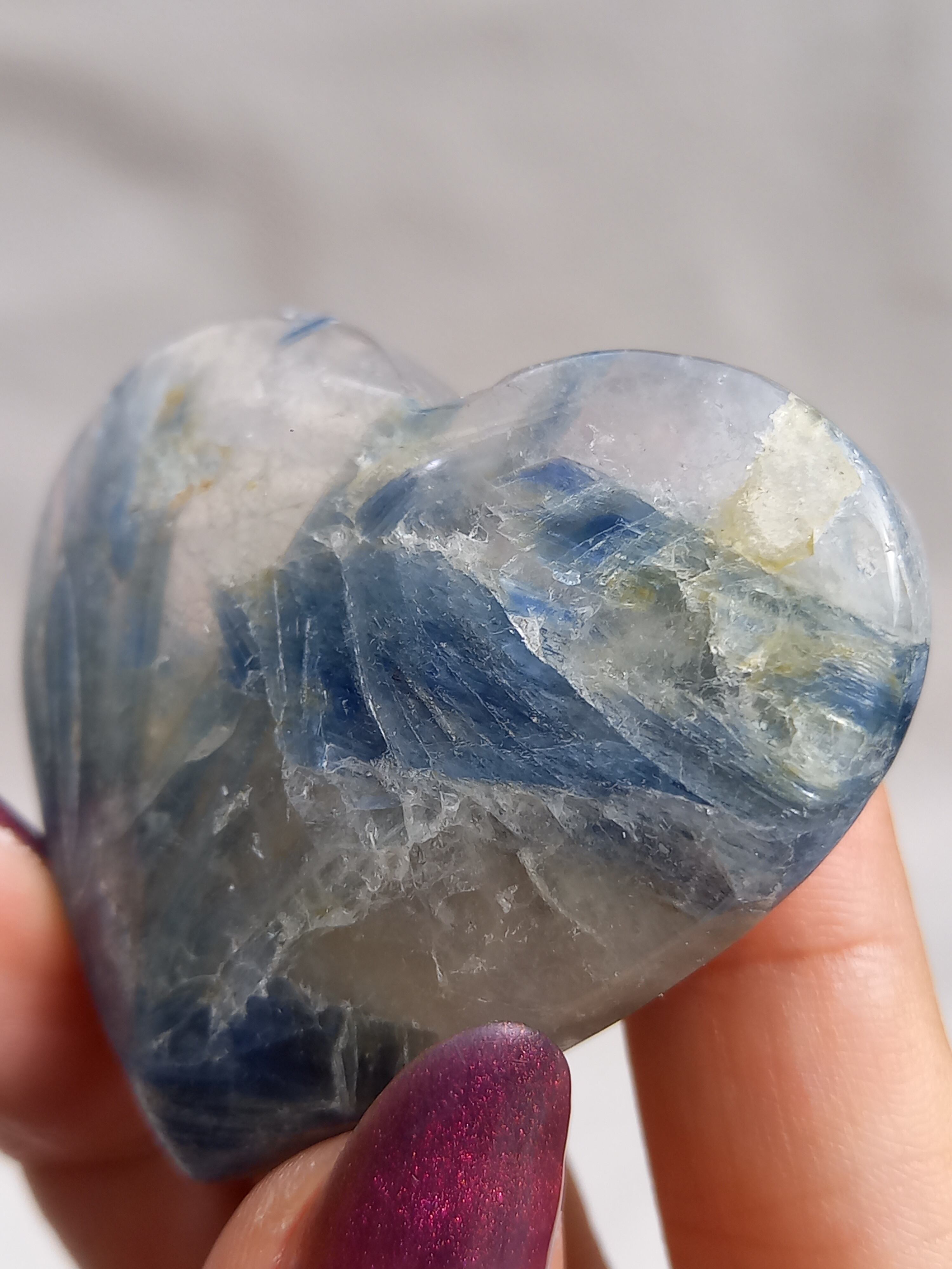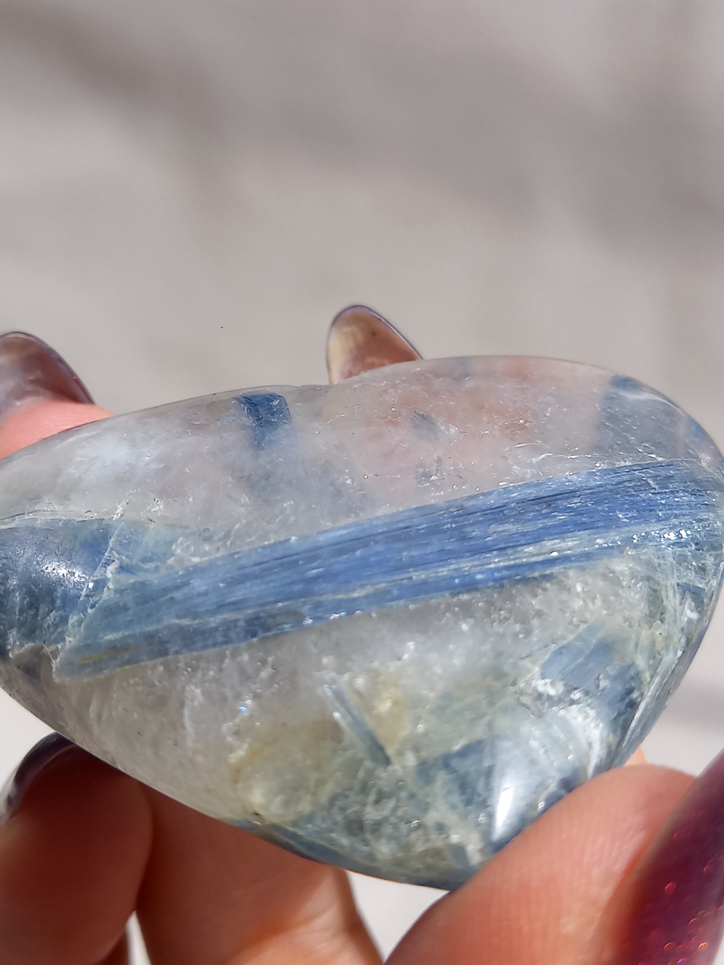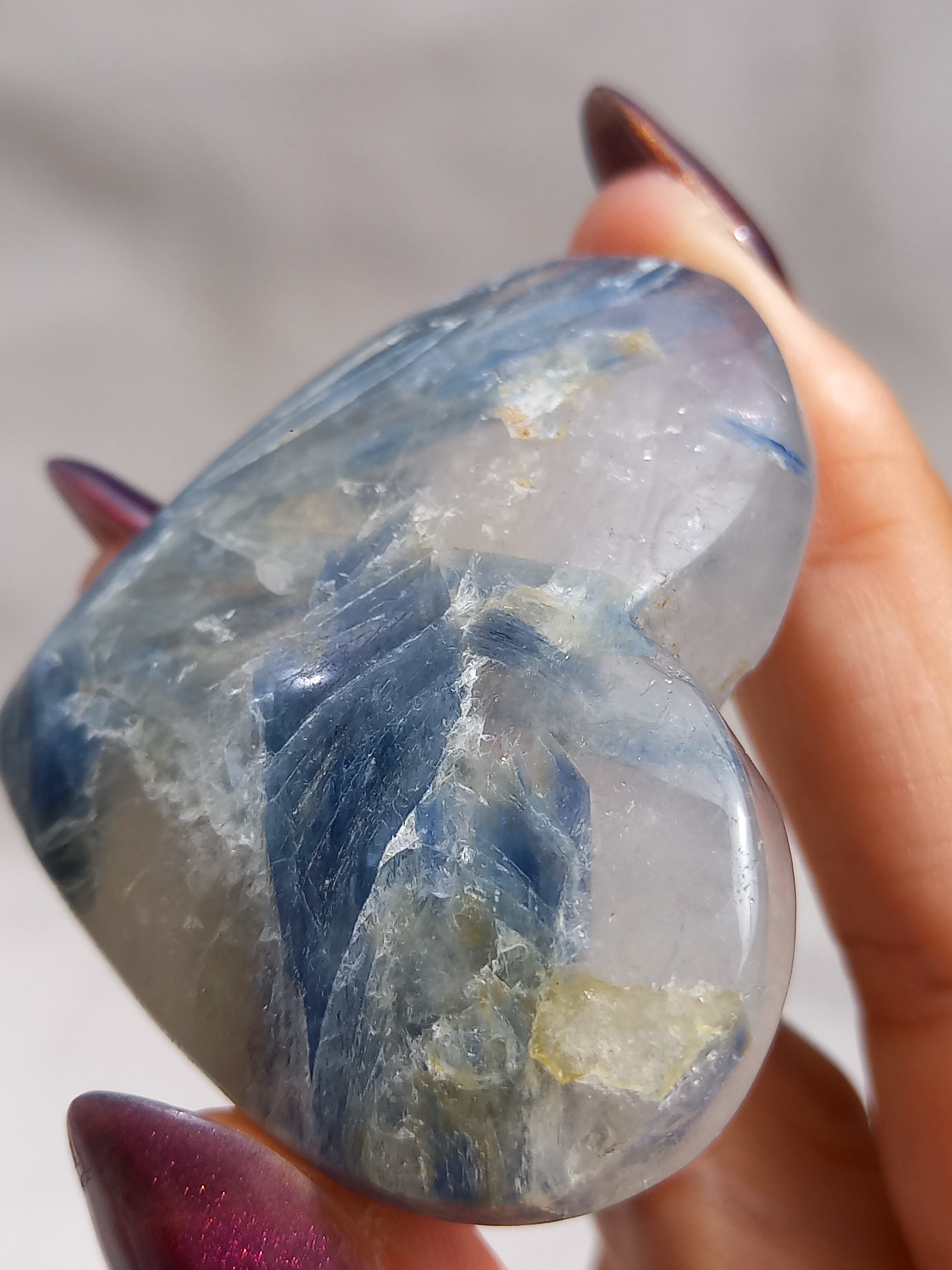 真っ青なブルーが美しいカイヤナイト。シリカと共生しており、カイヤナイトの結晶もしっかり見られる可愛いハートパームです。