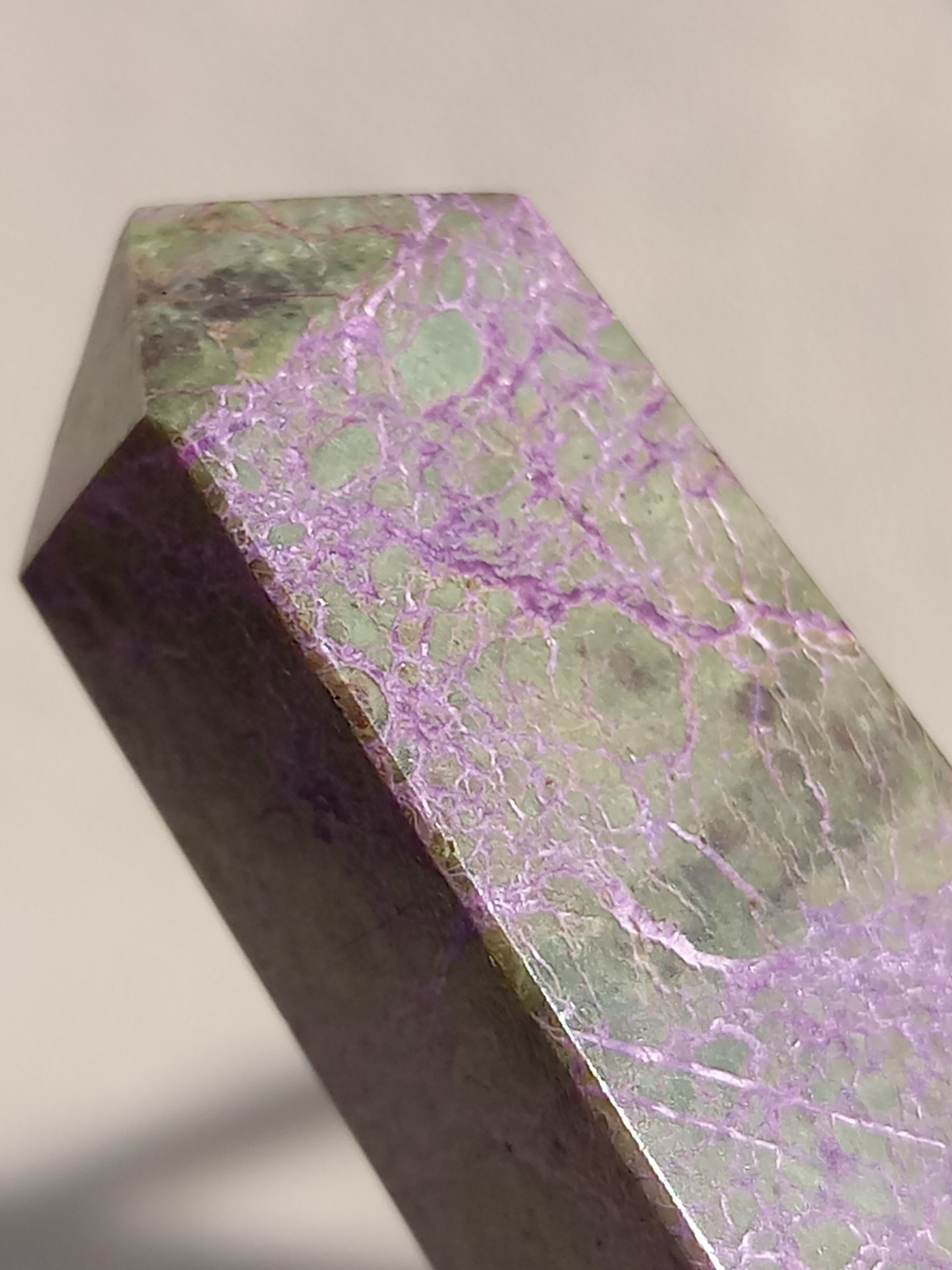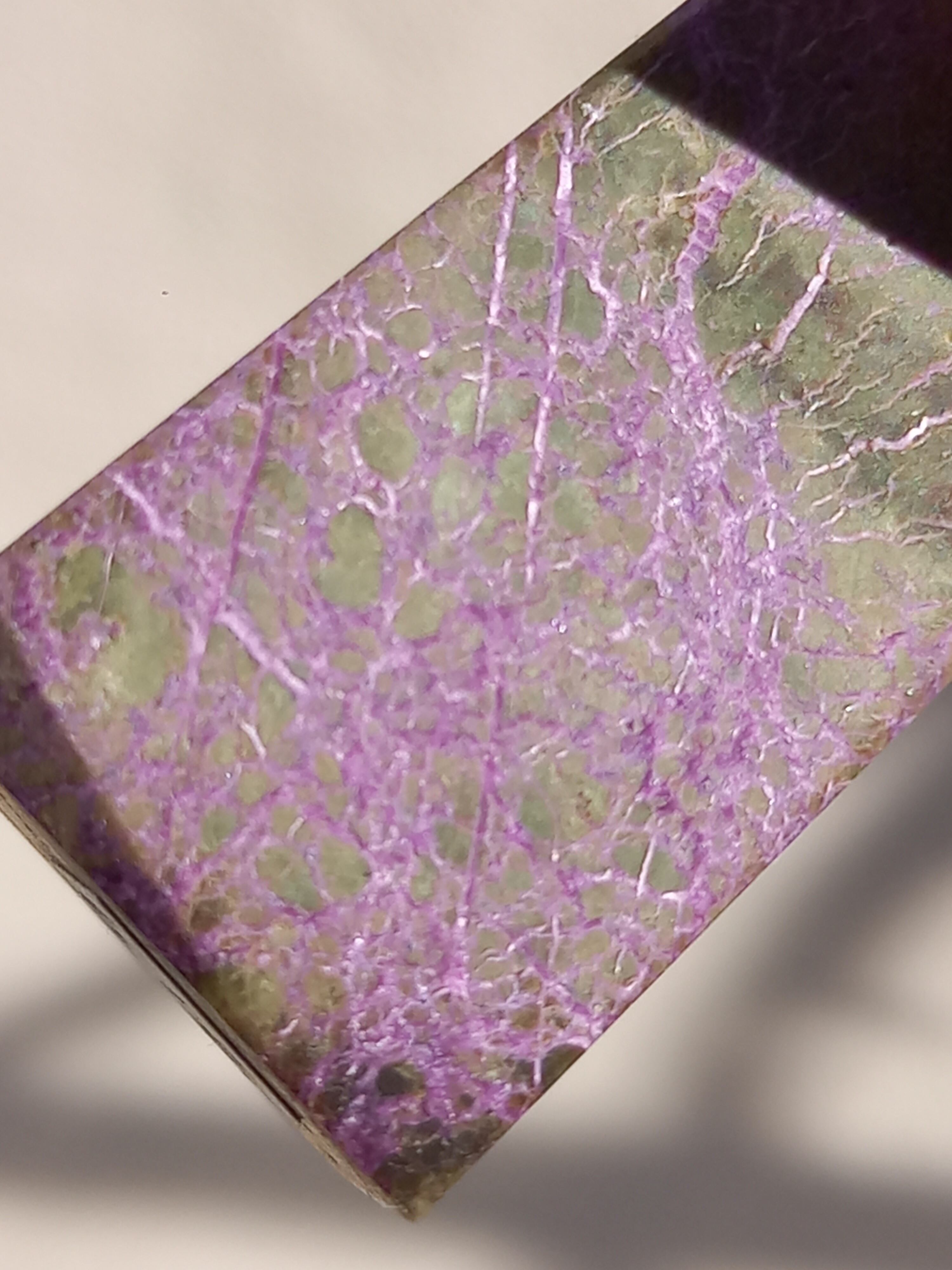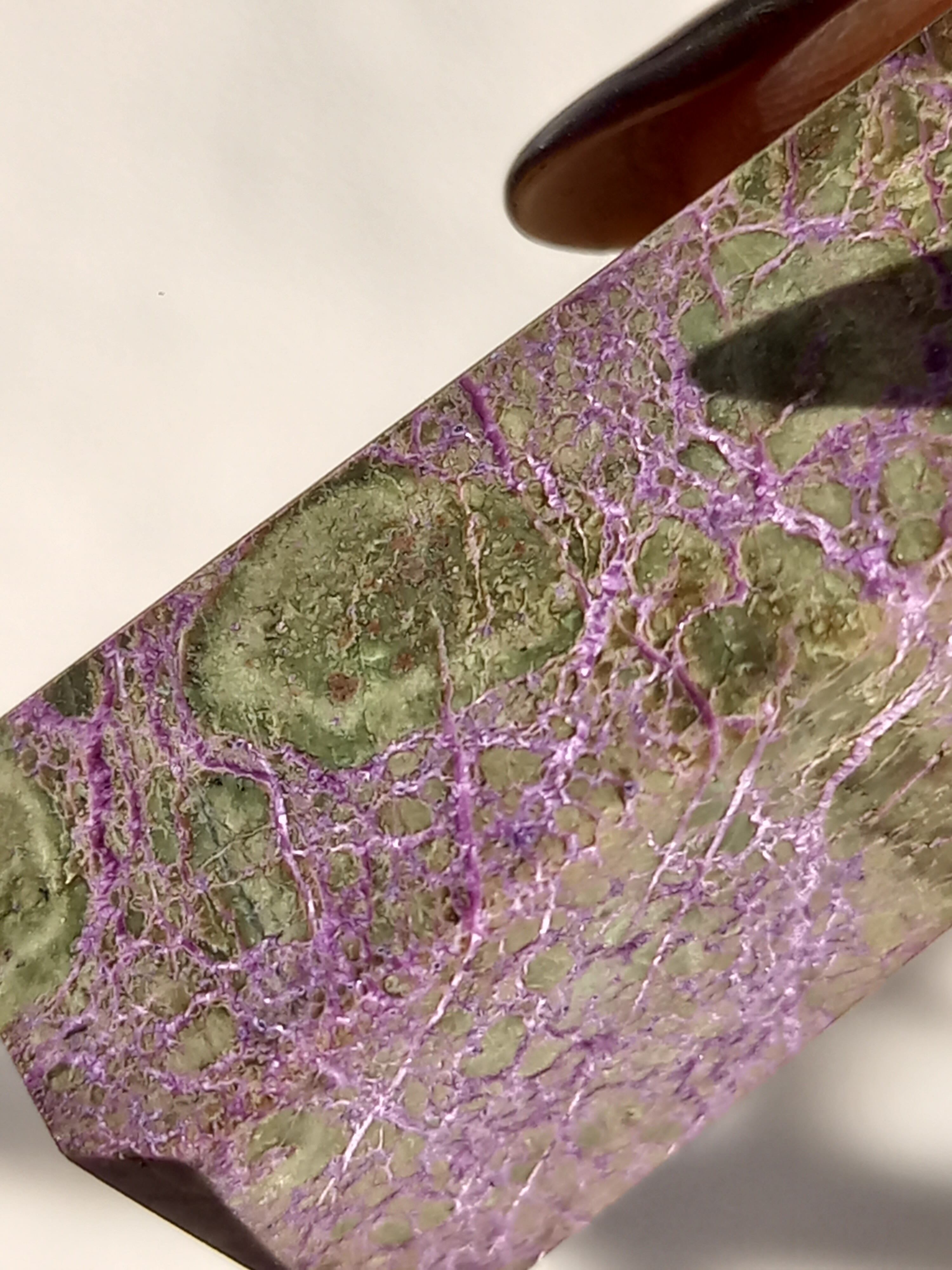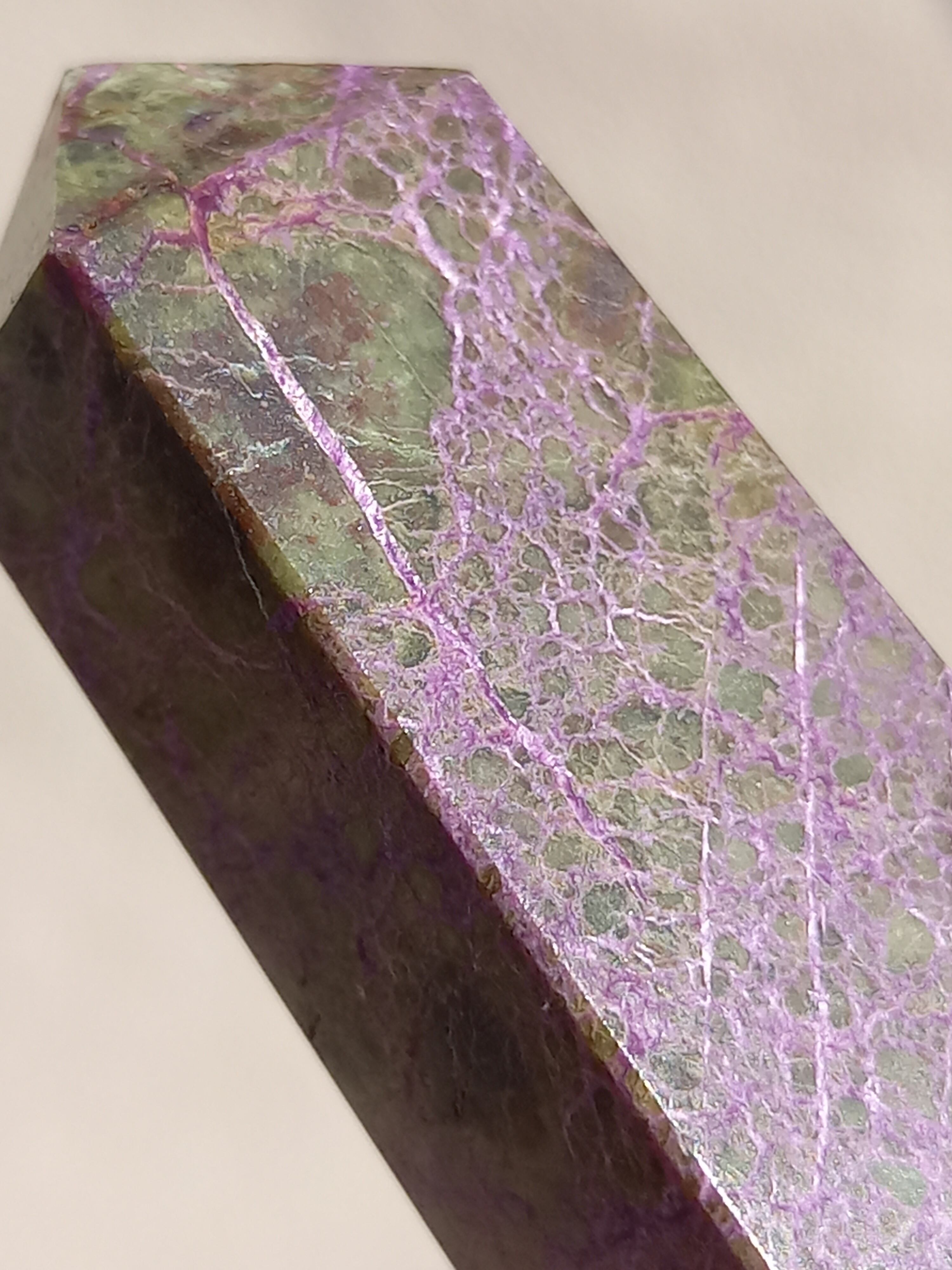 アトランティサイトは、紫色のスティヒタイトと、緑色のサーペンティンの共生鉱物で、1910年にオーストラリアのタスマニア、ダンダスで発見されました。 この産地が、かつて存在したといわれている幻の大陸「アトランティス」の一部だったという逸話から、アトランティサイトと名付けられました。
