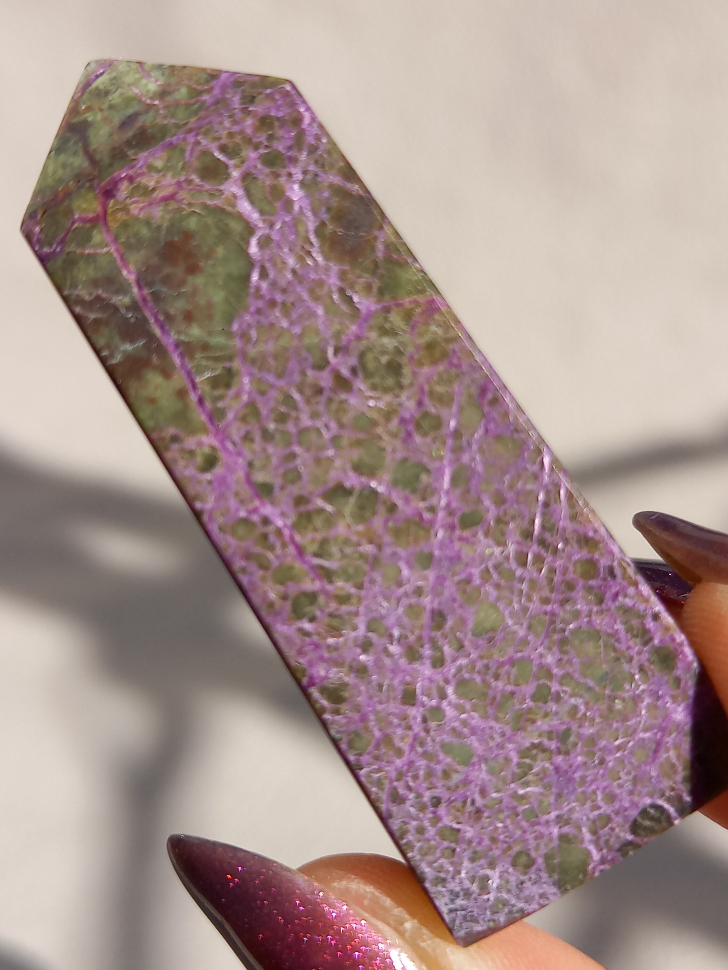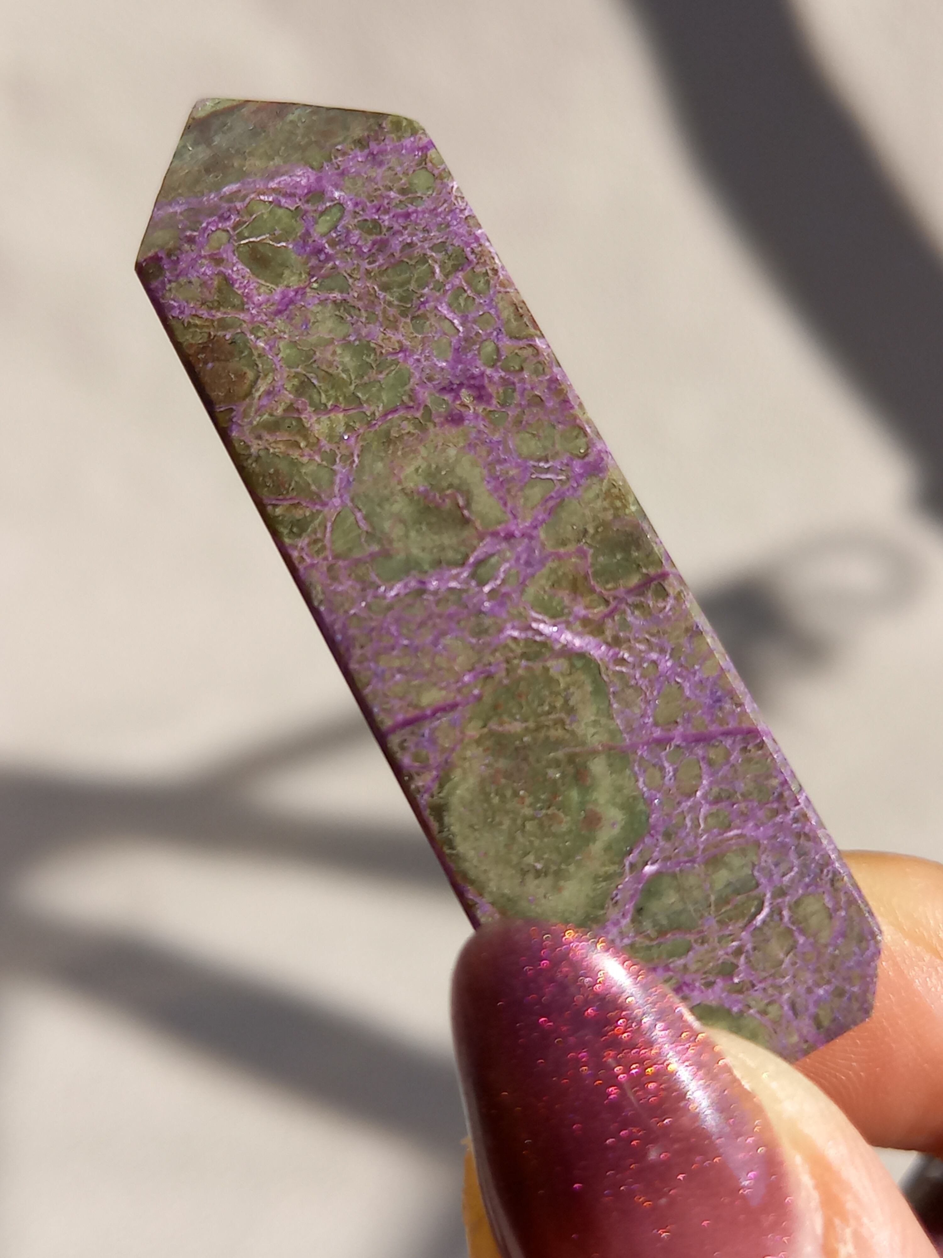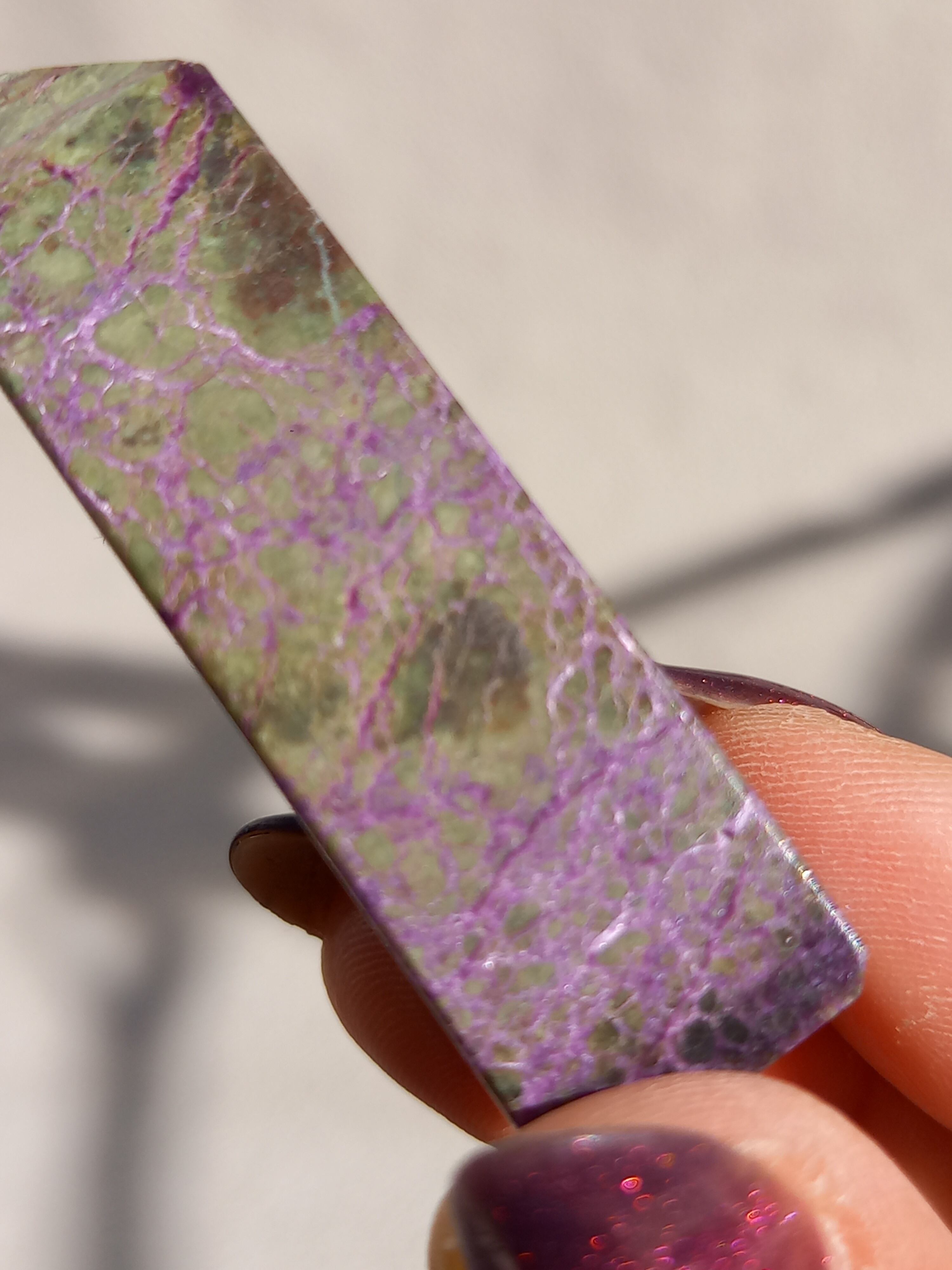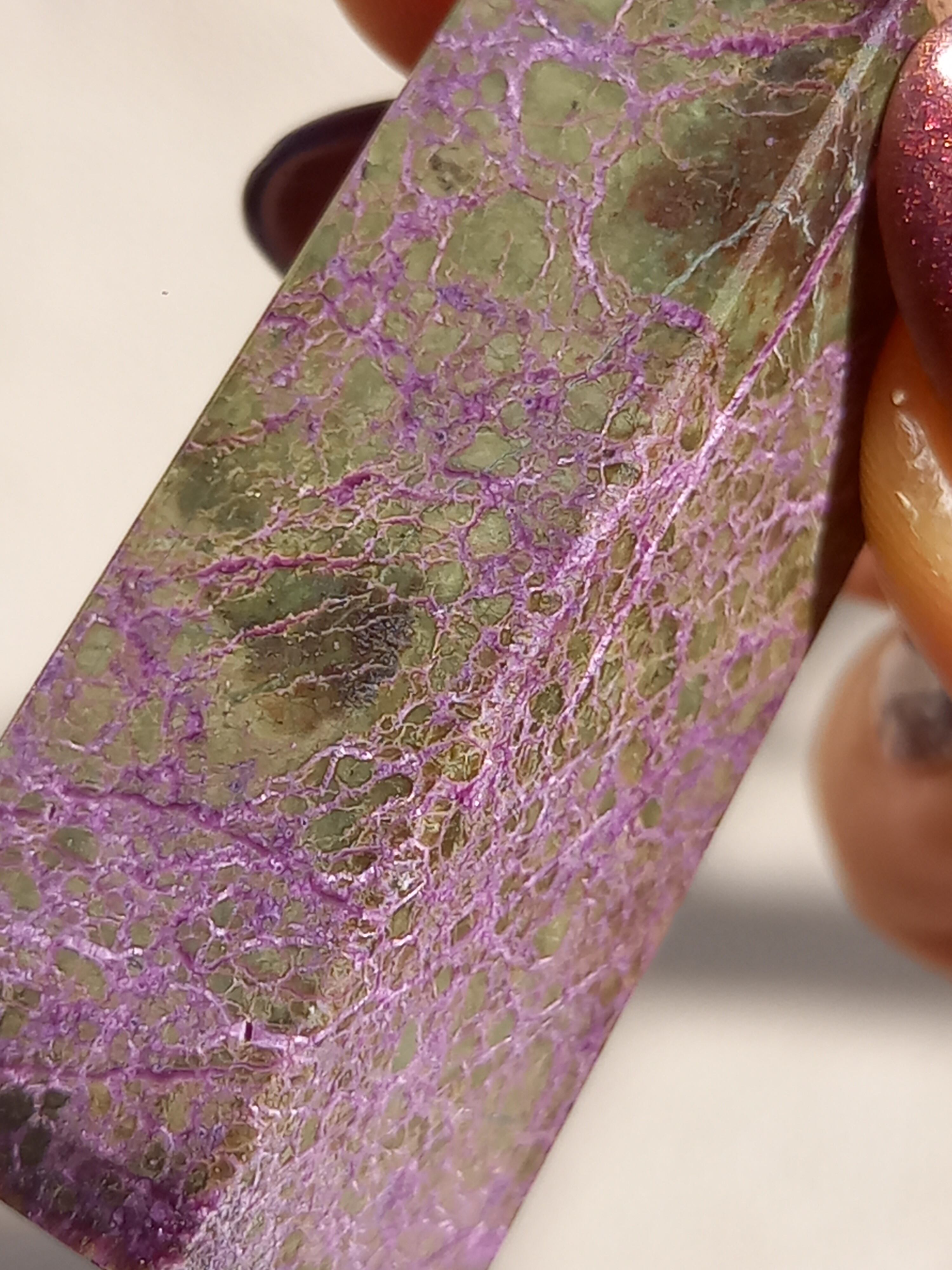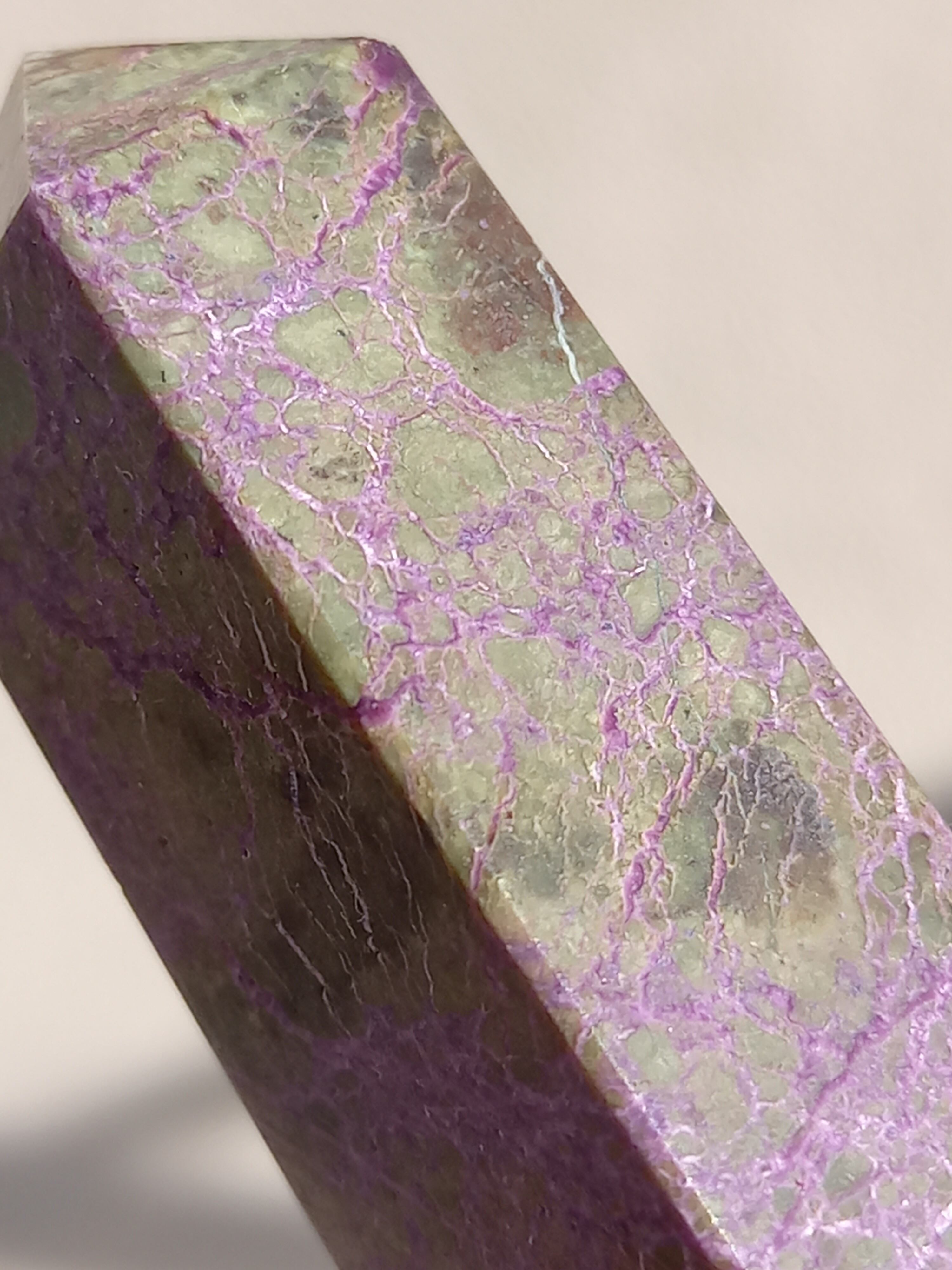 アトランティサイトは、紫色のスティヒタイトと、緑色のサーペンティンの共生鉱物で、1910年にオーストラリアのタスマニア、ダンダスで発見されました。 この産地が、かつて存在したといわれている幻の大陸「アトランティス」の一部だったという逸話から、アトランティサイトと名付けられました。