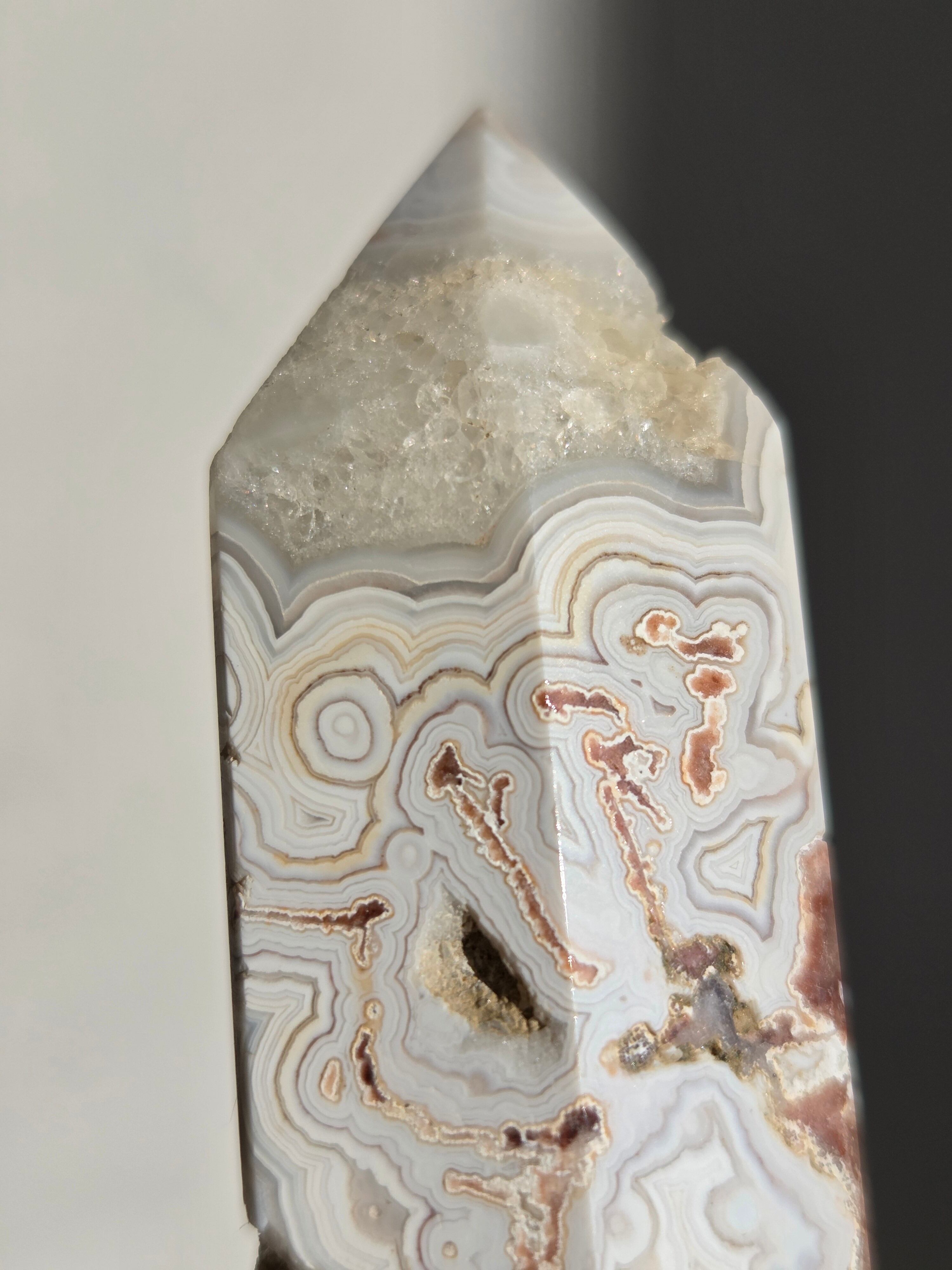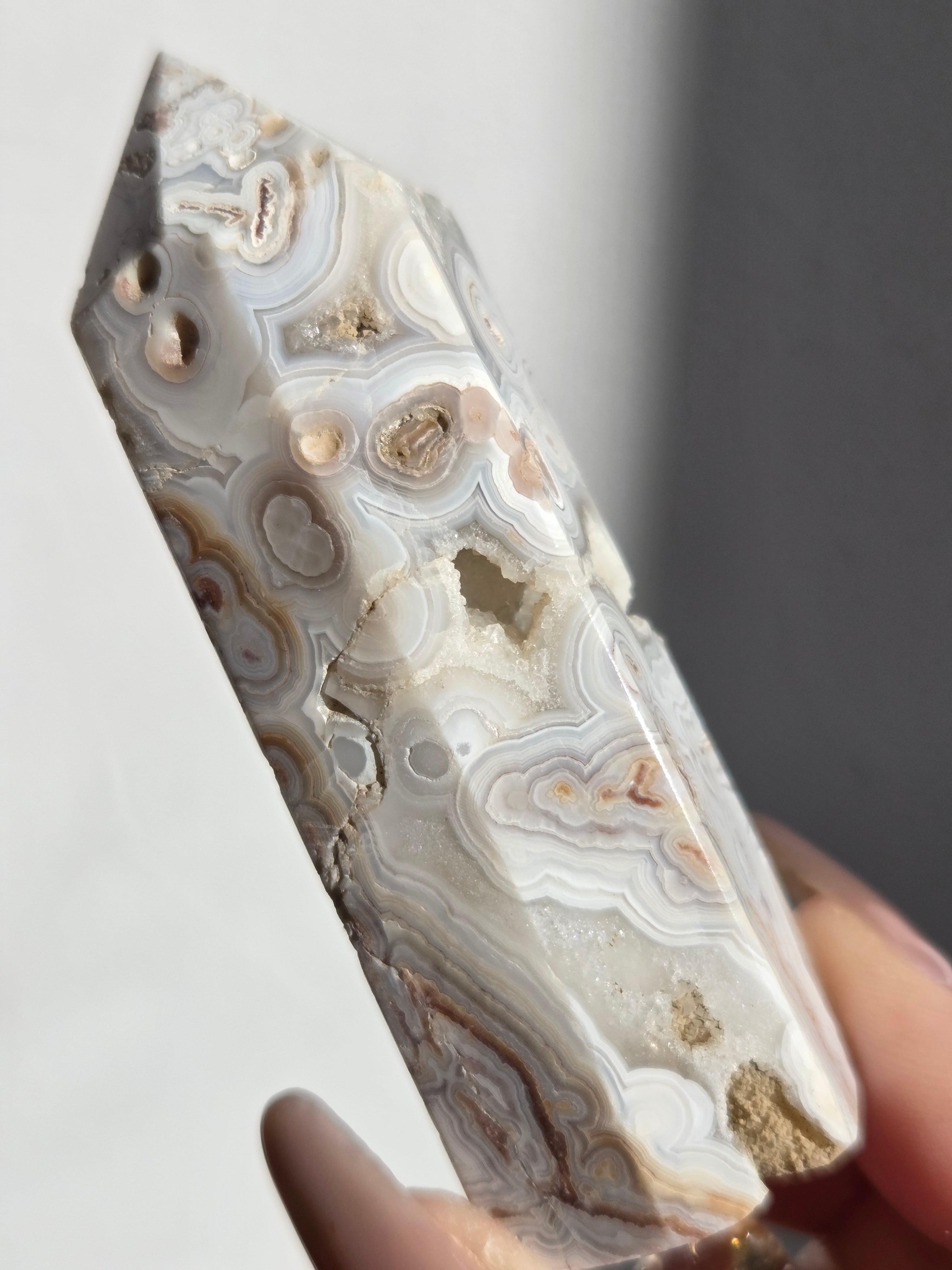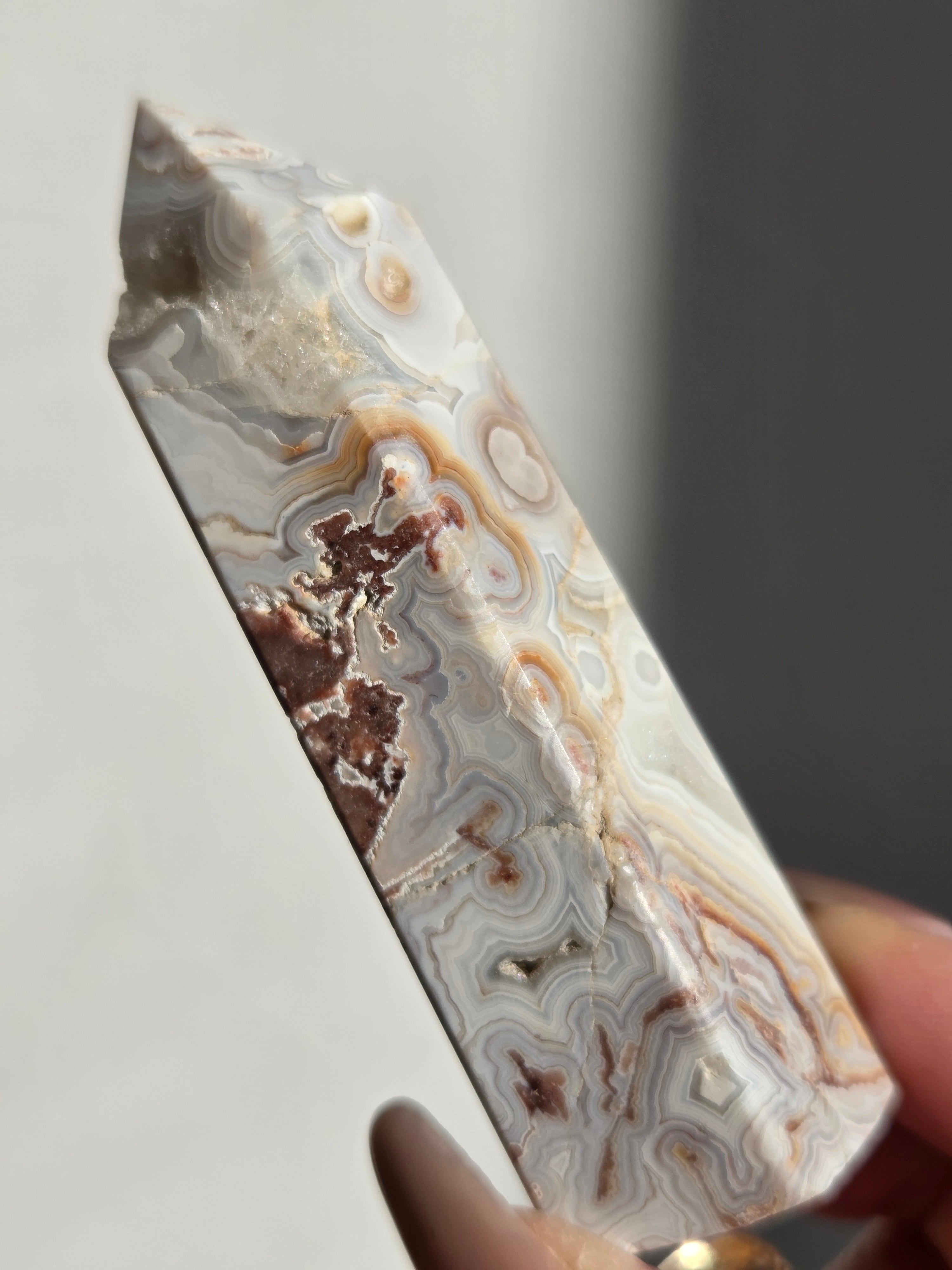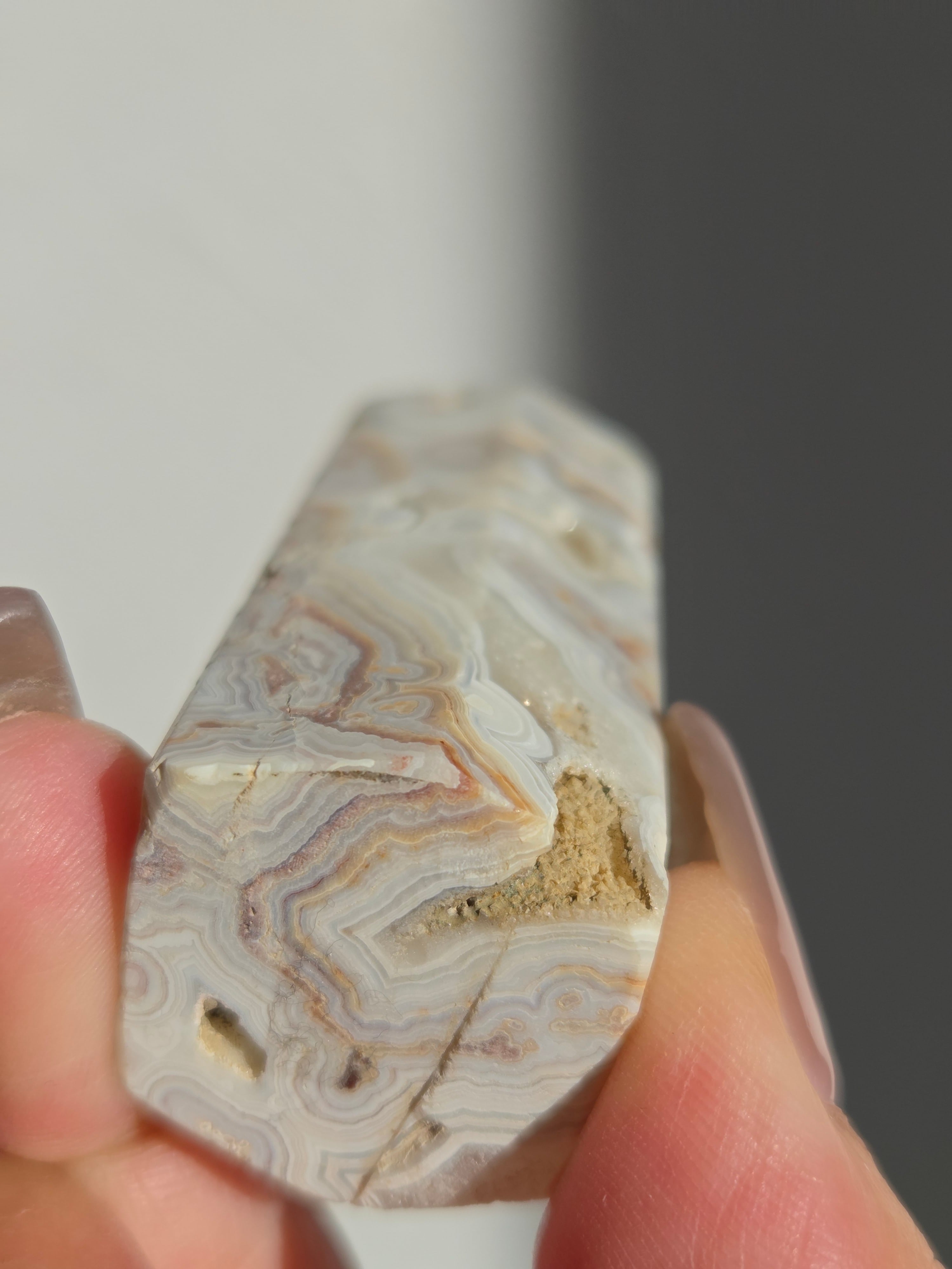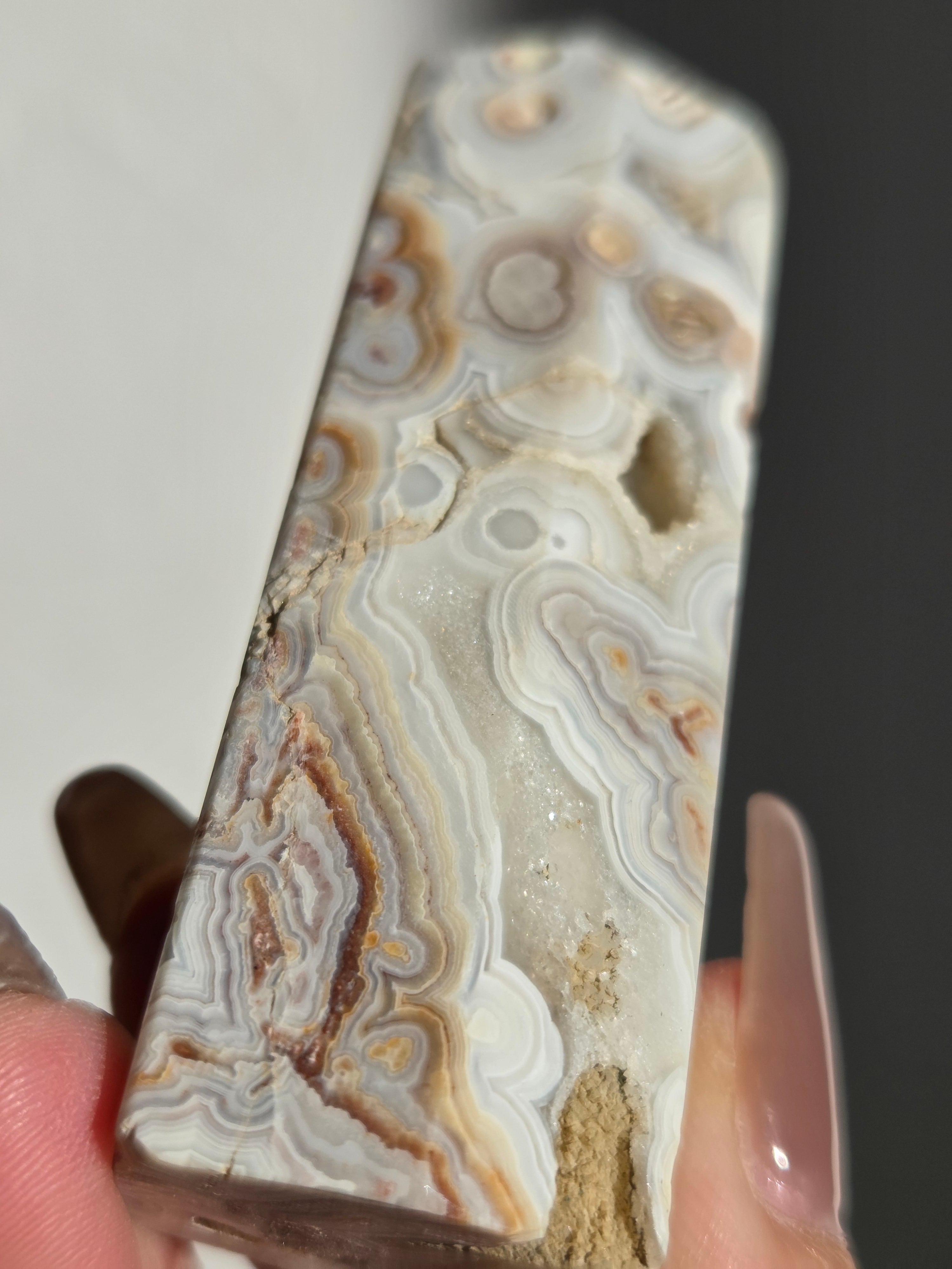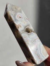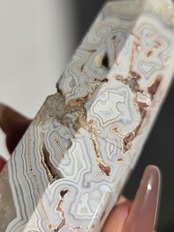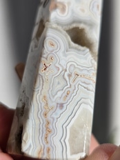クレイジーレースアゲートは、ヒーリングストーンの一つで、幾層にも重なった模様から発せられる些細な波動が心身にやさしく働きかけ、持ち主の精神的な痛みを和らげ、感情的な負担を解放してくれるといわれています。 クレイジーレースアゲートは、強力な守護力があり、旅の守護石とも呼ばれています。