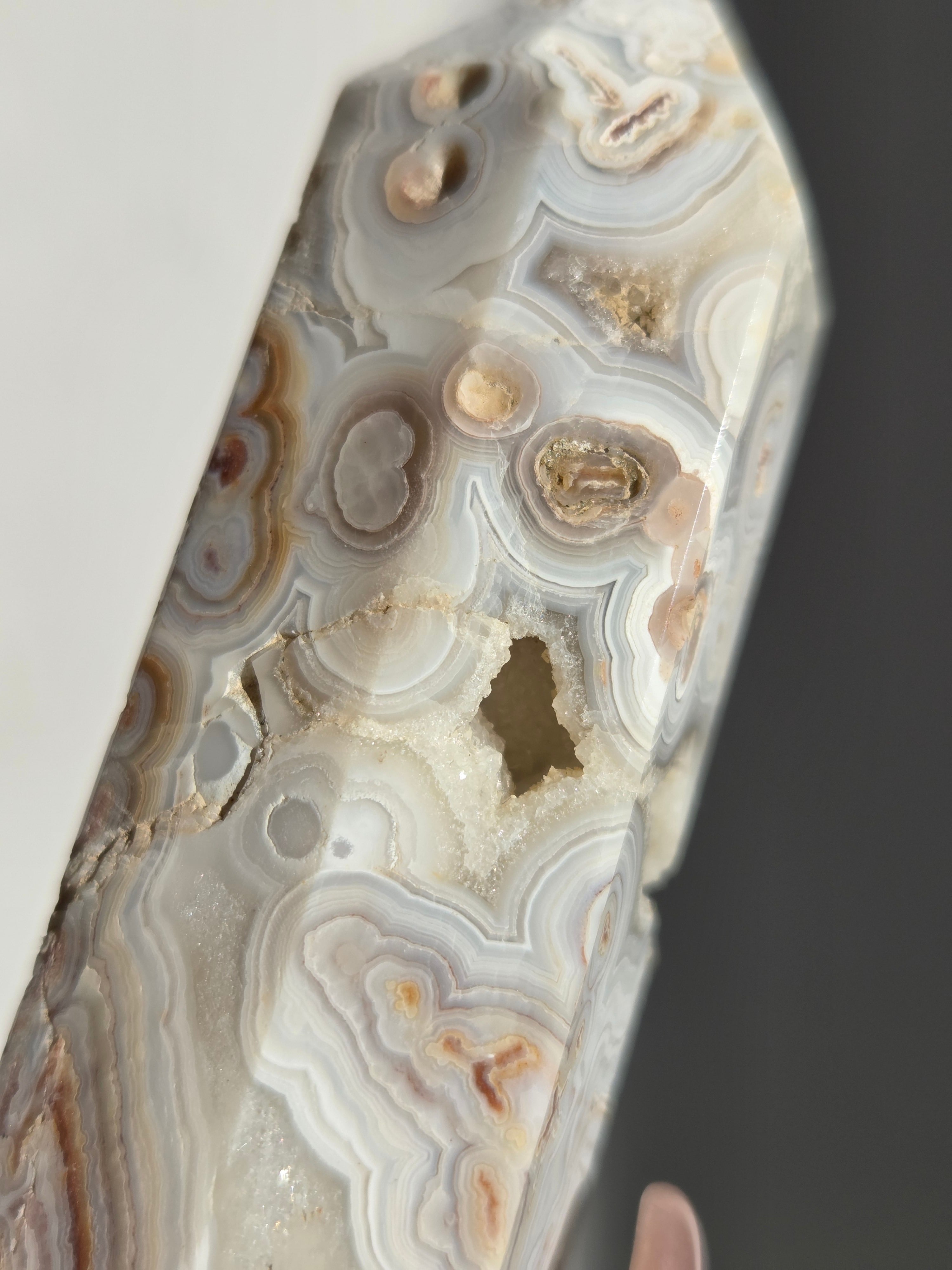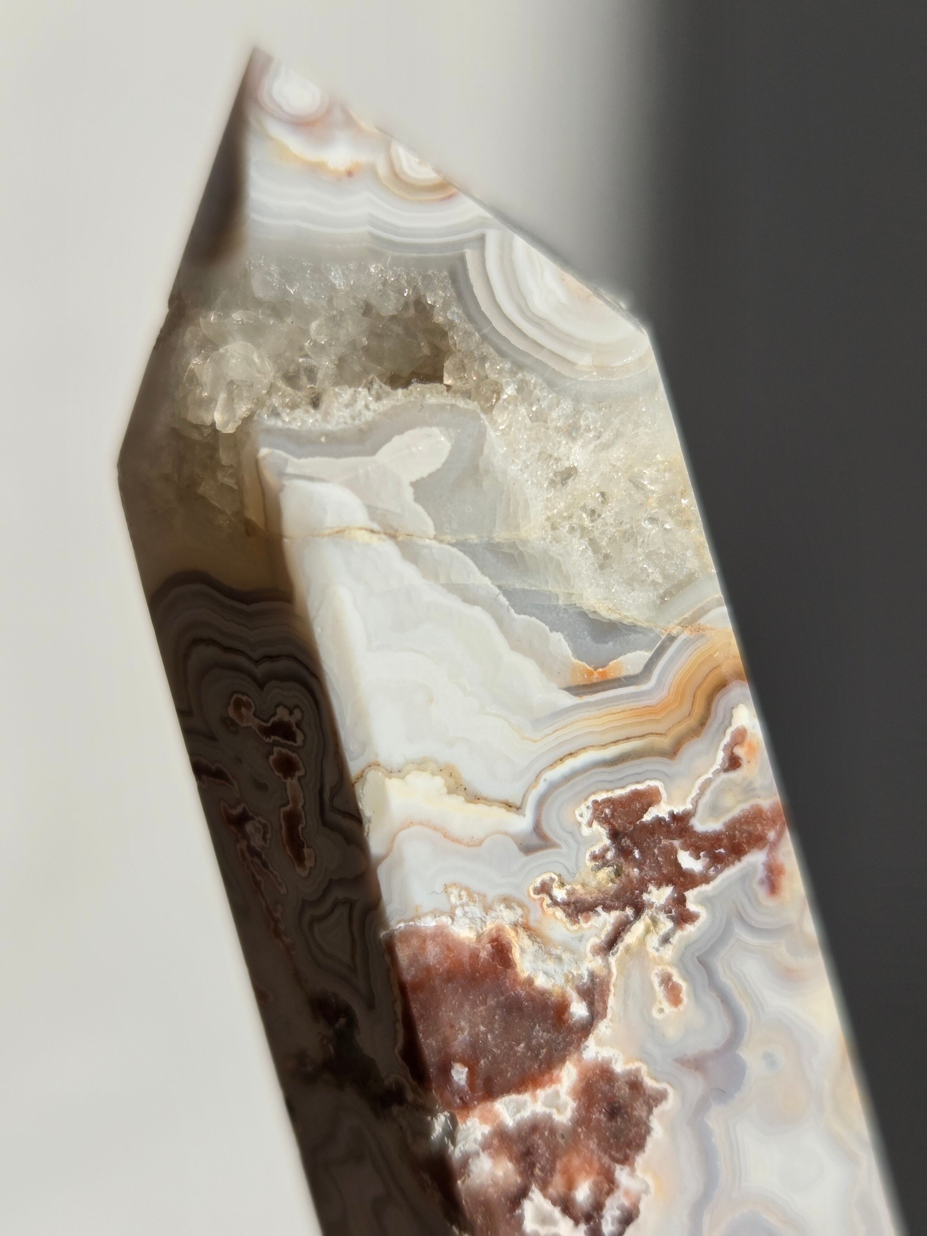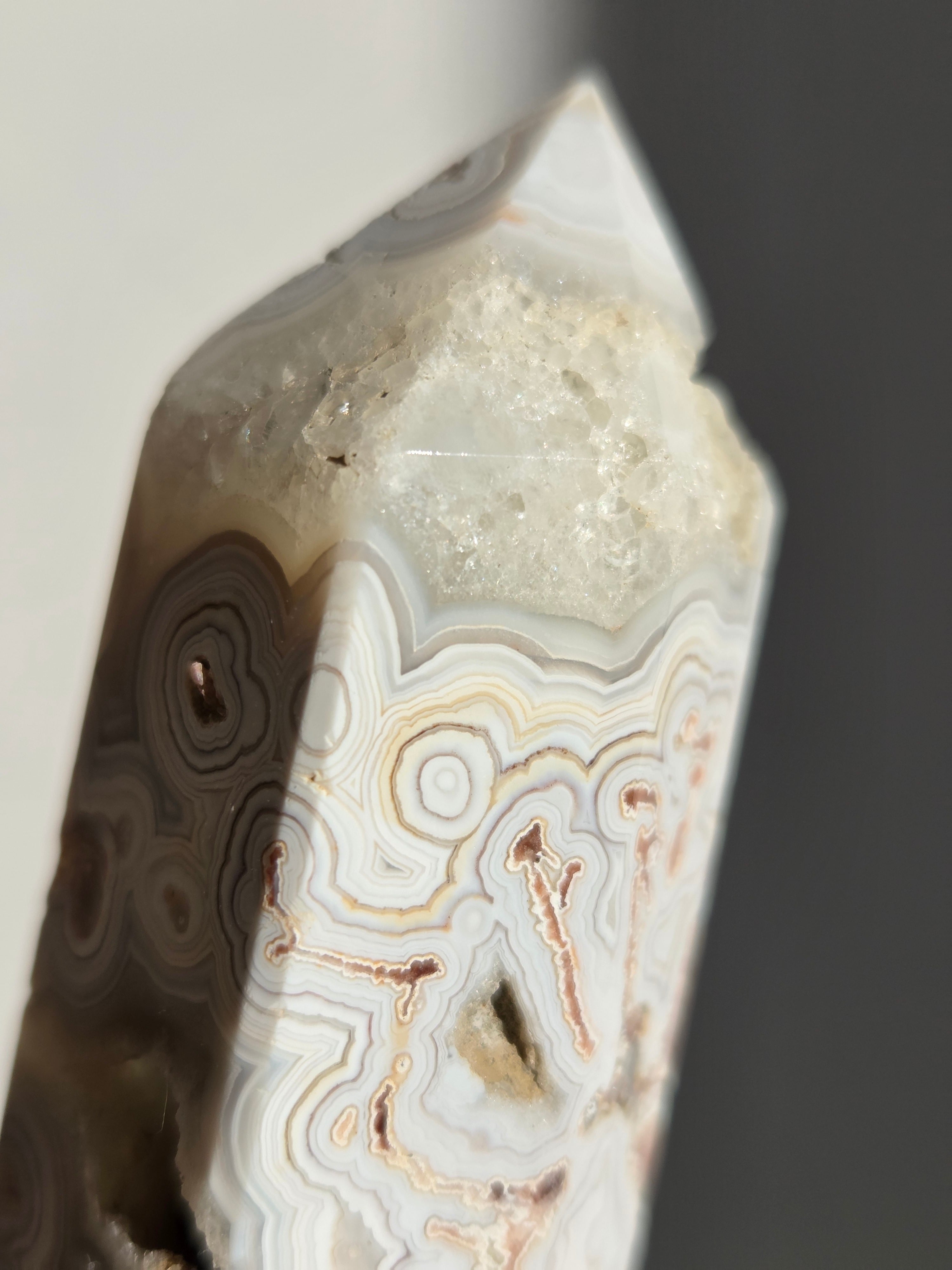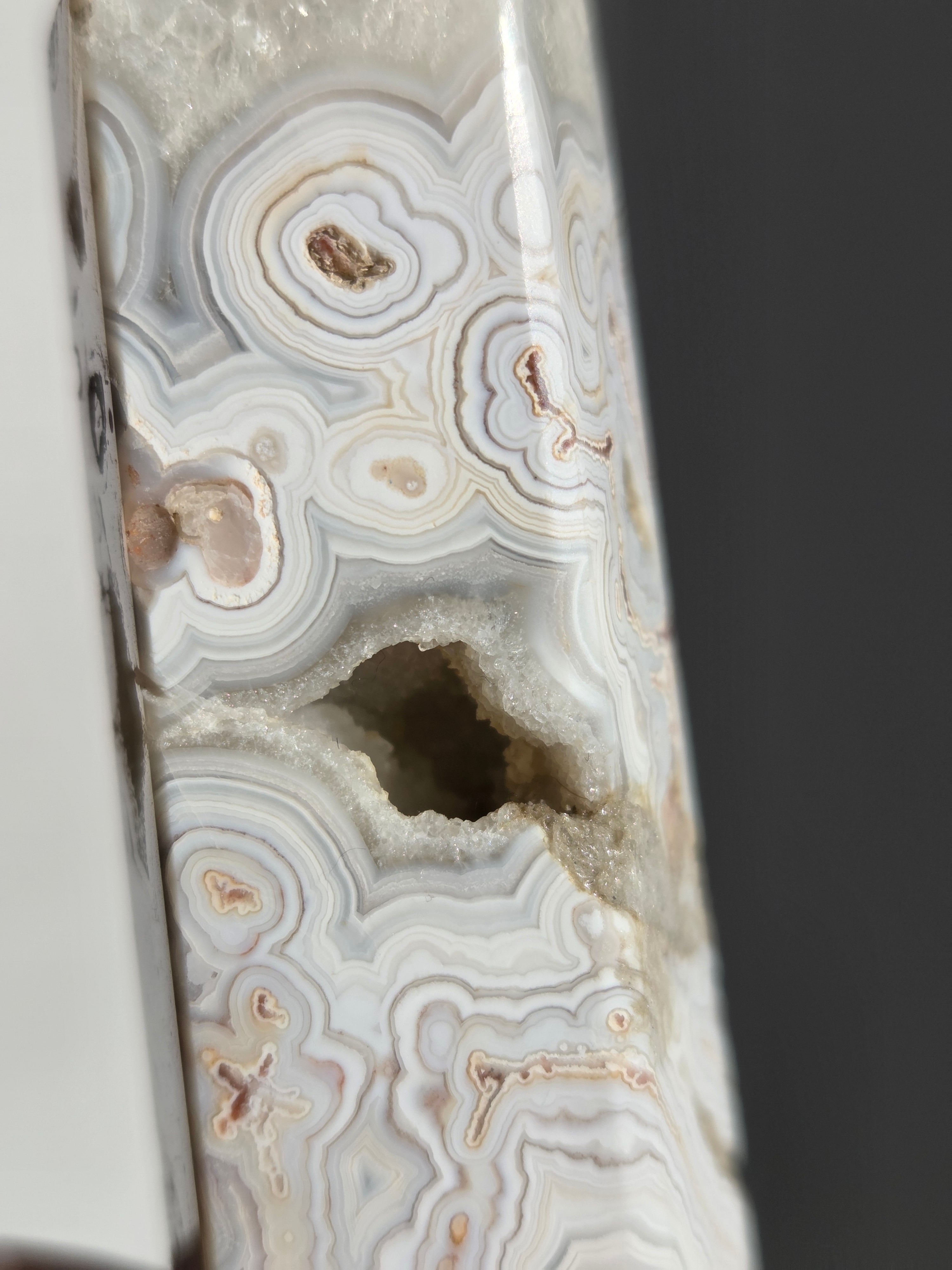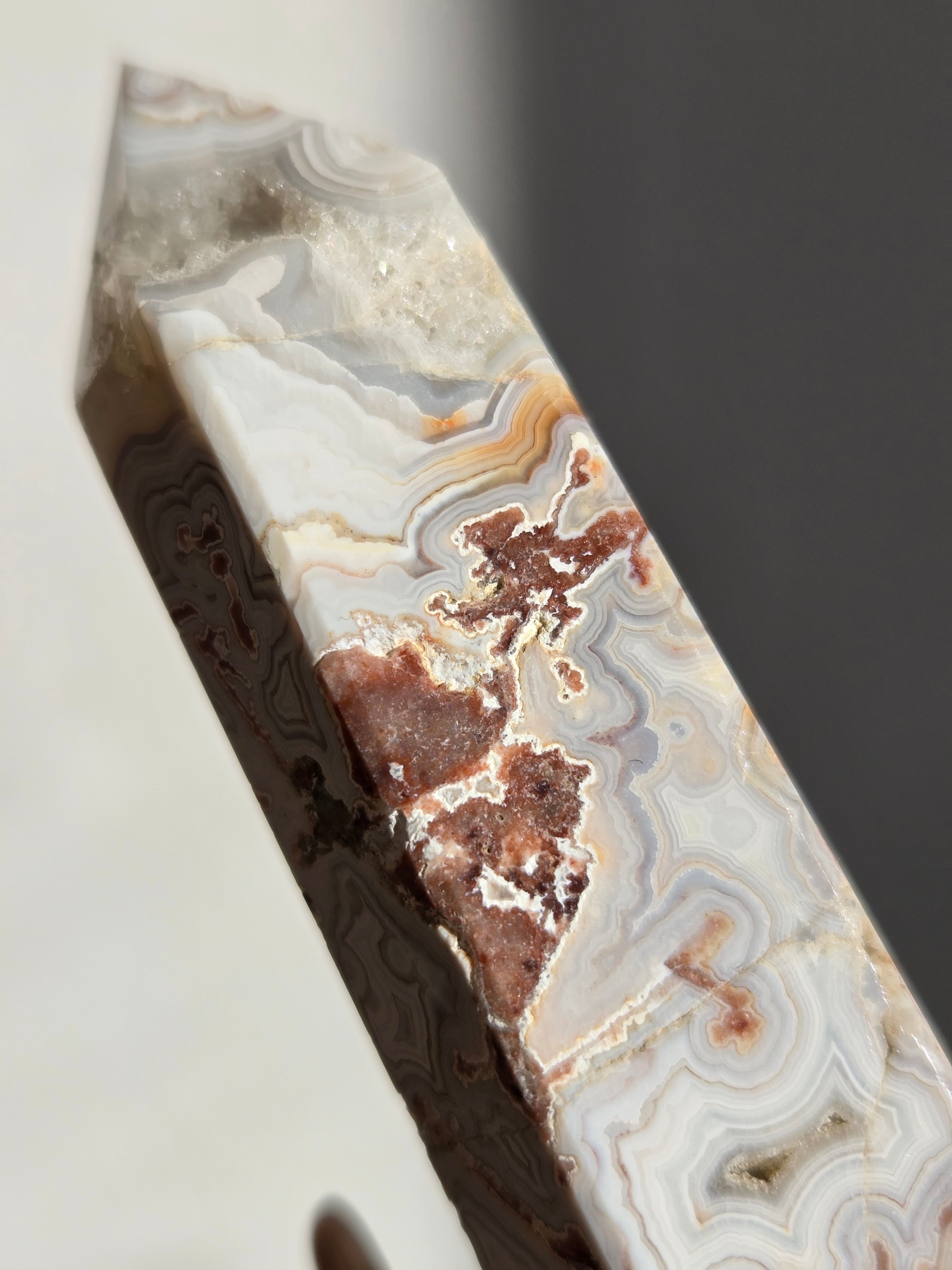 クレイジーレースアゲートは、ヒーリングストーンの一つで、幾層にも重なった模様から発せられる些細な波動が心身にやさしく働きかけ、持ち主の精神的な痛みを和らげ、感情的な負担を解放してくれるといわれています。 クレイジーレースアゲートは、強力な守護力があり、旅の守護石とも呼ばれています。
