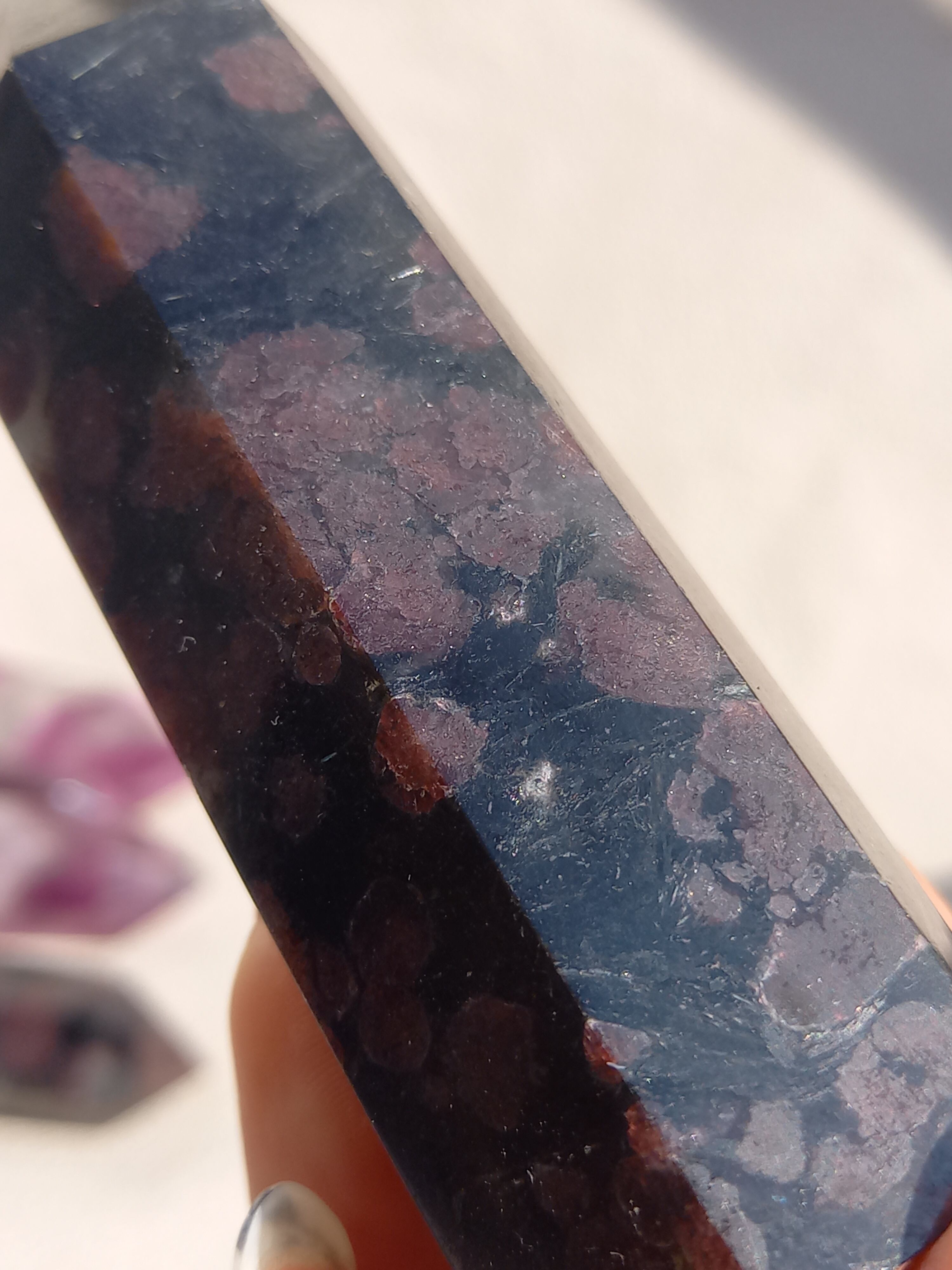 ガーネットの深い赤色に、黒色の部分ヌーマイトの特徴の、羽のように見える、ルチルのような輝きが、キラキラで圧巻のスフィアです。