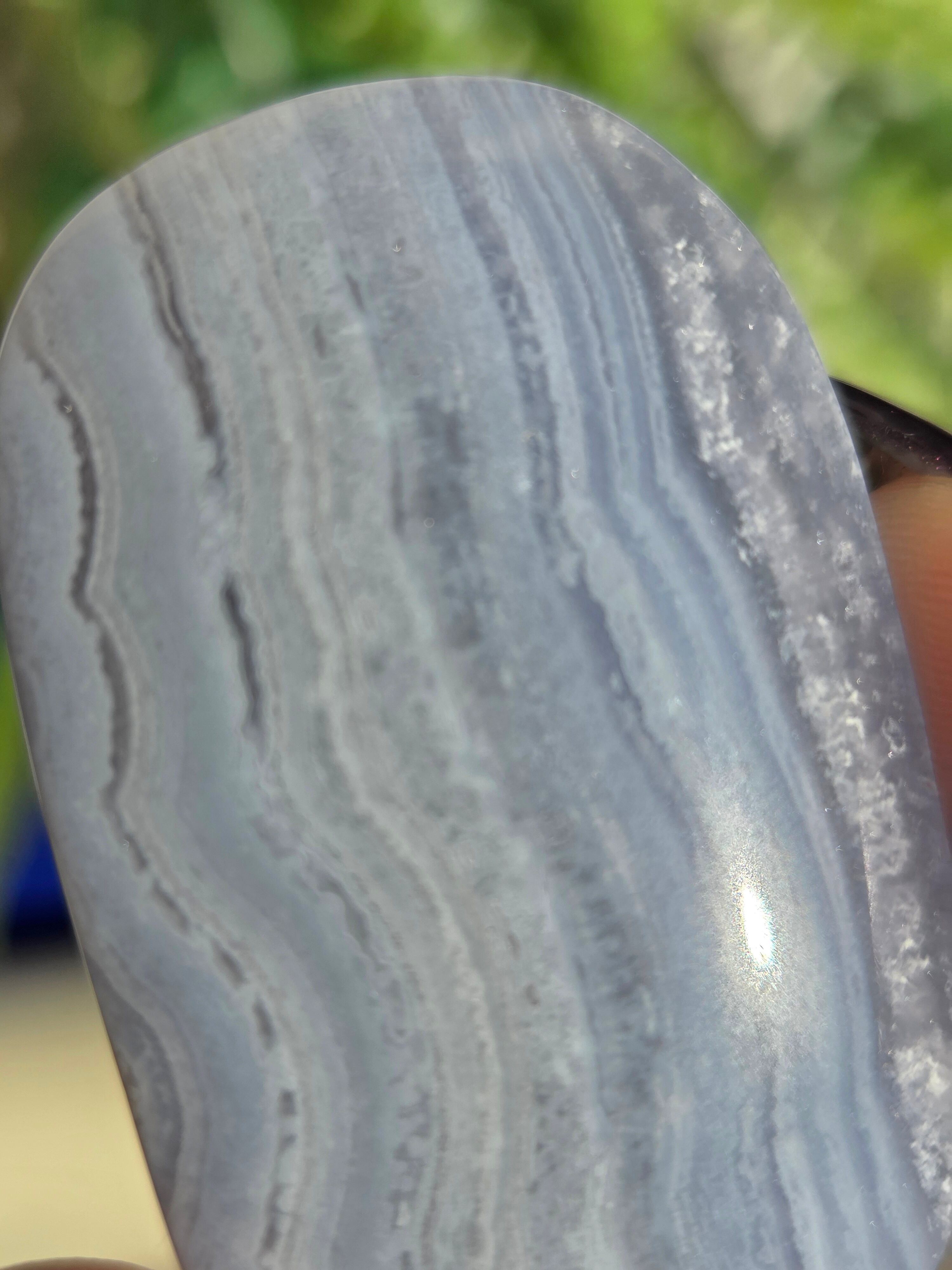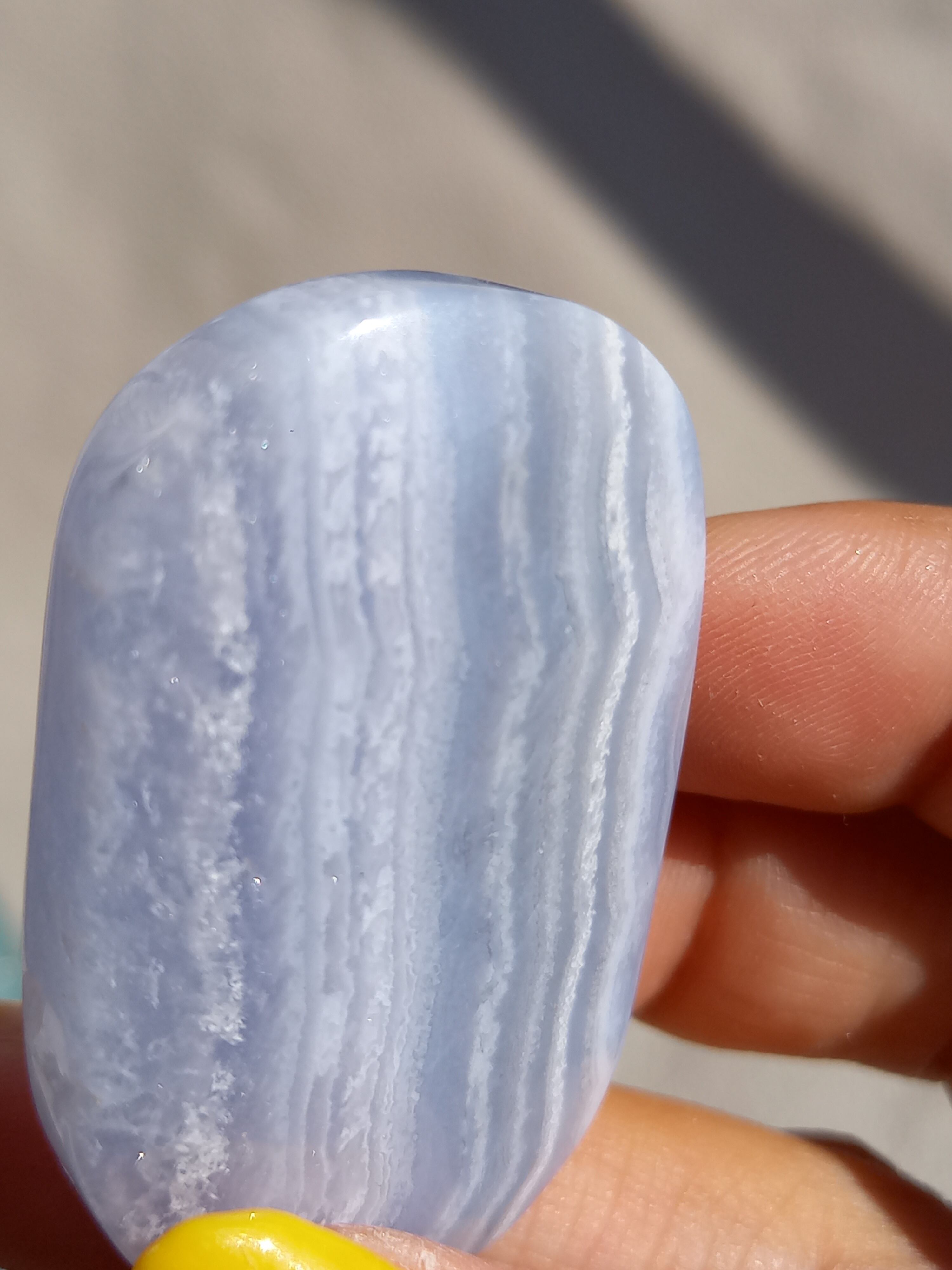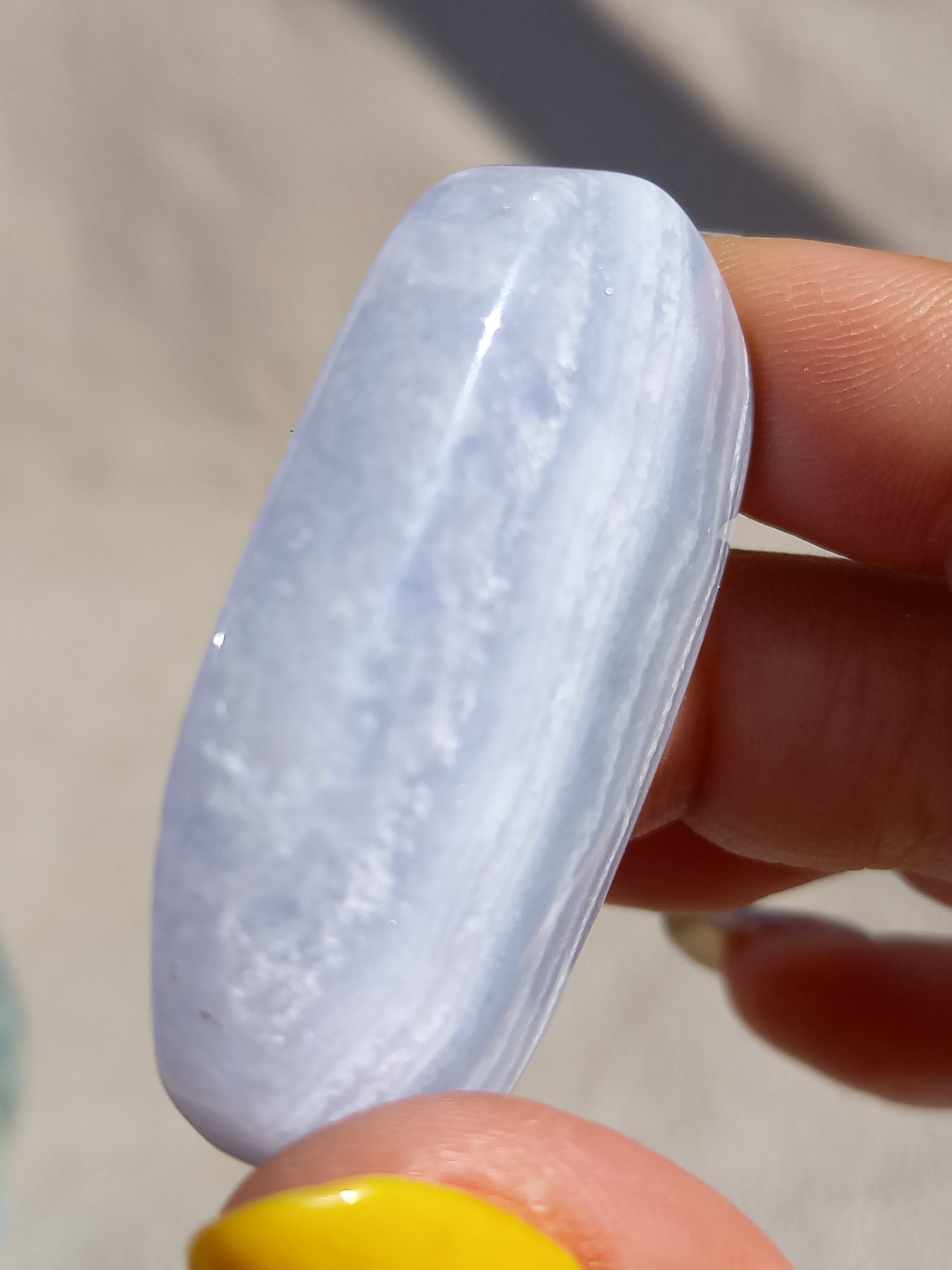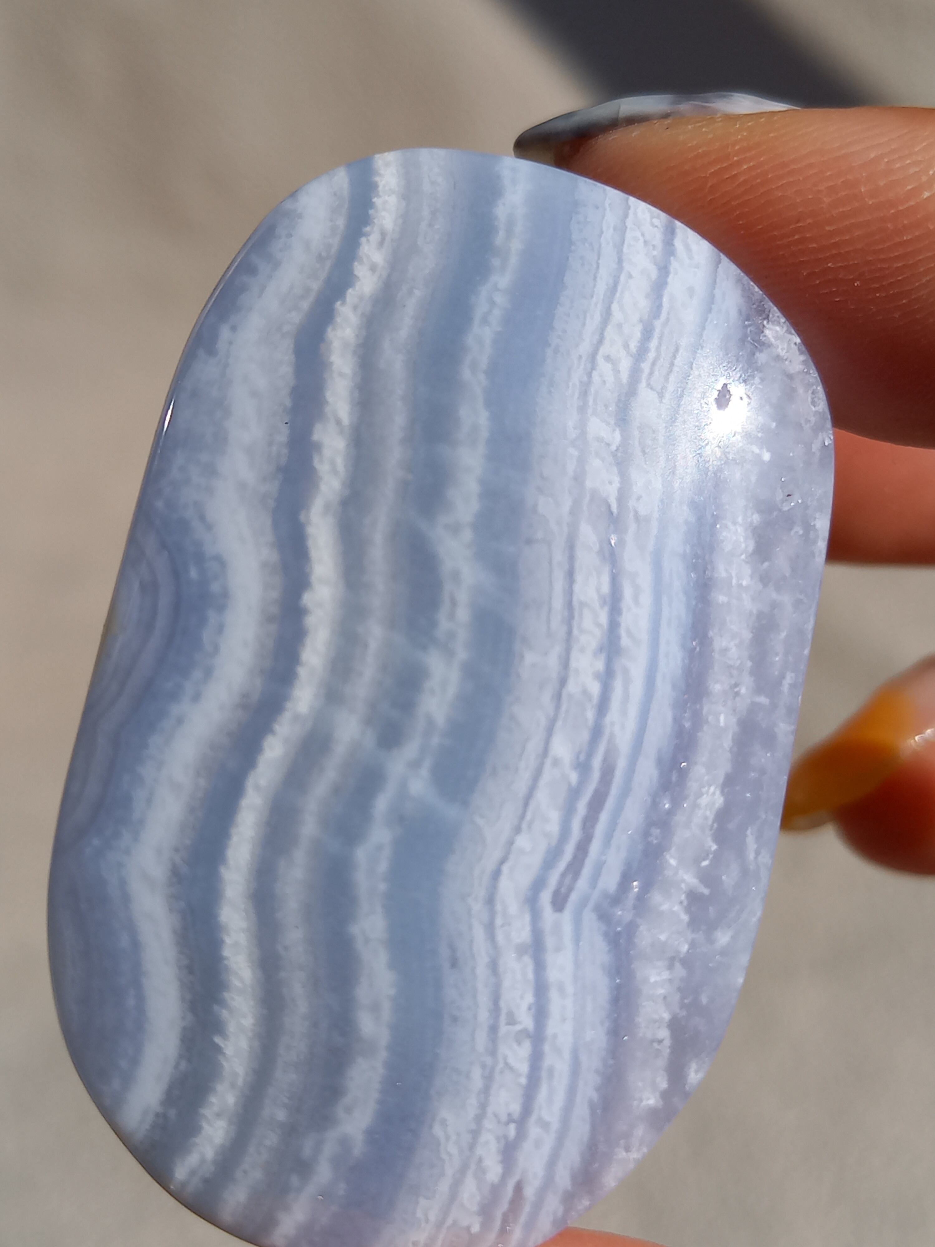 ブルーレースアゲートは、古来より危険を回避するお守りとして、人々の生活に寄り添ってきました。 その控えめで清潔感のある外観は、持ち主に安心感を与え、心を清らかに保つ効果があります。 気持ちが落ち着かない時やイライラしてしまう時に、この石をじっと見つめることで、心が安定し、リラックスした状態に導いてくれるでしょう。