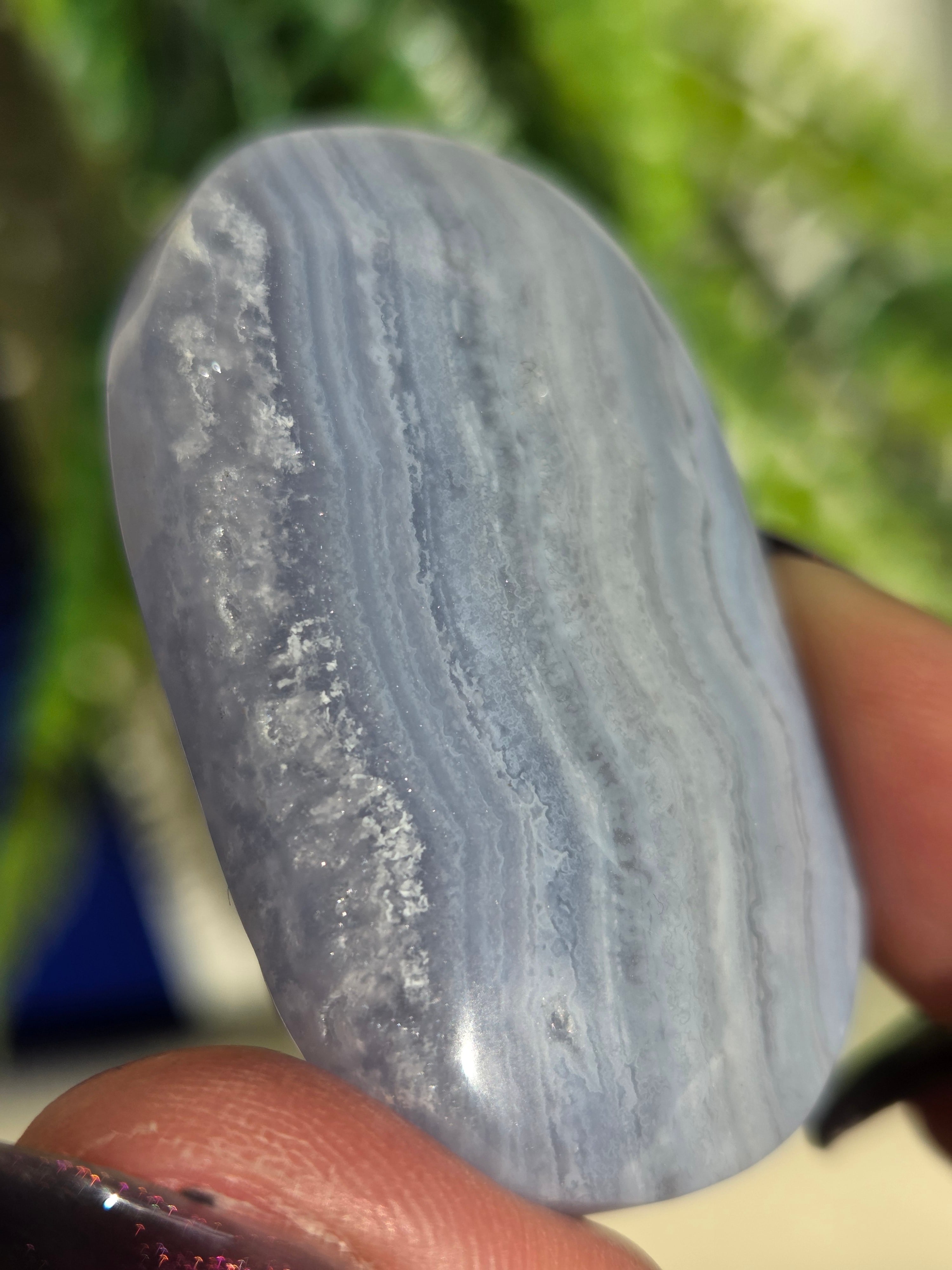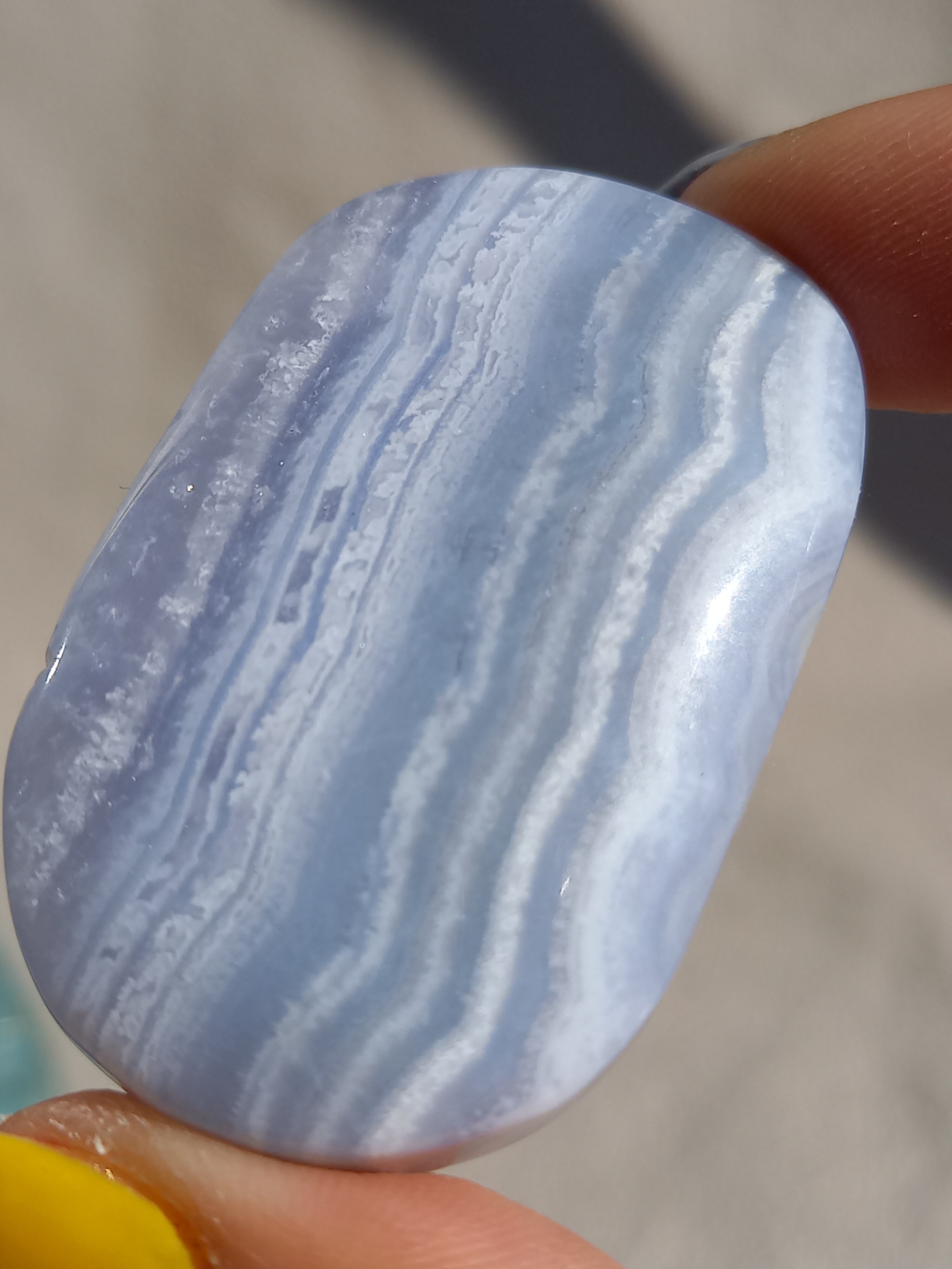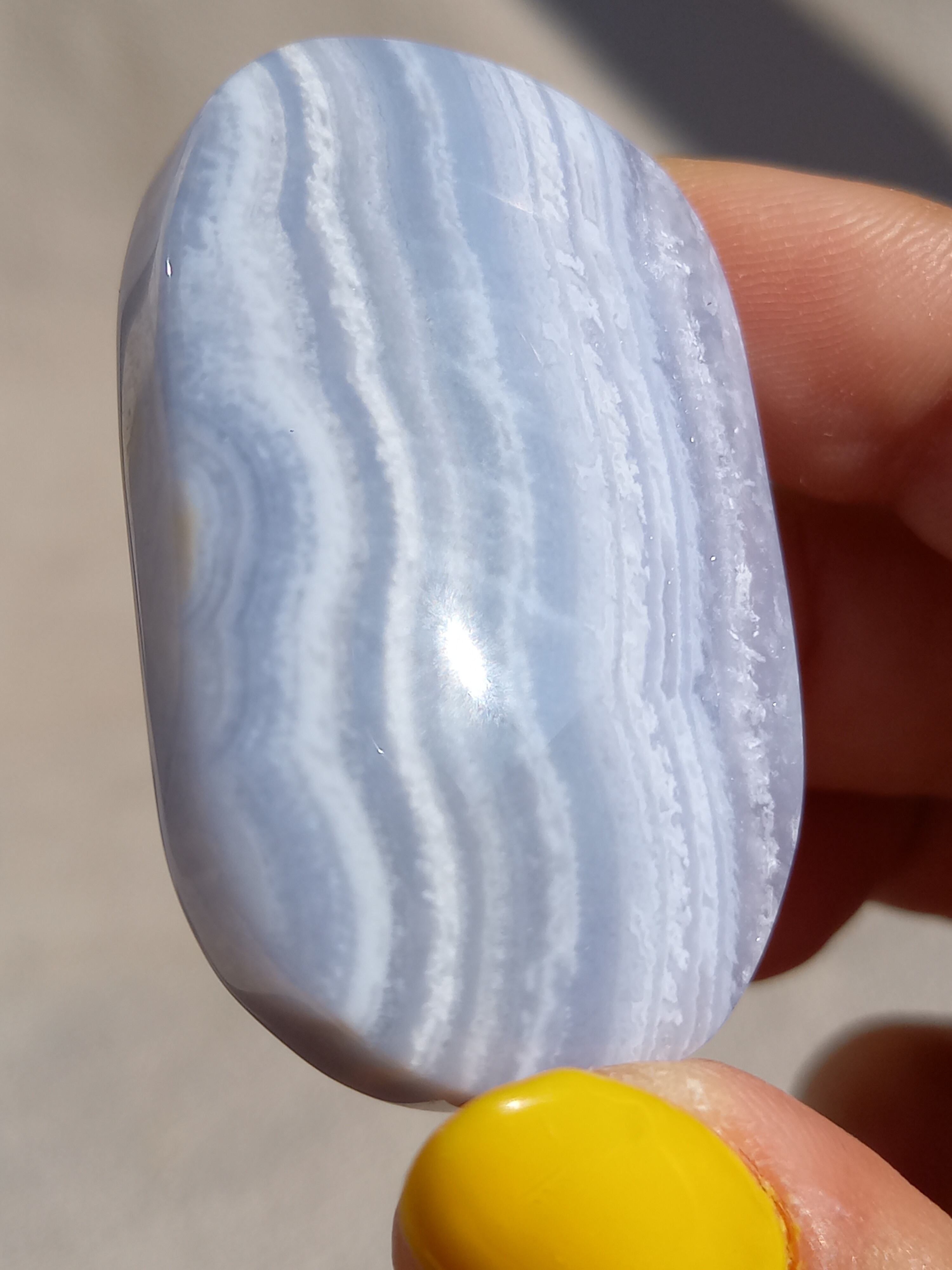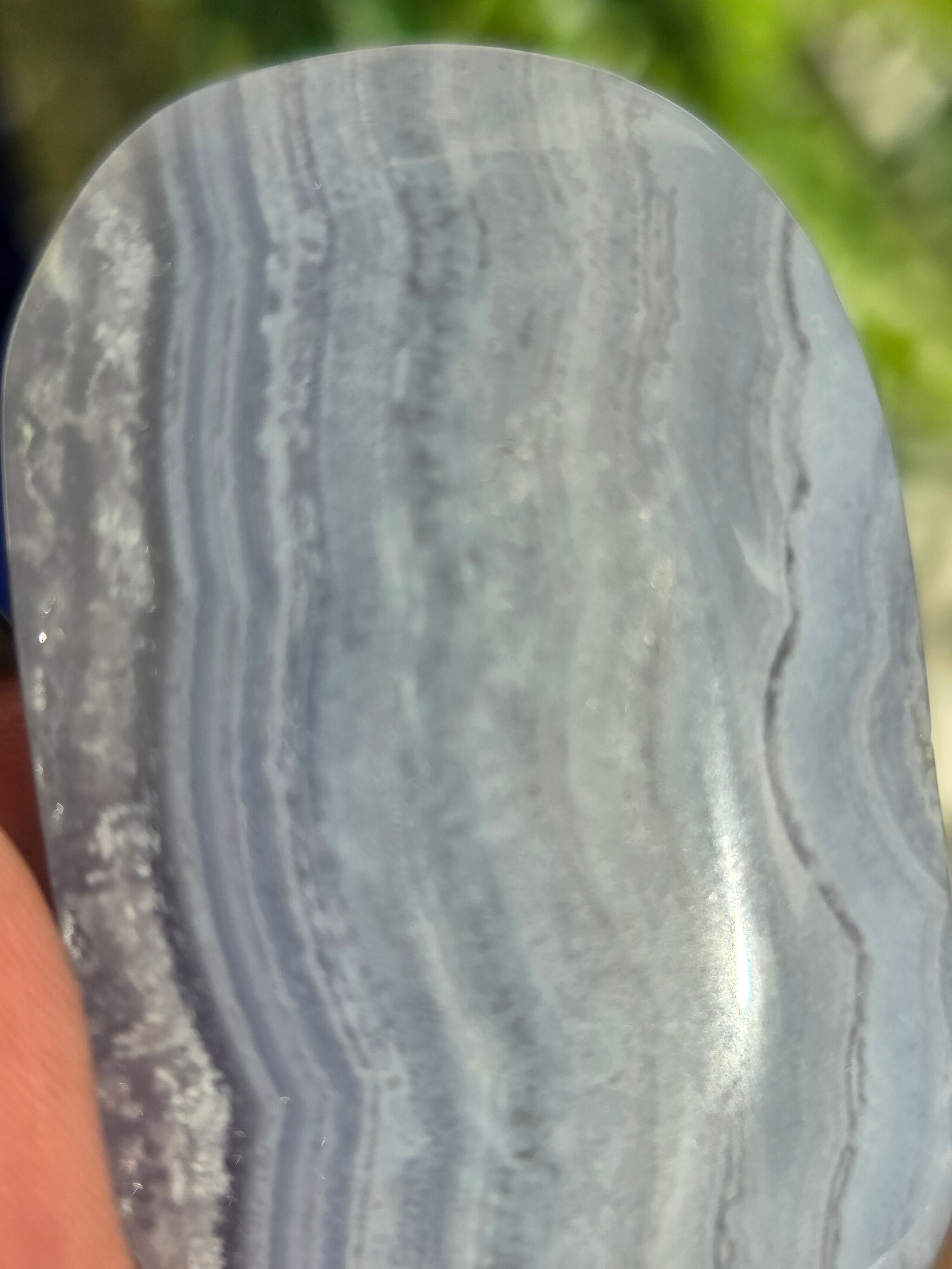 ブルーレースアゲートは、古来より危険を回避するお守りとして、人々の生活に寄り添ってきました。 その控えめで清潔感のある外観は、持ち主に安心感を与え、心を清らかに保つ効果があります。 気持ちが落ち着かない時やイライラしてしまう時に、この石をじっと見つめることで、心が安定し、リラックスした状態に導いてくれるでしょう。