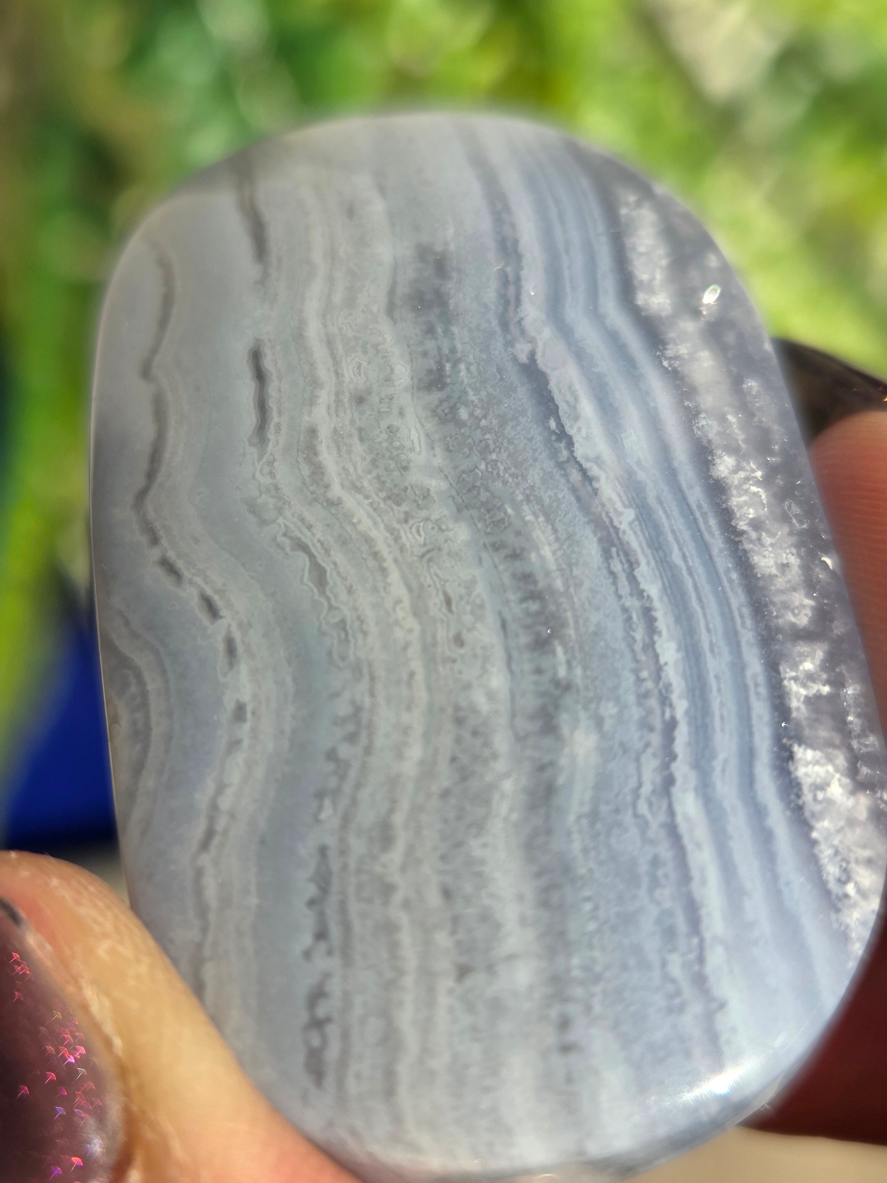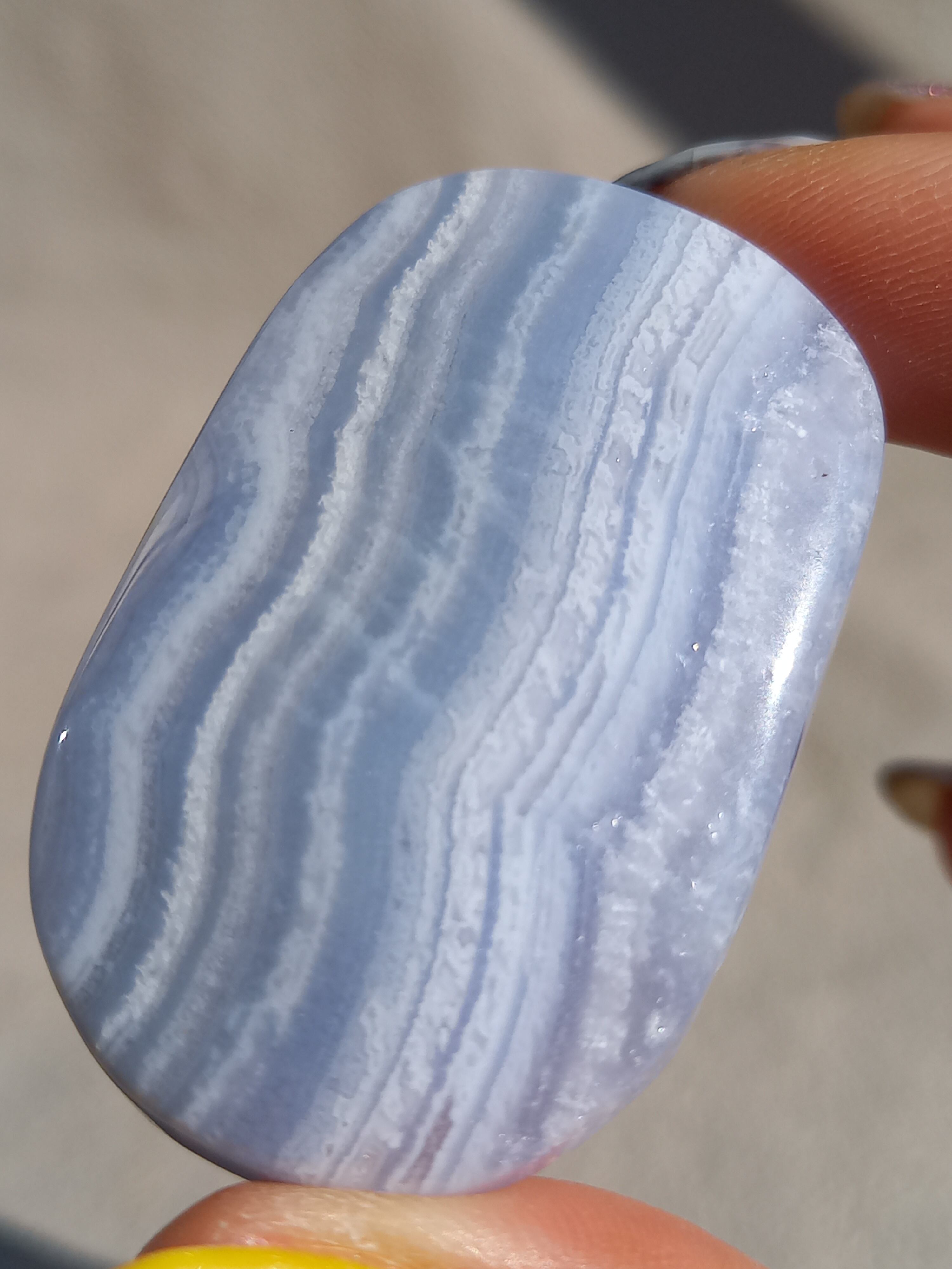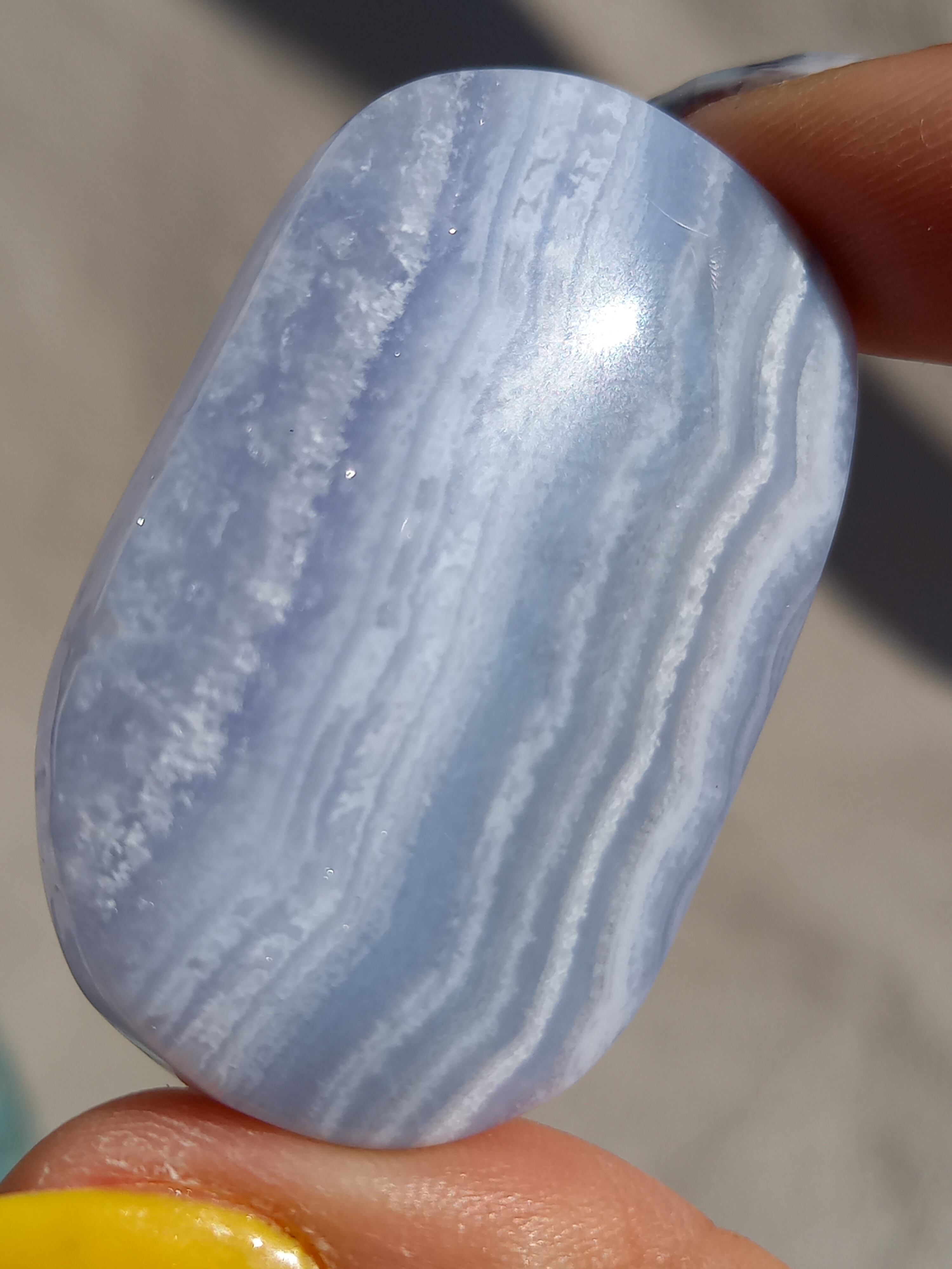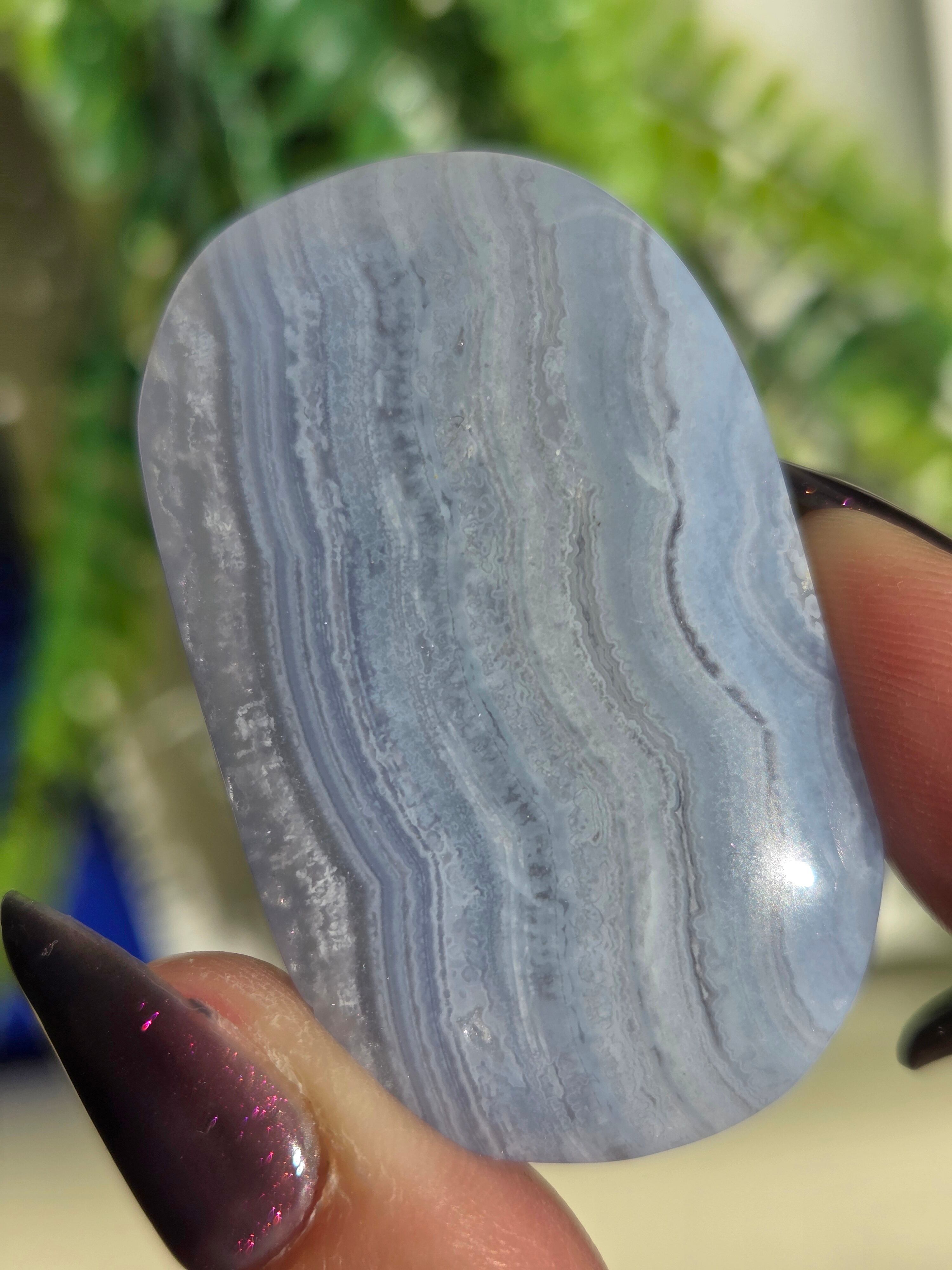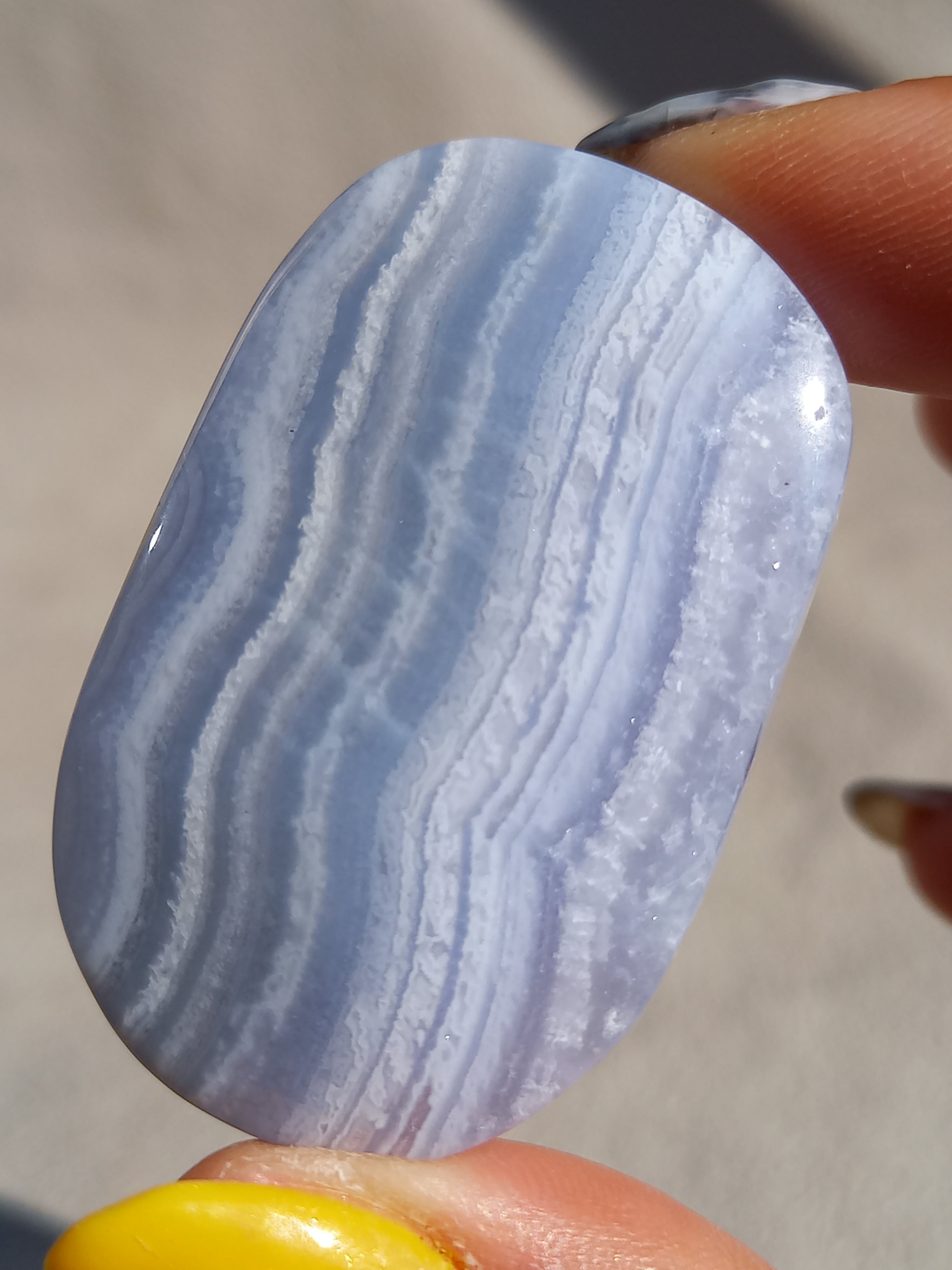 ブルーレースアゲートは、古来より危険を回避するお守りとして、人々の生活に寄り添ってきました。 その控えめで清潔感のある外観は、持ち主に安心感を与え、心を清らかに保つ効果があります。 気持ちが落ち着かない時やイライラしてしまう時に、この石をじっと見つめることで、心が安定し、リラックスした状態に導いてくれるでしょう。