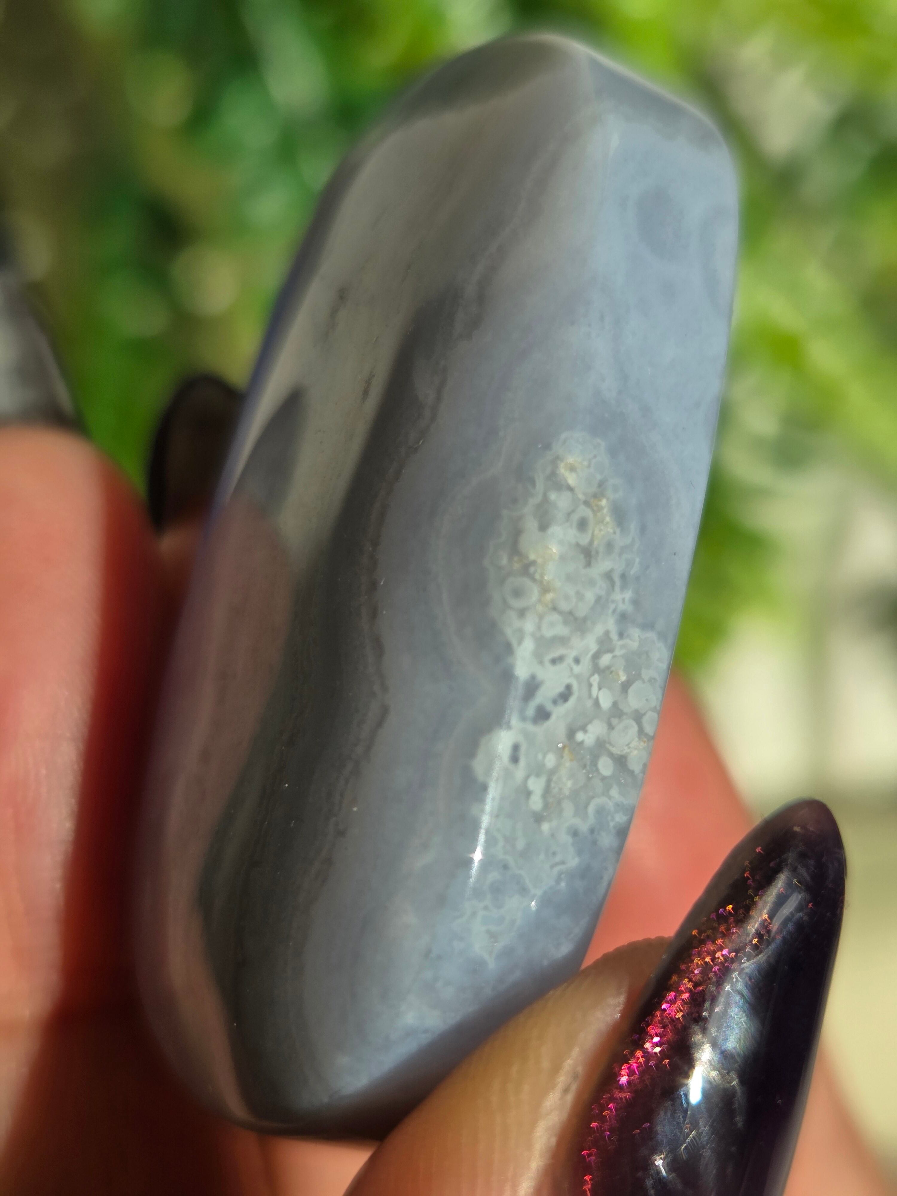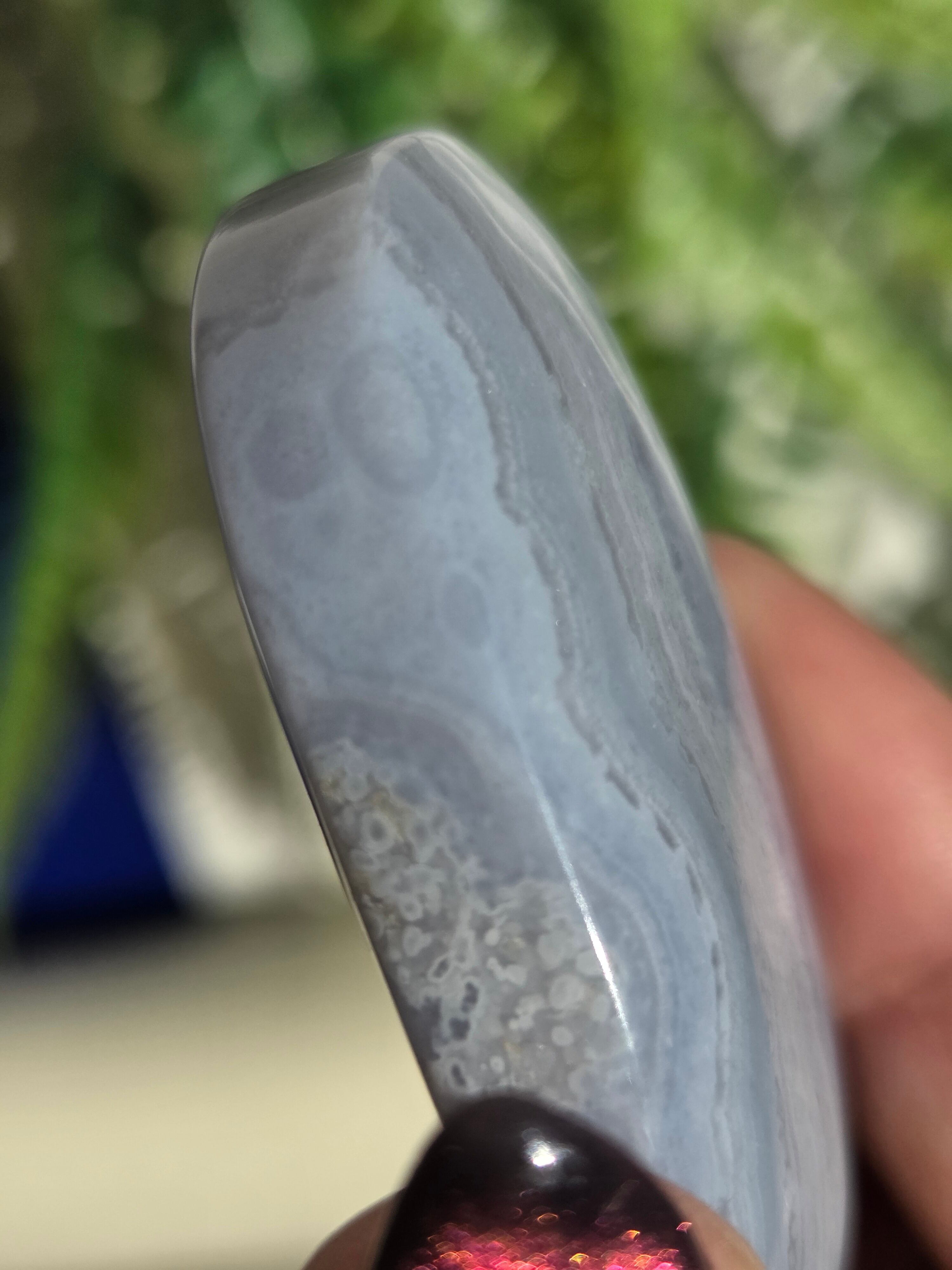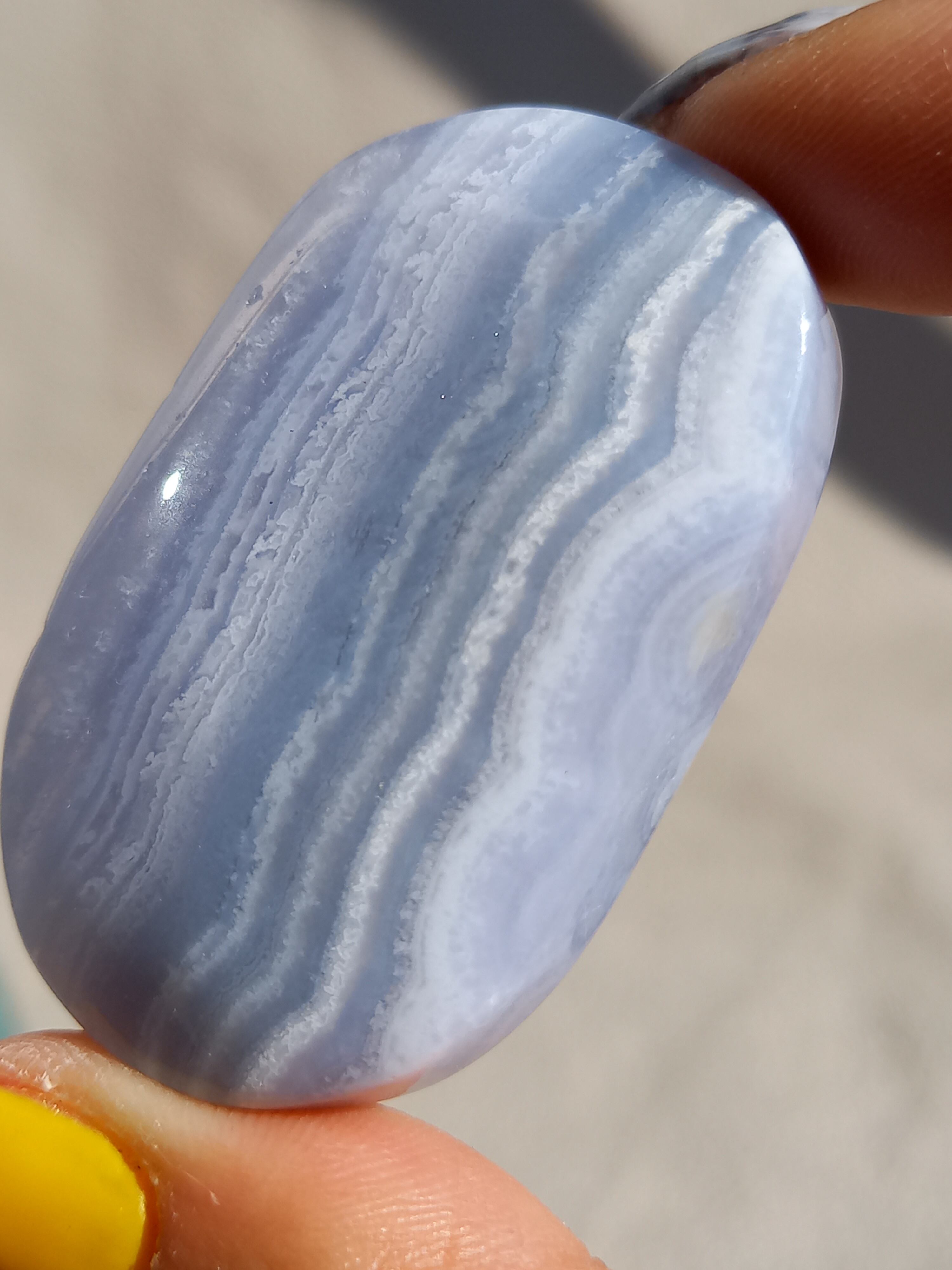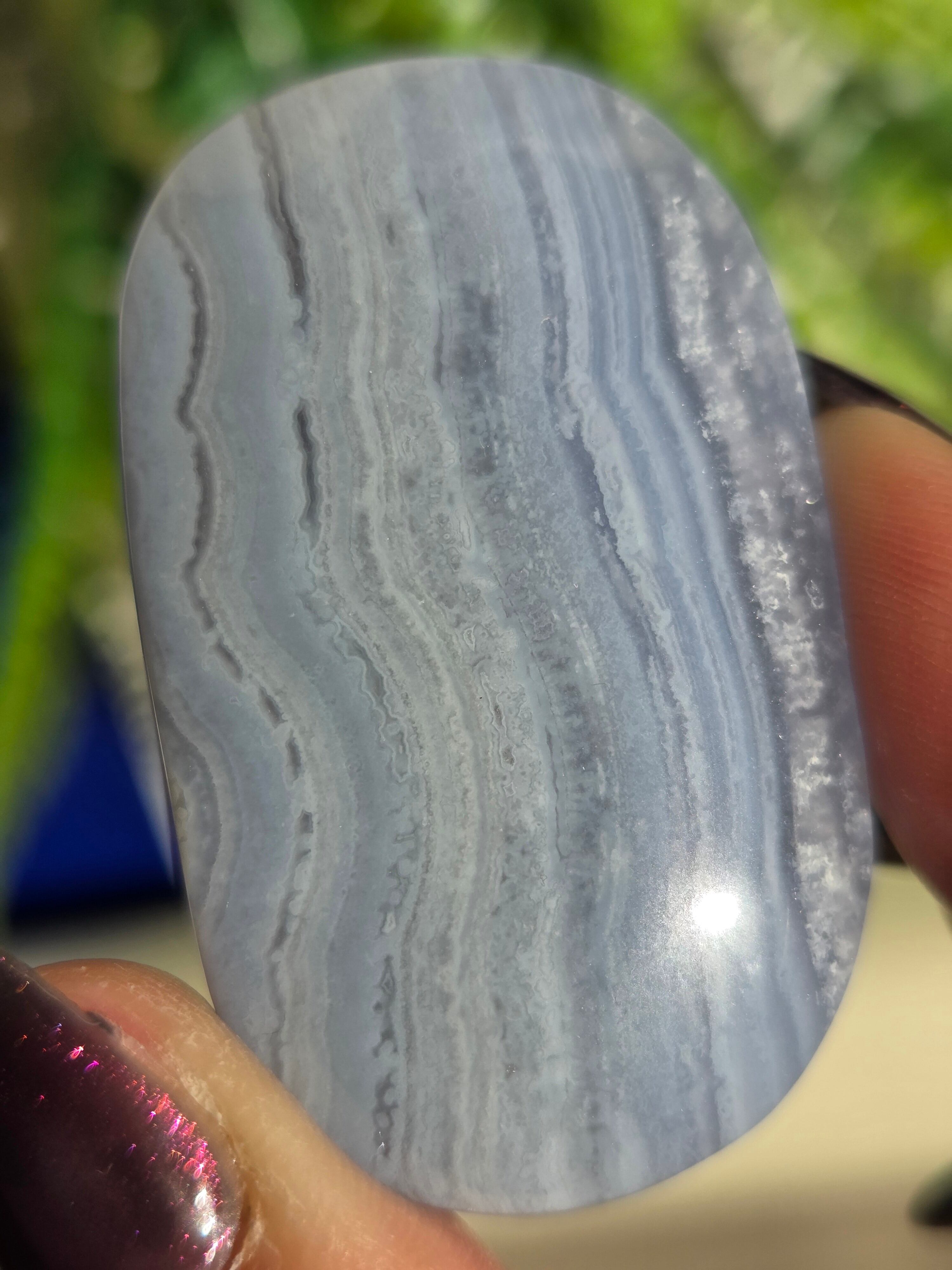 ブルーレースアゲートは、古来より危険を回避するお守りとして、人々の生活に寄り添ってきました。 その控えめで清潔感のある外観は、持ち主に安心感を与え、心を清らかに保つ効果があります。 気持ちが落ち着かない時やイライラしてしまう時に、この石をじっと見つめることで、心が安定し、リラックスした状態に導いてくれるでしょう。