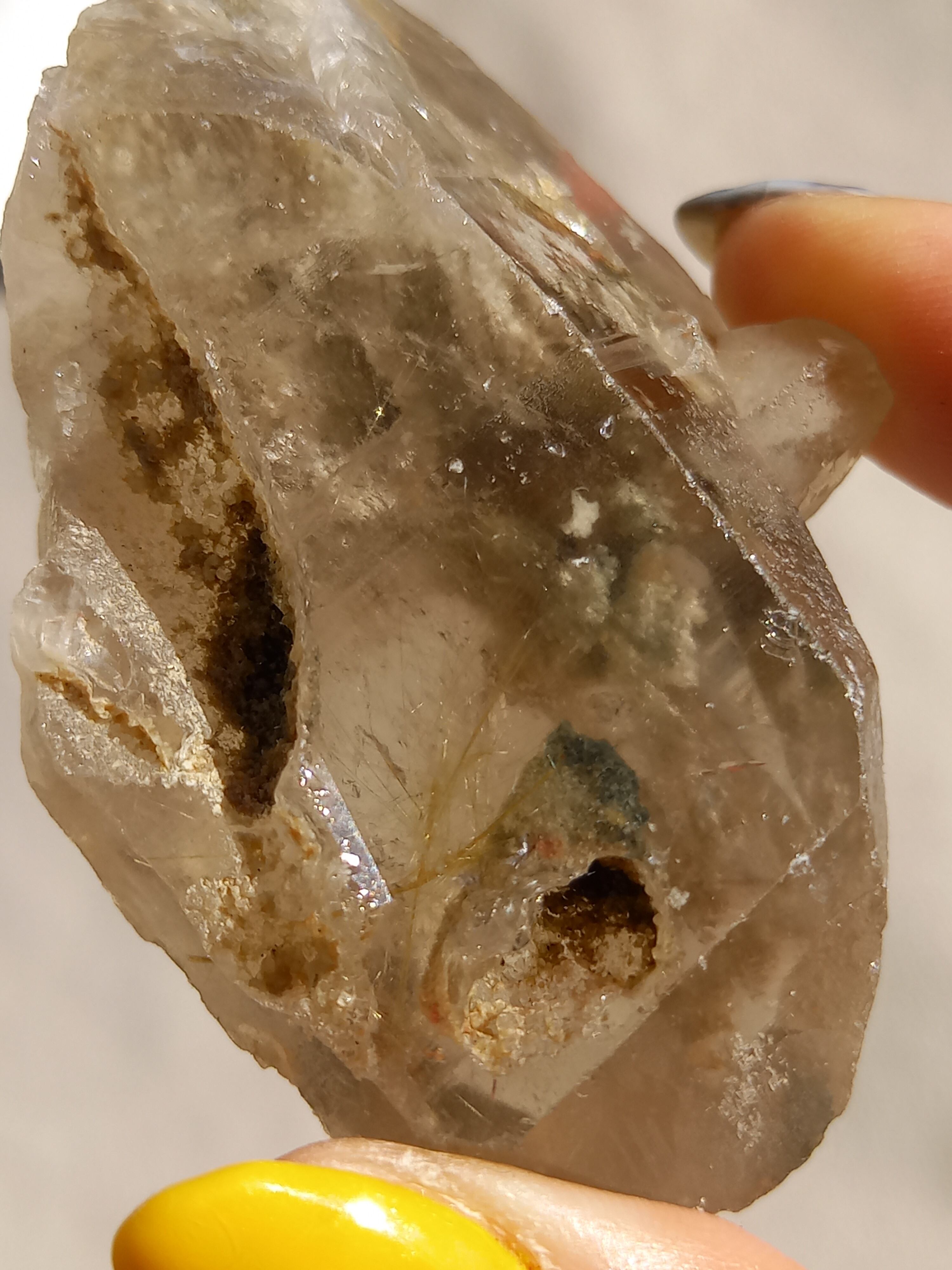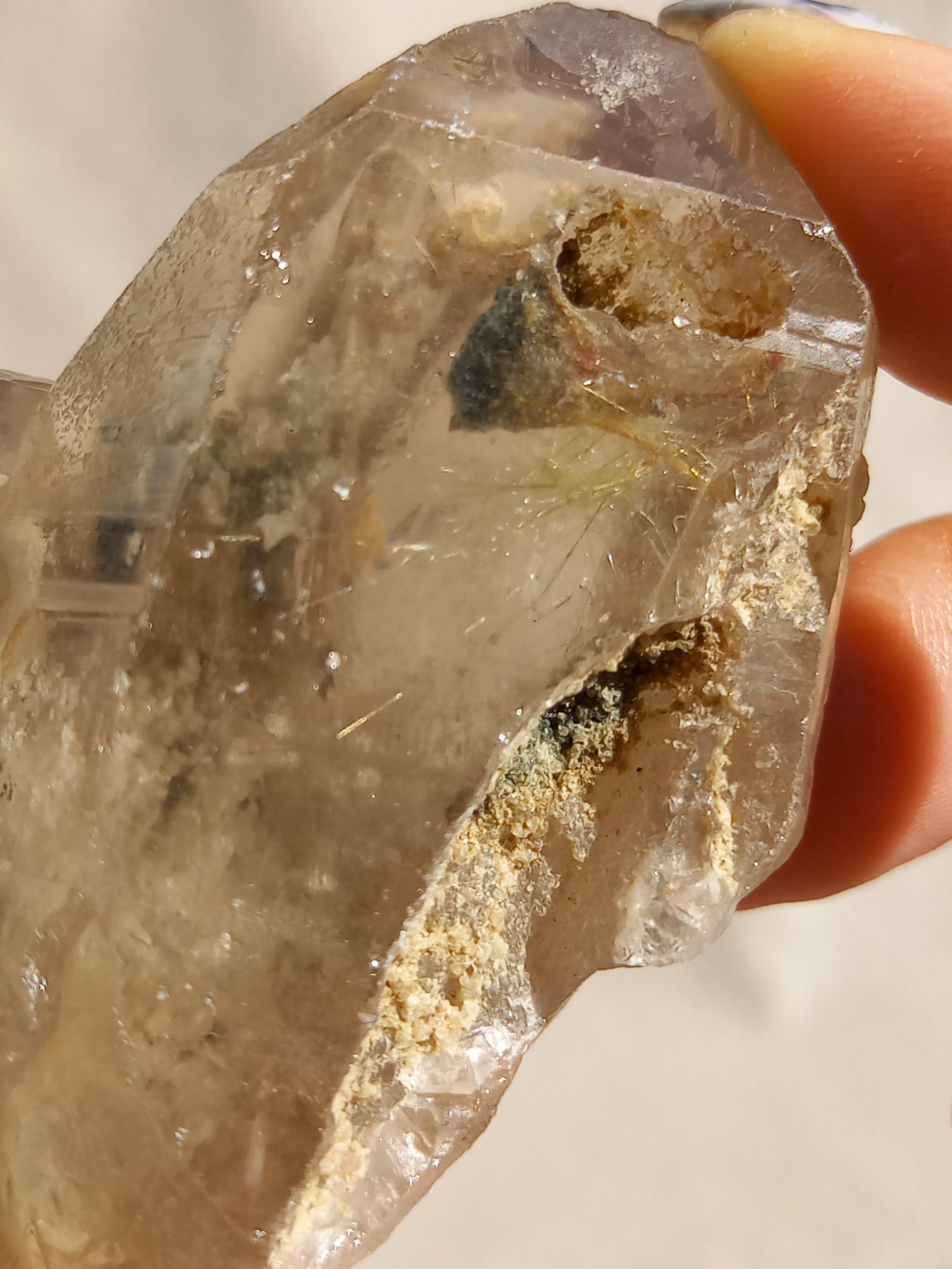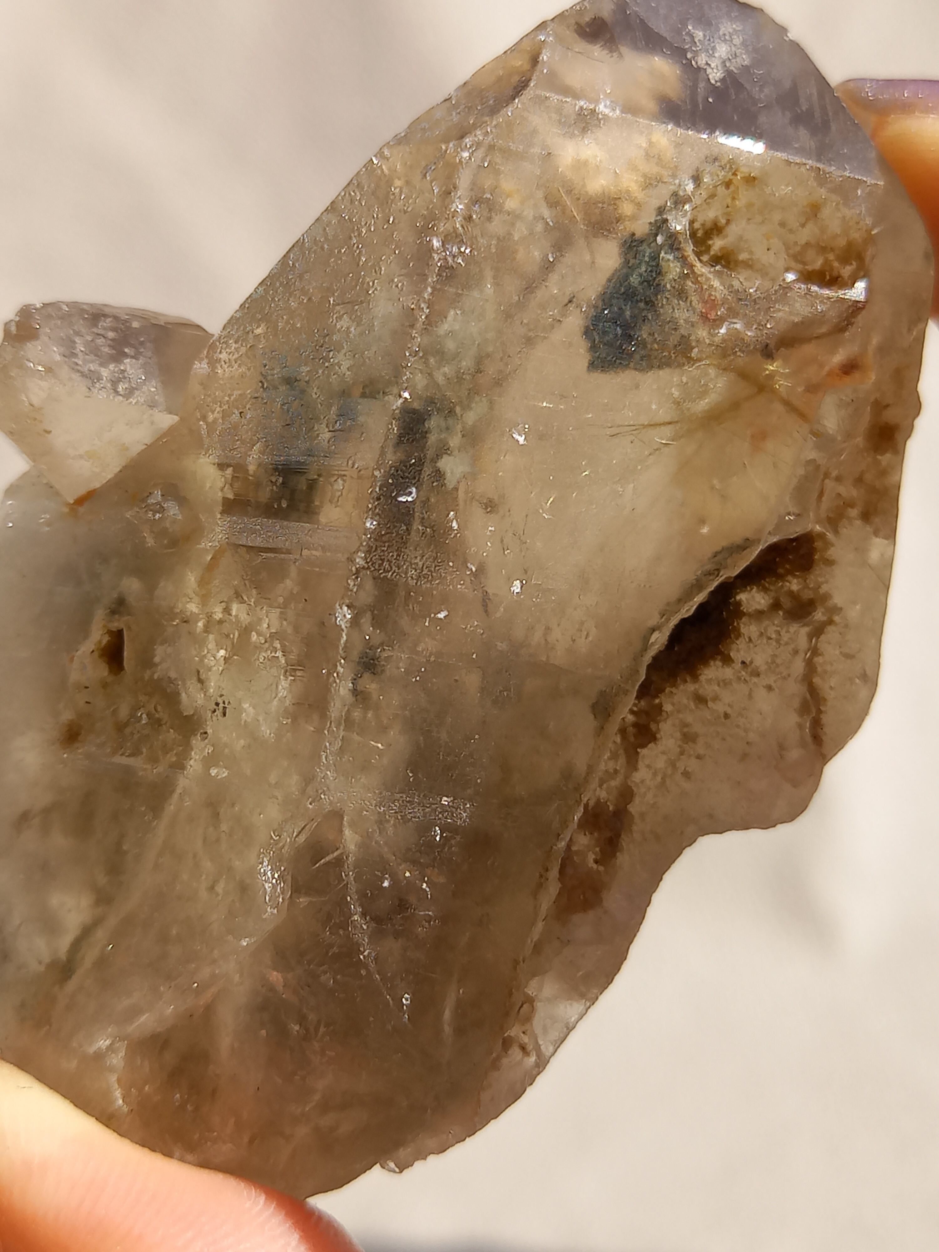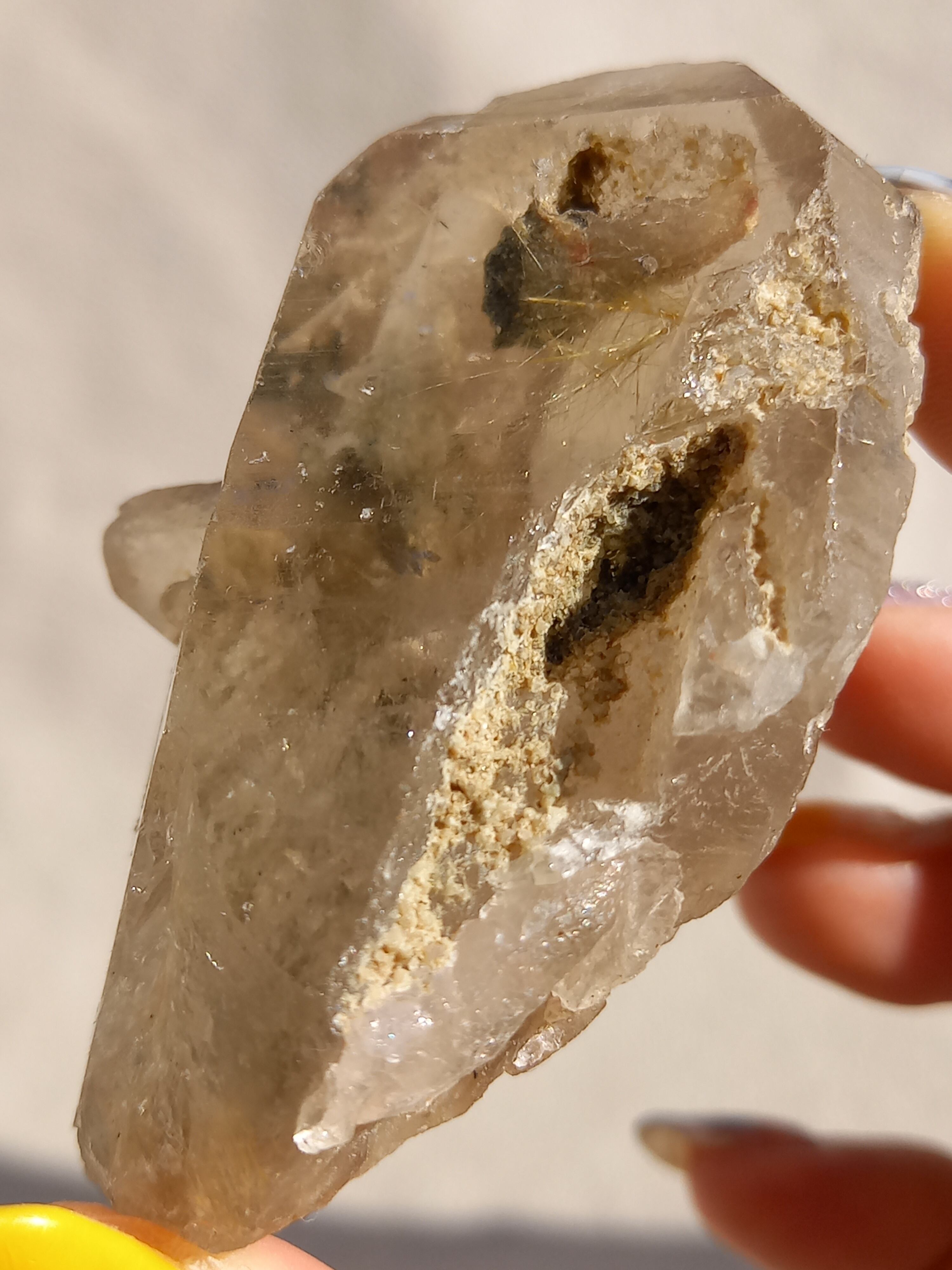 力強い大きな水晶ポイントに、ルチルが入りこみ、ライトスモーキーになっています。