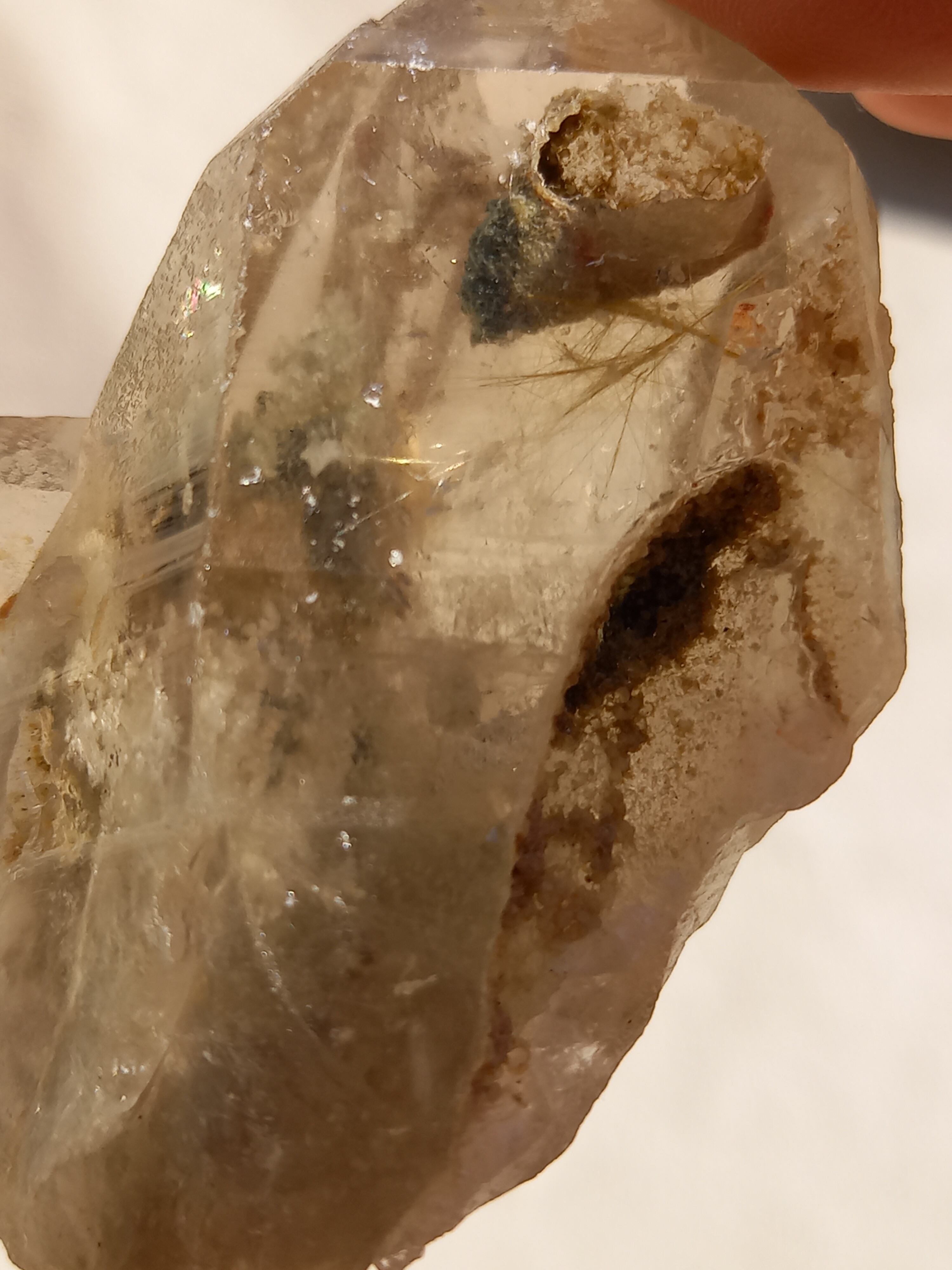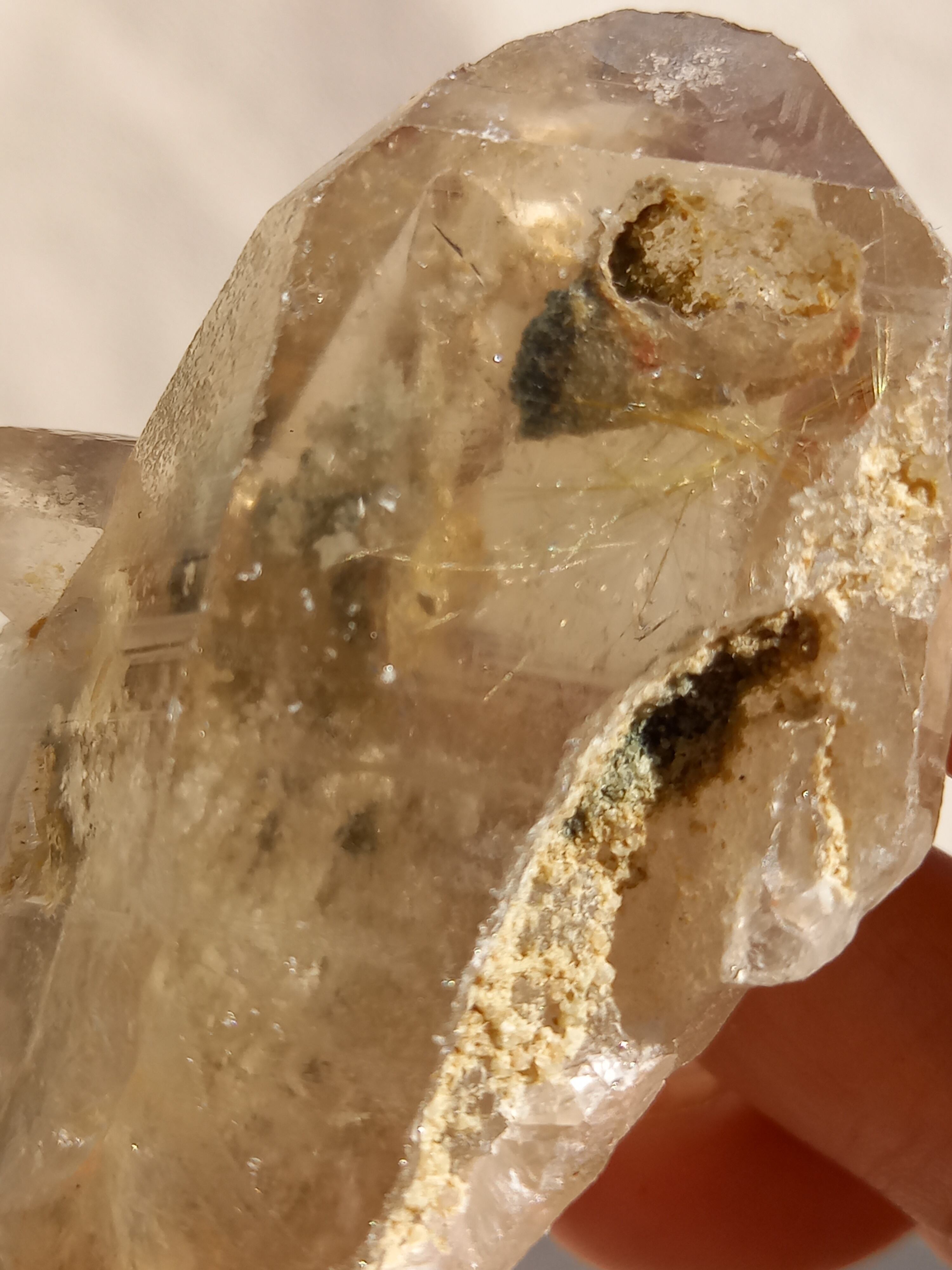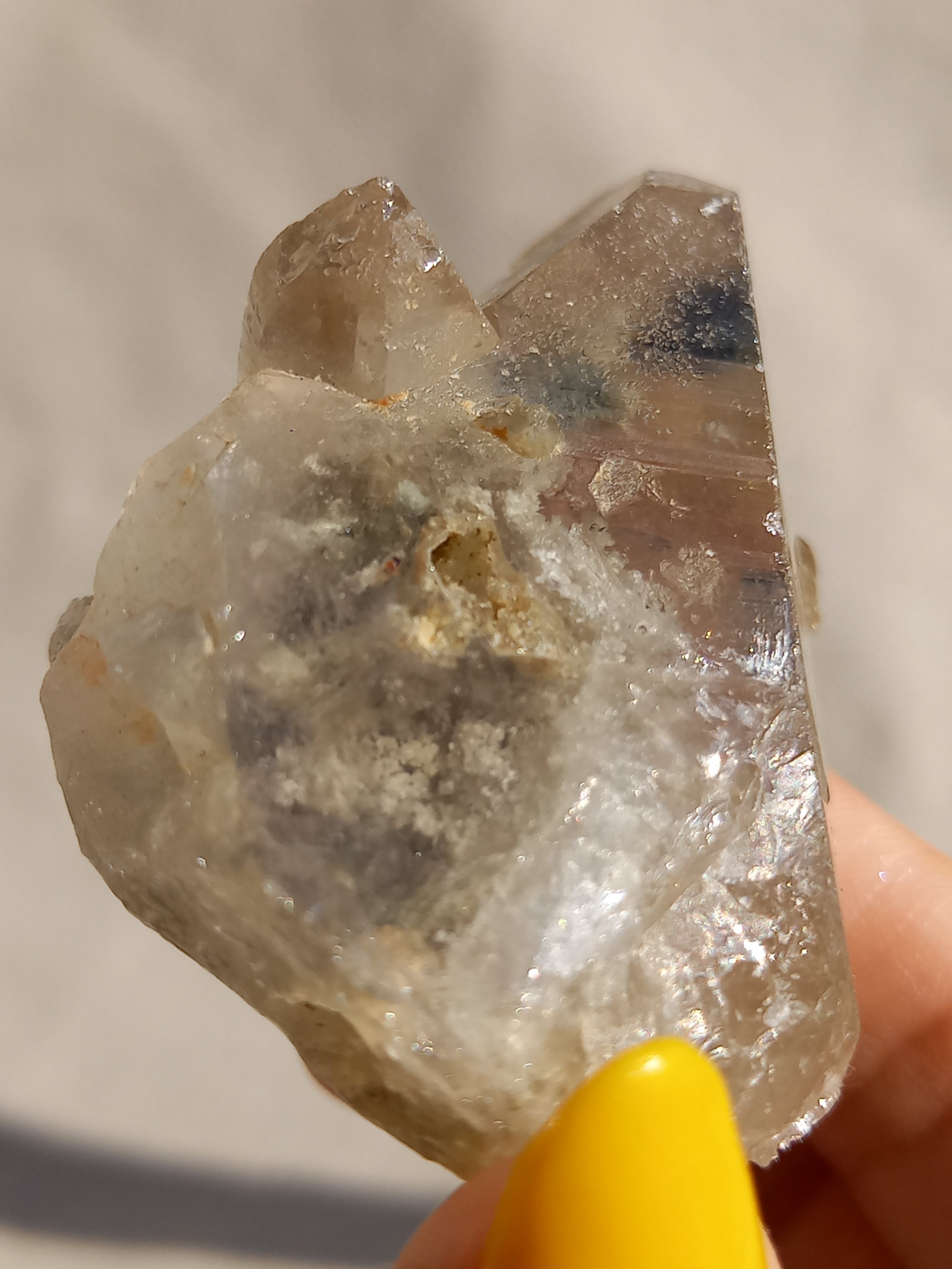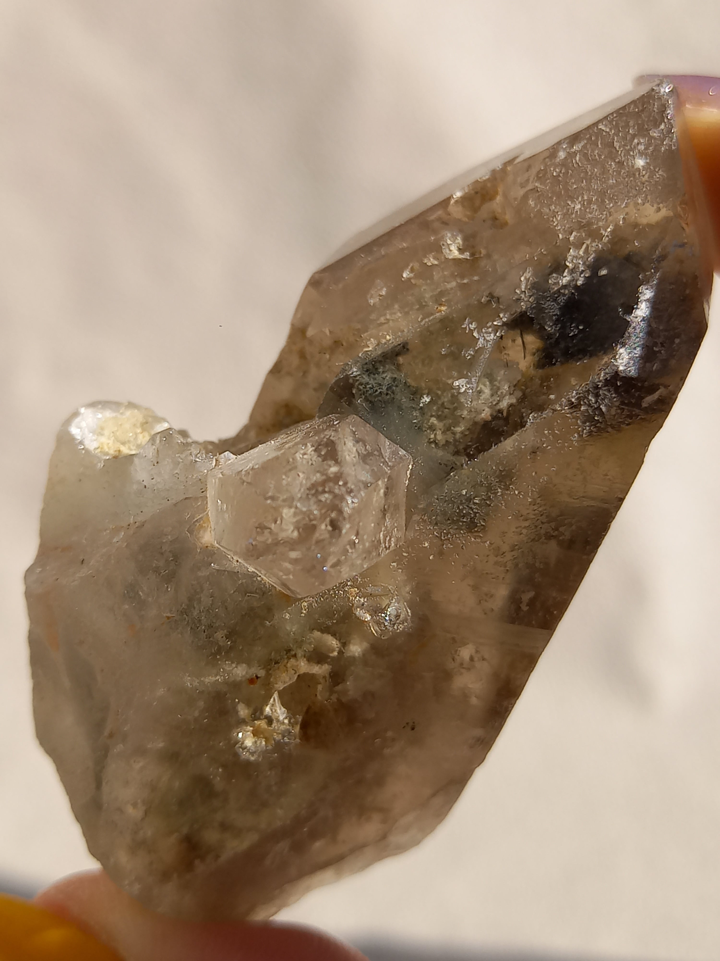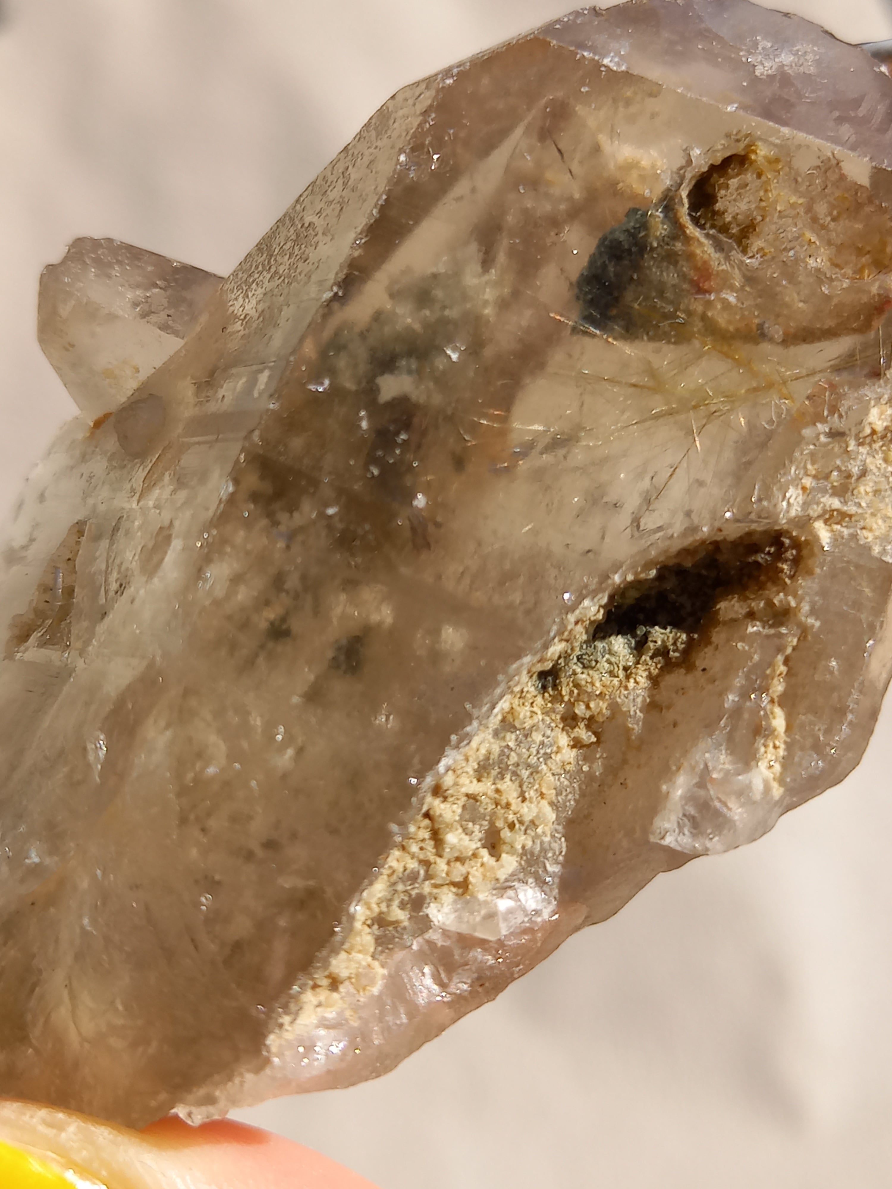 力強い大きな水晶ポイントに、ルチルが入りこみ、ライトスモーキーになっています。