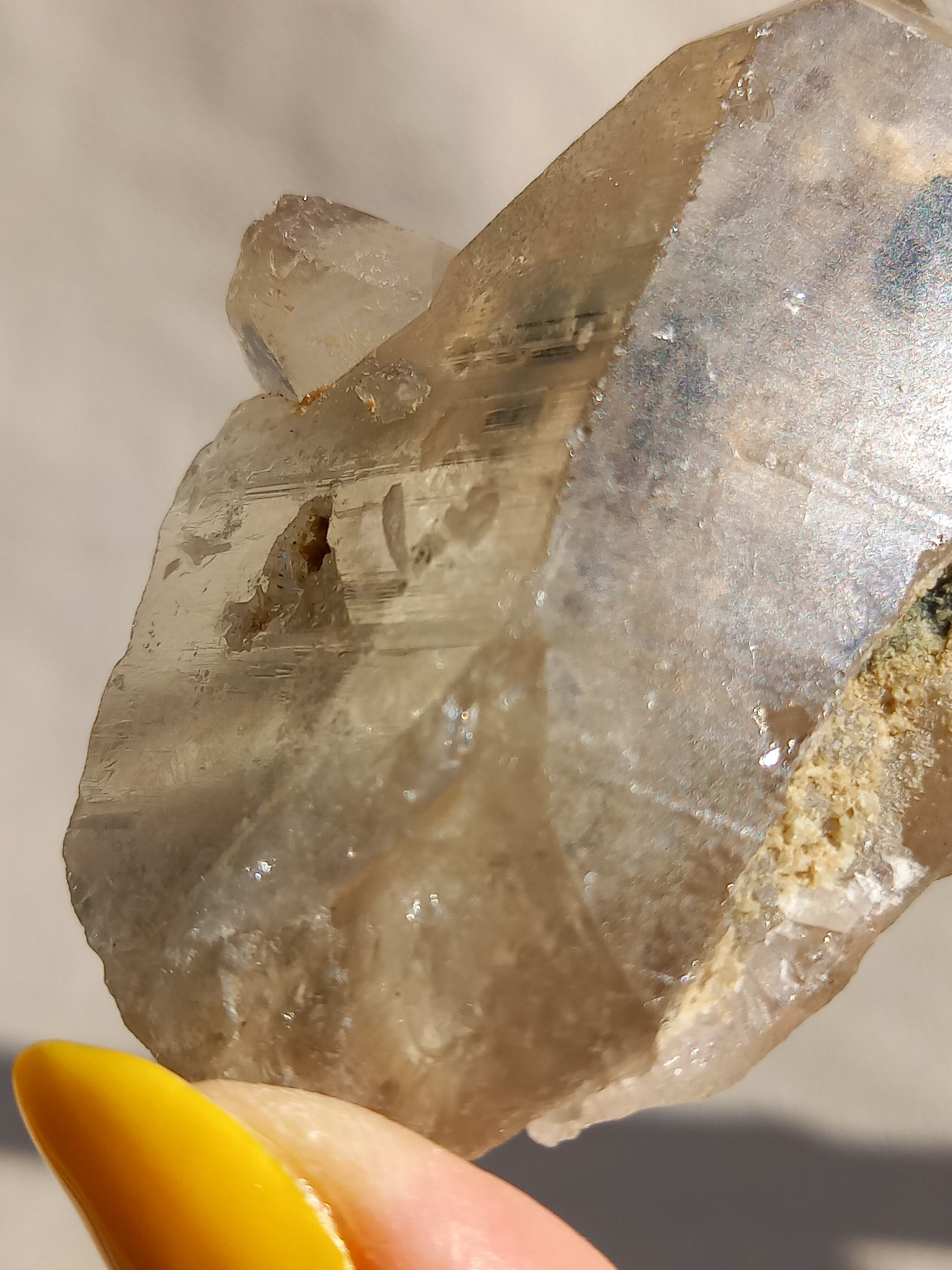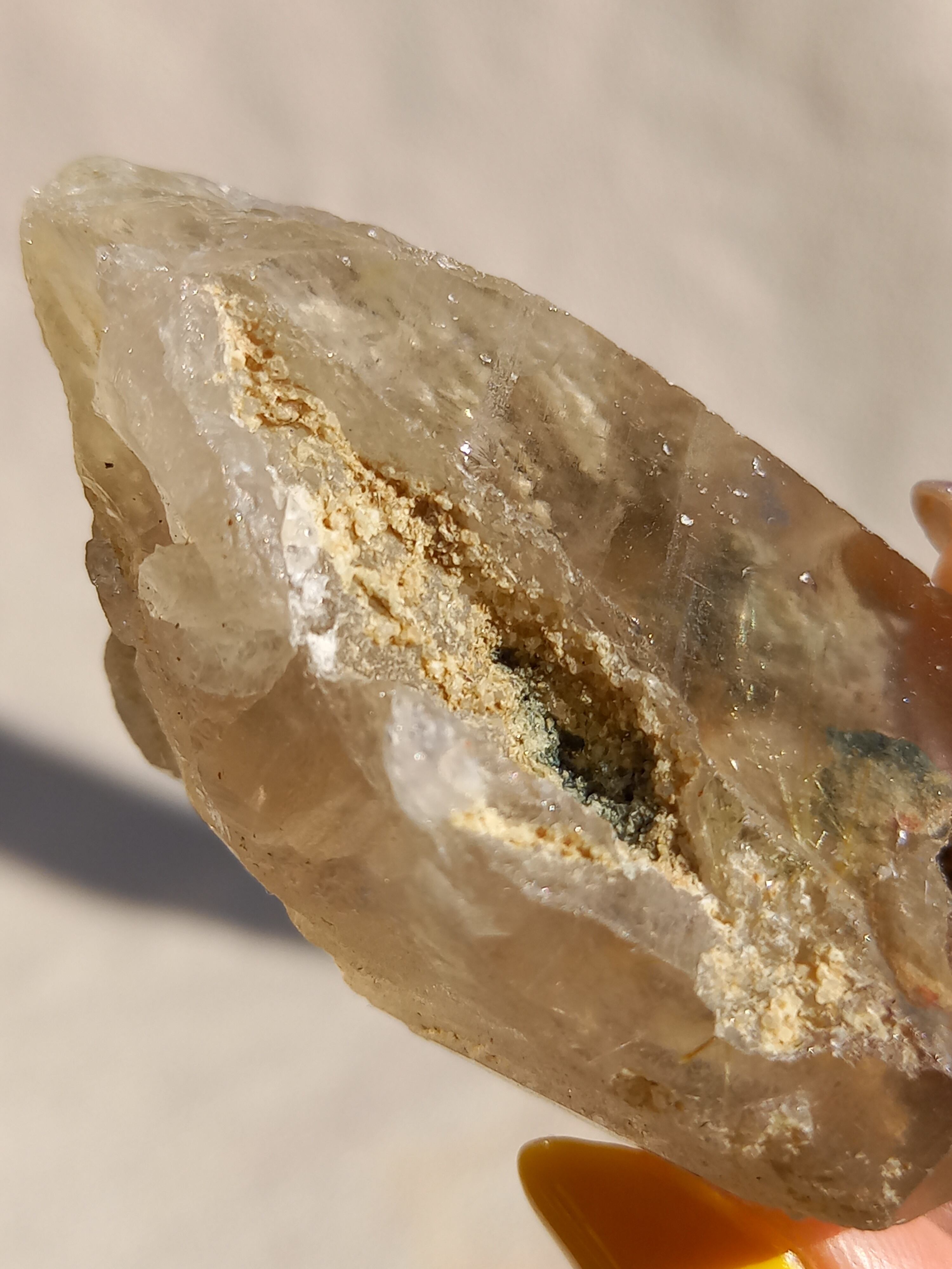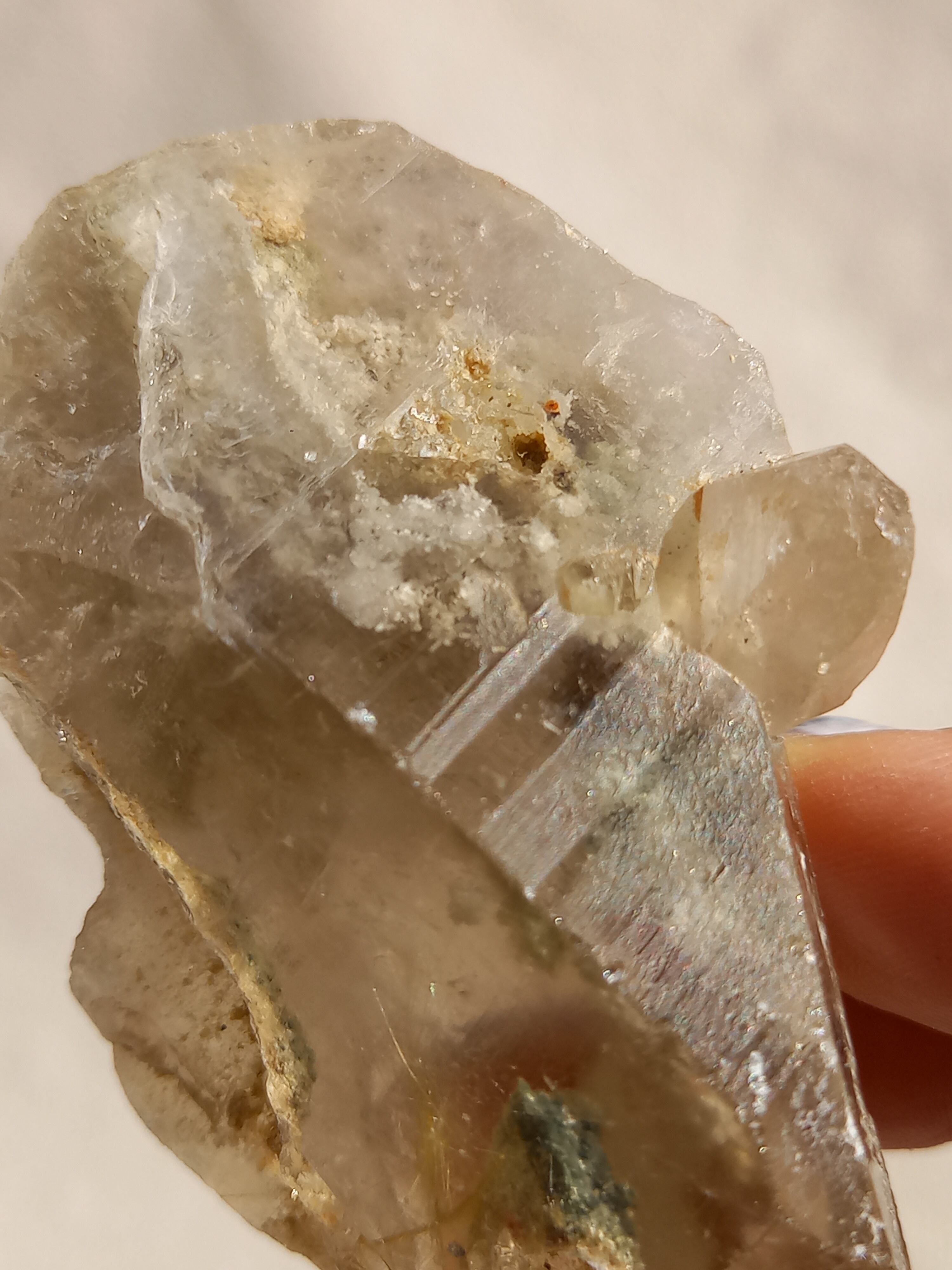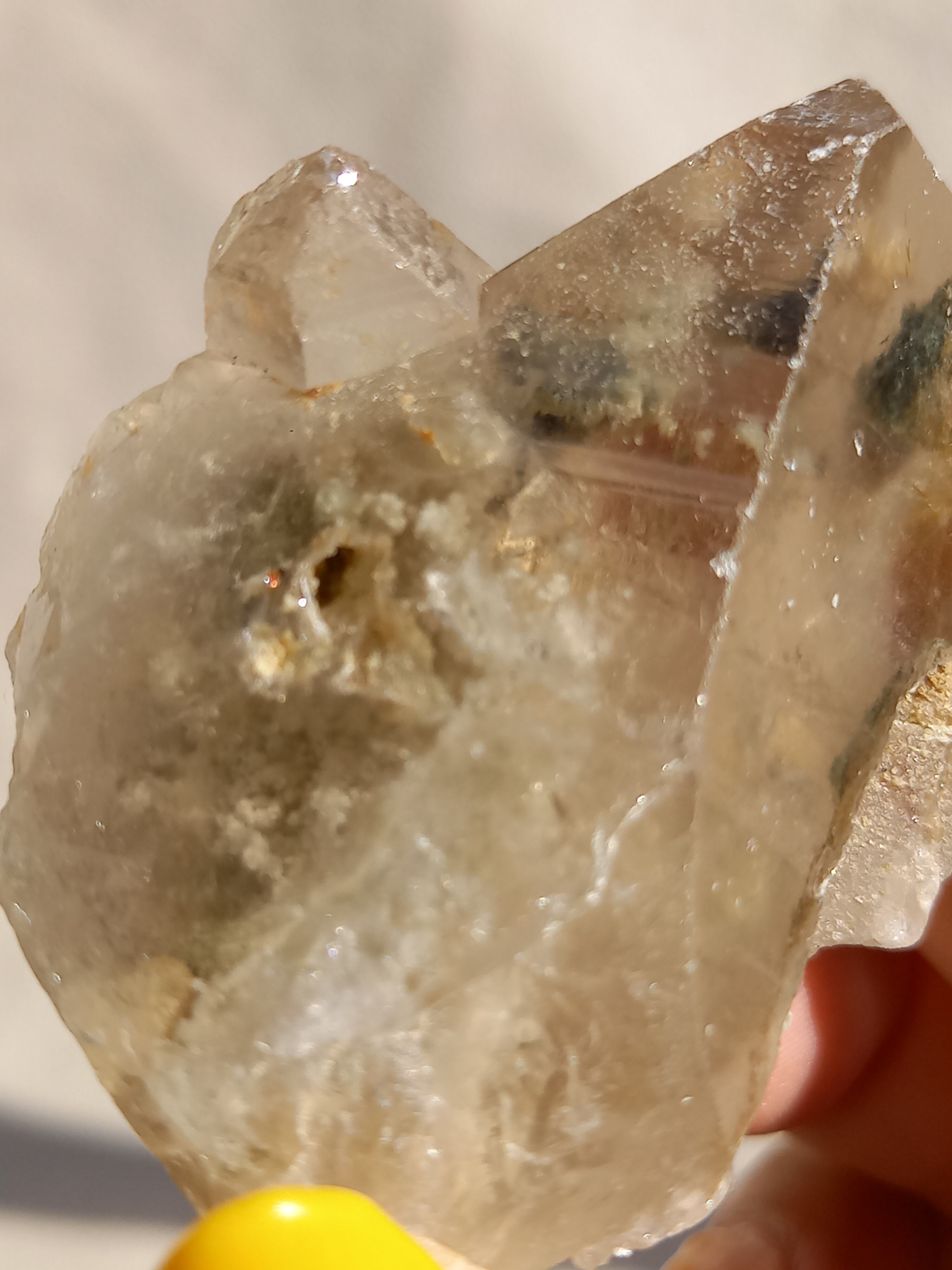 力強い大きな水晶ポイントに、ルチルが入りこみ、ライトスモーキーになっています。