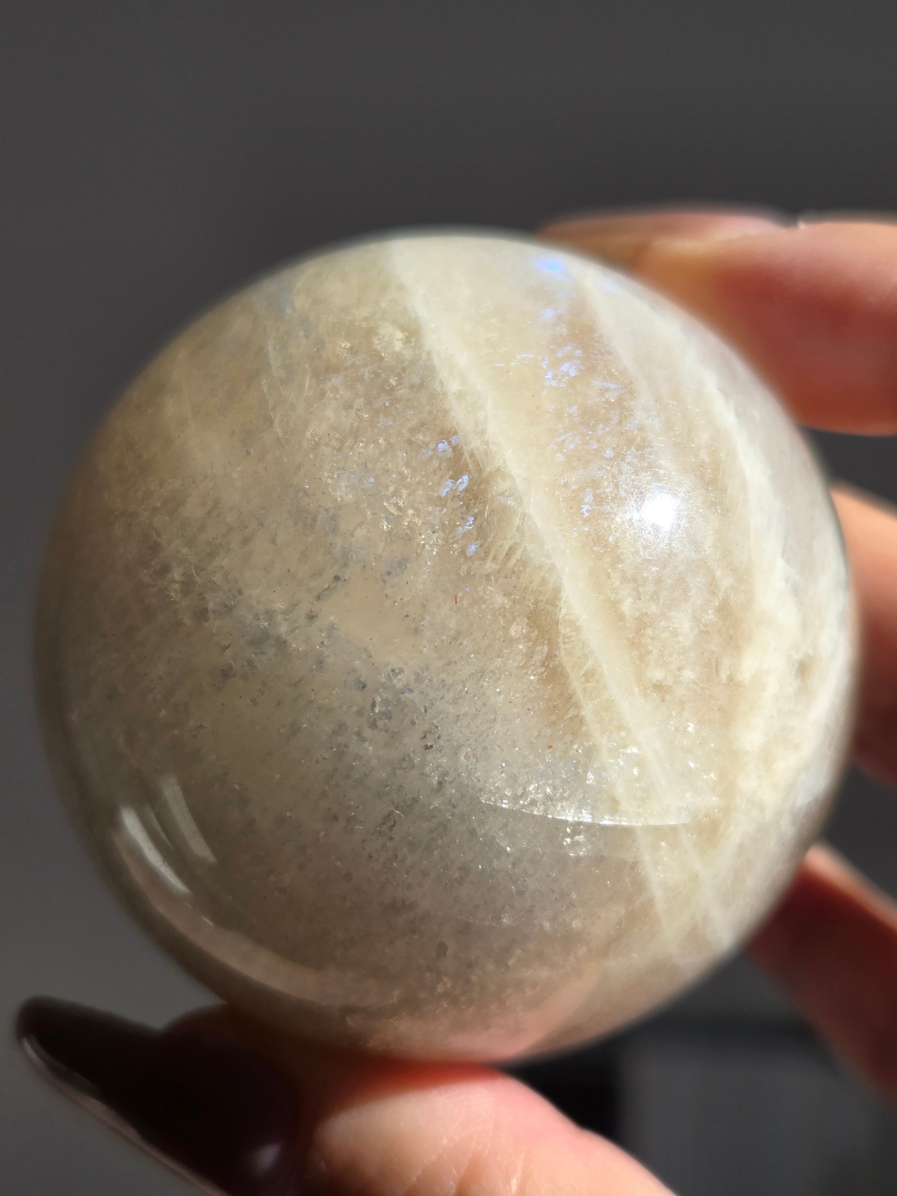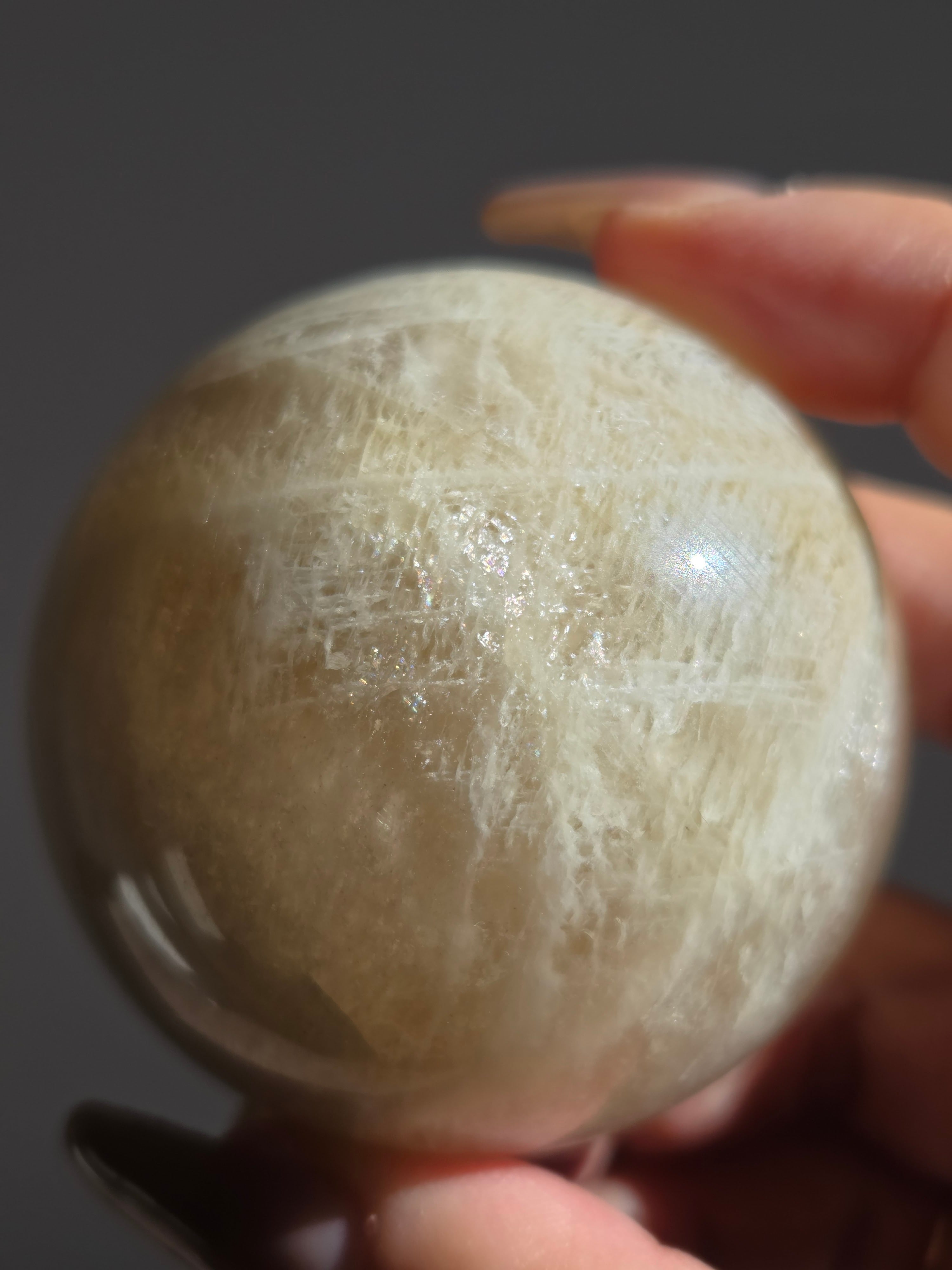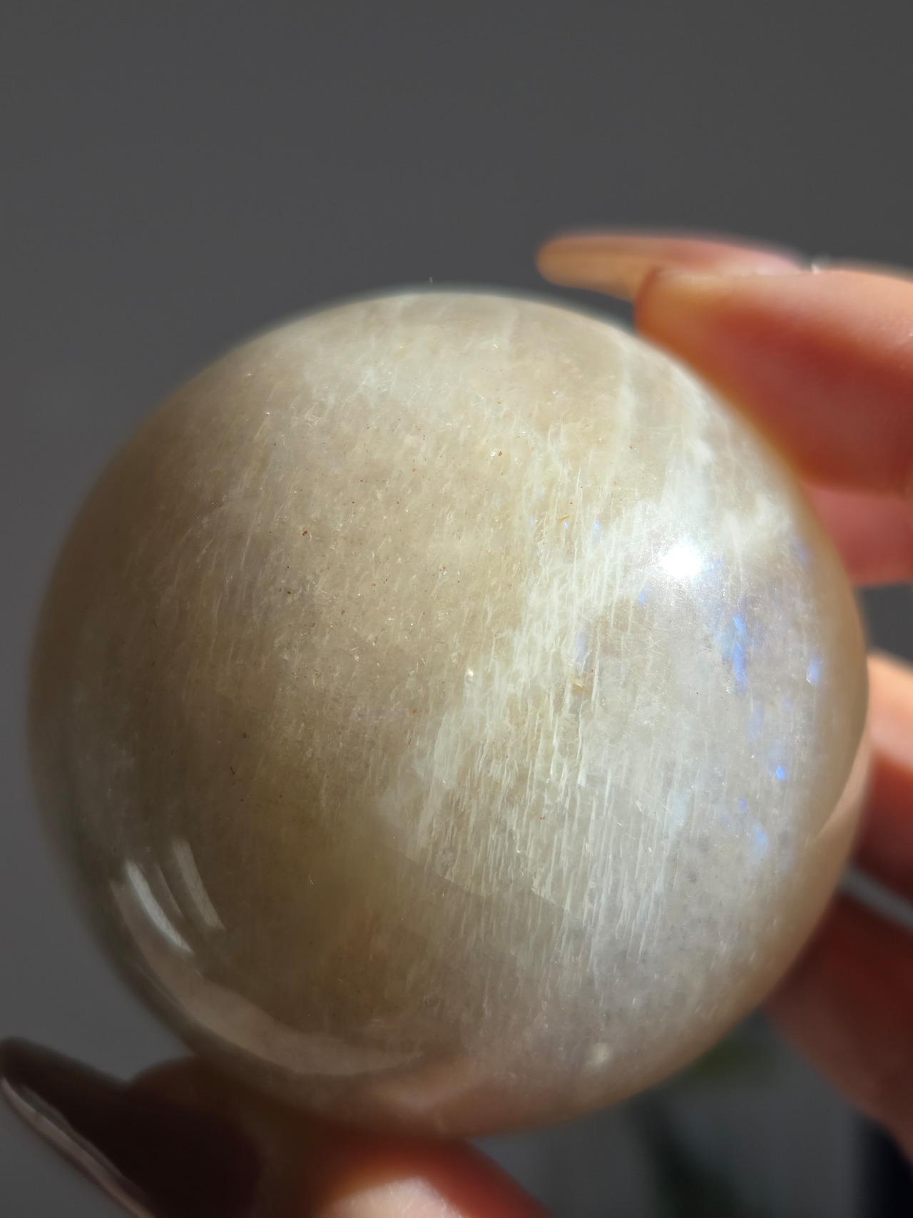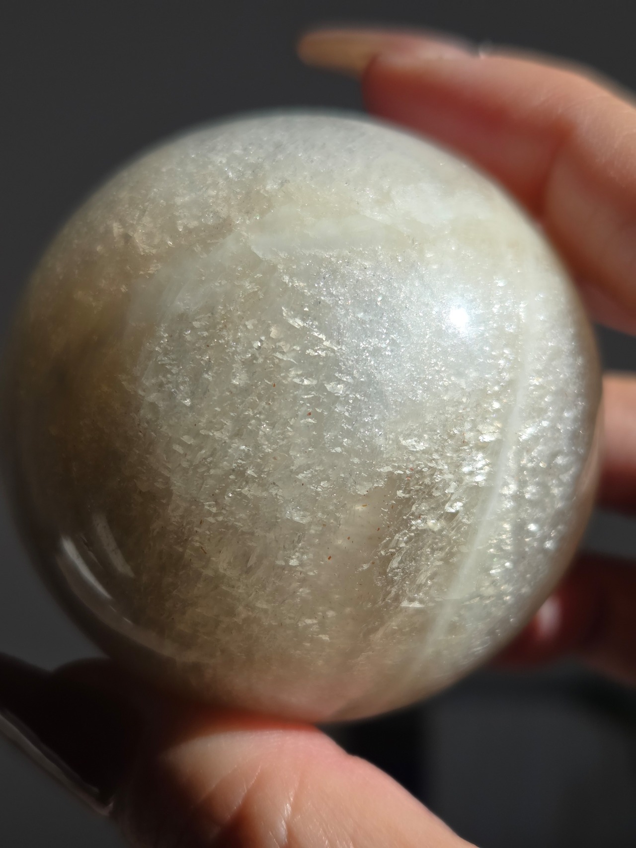 ブルーシラーや、シルバーシラー、シルバーフラッシュ等見られ、1つのスフィアで、ムーンストーンの素敵さとサンストーンの素敵さ全部味わえる贅沢な子です。