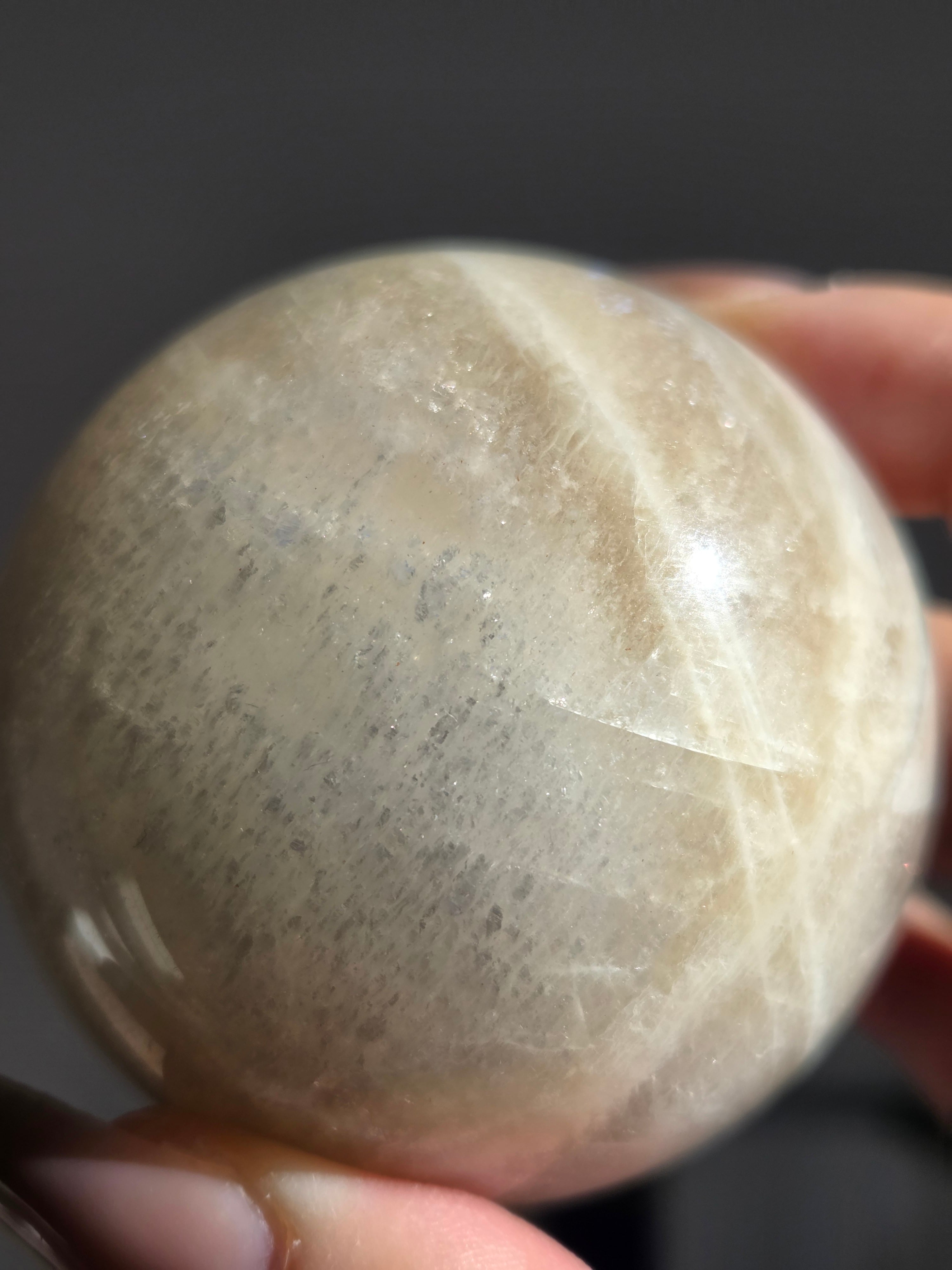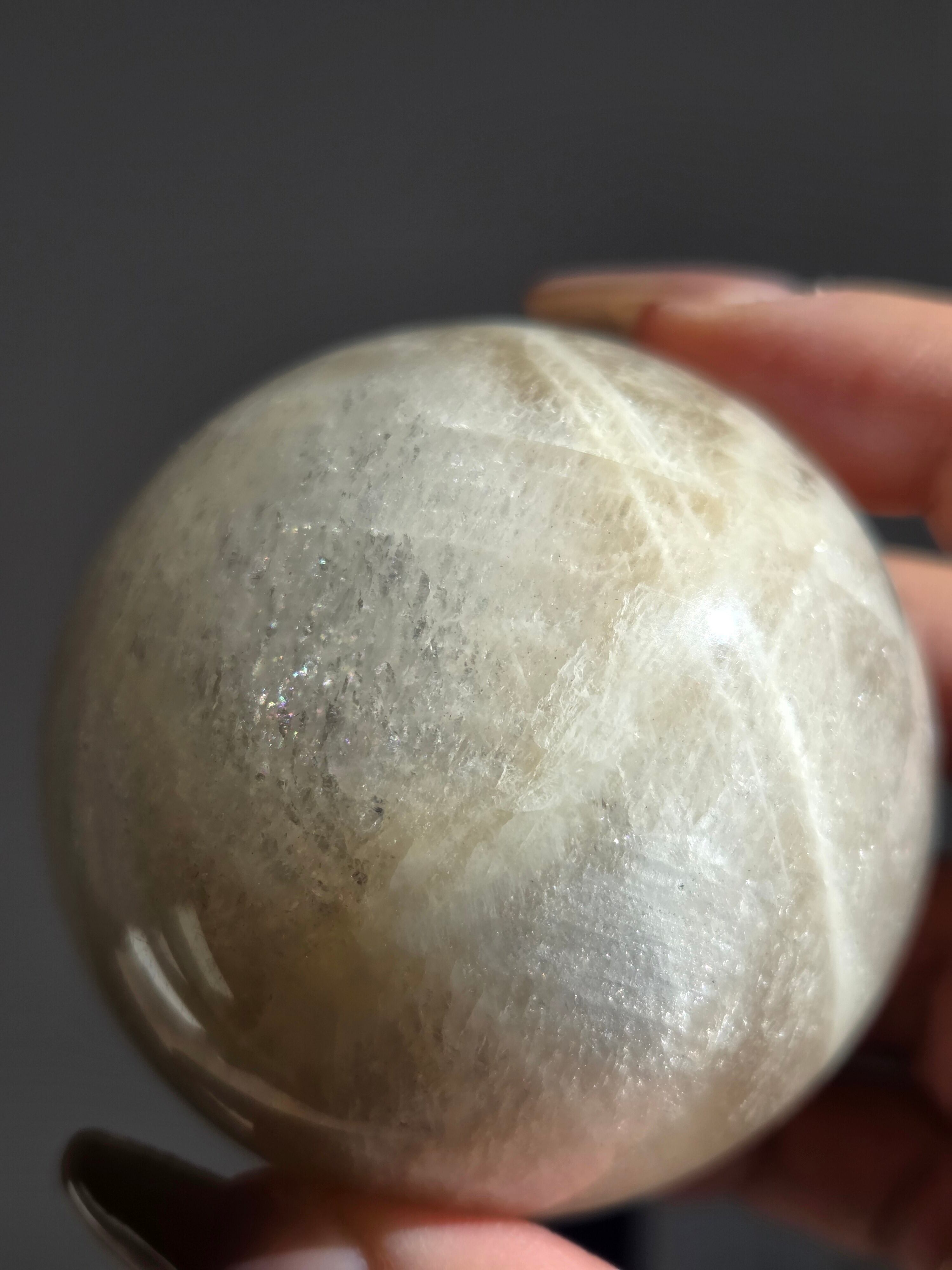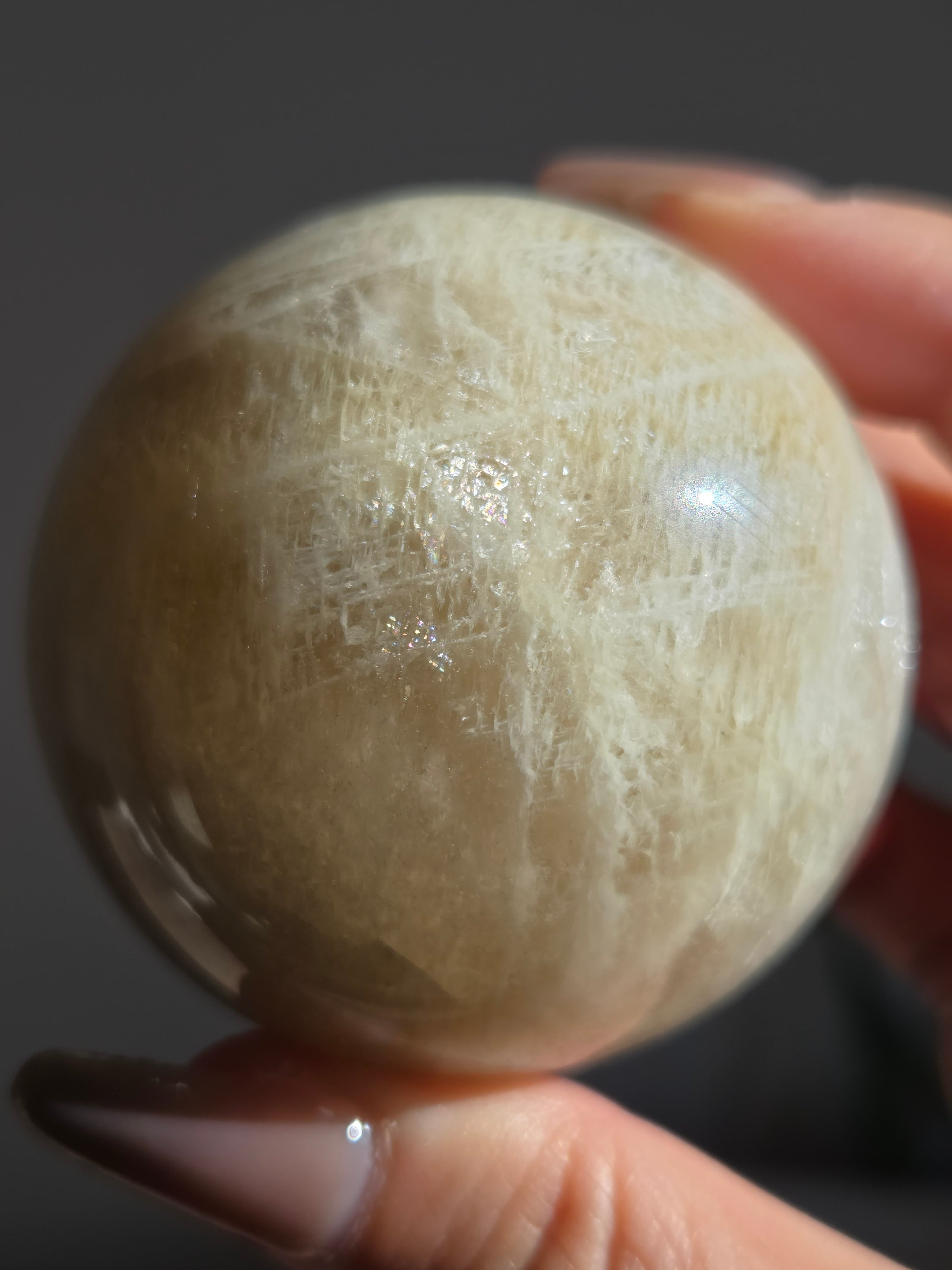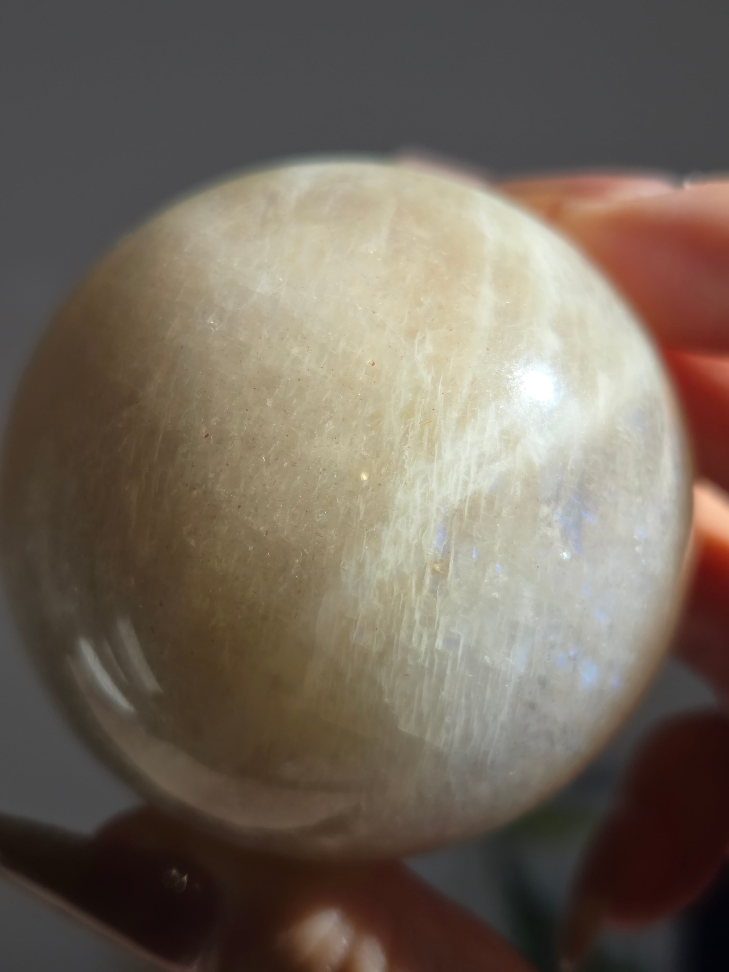 ブルーシラーや、シルバーシラー、シルバーフラッシュ等見られ、1つのスフィアで、ムーンストーンの素敵さとサンストーンの素敵さ全部味わえる贅沢な子です。