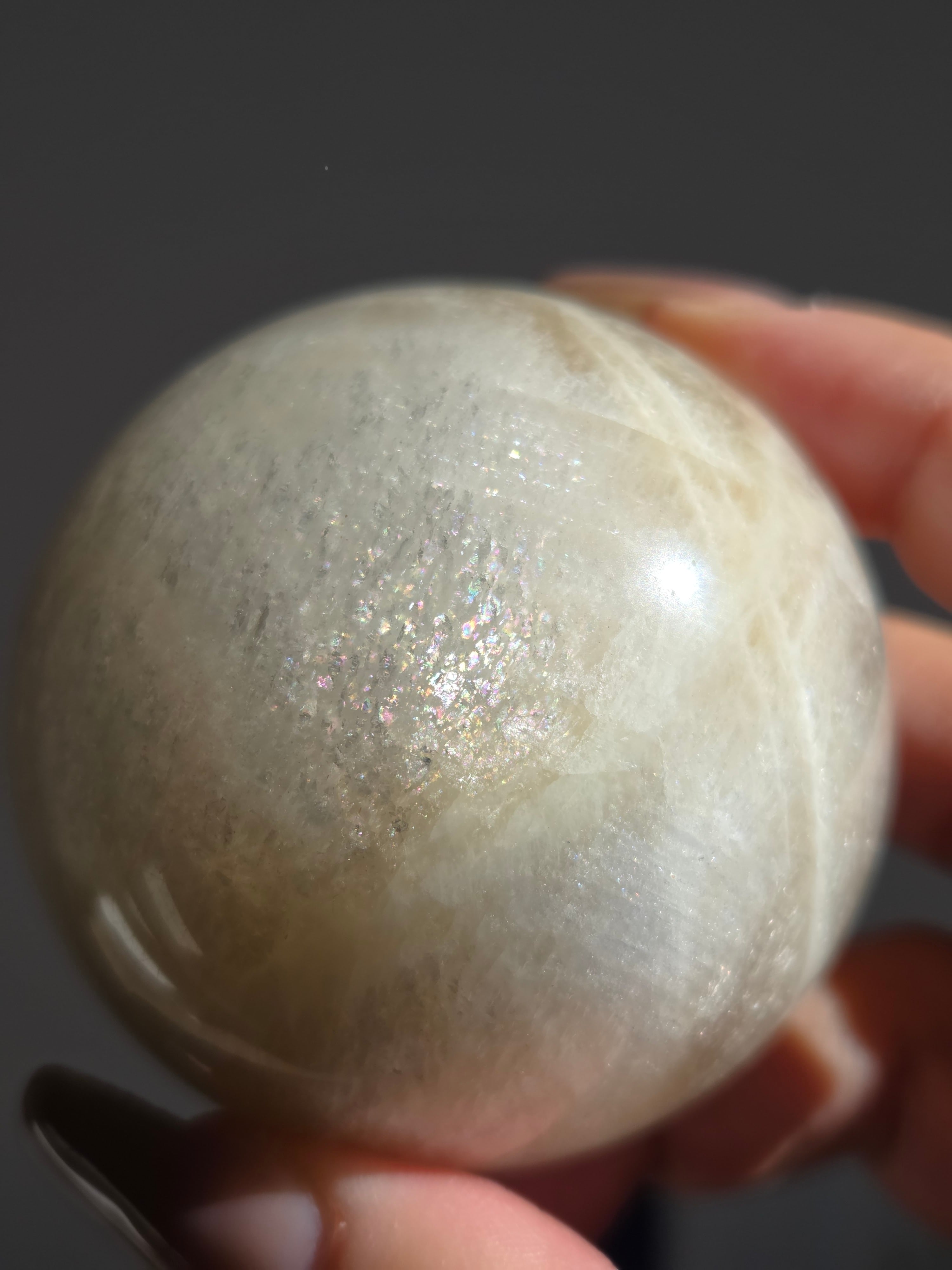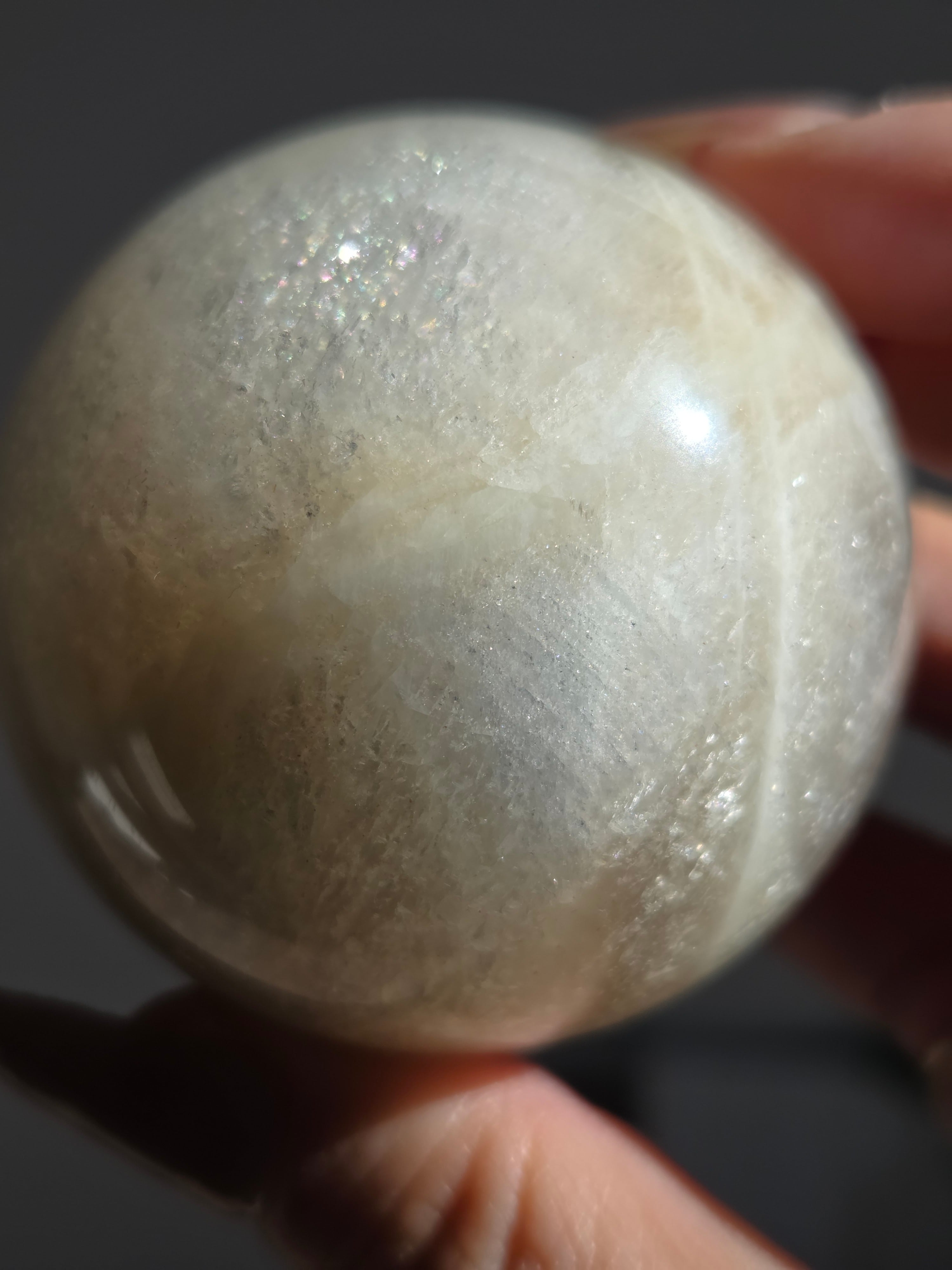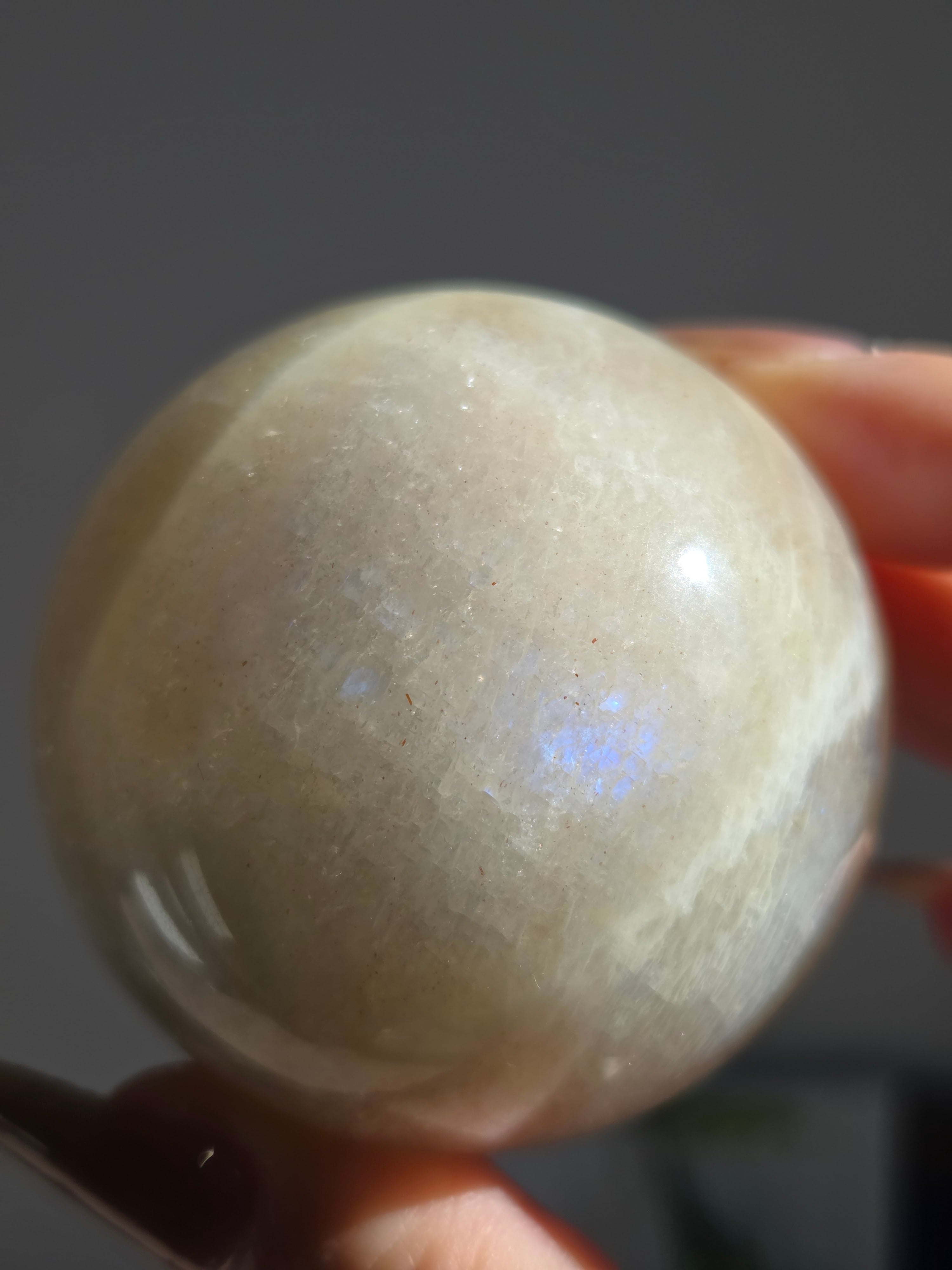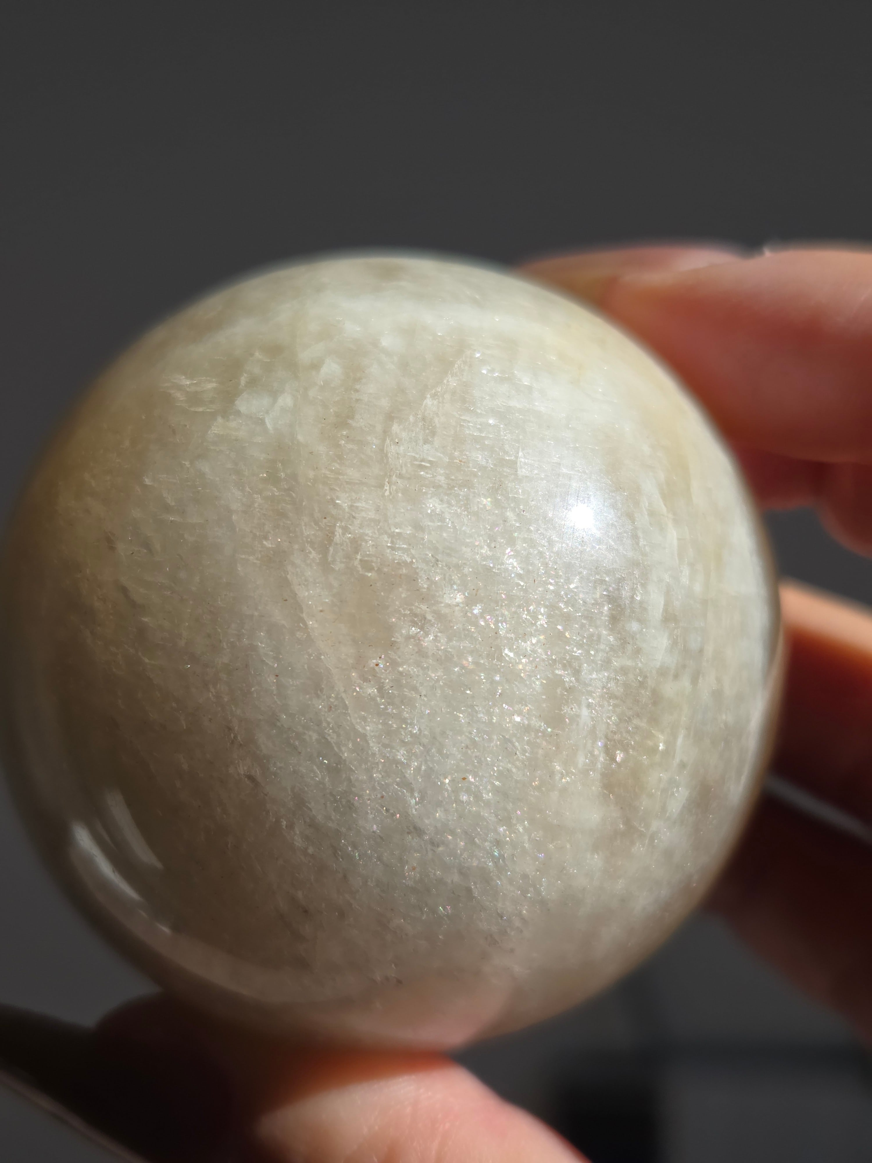ブルーシラーや、シルバーシラー、シルバーフラッシュ等見られ、1つのスフィアで、ムーンストーンの素敵さとサンストーンの素敵さ全部味わえる贅沢な子です。