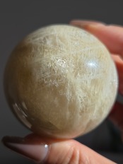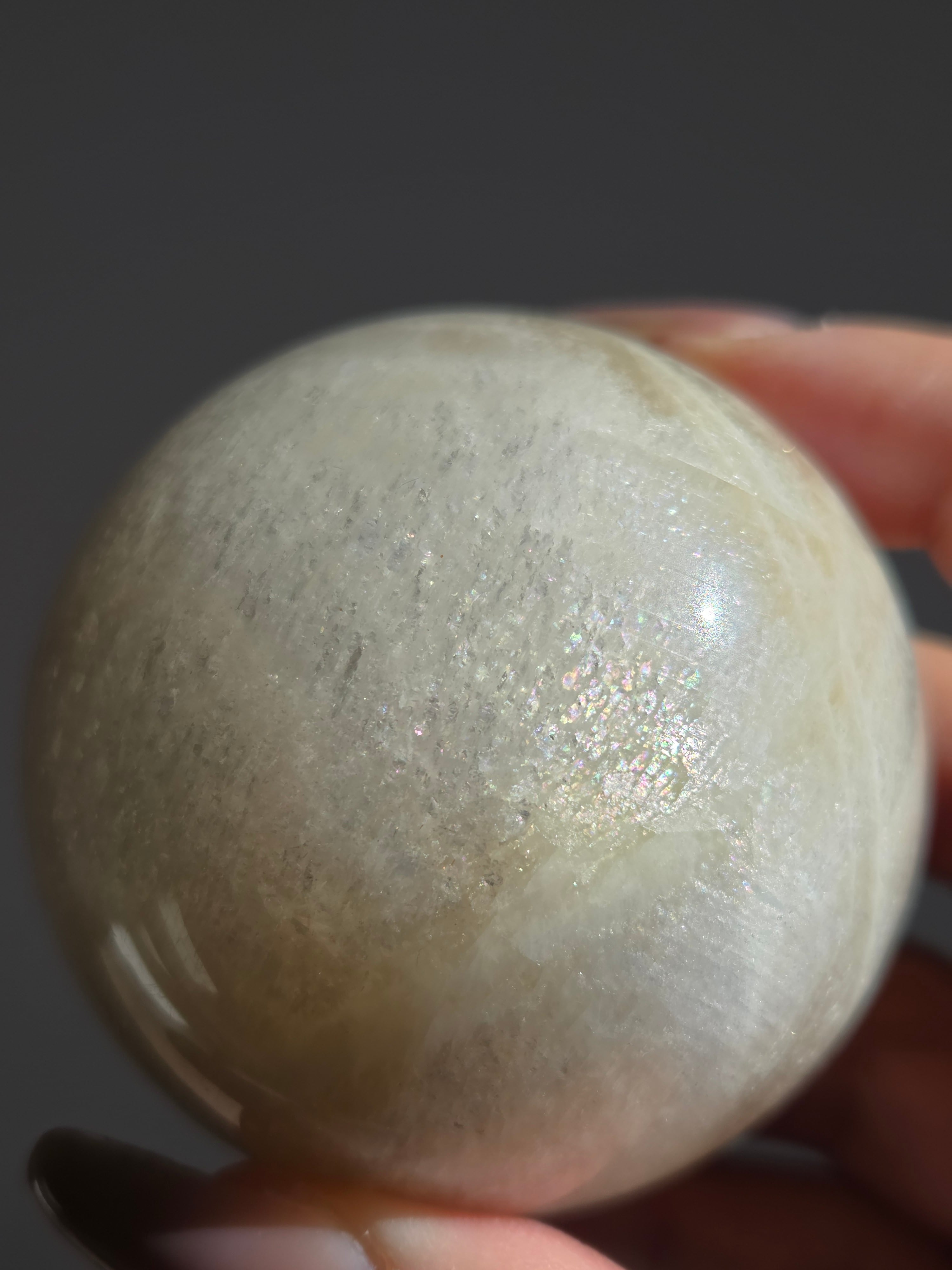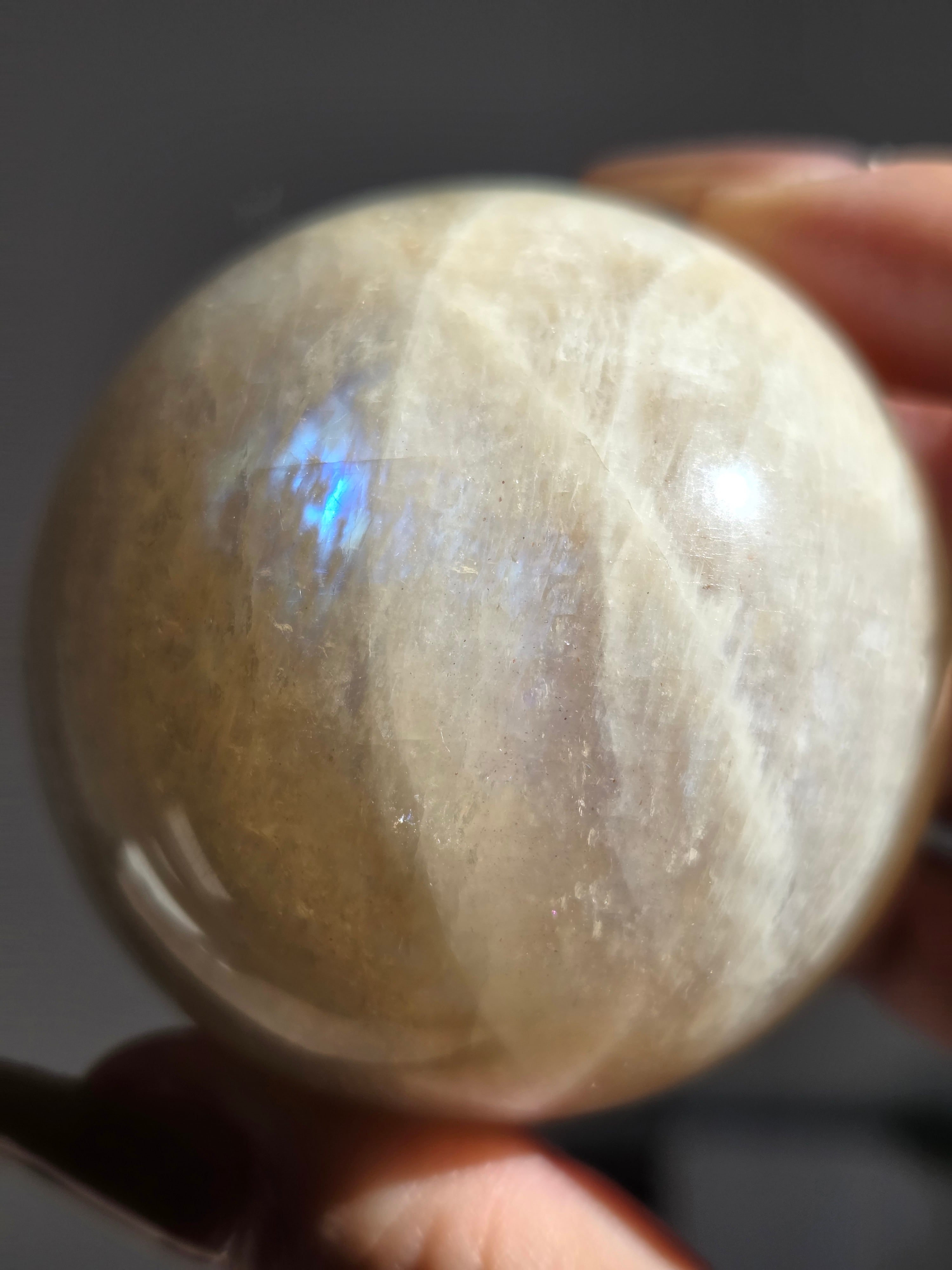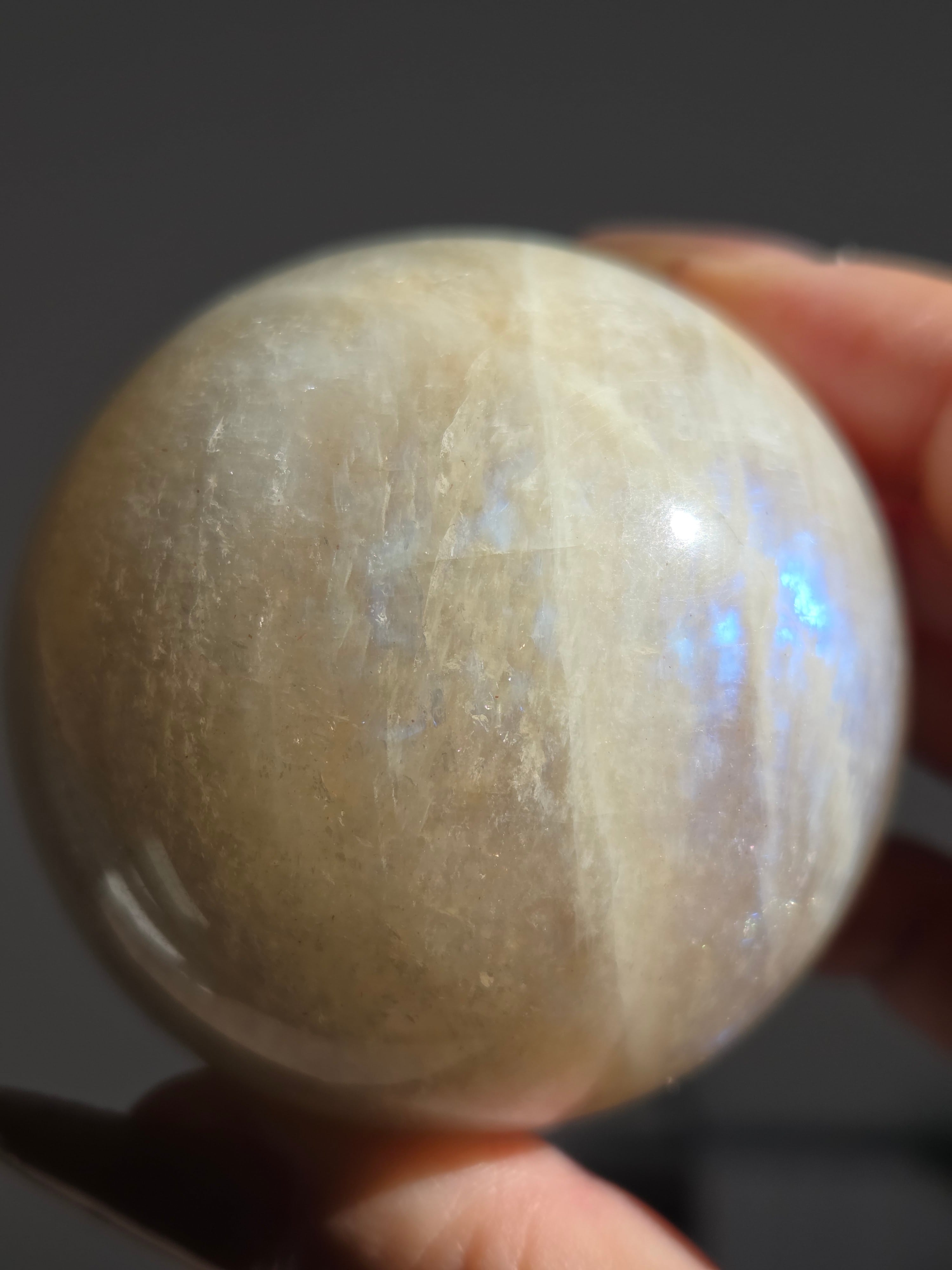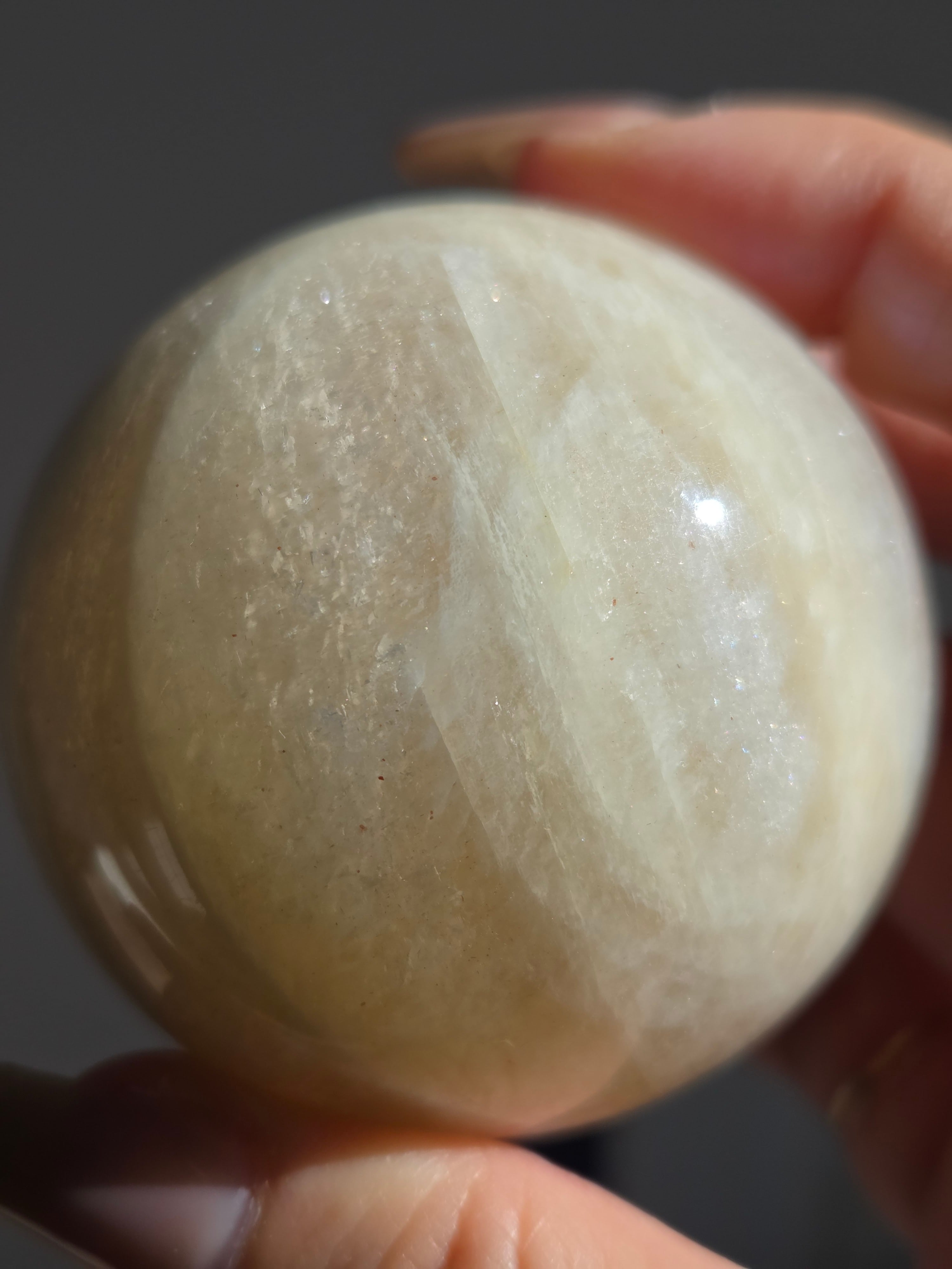 ブルーシラーや、シルバーシラー、シルバーフラッシュ等見られ、1つのスフィアで、ムーンストーンの素敵さとサンストーンの素敵さ全部味わえる贅沢な子です。