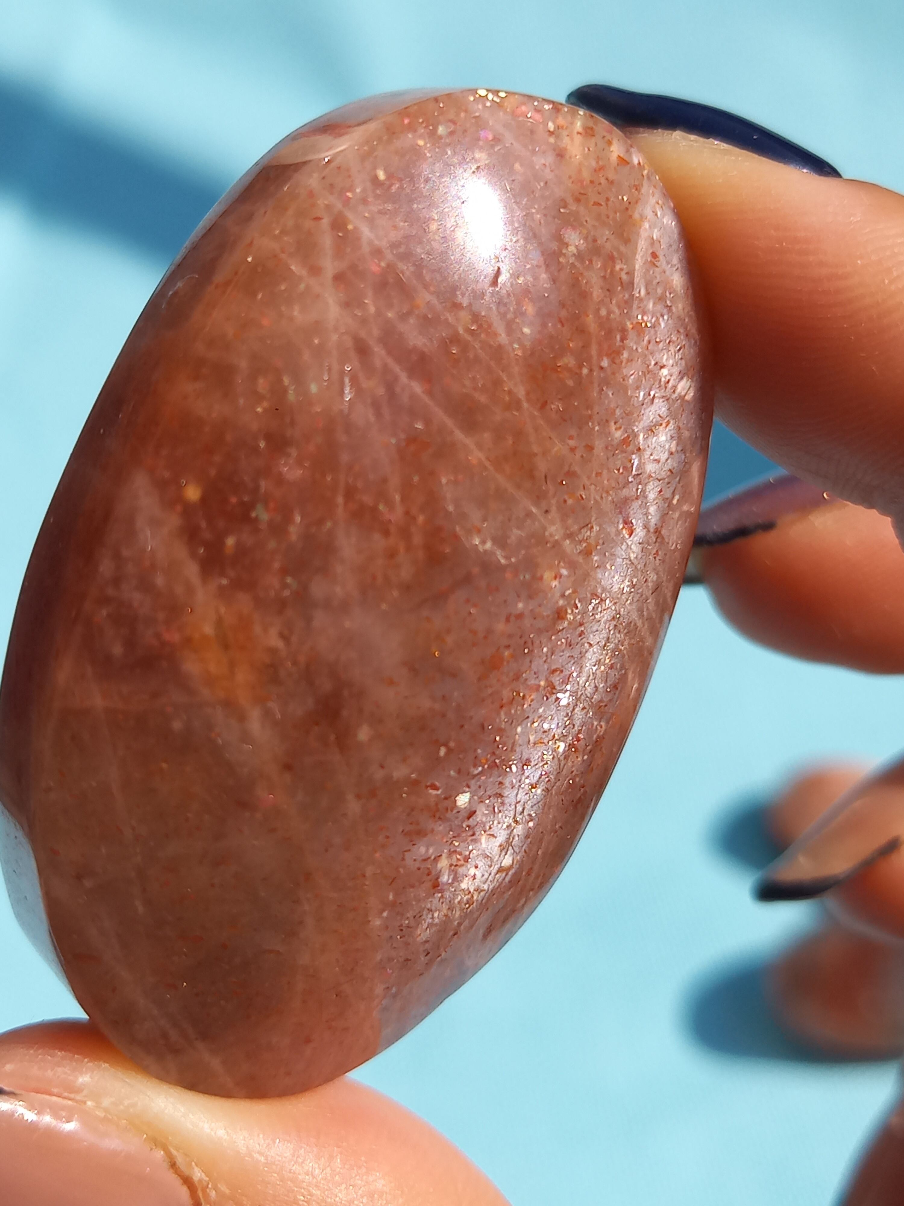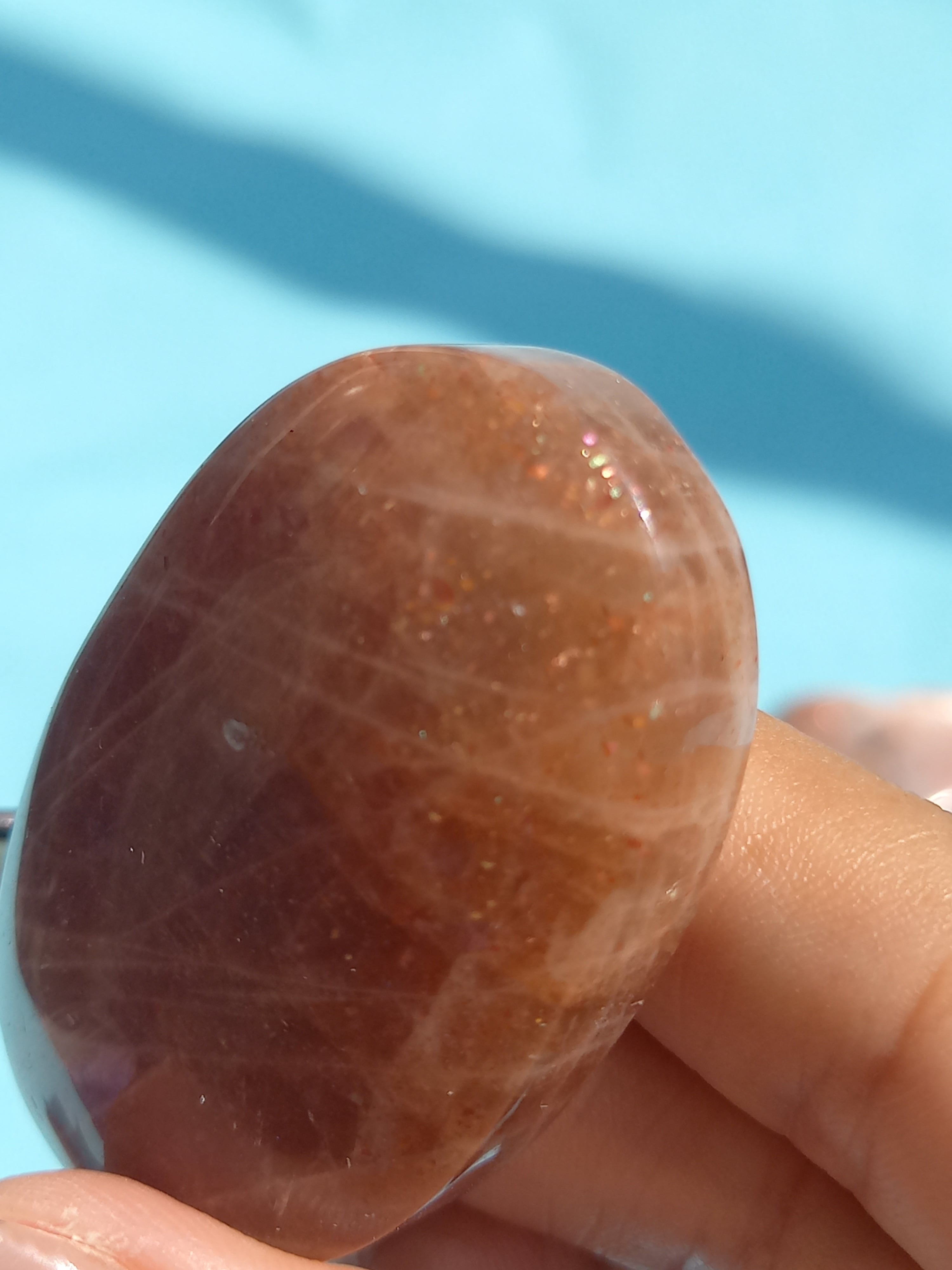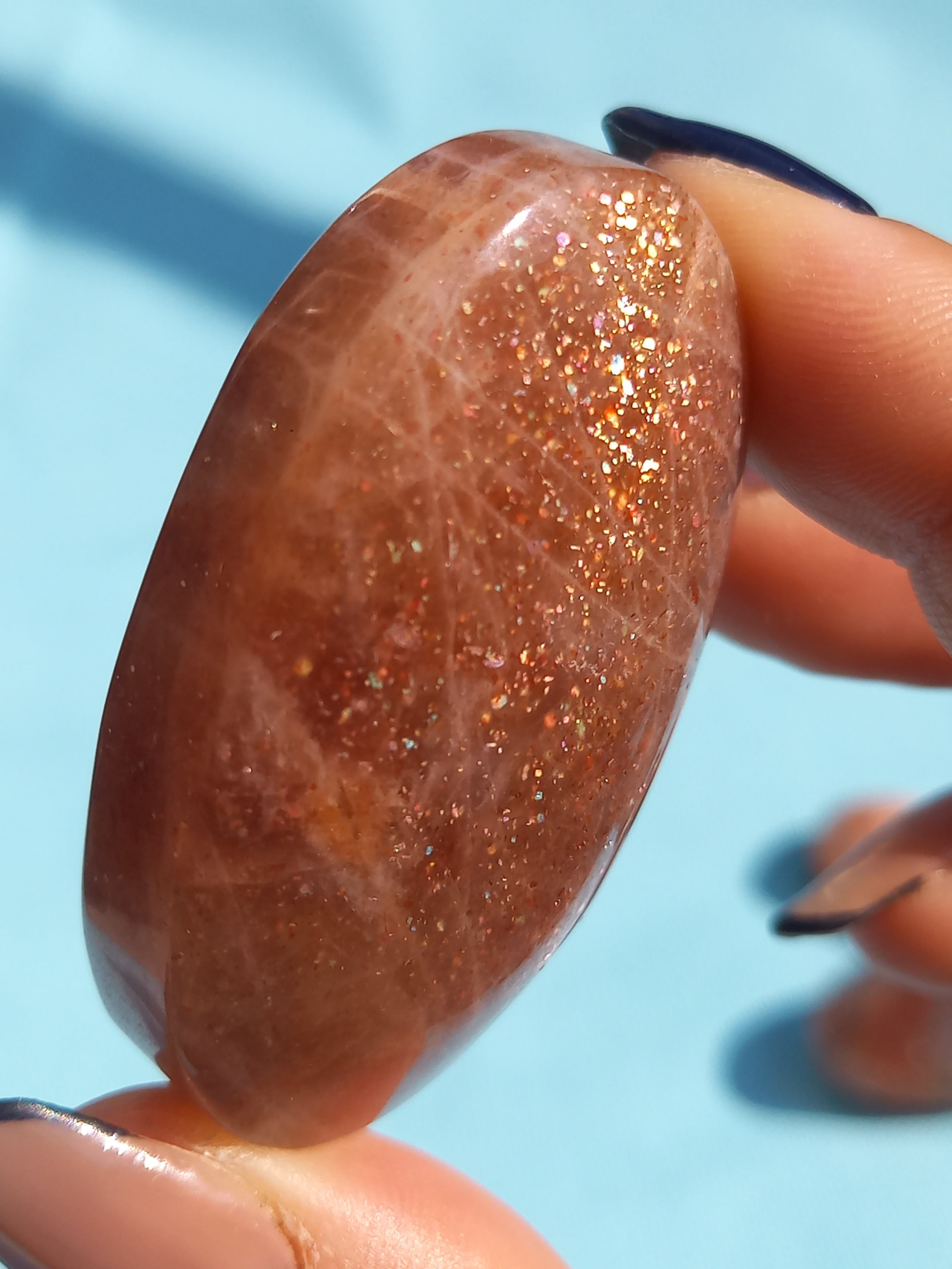 別名アクアマリンサンストーンとも呼ばれており、オレンジ、白、グリーン、ブルーなど色とりどりの色彩をもつ非常に珍しいサンストーンです。