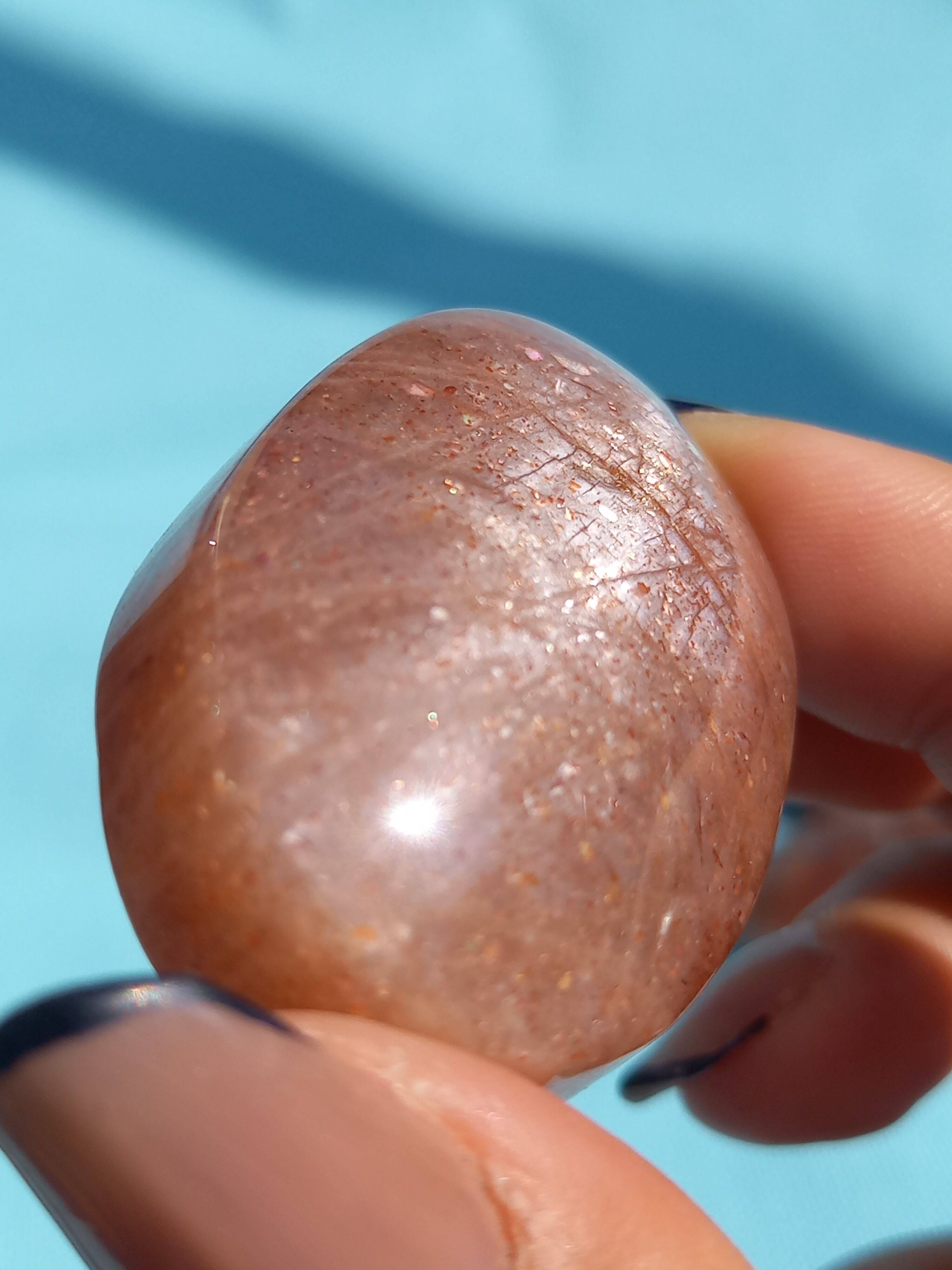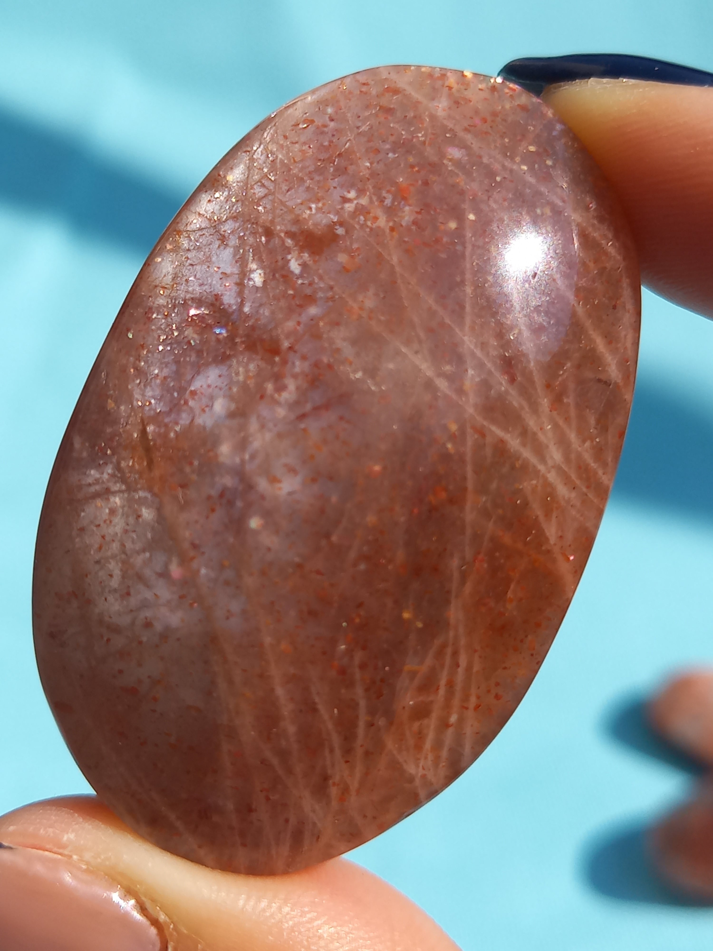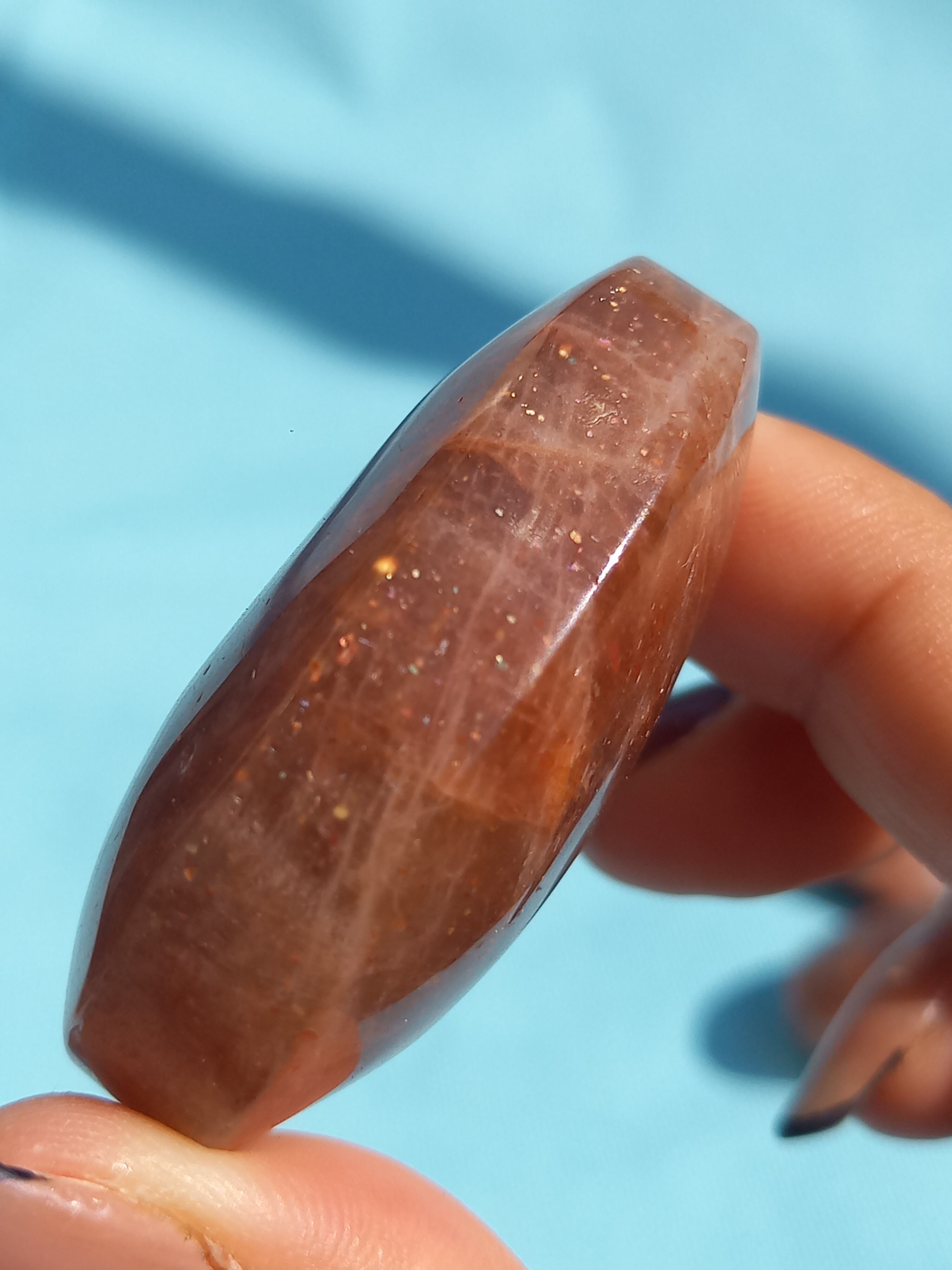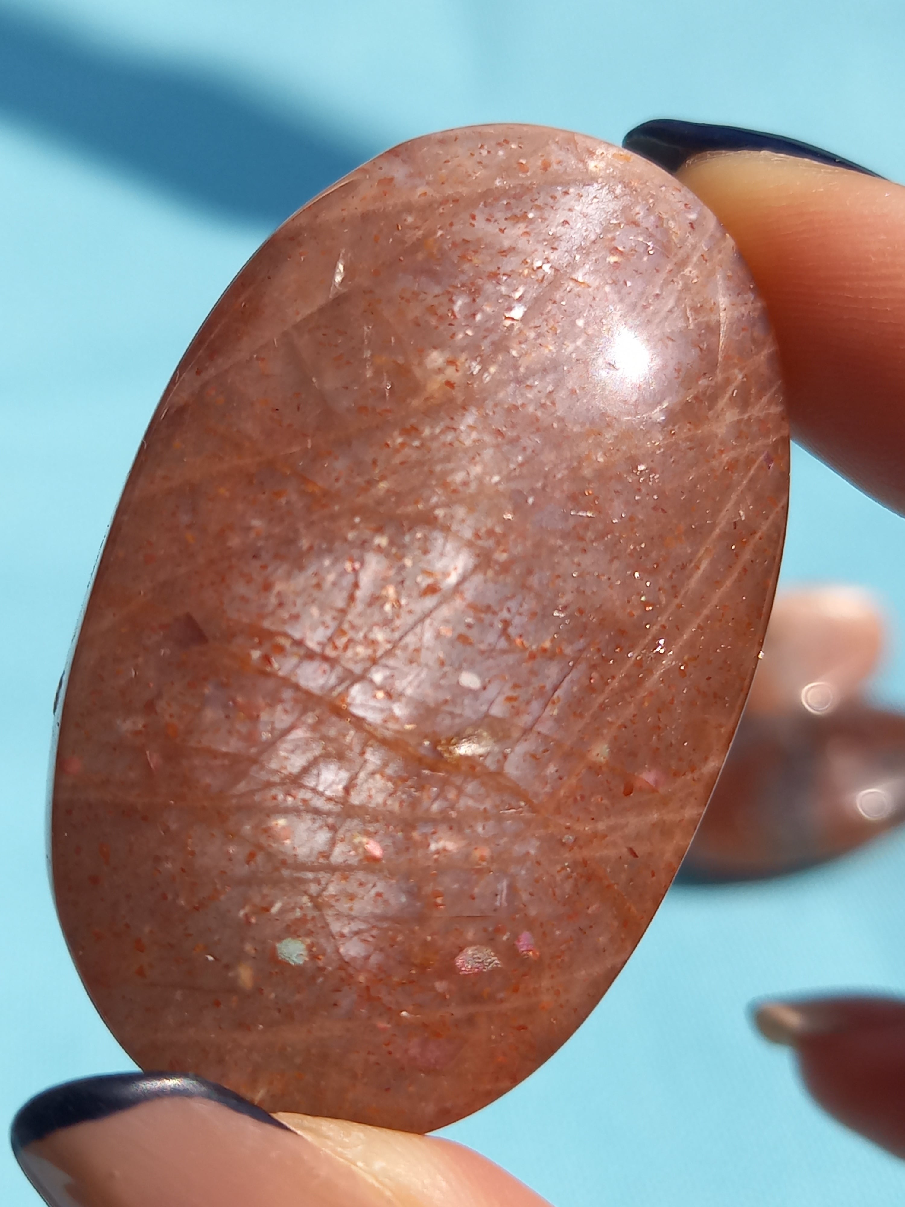 別名アクアマリンサンストーンとも呼ばれており、オレンジ、白、グリーン、ブルーなど色とりどりの色彩をもつ非常に珍しいサンストーンです。