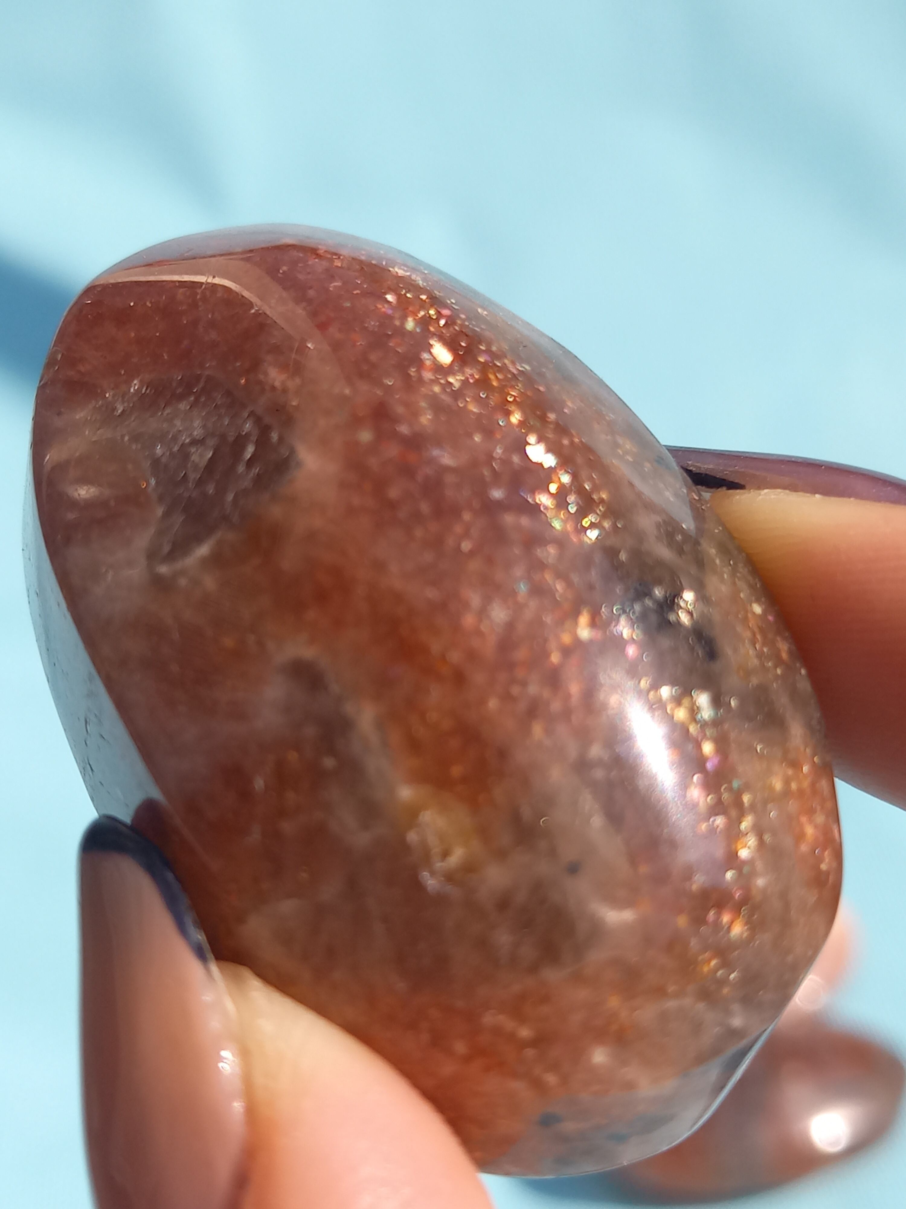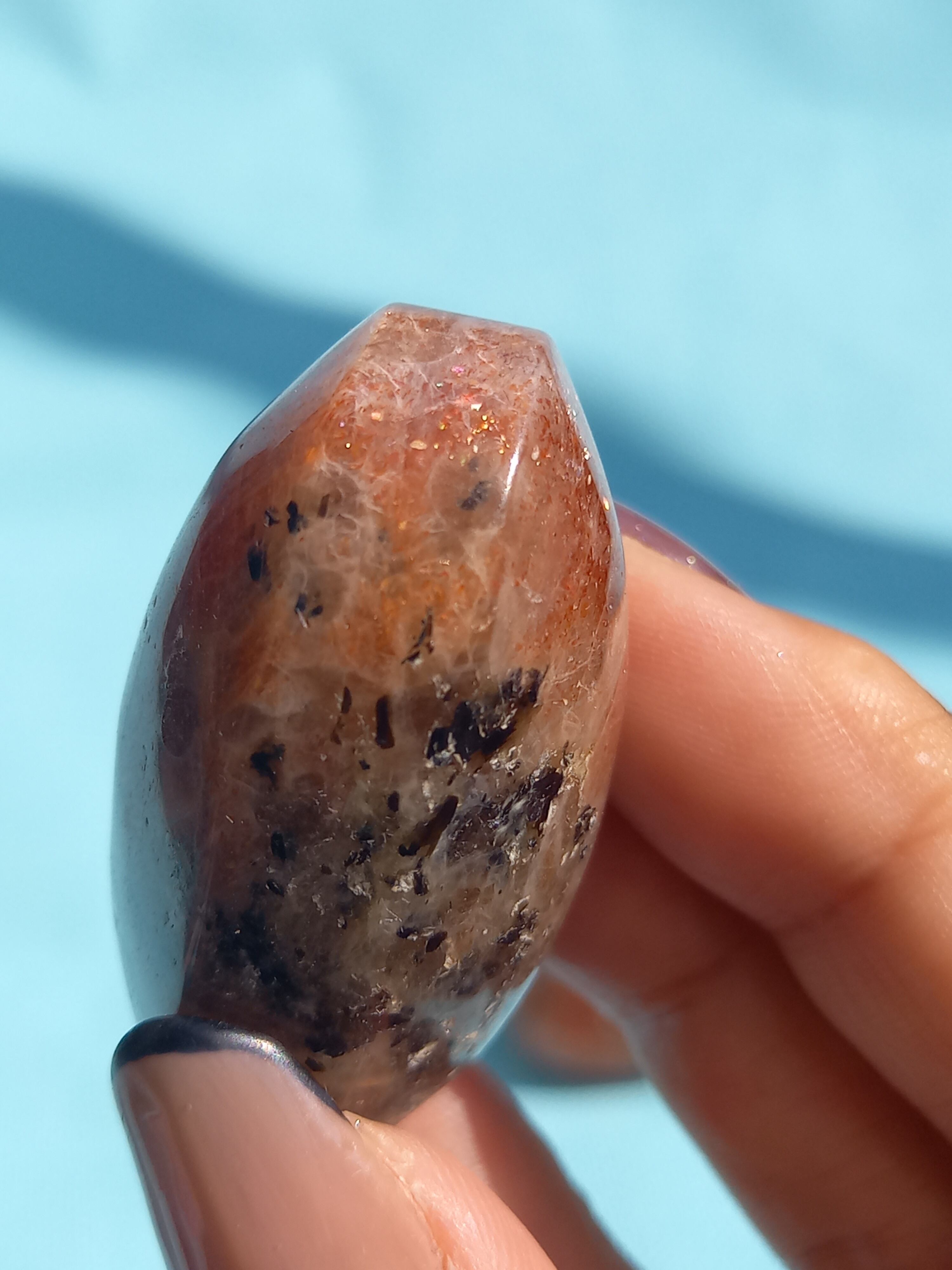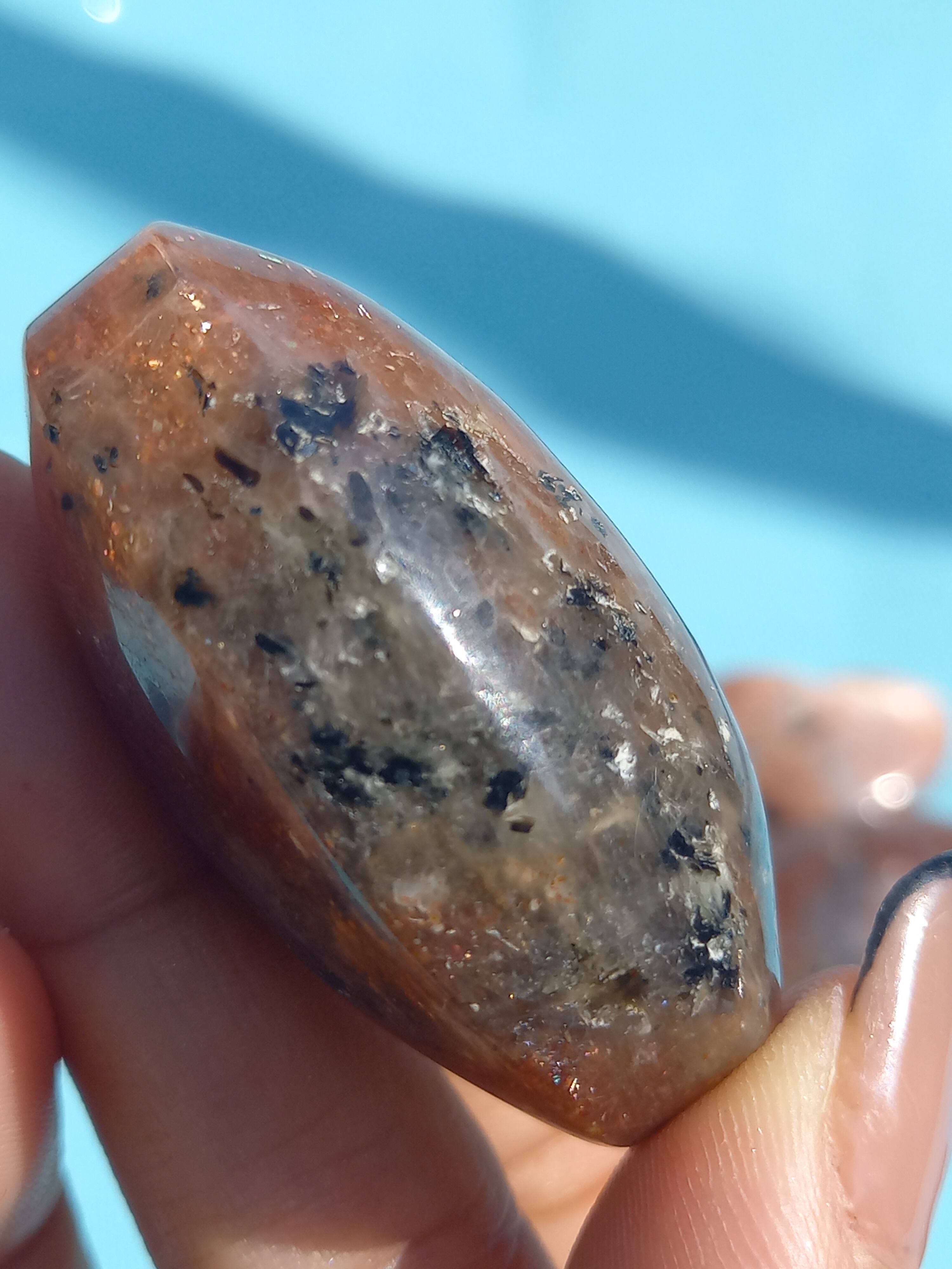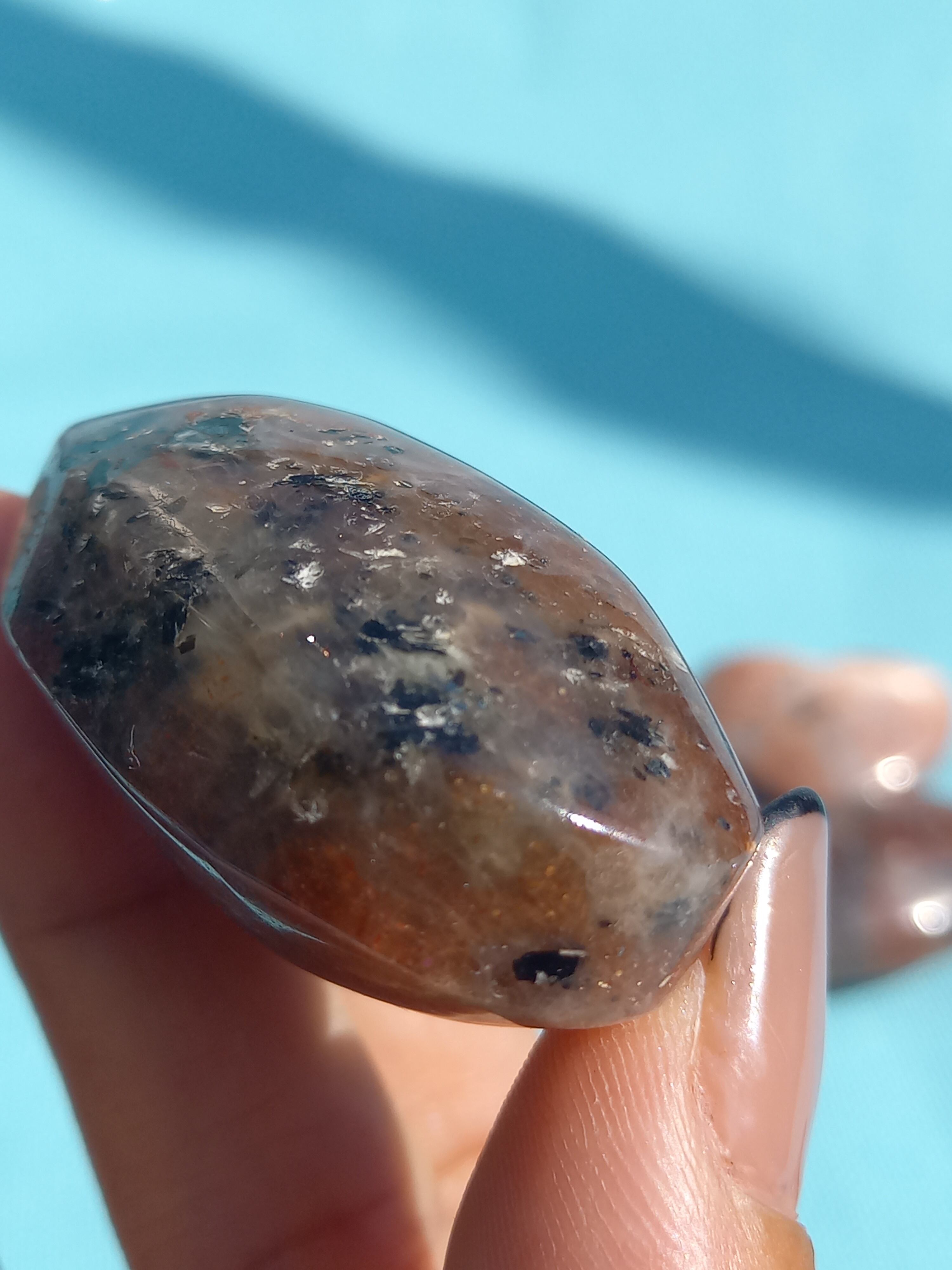 別名アクアマリンサンストーンとも呼ばれており、オレンジ、白、グリーン、ブルーなど色とりどりの色彩をもつ非常に珍しいサンストーンです。