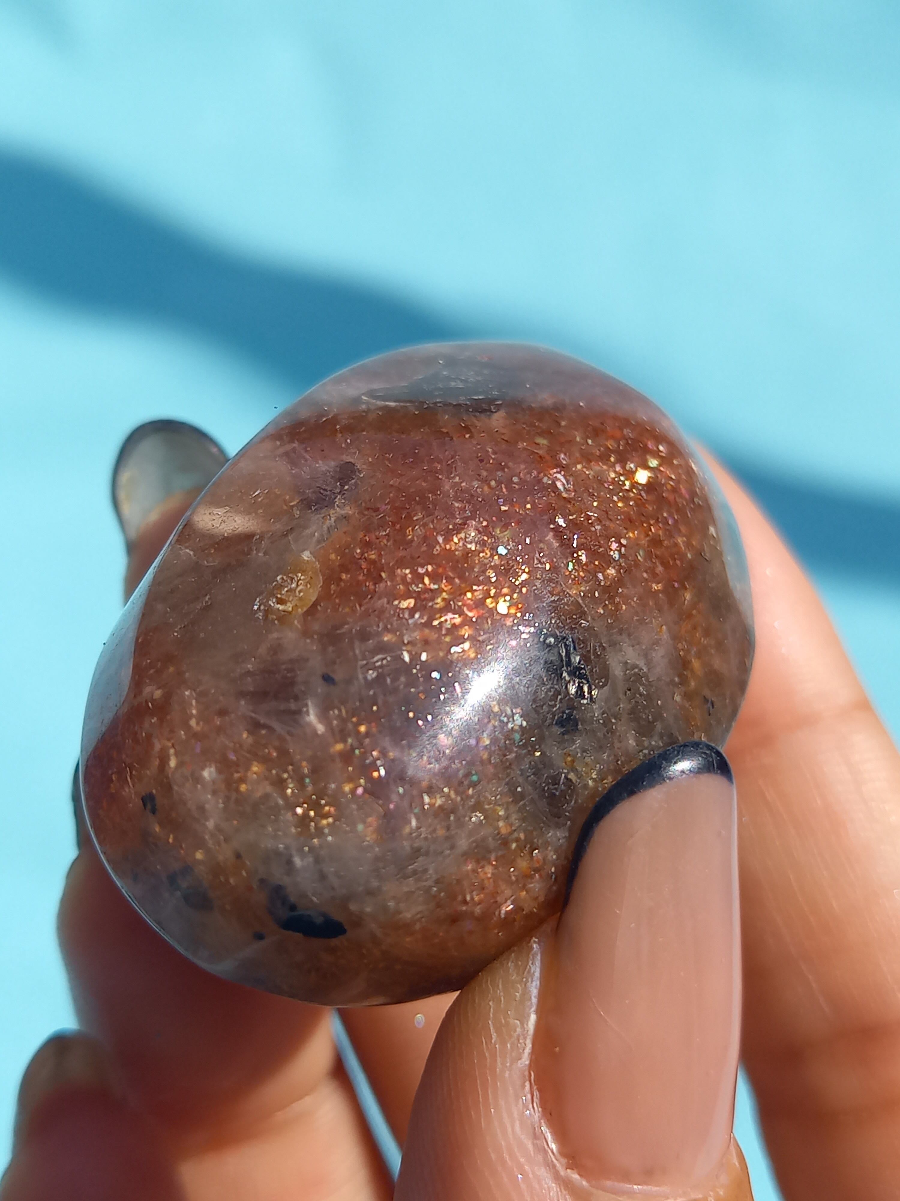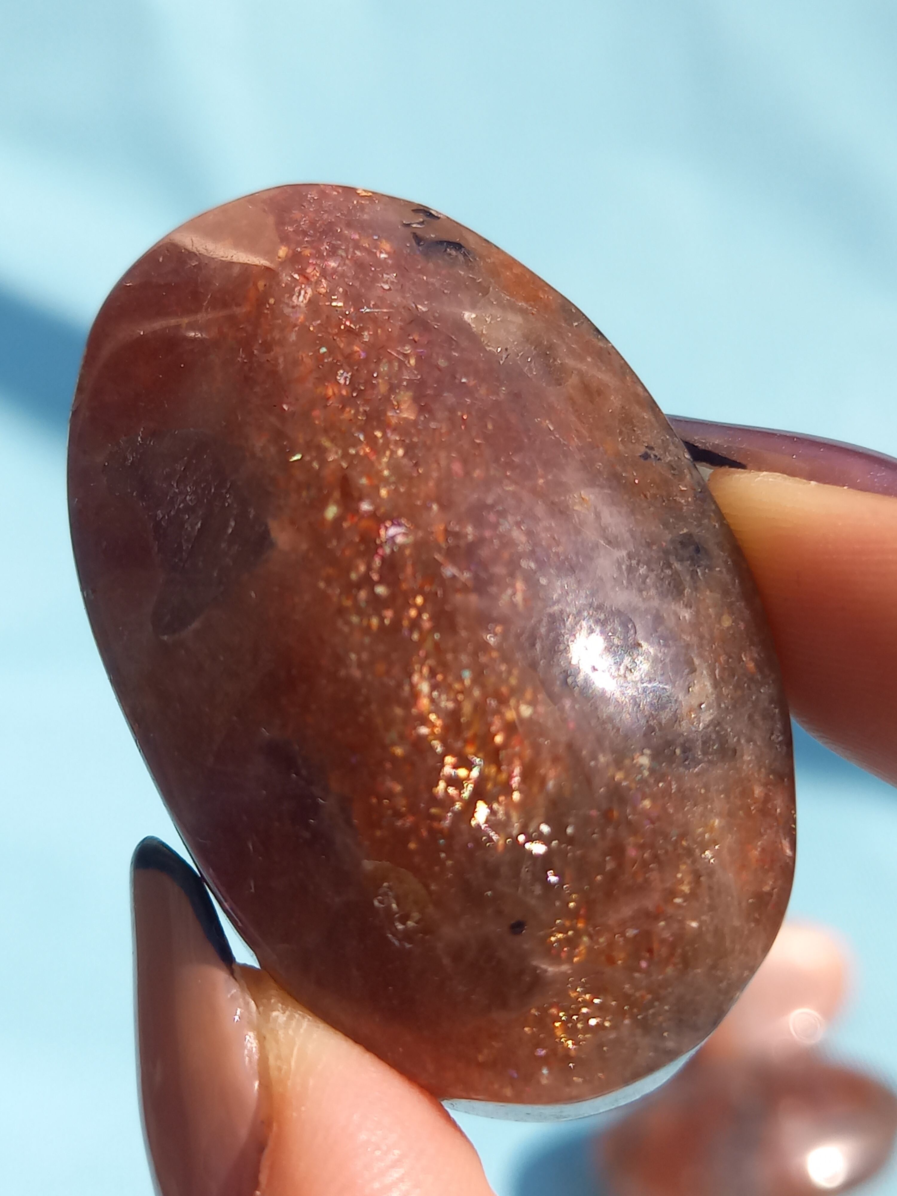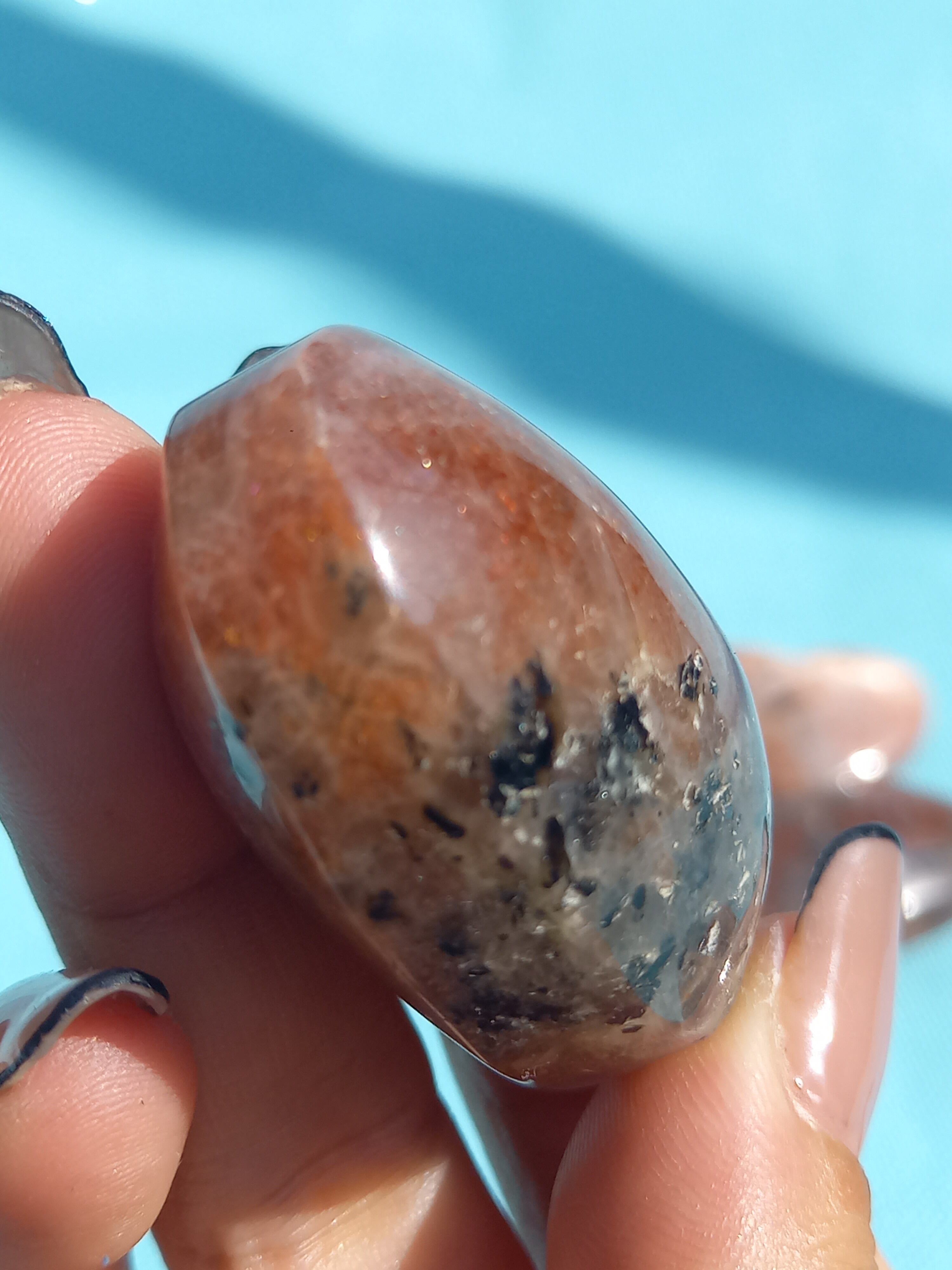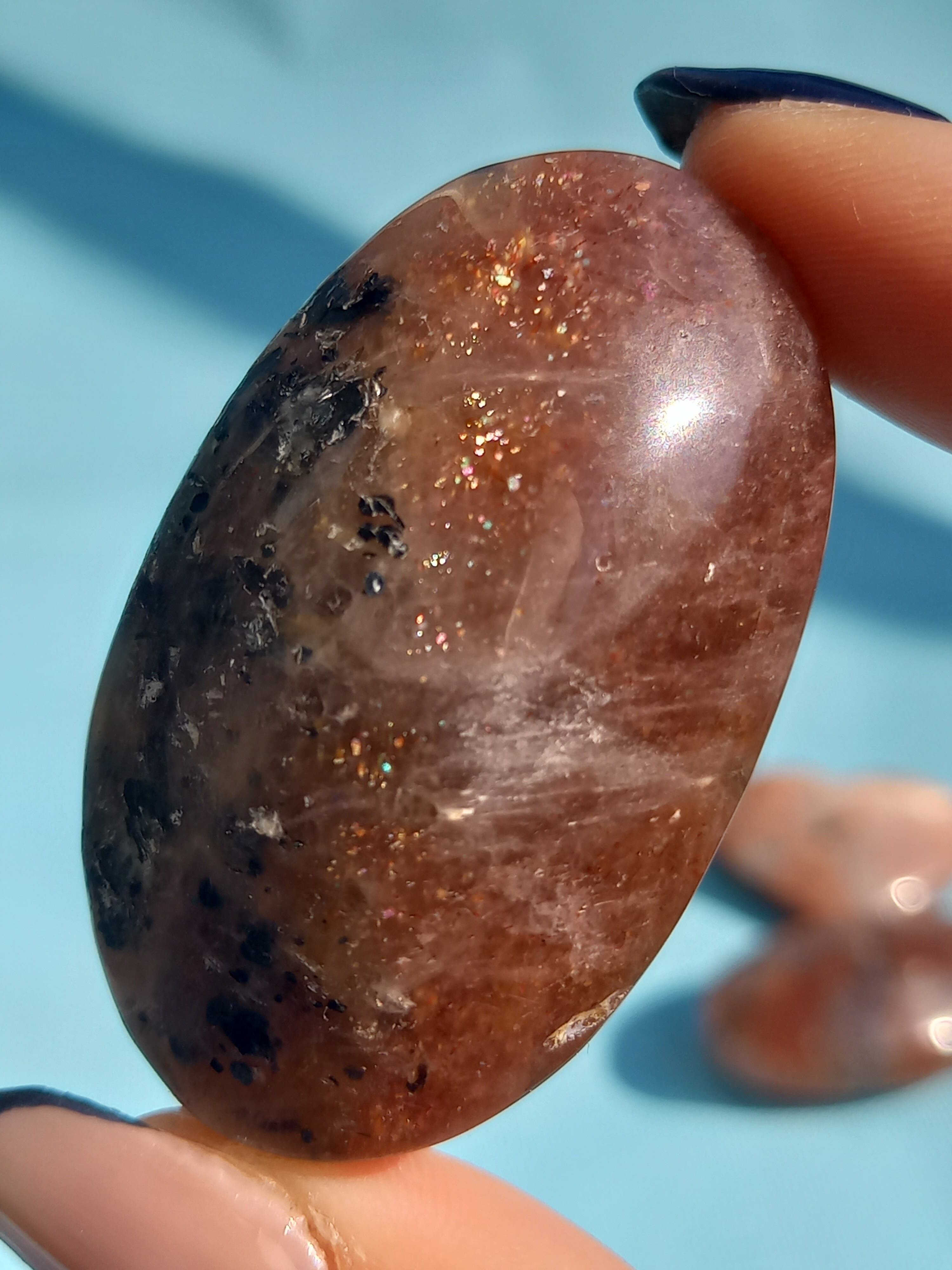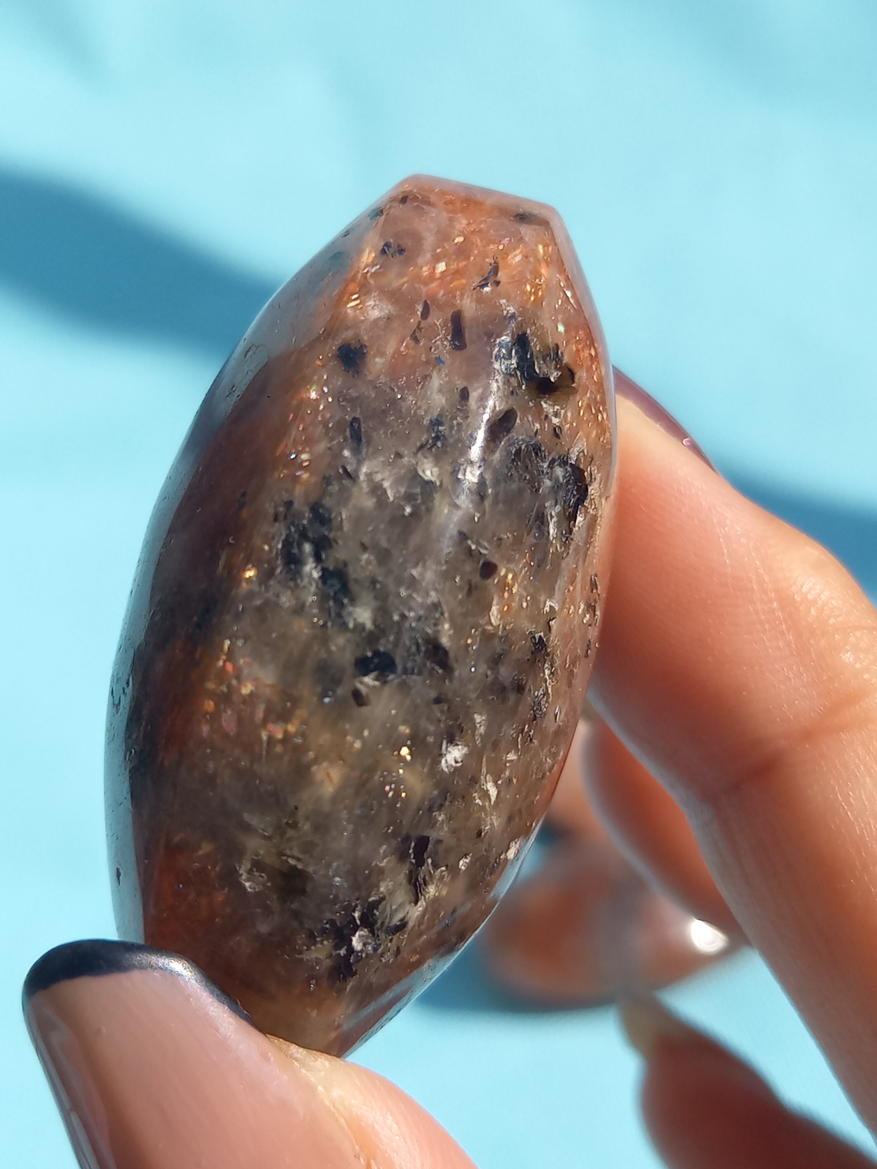 別名アクアマリンサンストーンとも呼ばれており、オレンジ、白、グリーン、ブルーなど色とりどりの色彩をもつ非常に珍しいサンストーンです。