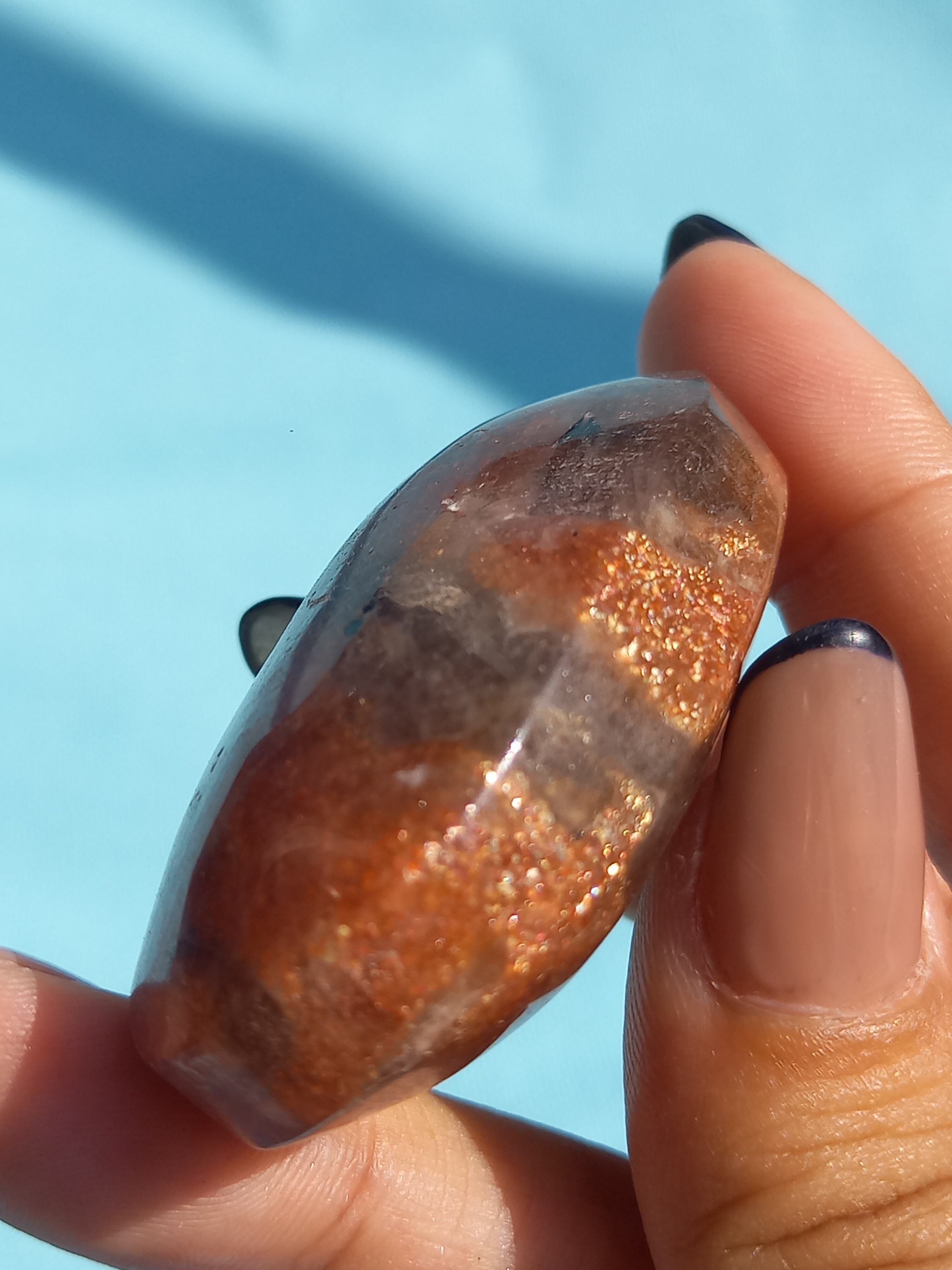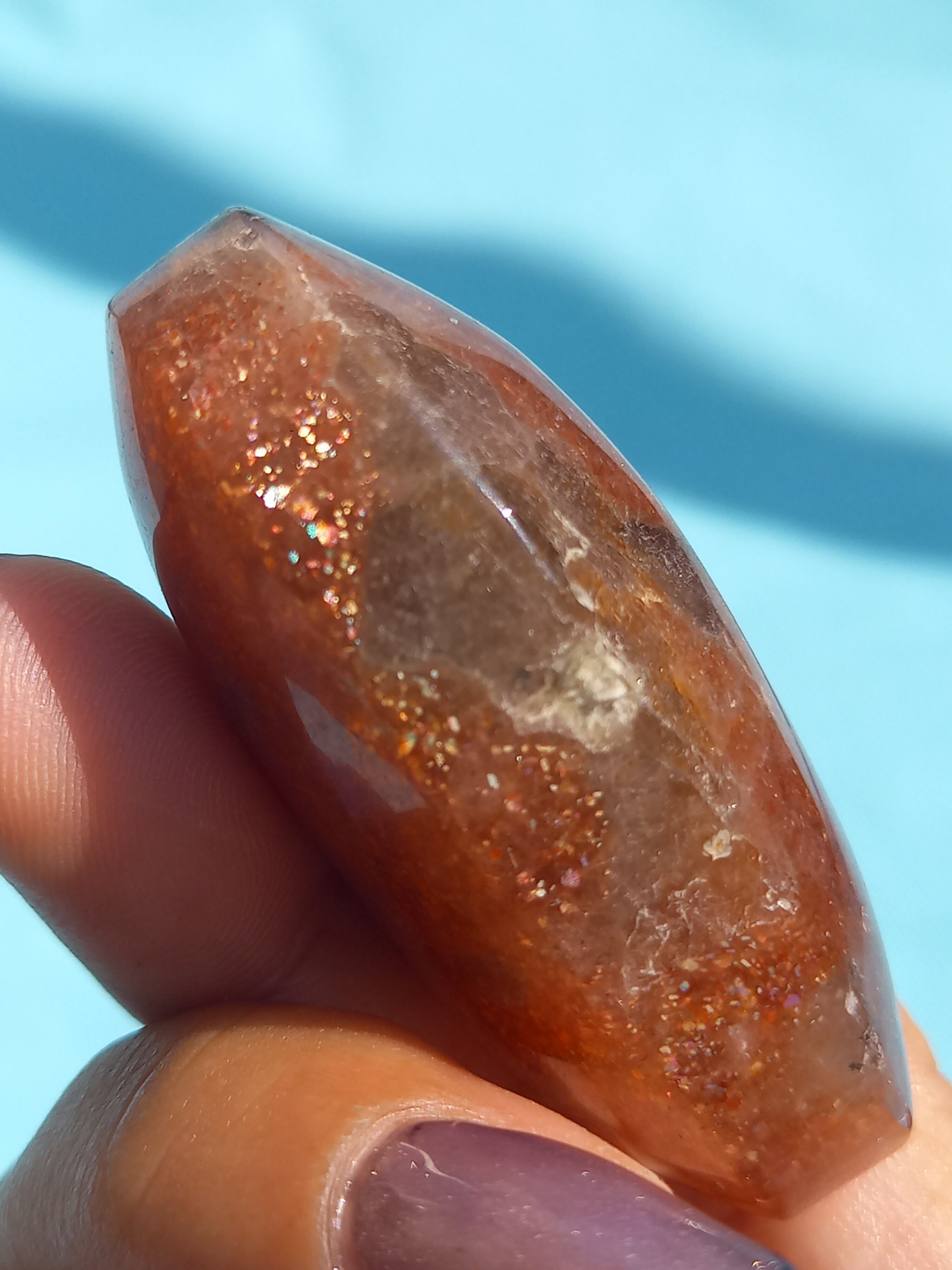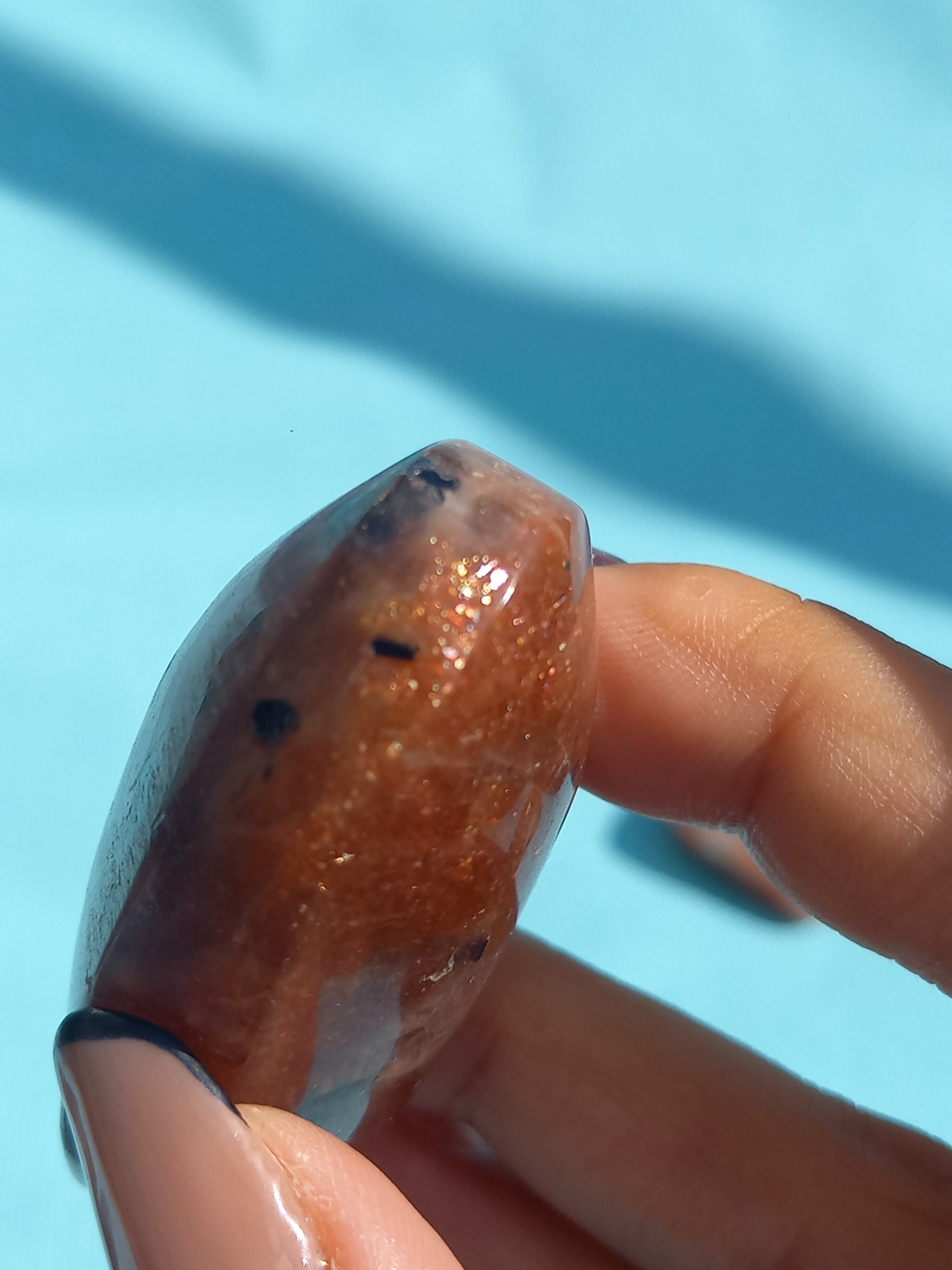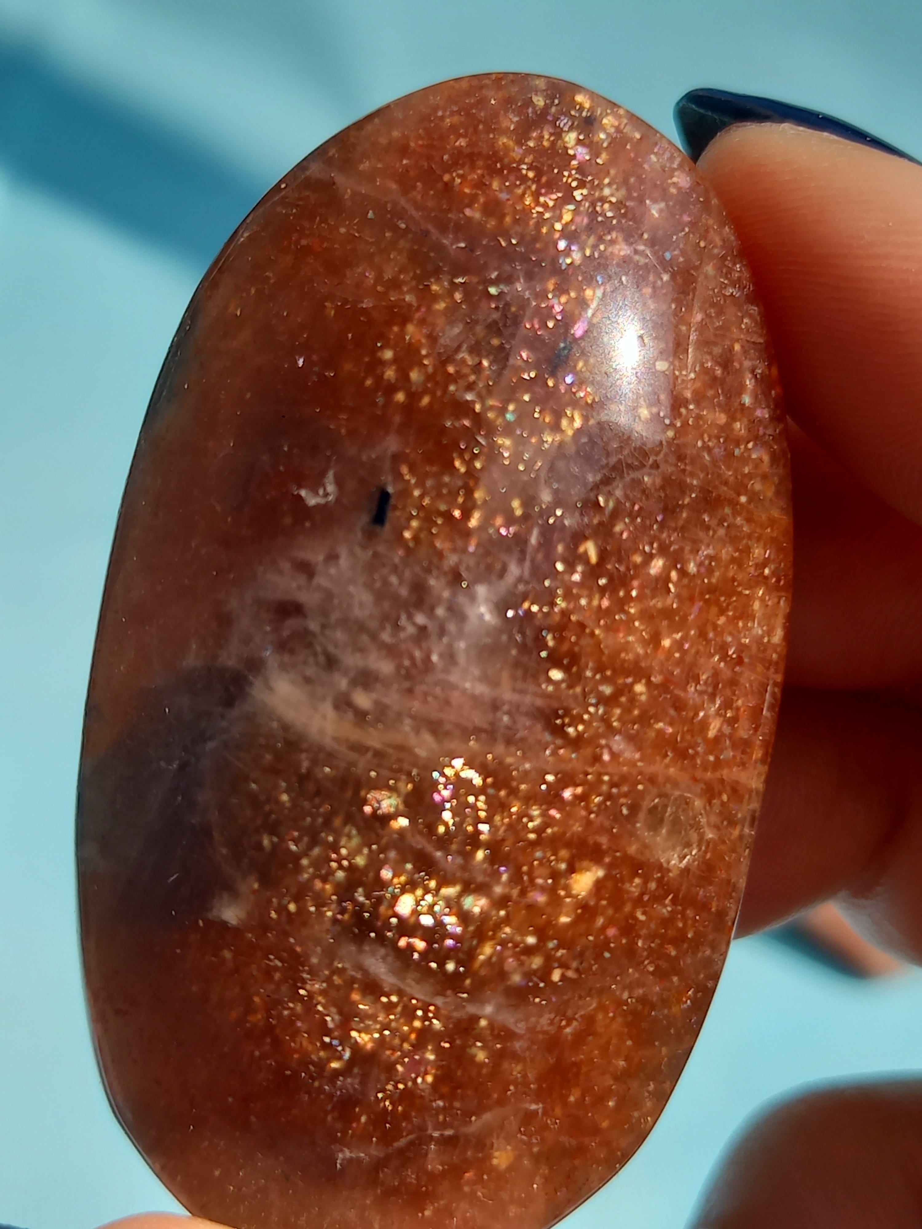別名アクアマリンサンストーンとも呼ばれており、オレンジ、白、グリーン、ブルーなど色とりどりの色彩をもつ非常に珍しいサンストーンです。