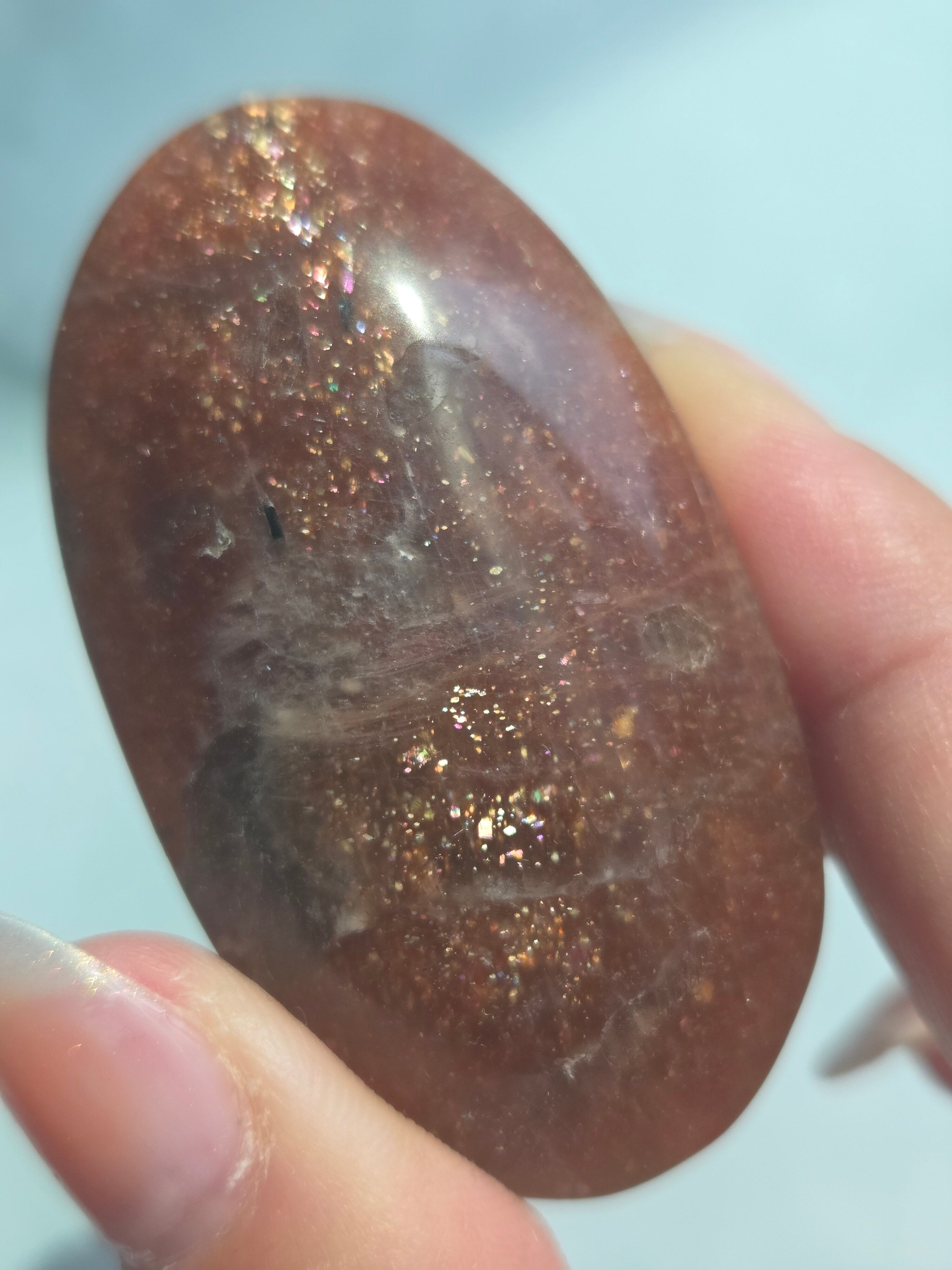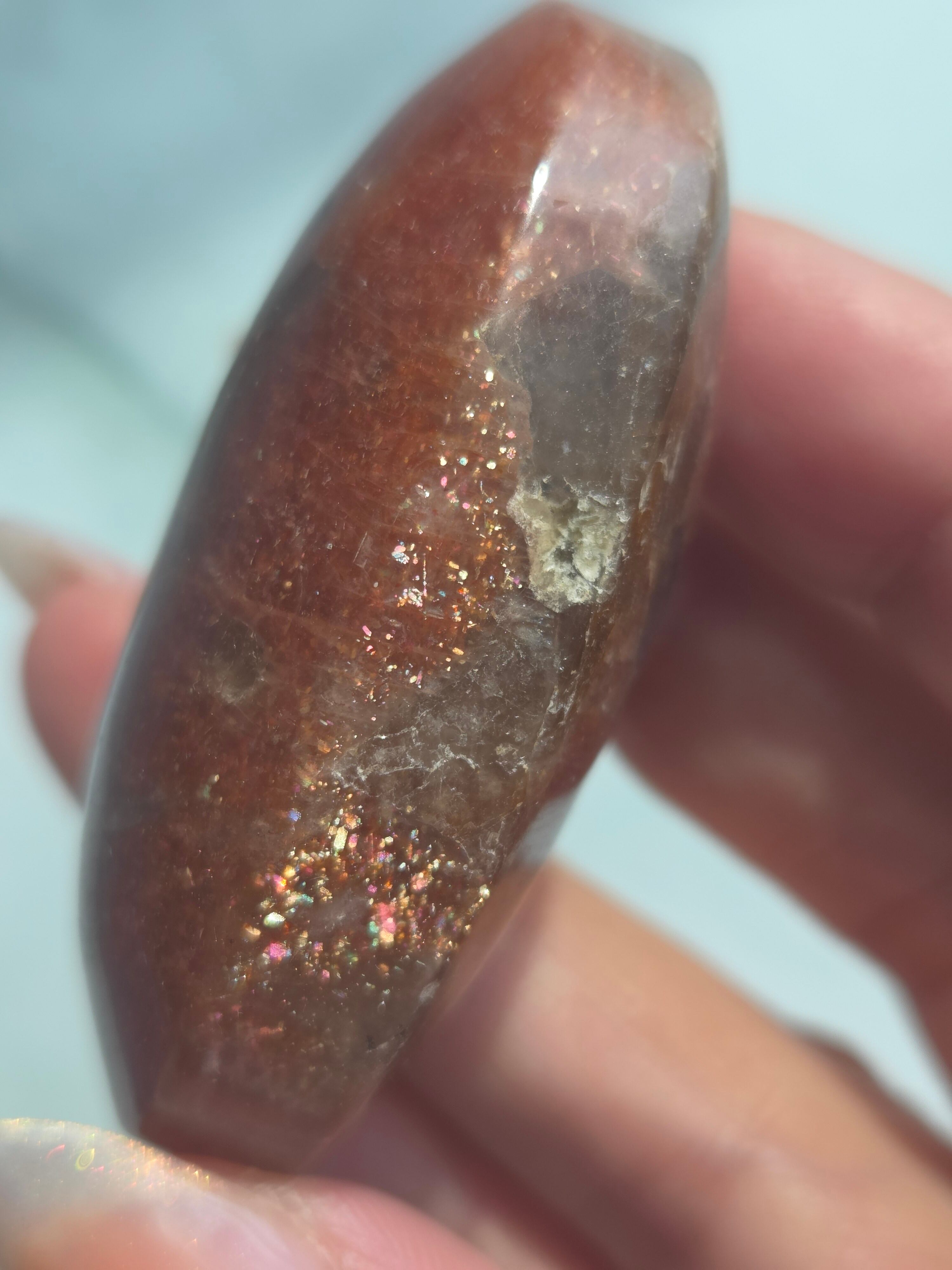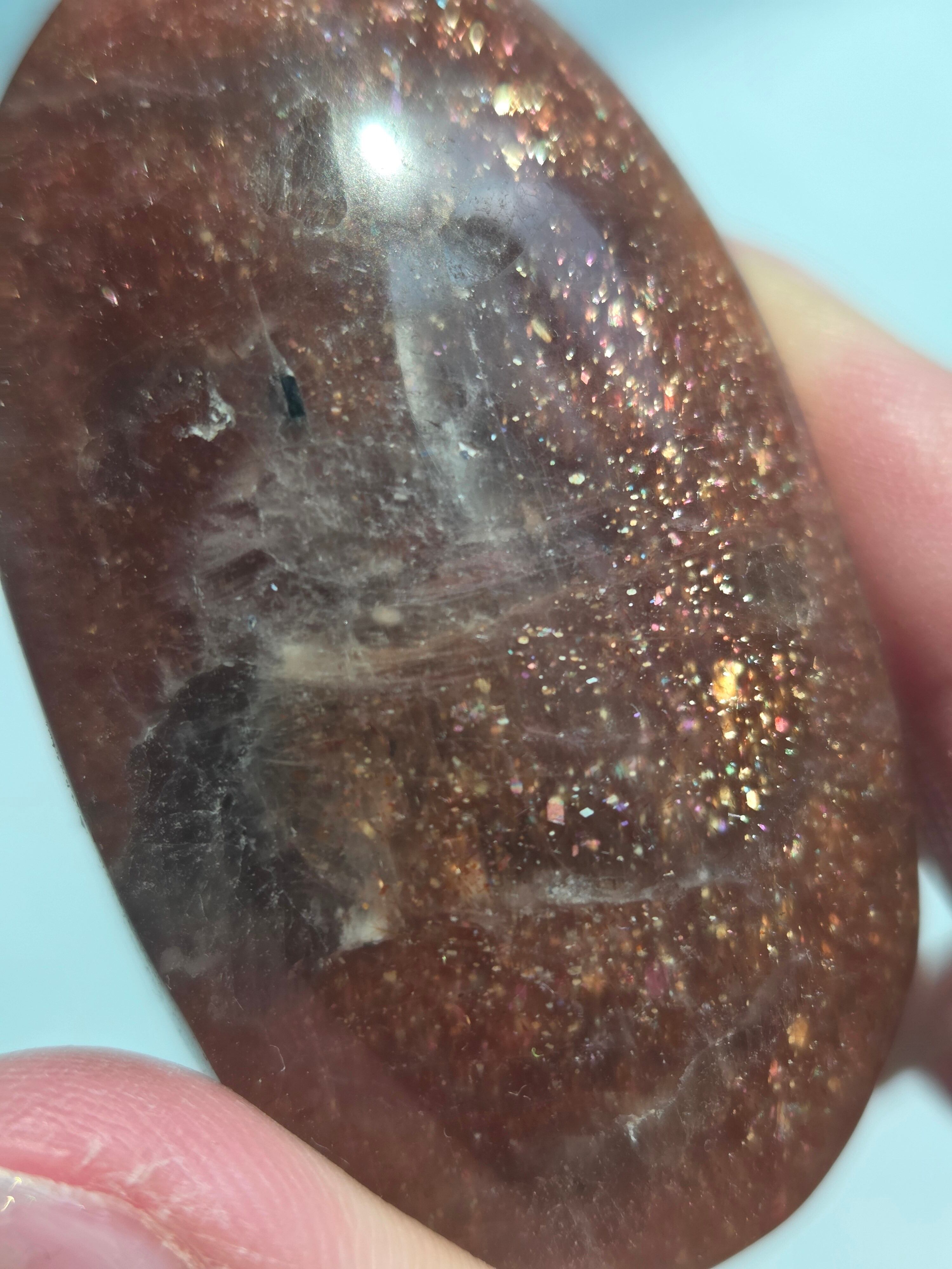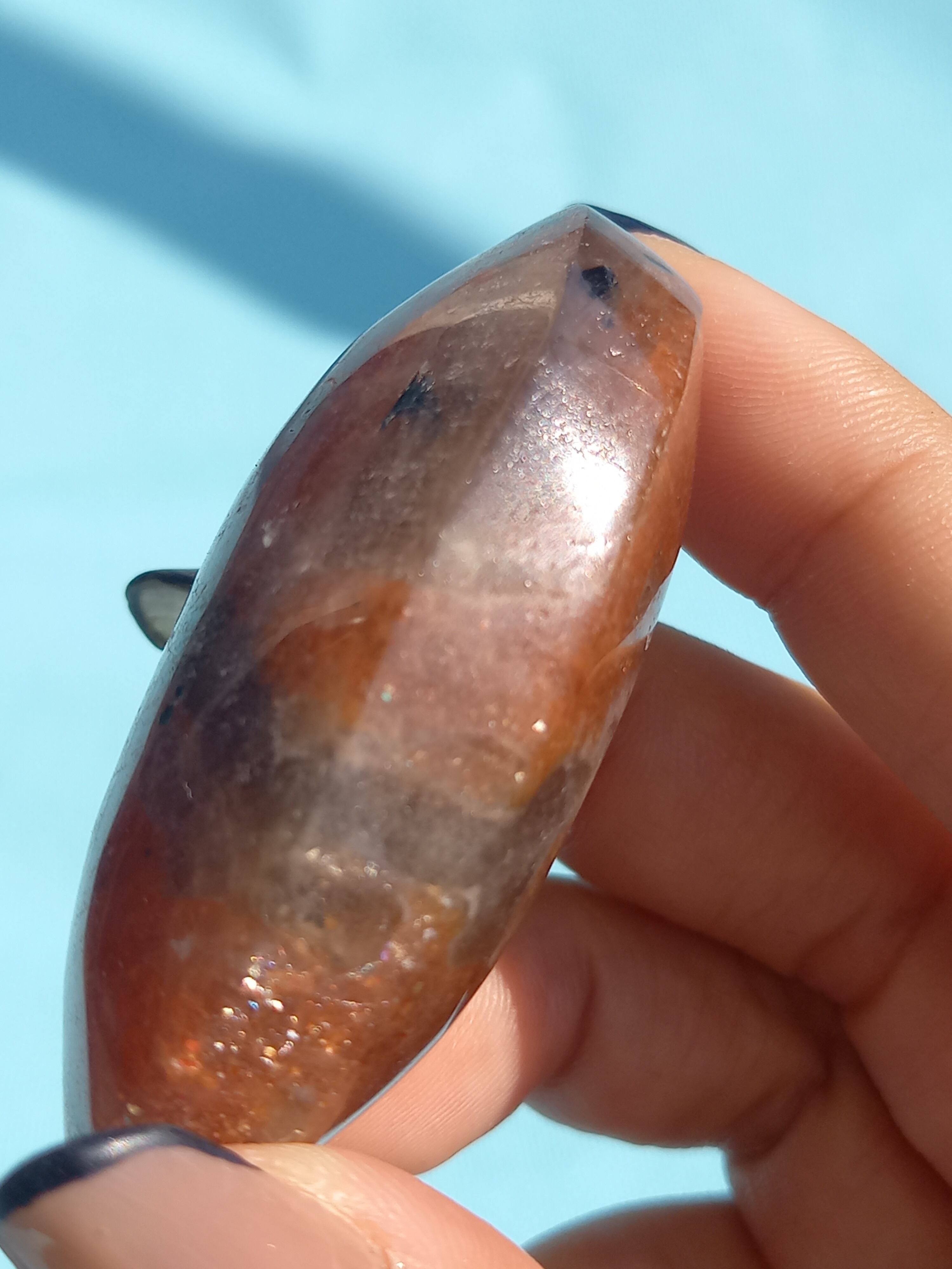 別名アクアマリンサンストーンとも呼ばれており、オレンジ、白、グリーン、ブルーなど色とりどりの色彩をもつ非常に珍しいサンストーンです。