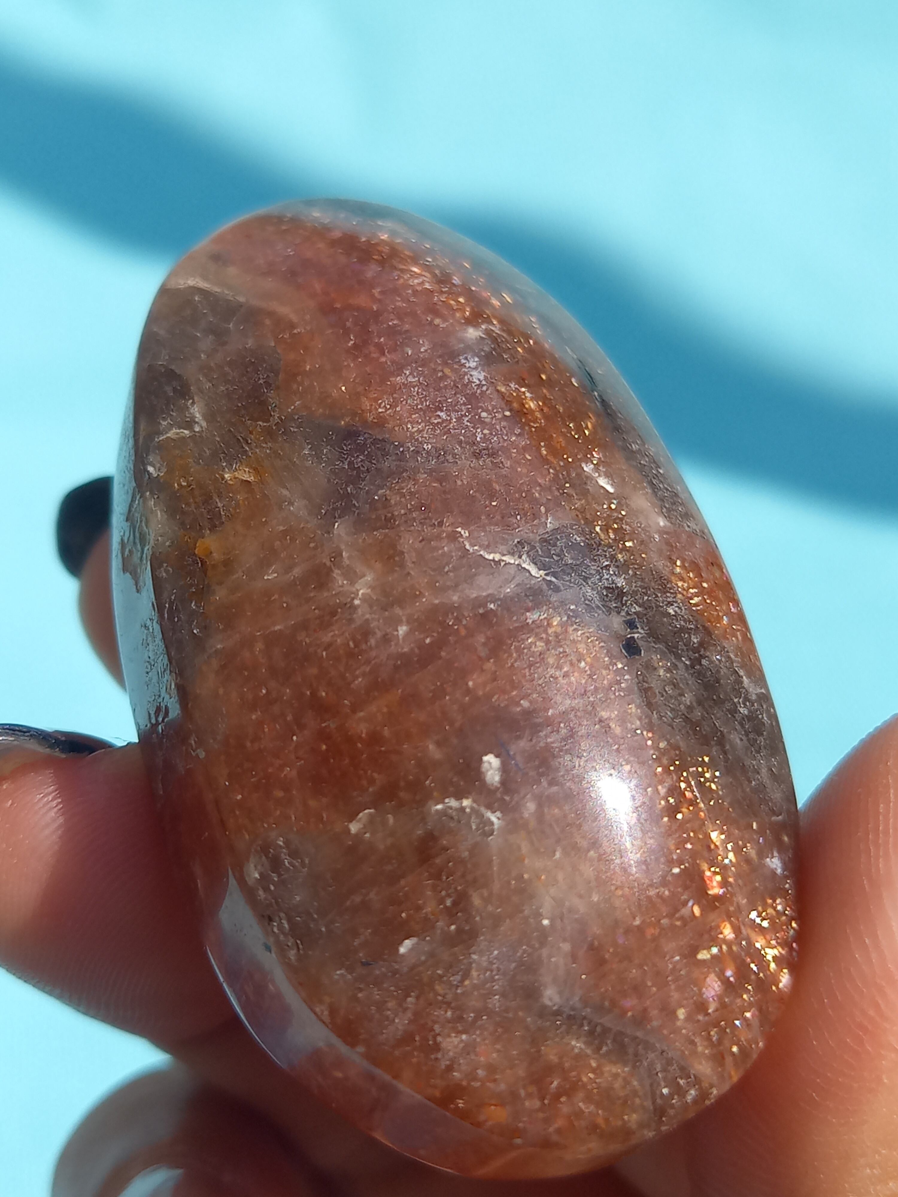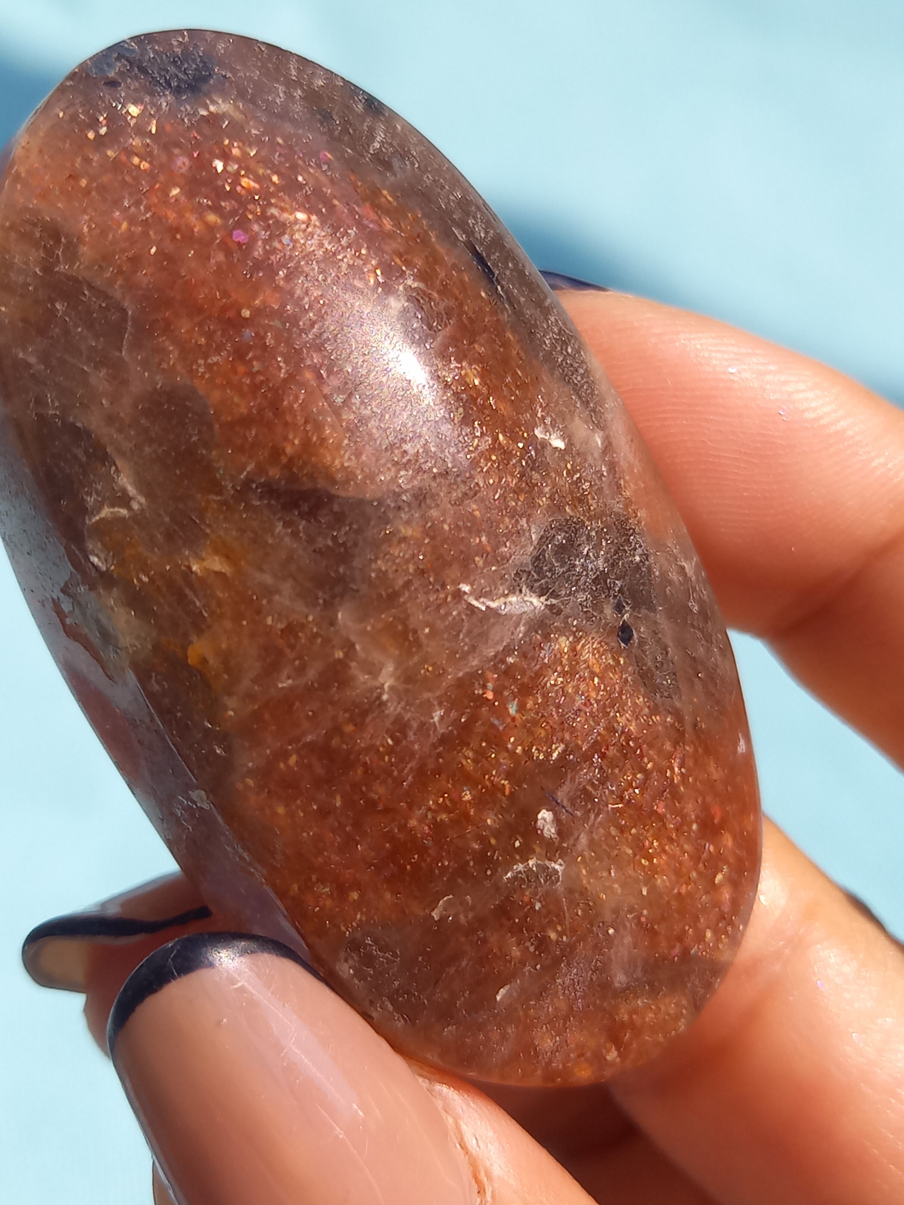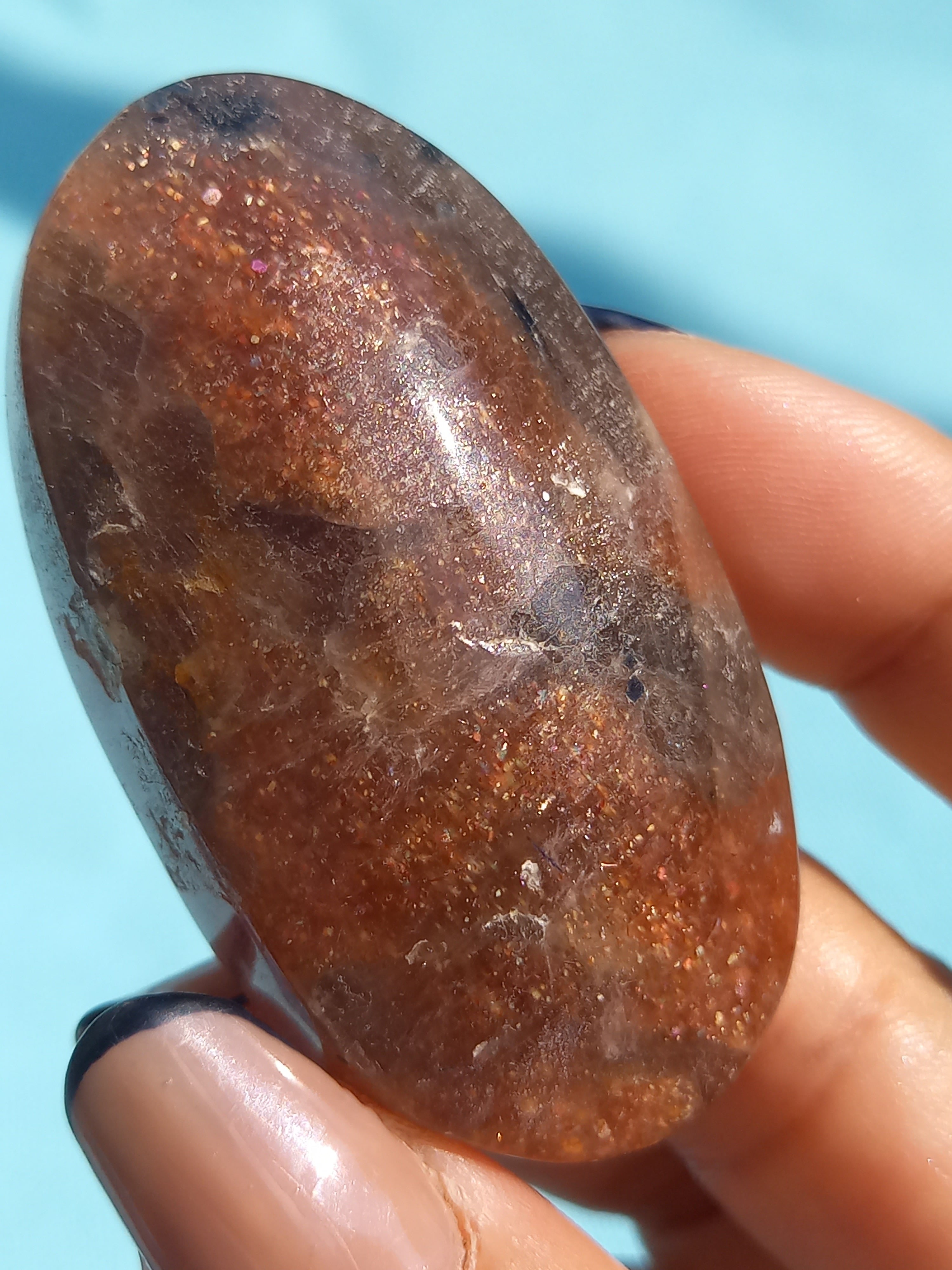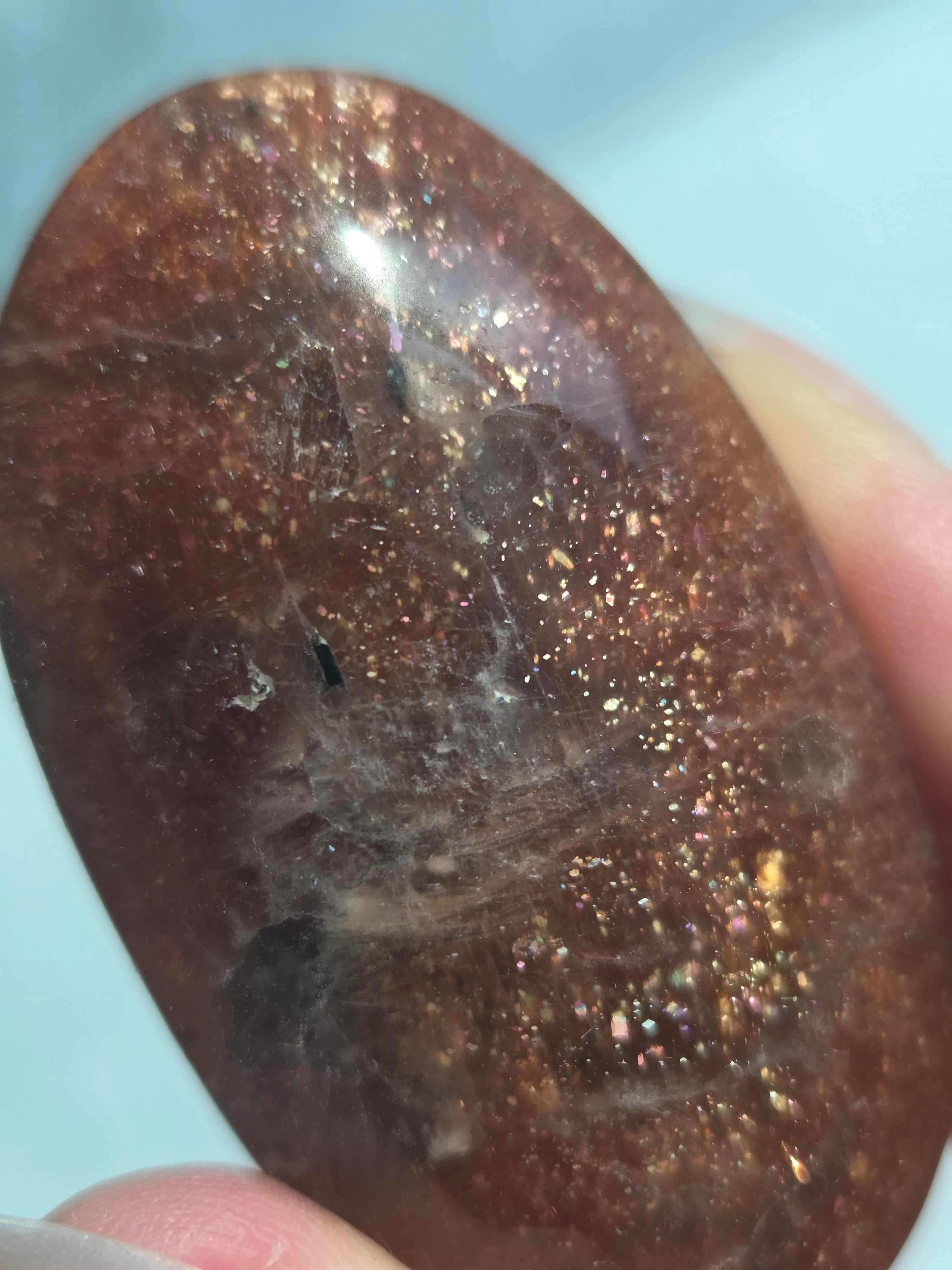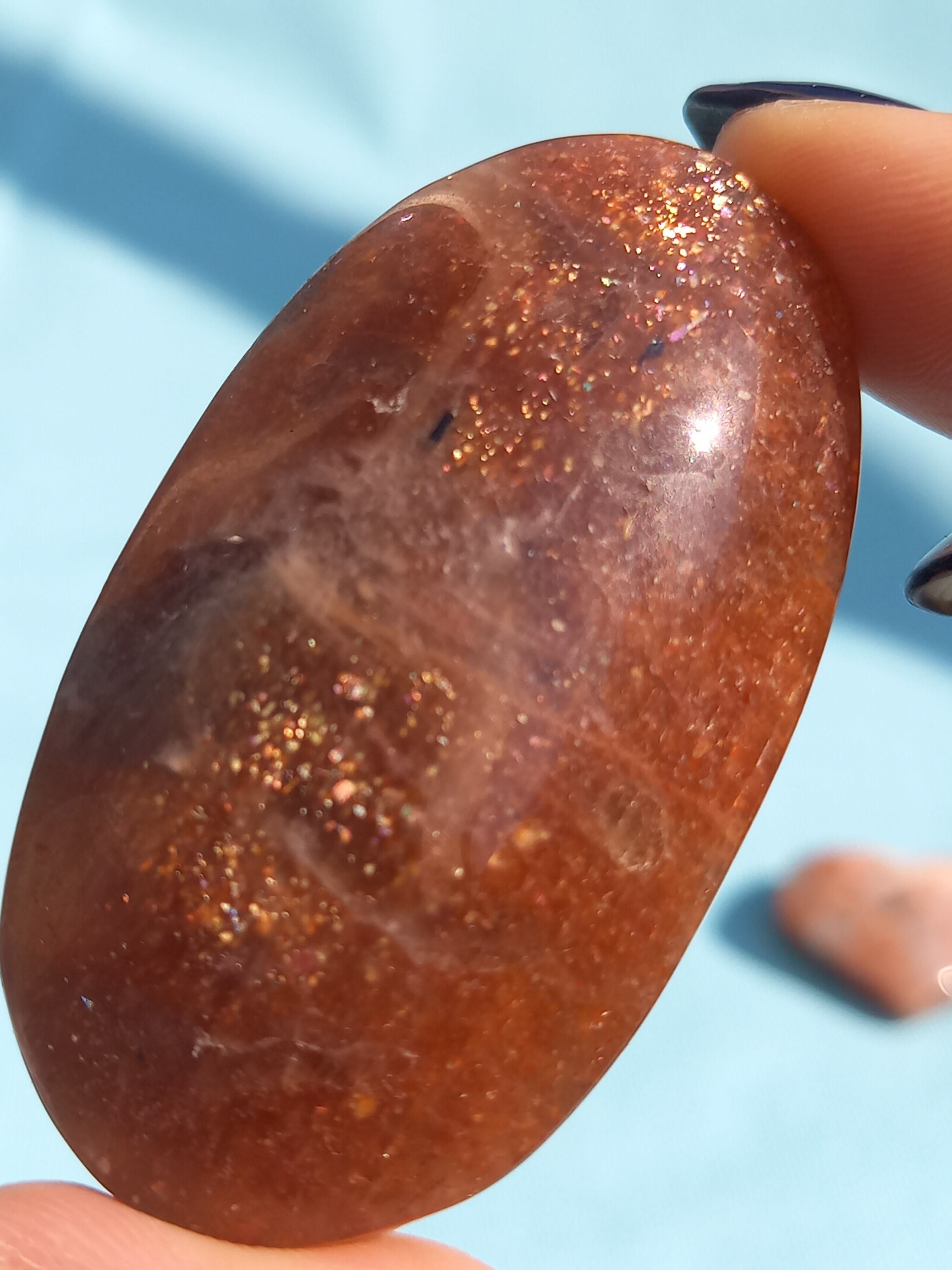 別名アクアマリンサンストーンとも呼ばれており、オレンジ、白、グリーン、ブルーなど色とりどりの色彩をもつ非常に珍しいサンストーンです。