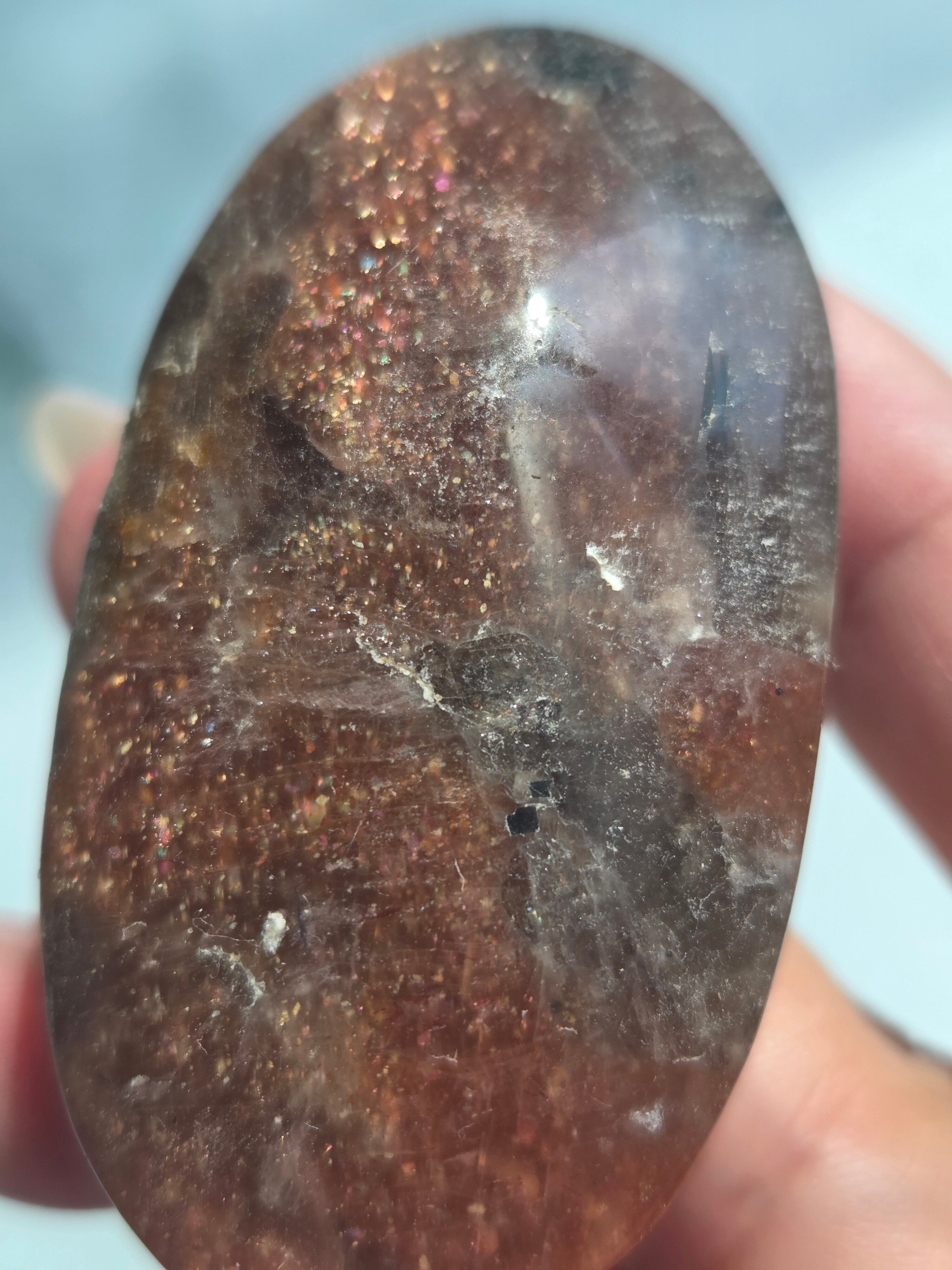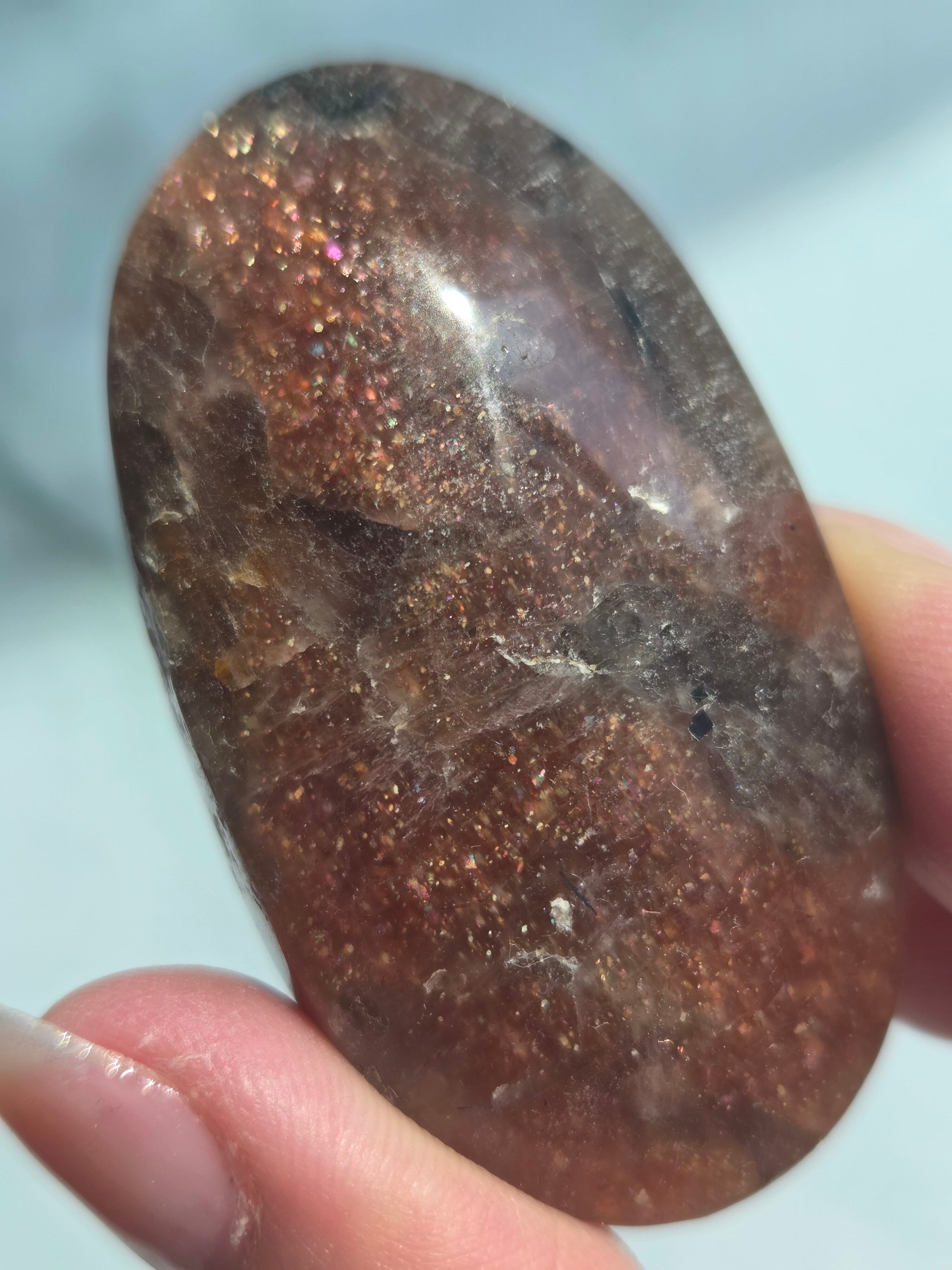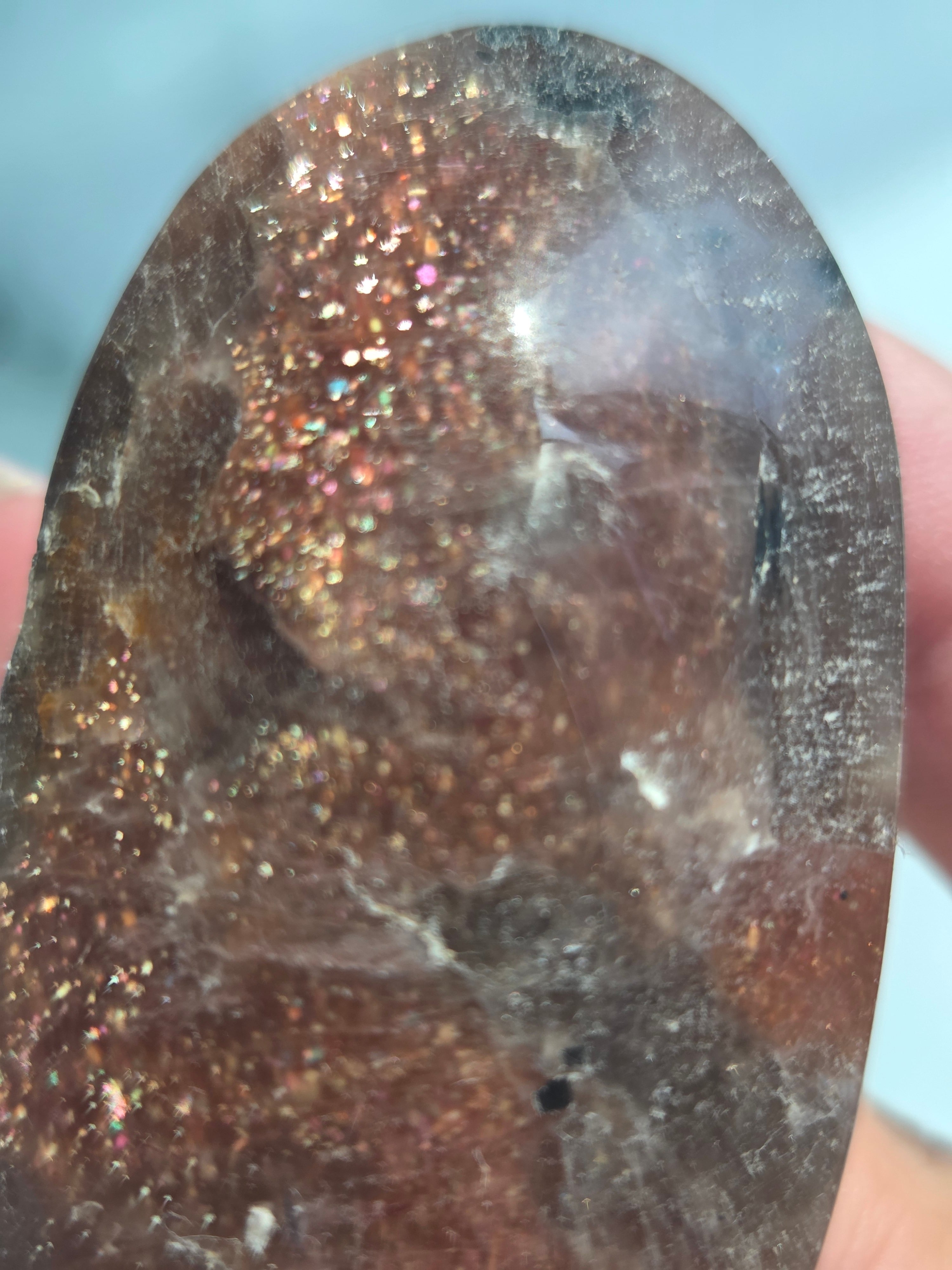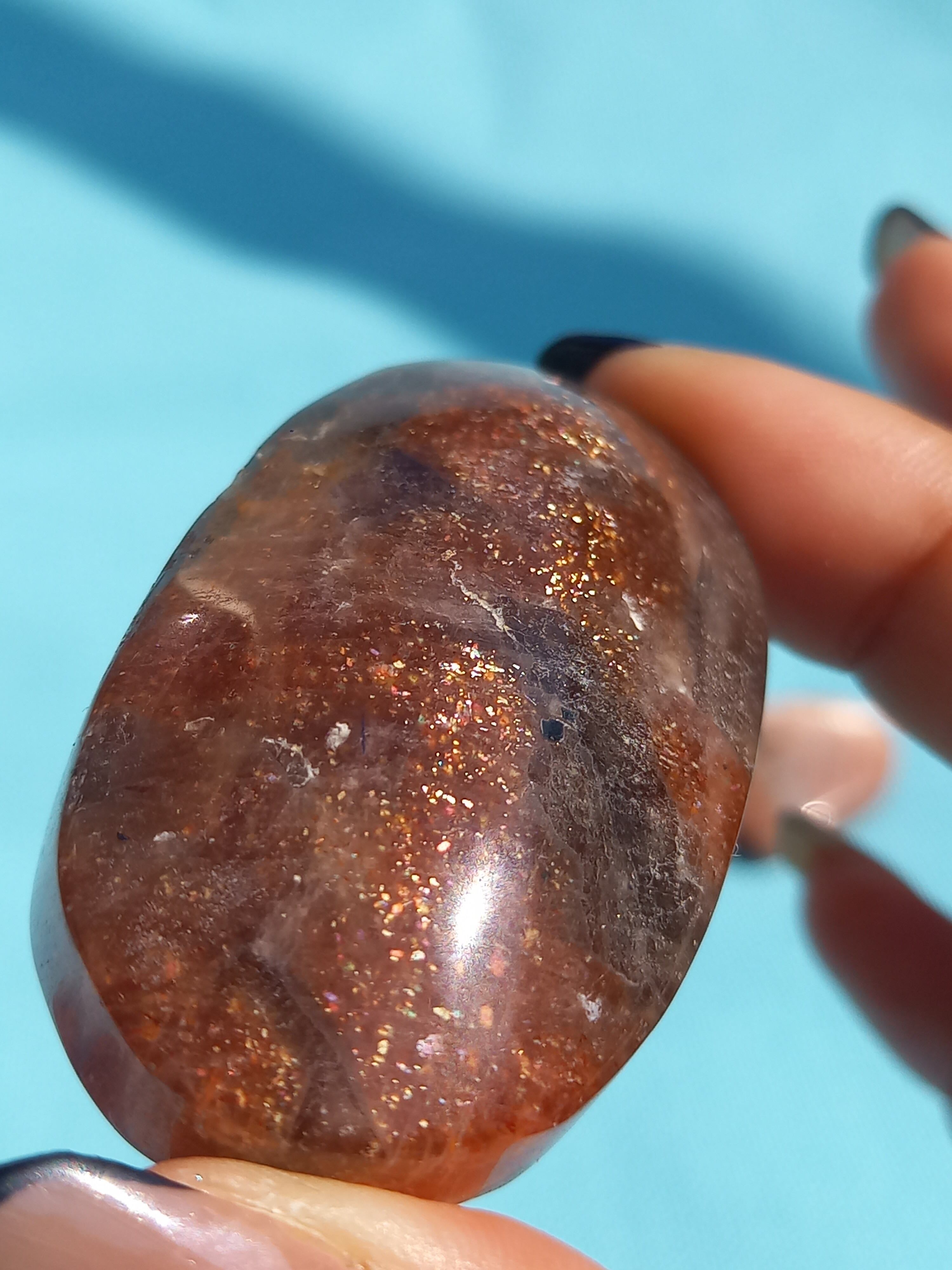 別名アクアマリンサンストーンとも呼ばれており、オレンジ、白、グリーン、ブルーなど色とりどりの色彩をもつ非常に珍しいサンストーンです。