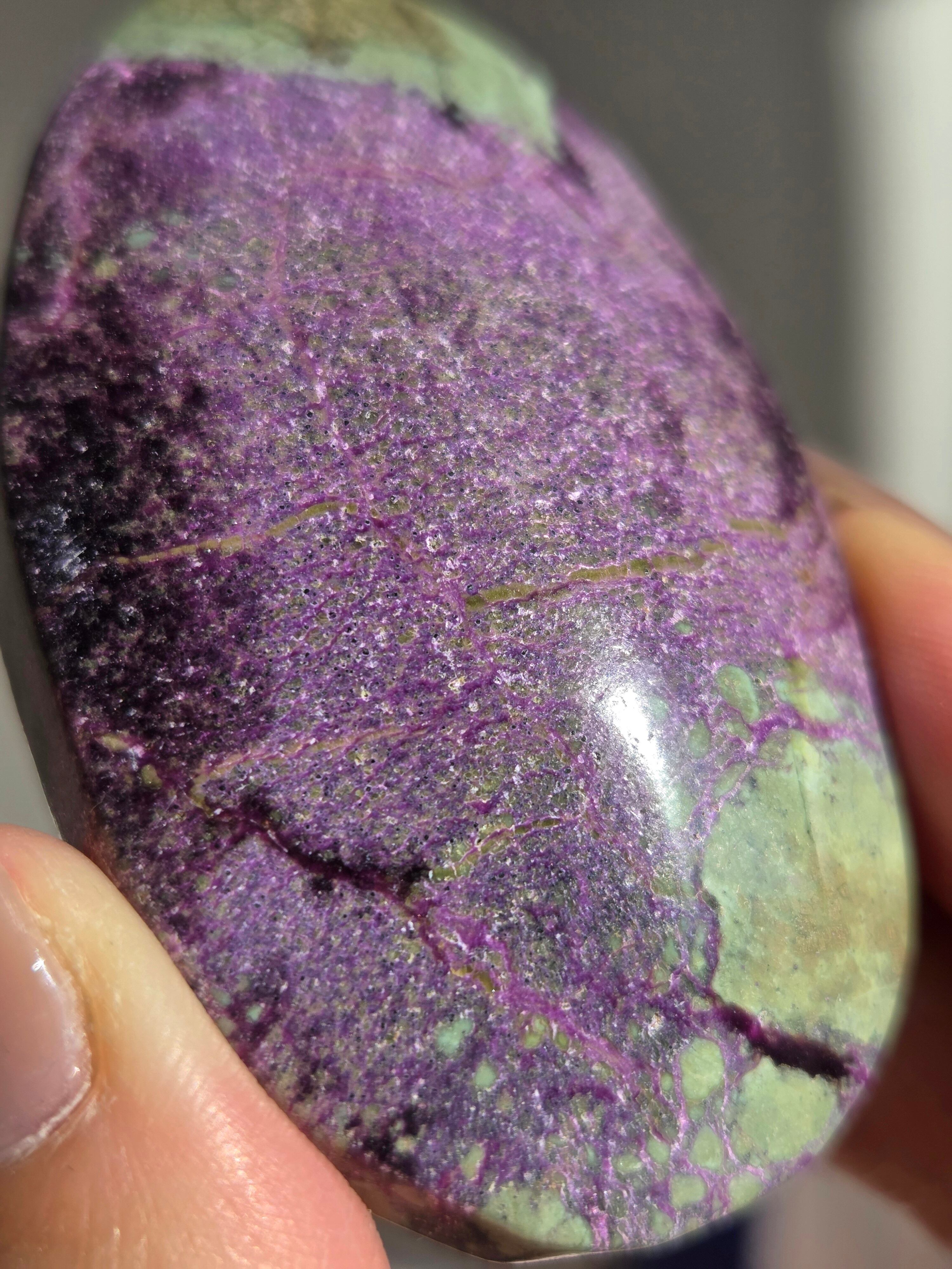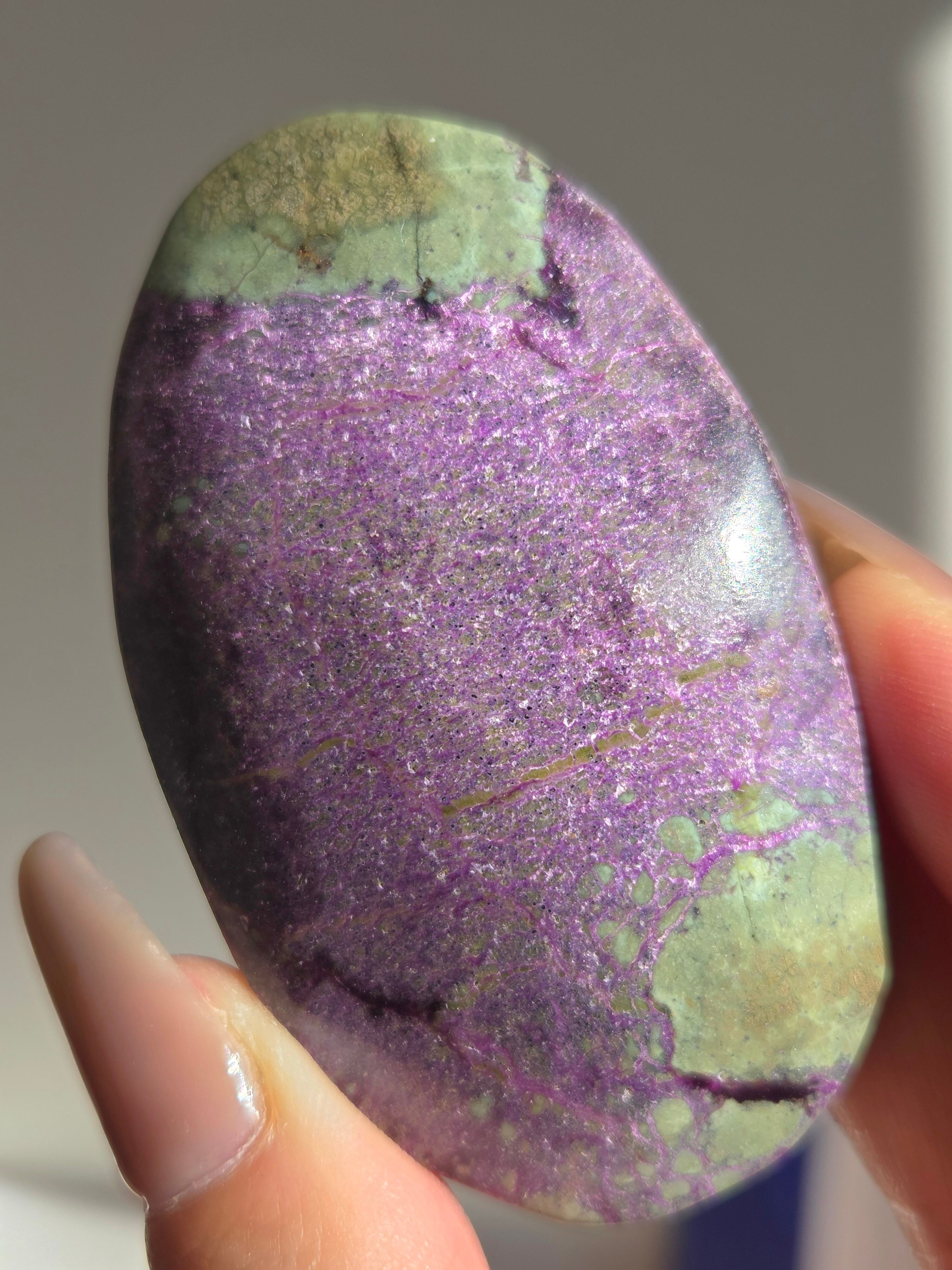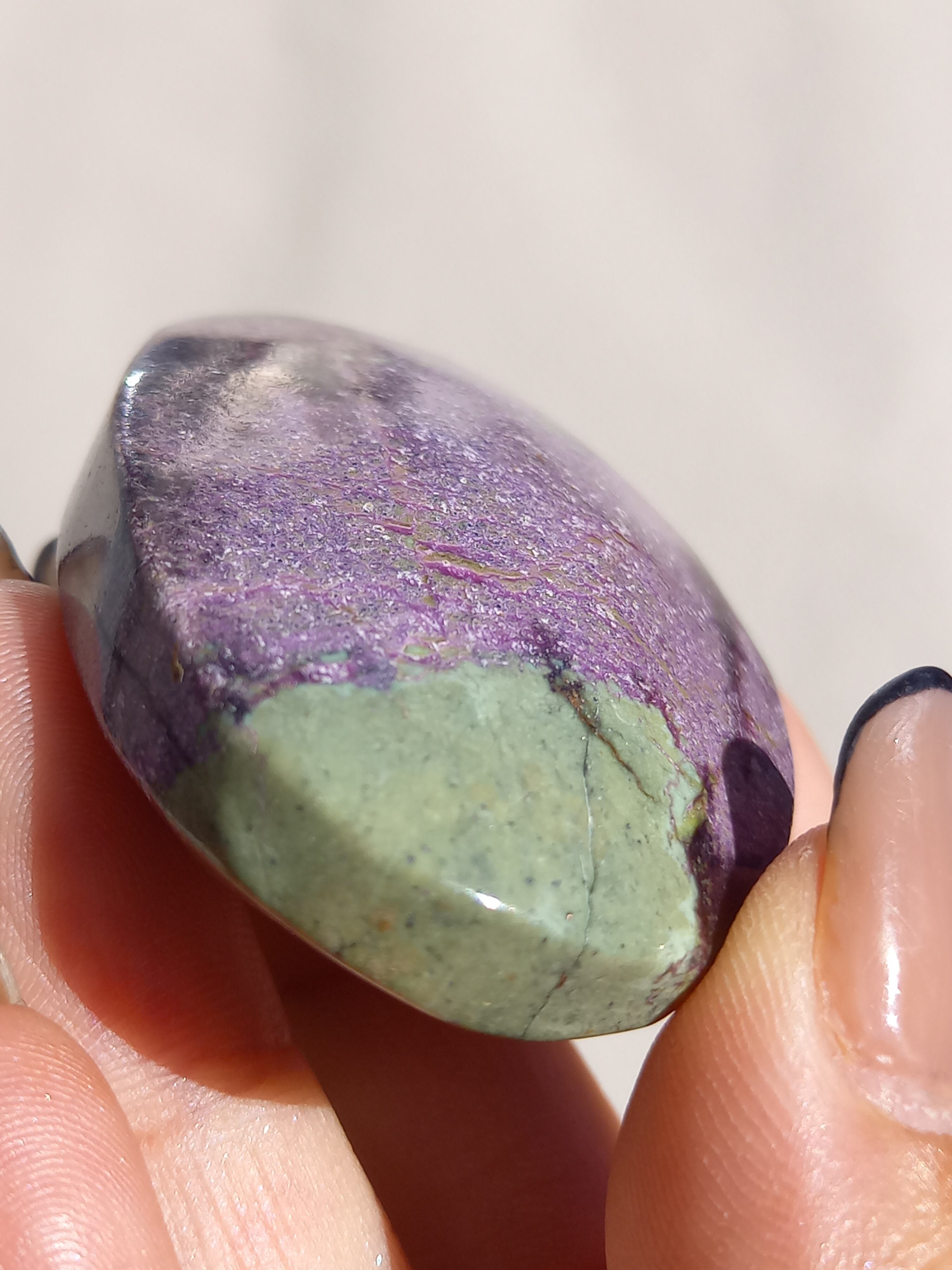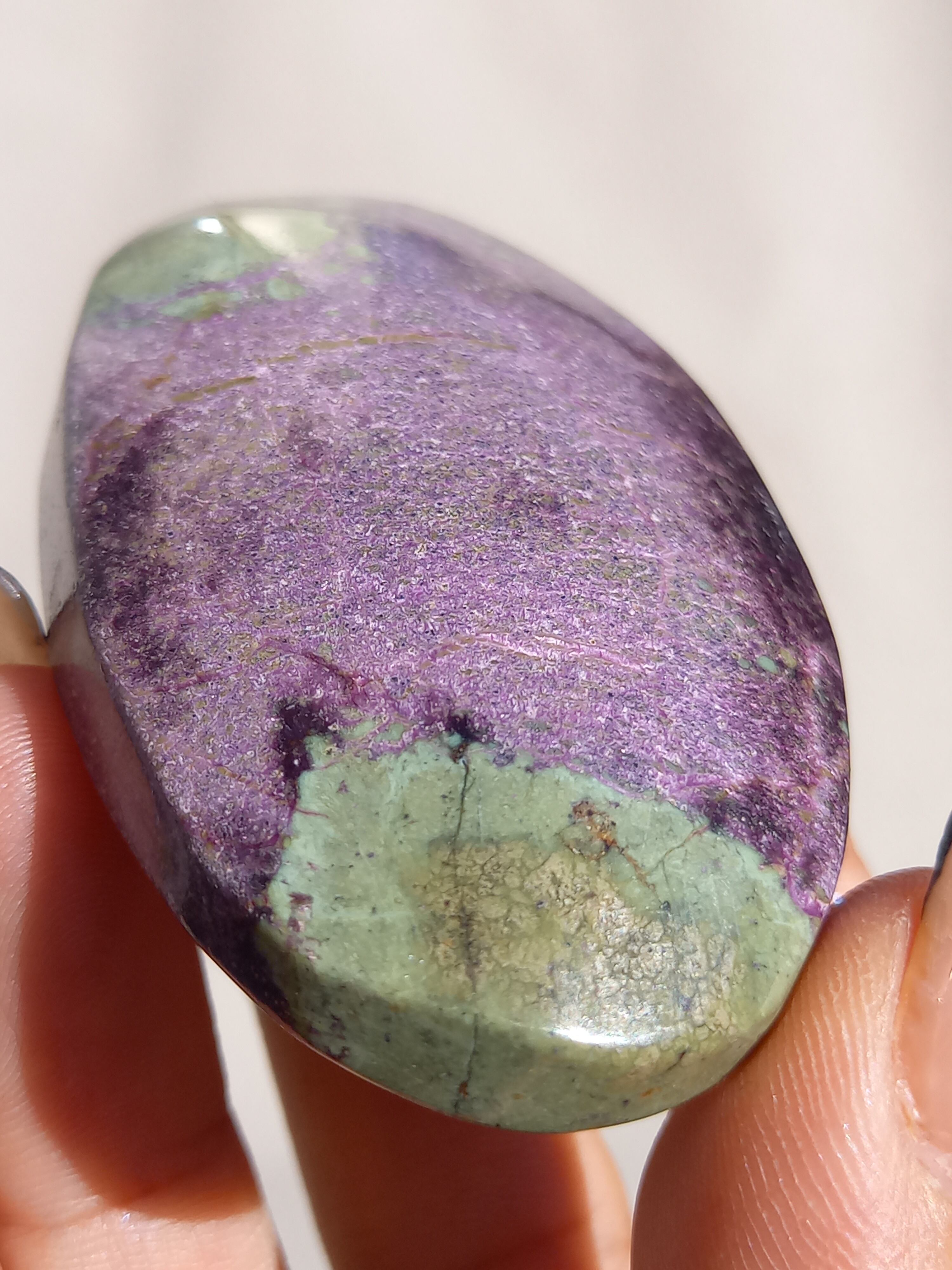 アトランティサイトは、紫色のスティヒタイトと、緑色のサーペンティンの共生鉱物で、1910年にオーストラリアのタスマニア、ダンダスで発見されました。 この産地が、かつて存在したといわれている幻の大陸「アトランティス」の一部だったという逸話から、アトランティサイトと名付けられました。