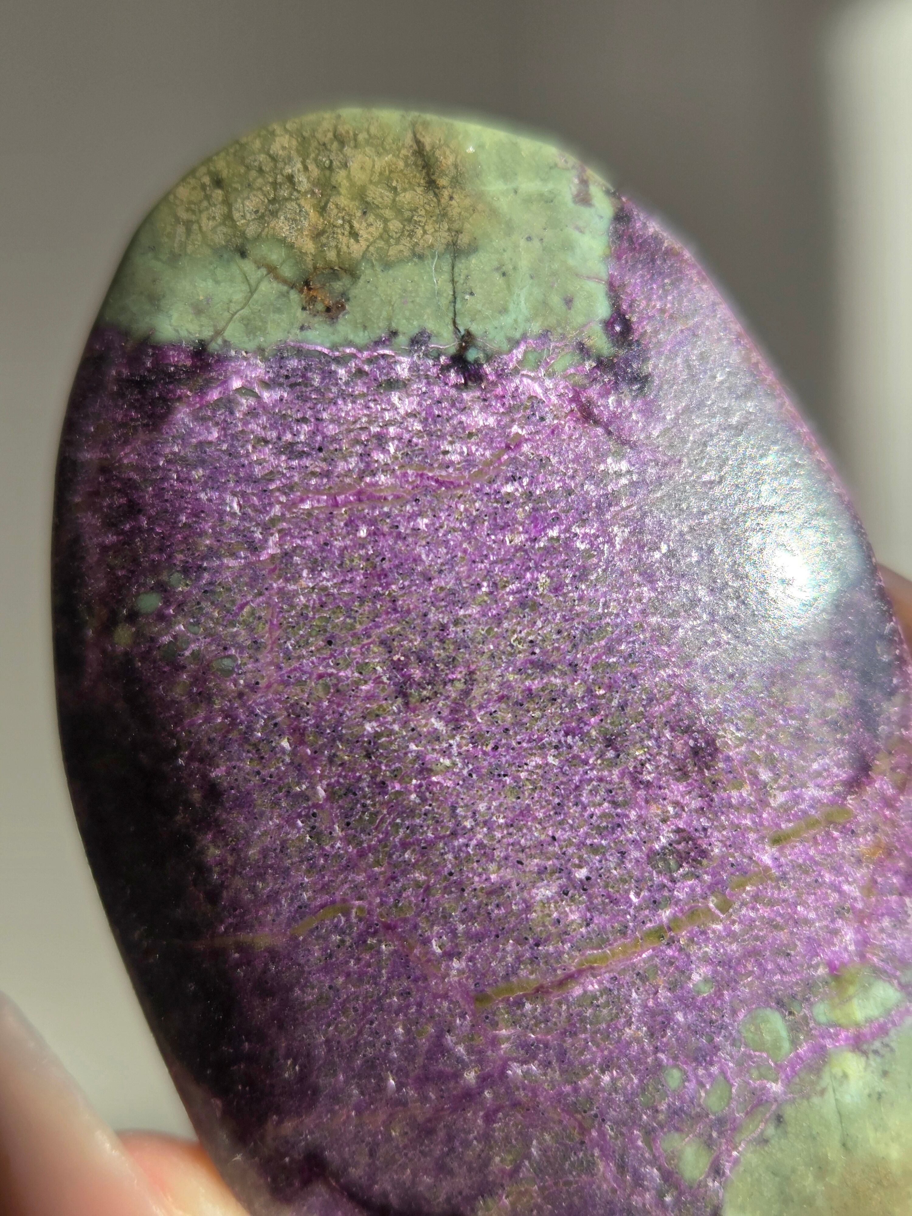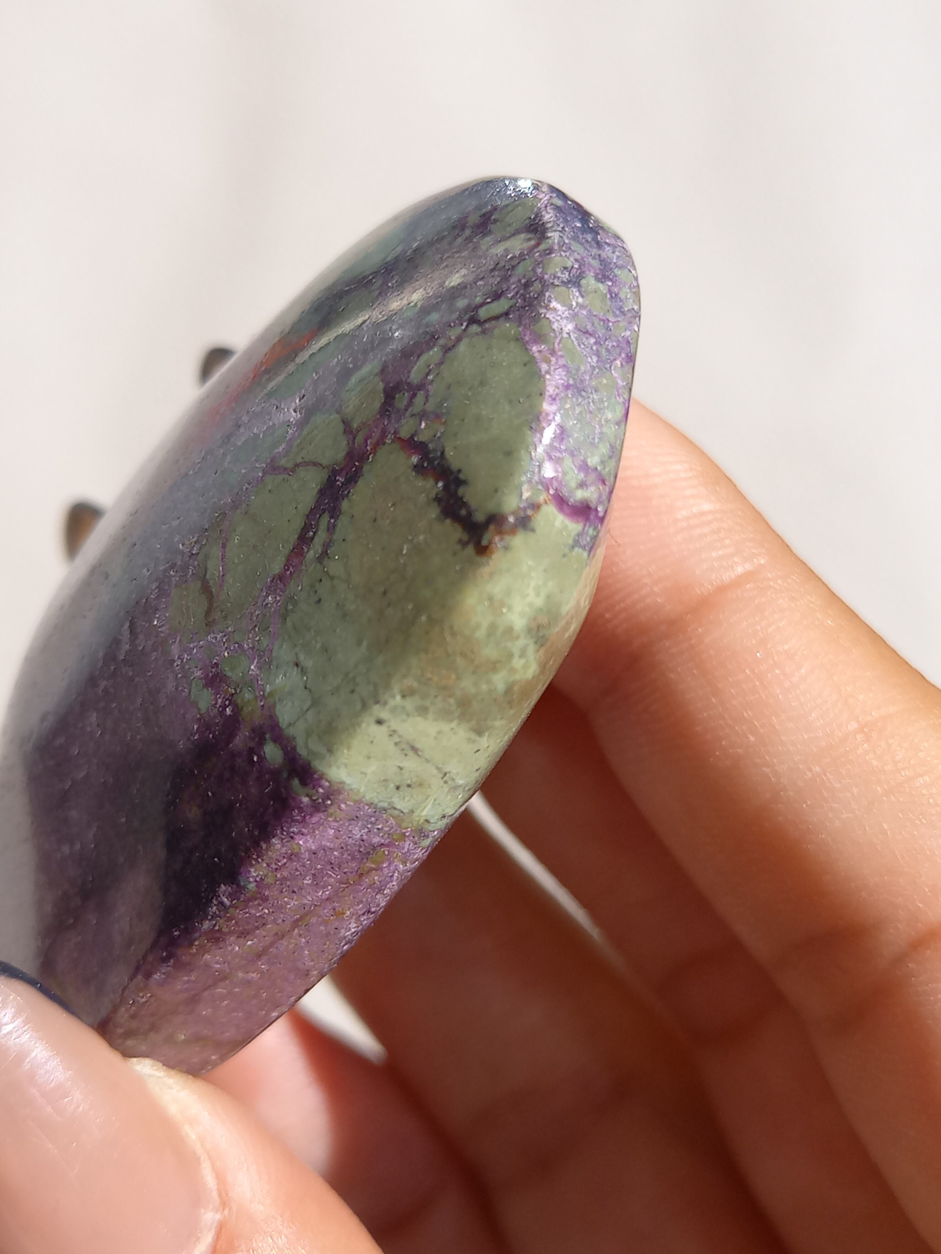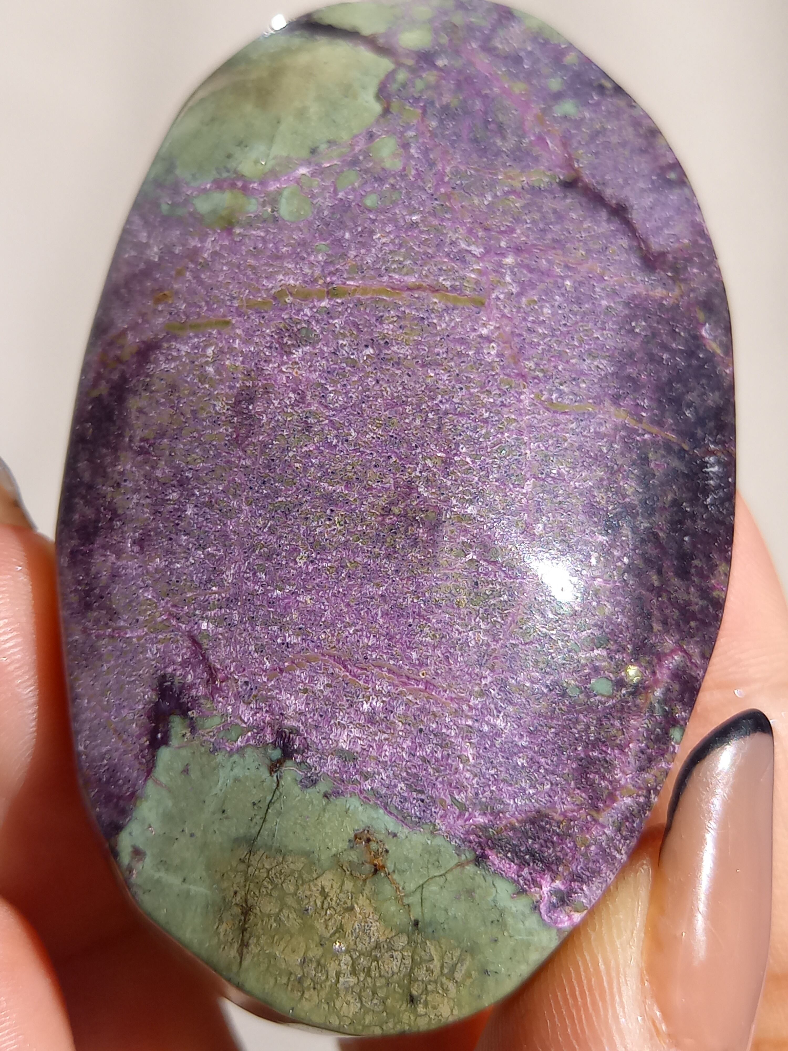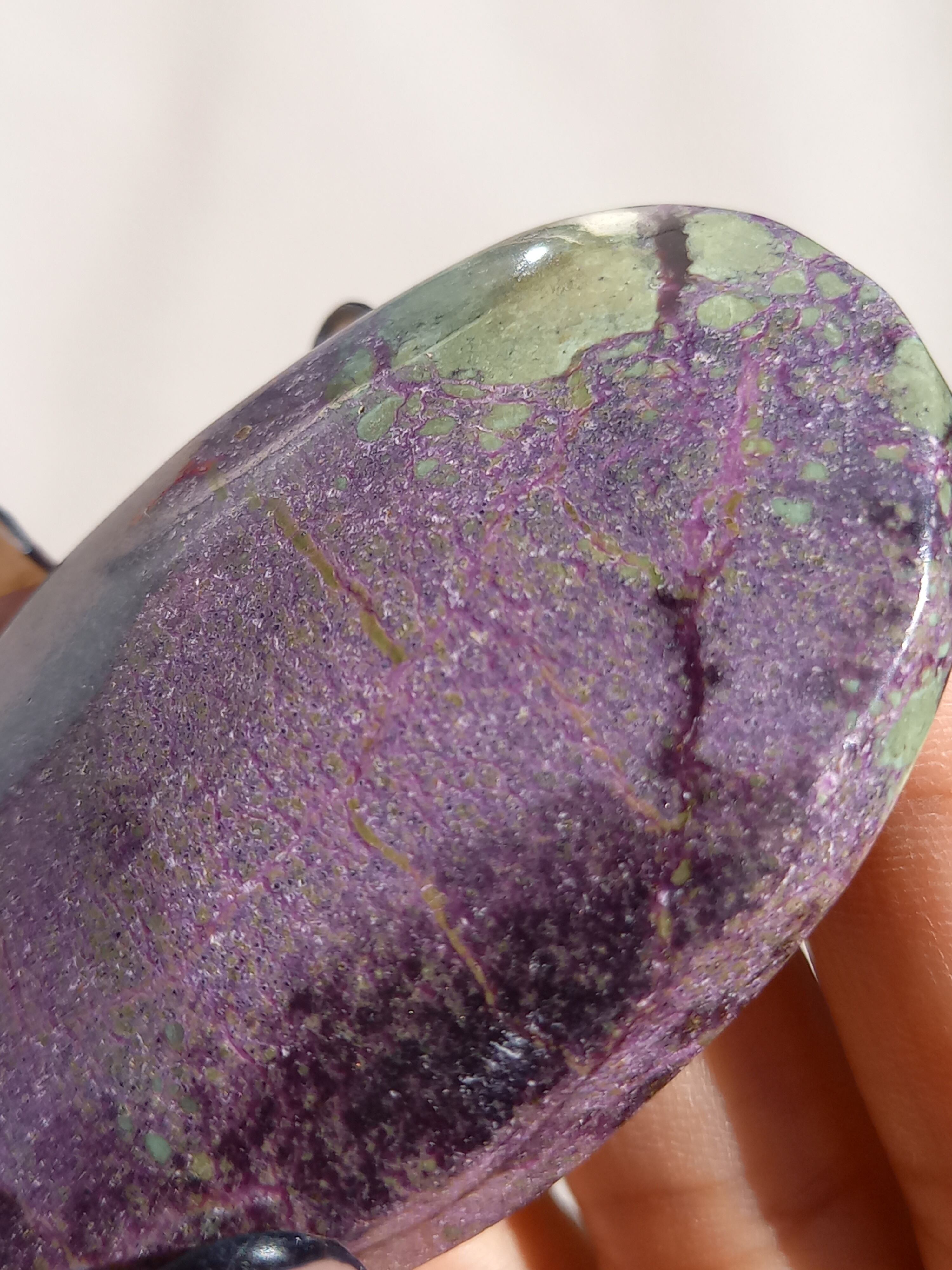 アトランティサイトは、紫色のスティヒタイトと、緑色のサーペンティンの共生鉱物で、1910年にオーストラリアのタスマニア、ダンダスで発見されました。 この産地が、かつて存在したといわれている幻の大陸「アトランティス」の一部だったという逸話から、アトランティサイトと名付けられました。