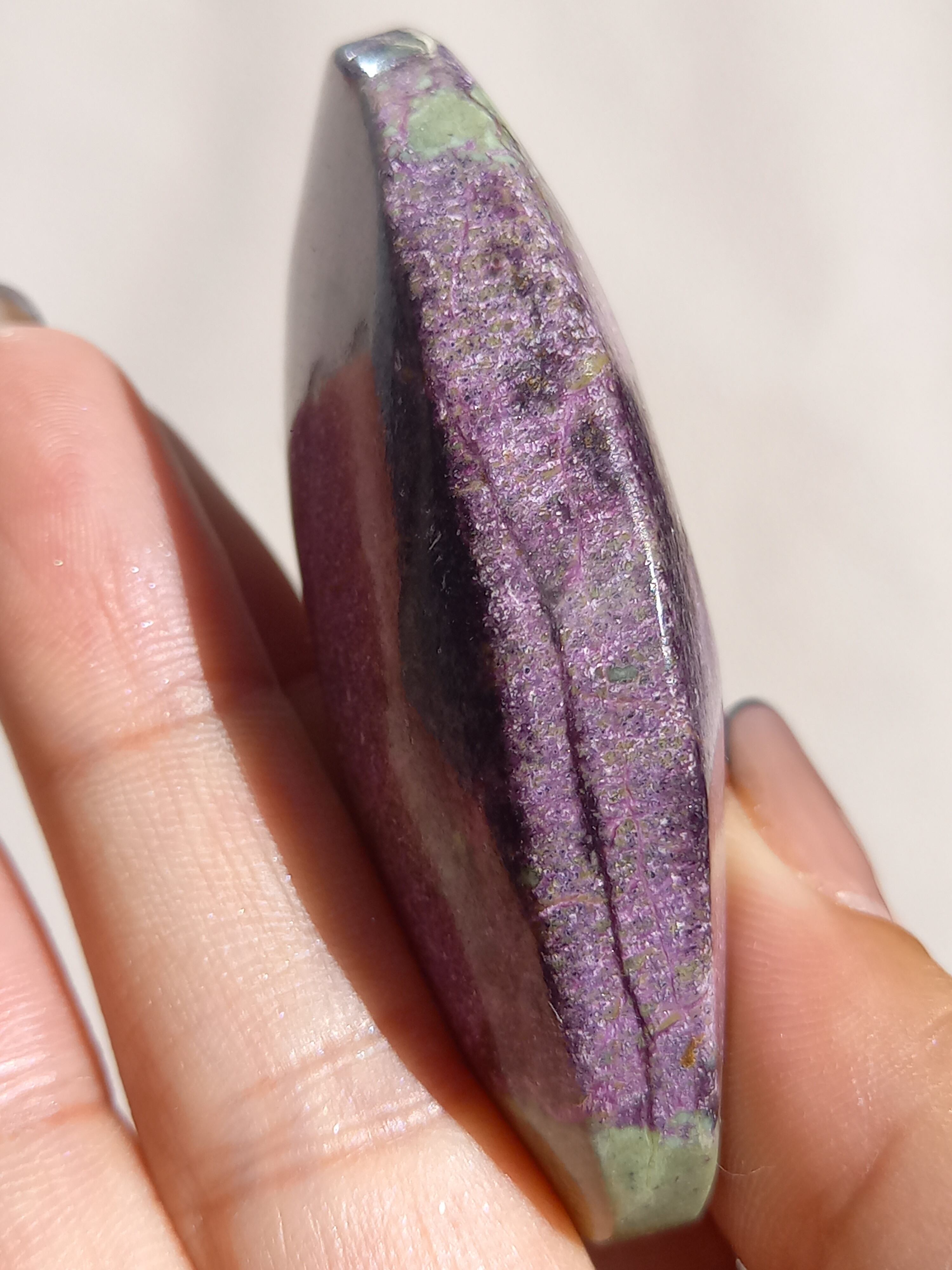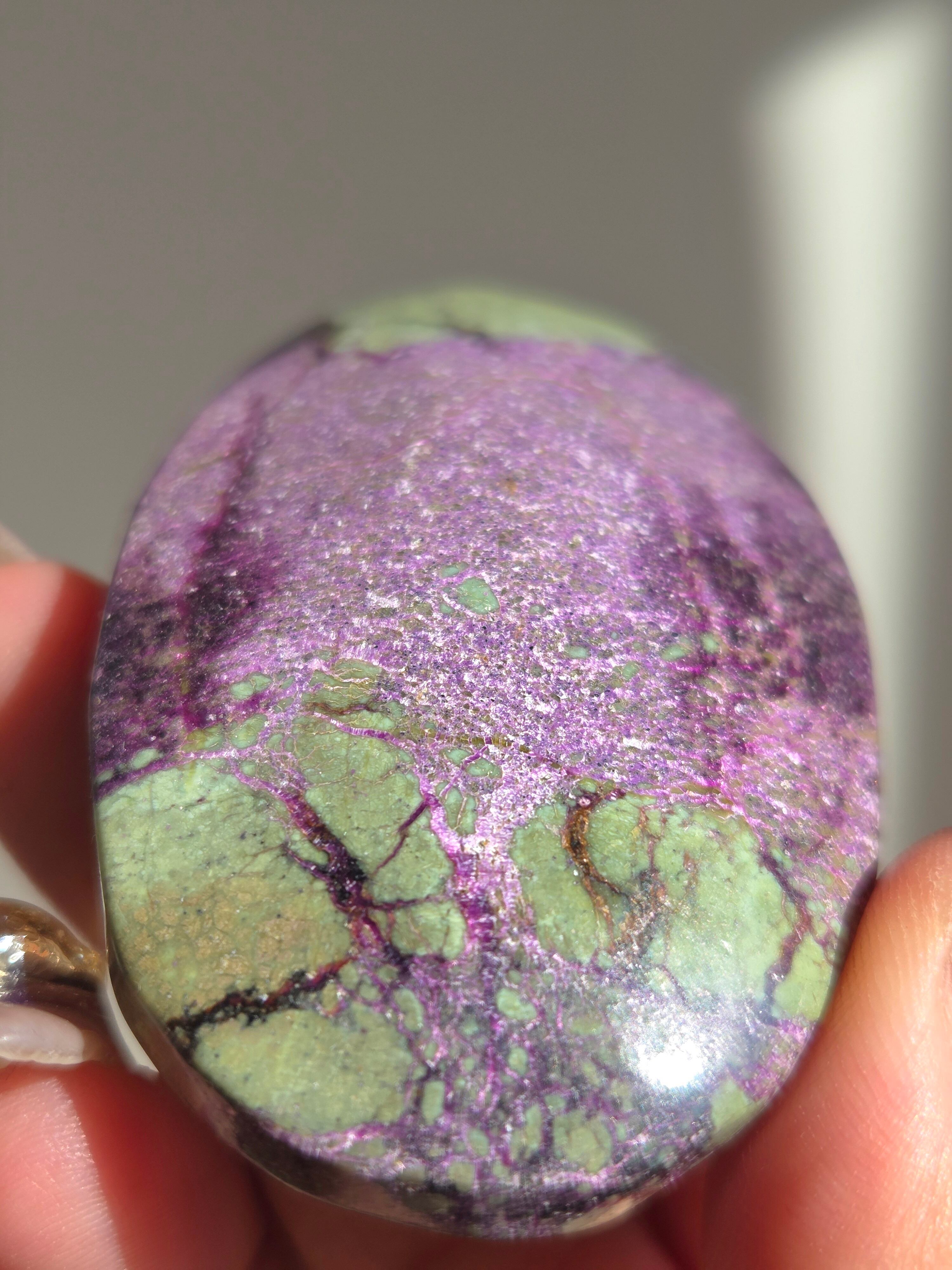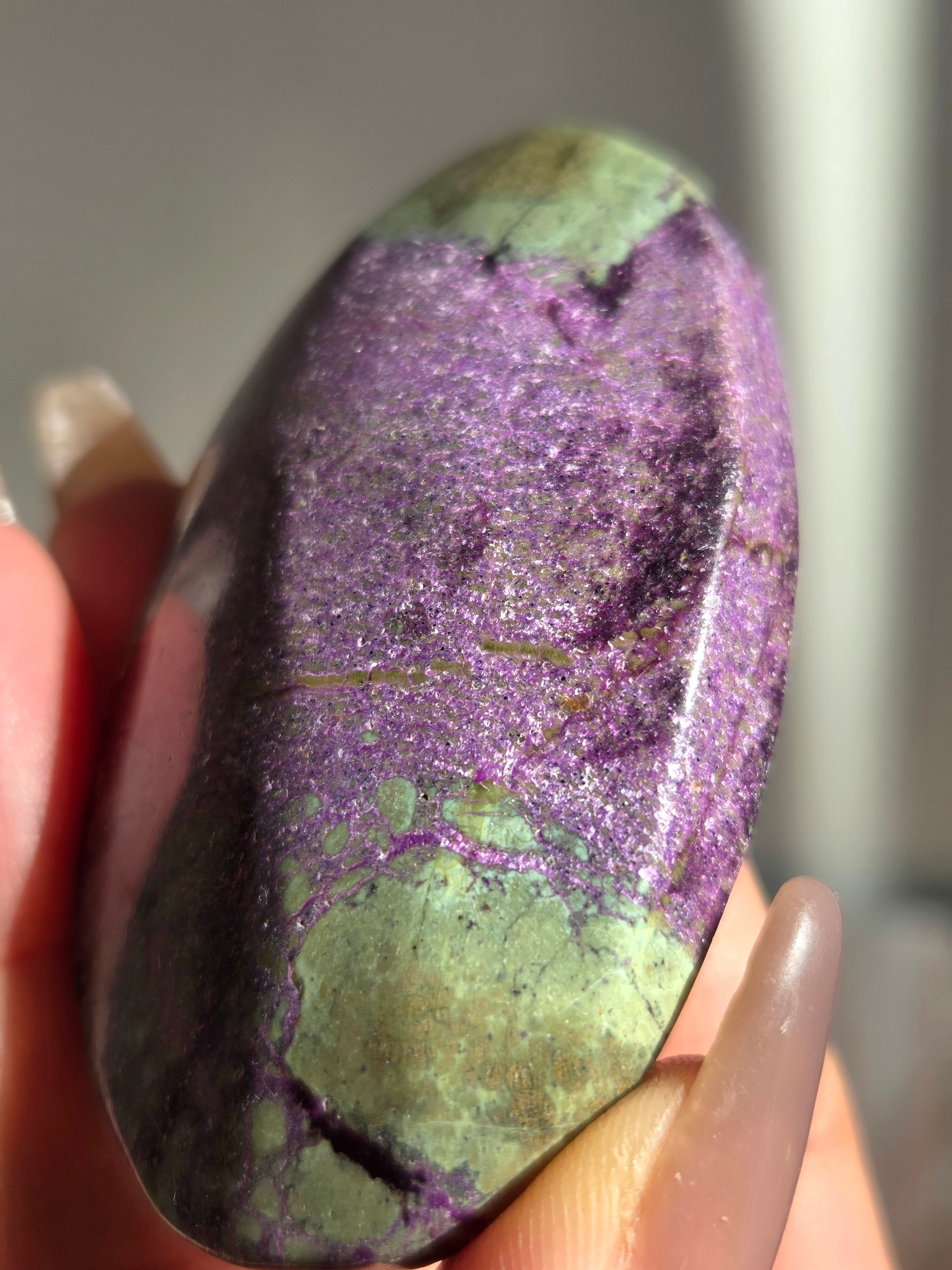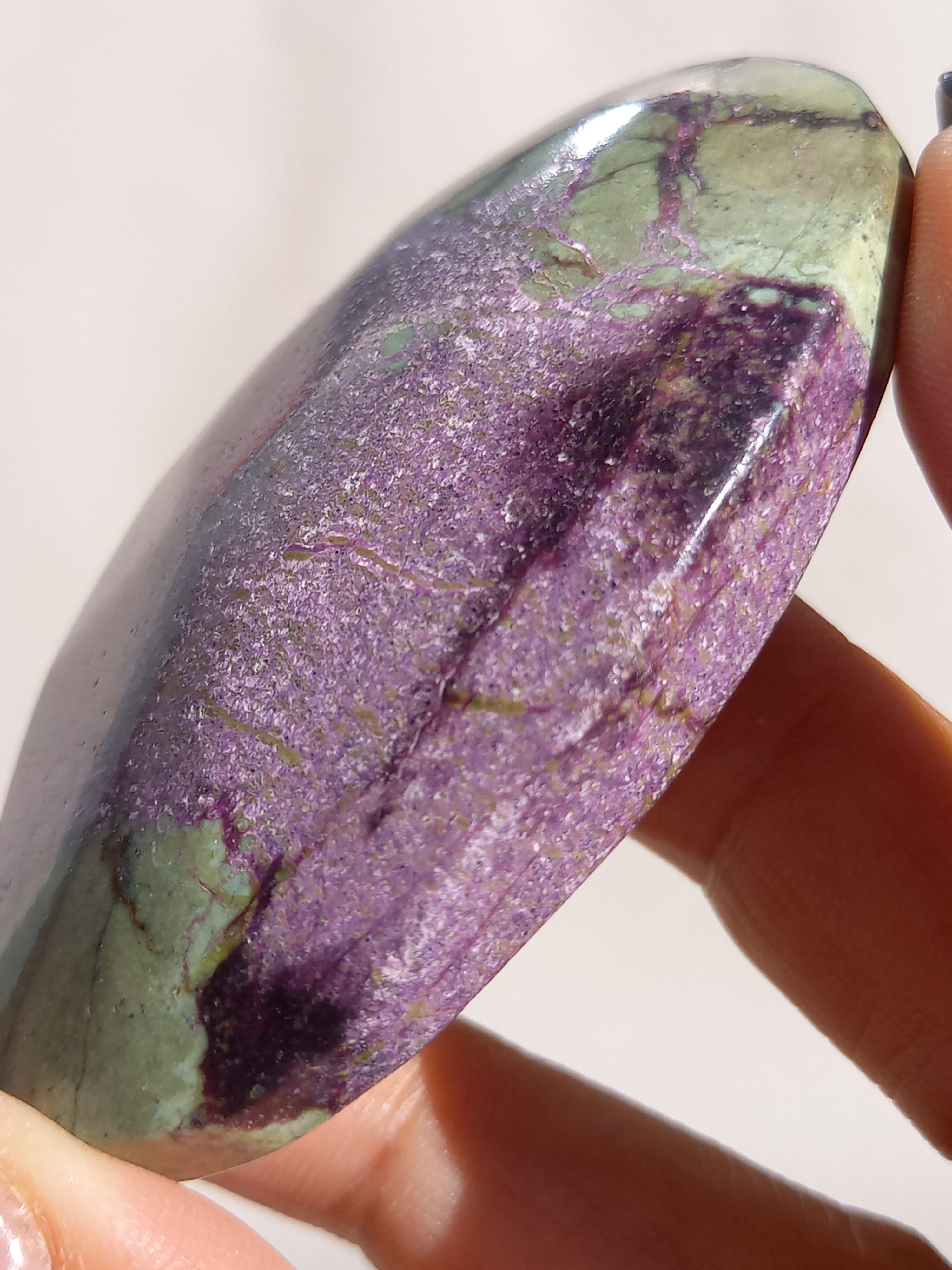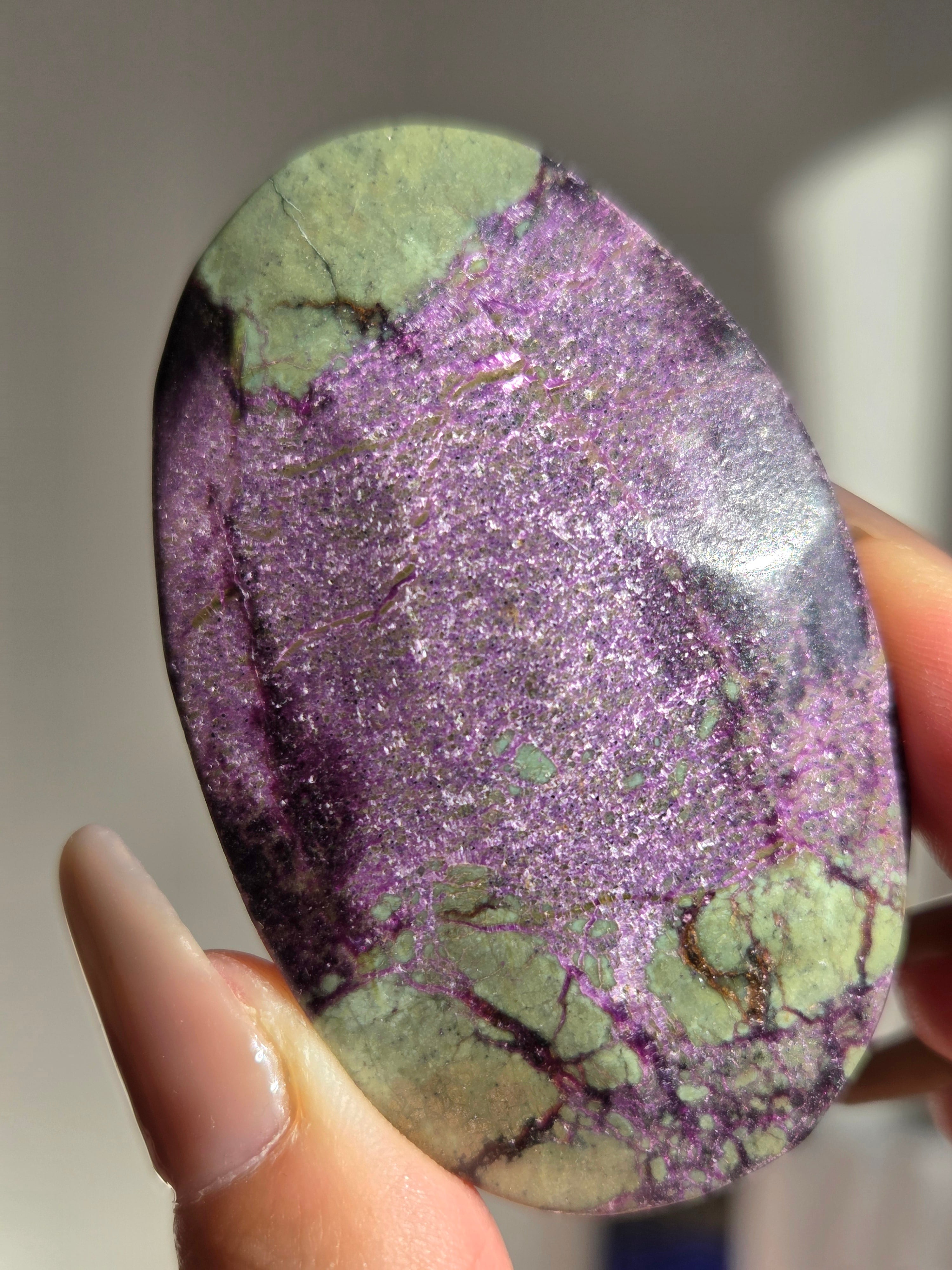 アトランティサイトは、紫色のスティヒタイトと、緑色のサーペンティンの共生鉱物で、1910年にオーストラリアのタスマニア、ダンダスで発見されました。 この産地が、かつて存在したといわれている幻の大陸「アトランティス」の一部だったという逸話から、アトランティサイトと名付けられました。