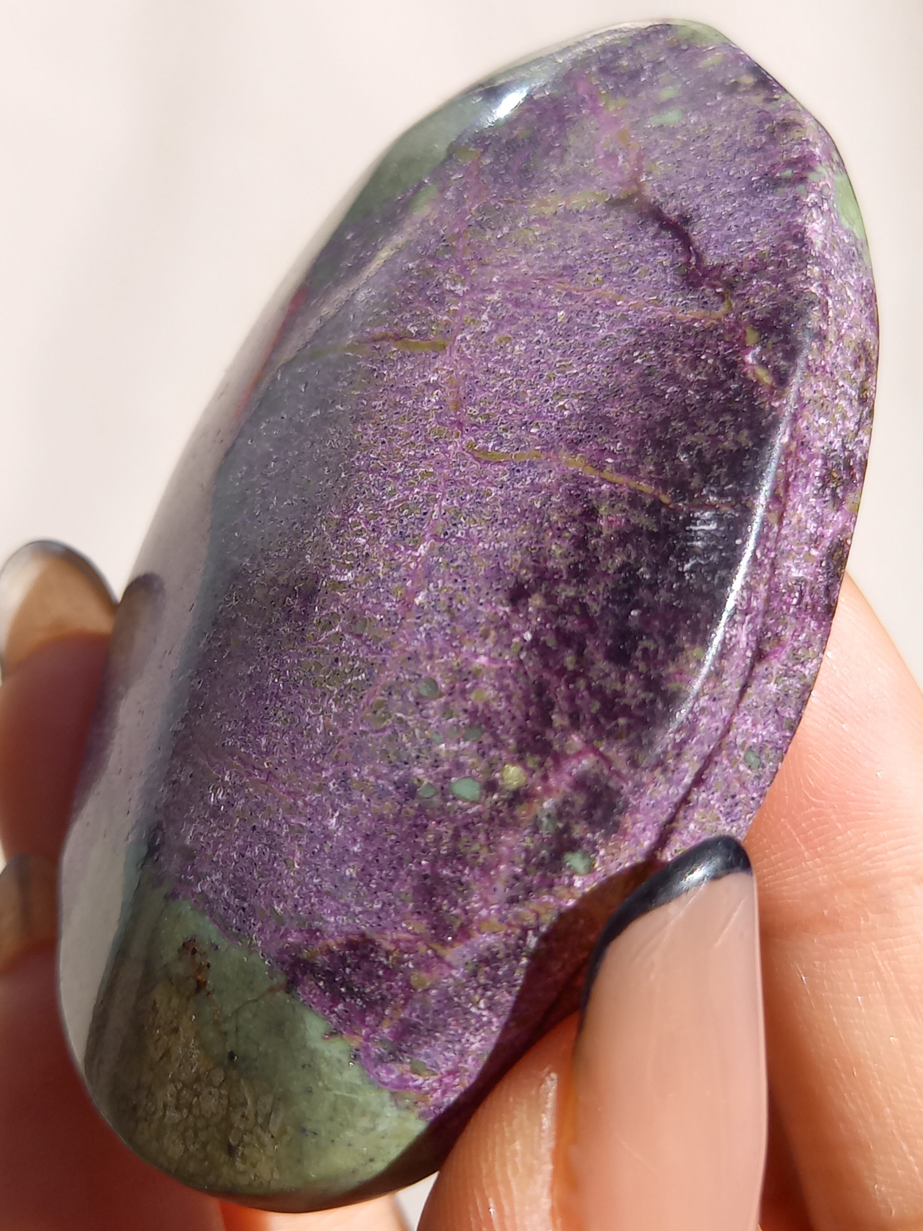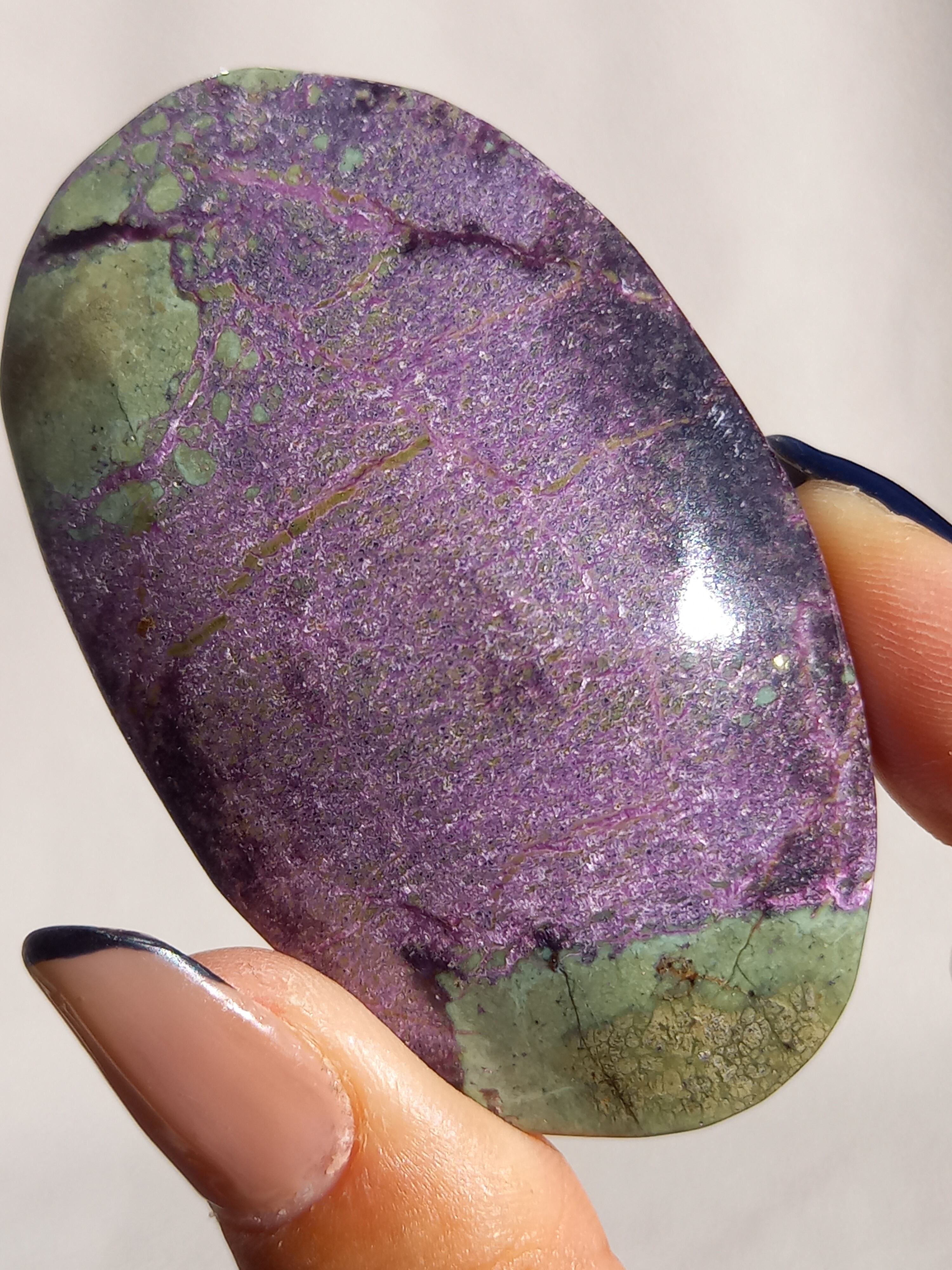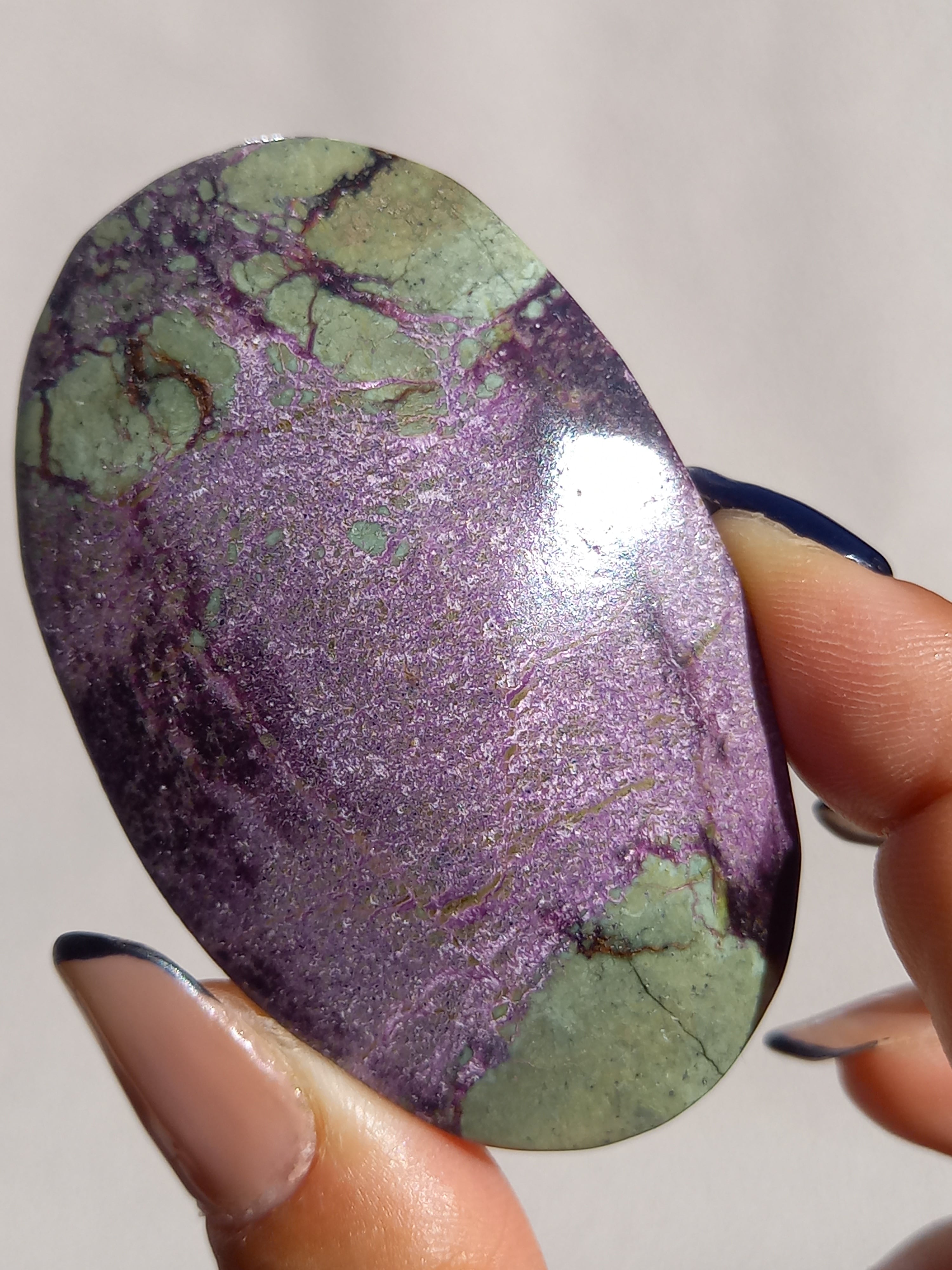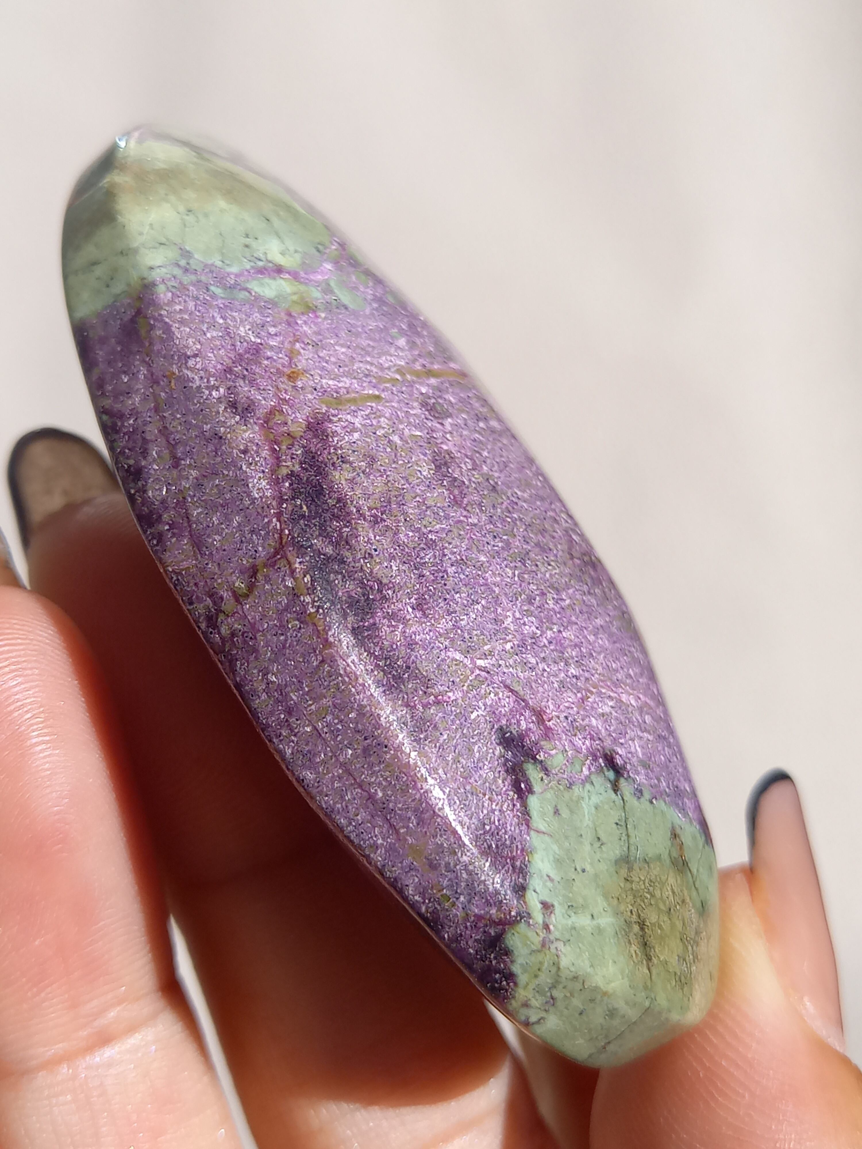 アトランティサイトは、紫色のスティヒタイトと、緑色のサーペンティンの共生鉱物で、1910年にオーストラリアのタスマニア、ダンダスで発見されました。 この産地が、かつて存在したといわれている幻の大陸「アトランティス」の一部だったという逸話から、アトランティサイトと名付けられました。