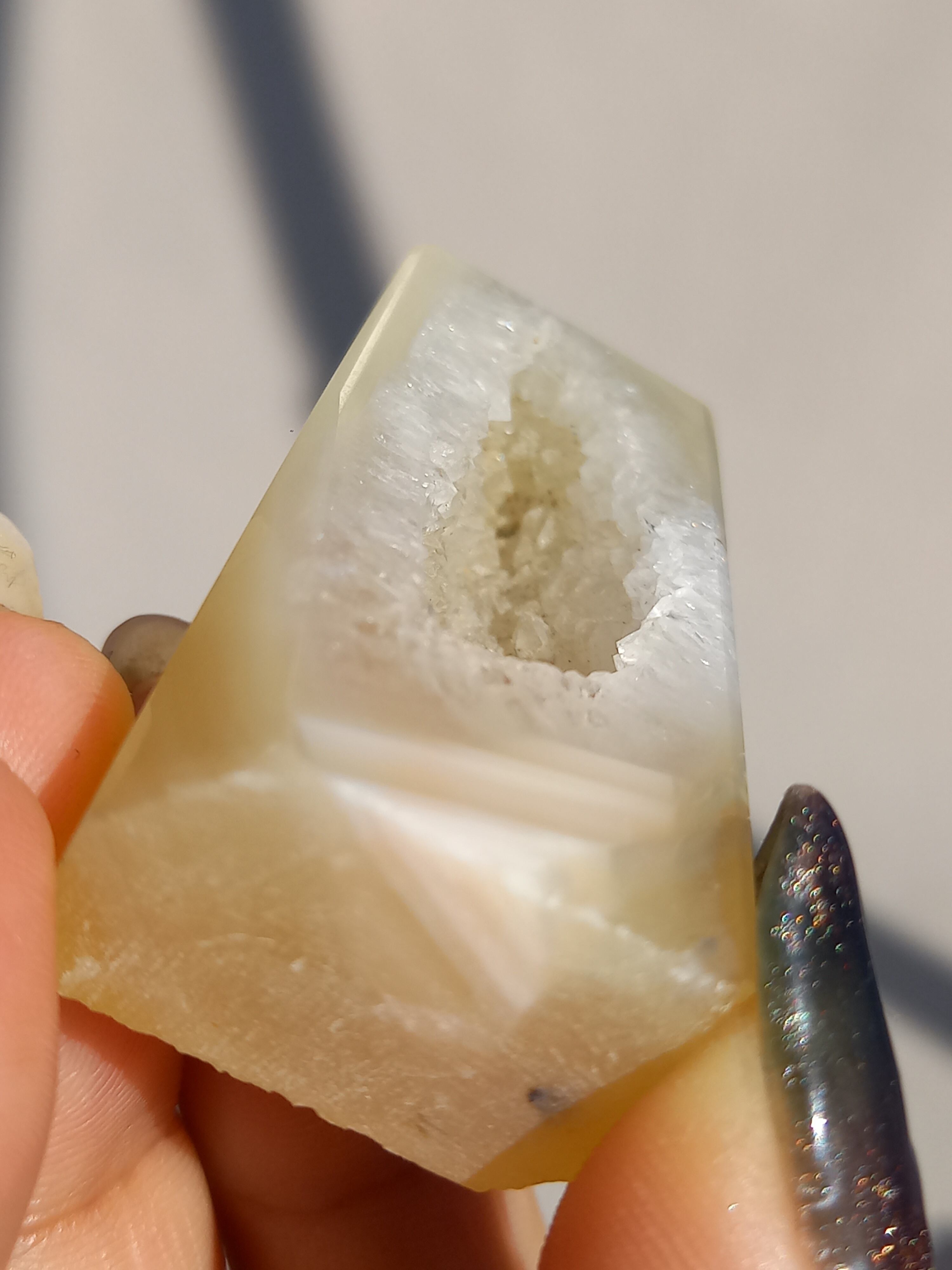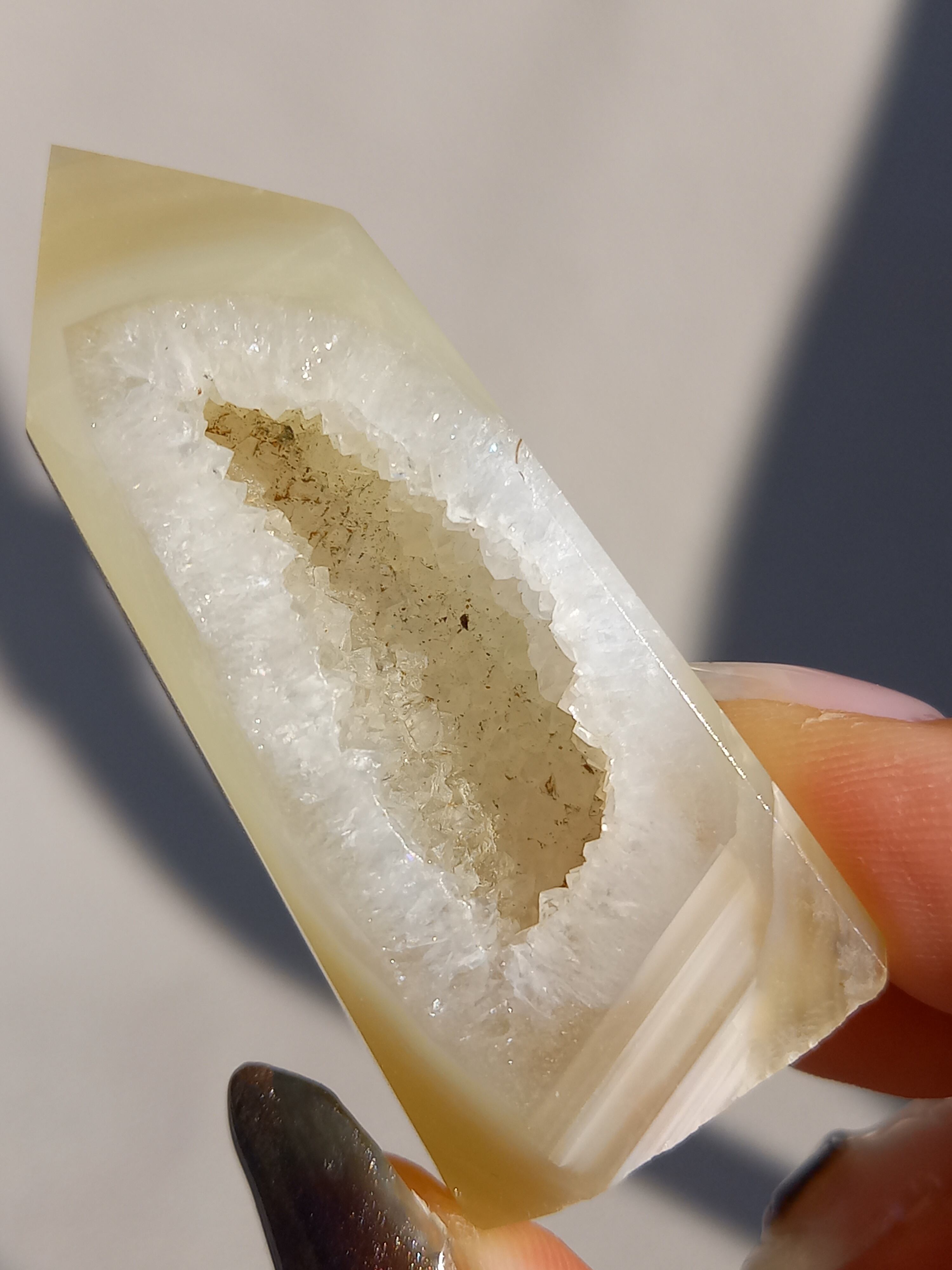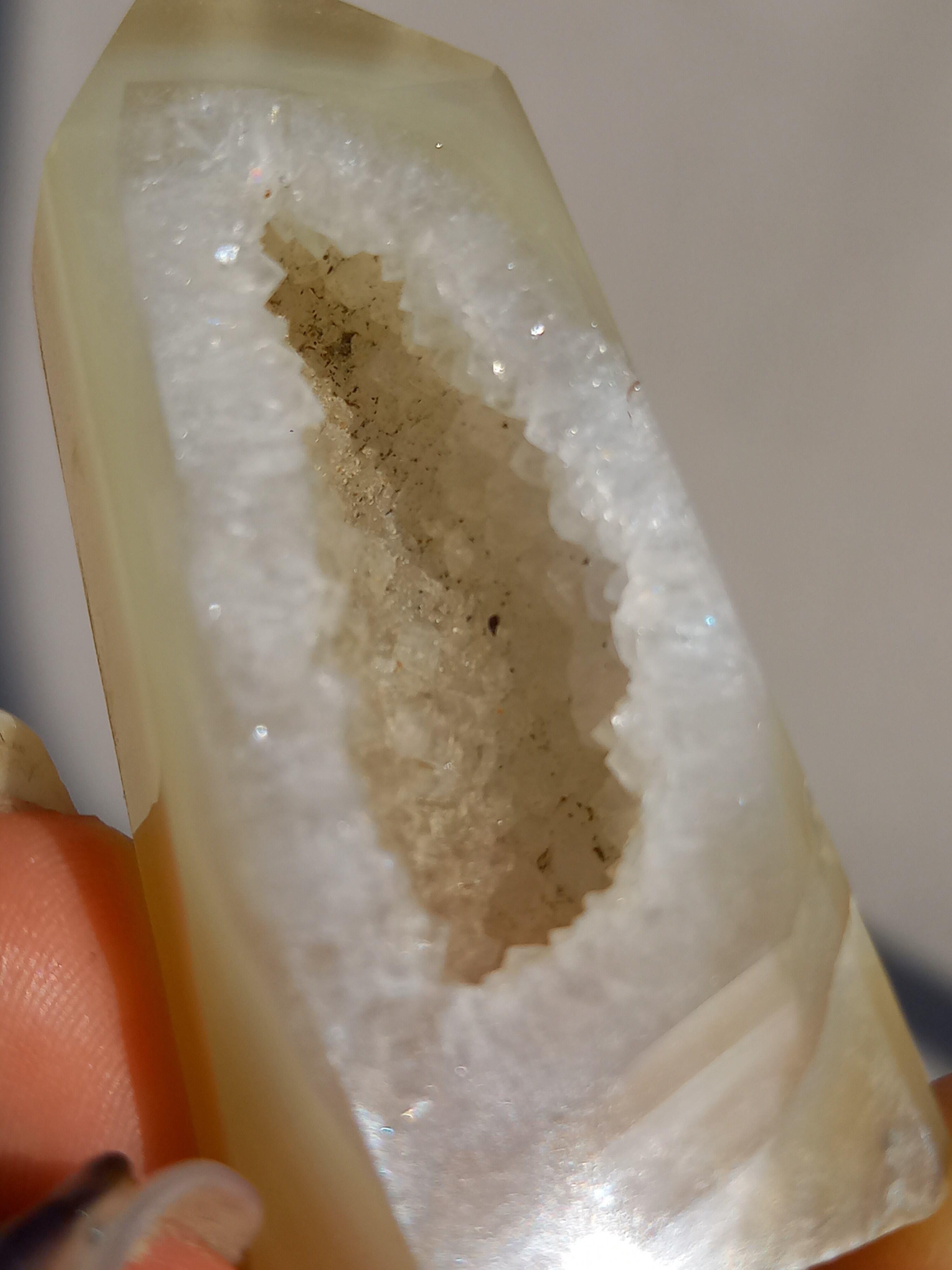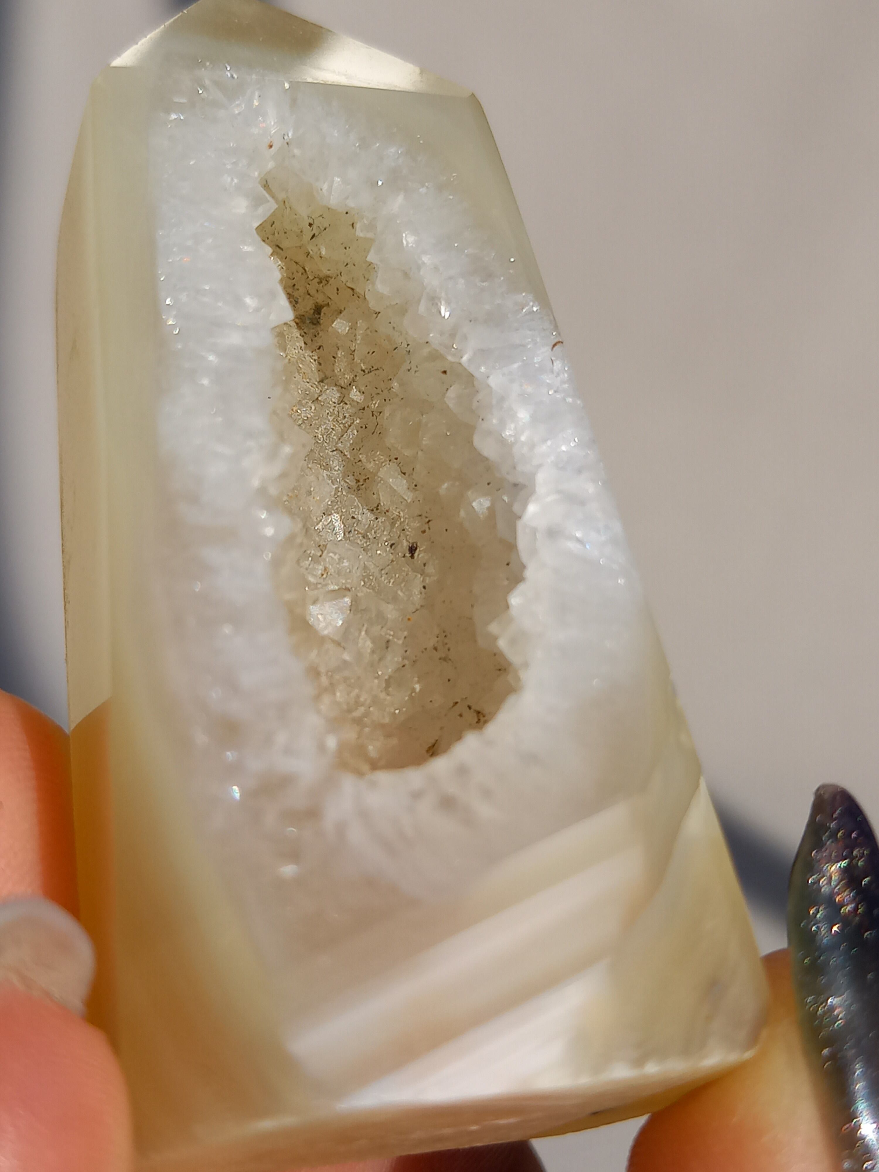 ジオードは、中が空洞になっている石で、水晶やアメジスト、瑪瑙といった鉱物で覆われているのが特徴です。水晶などの結晶が内側に向けて成長します。