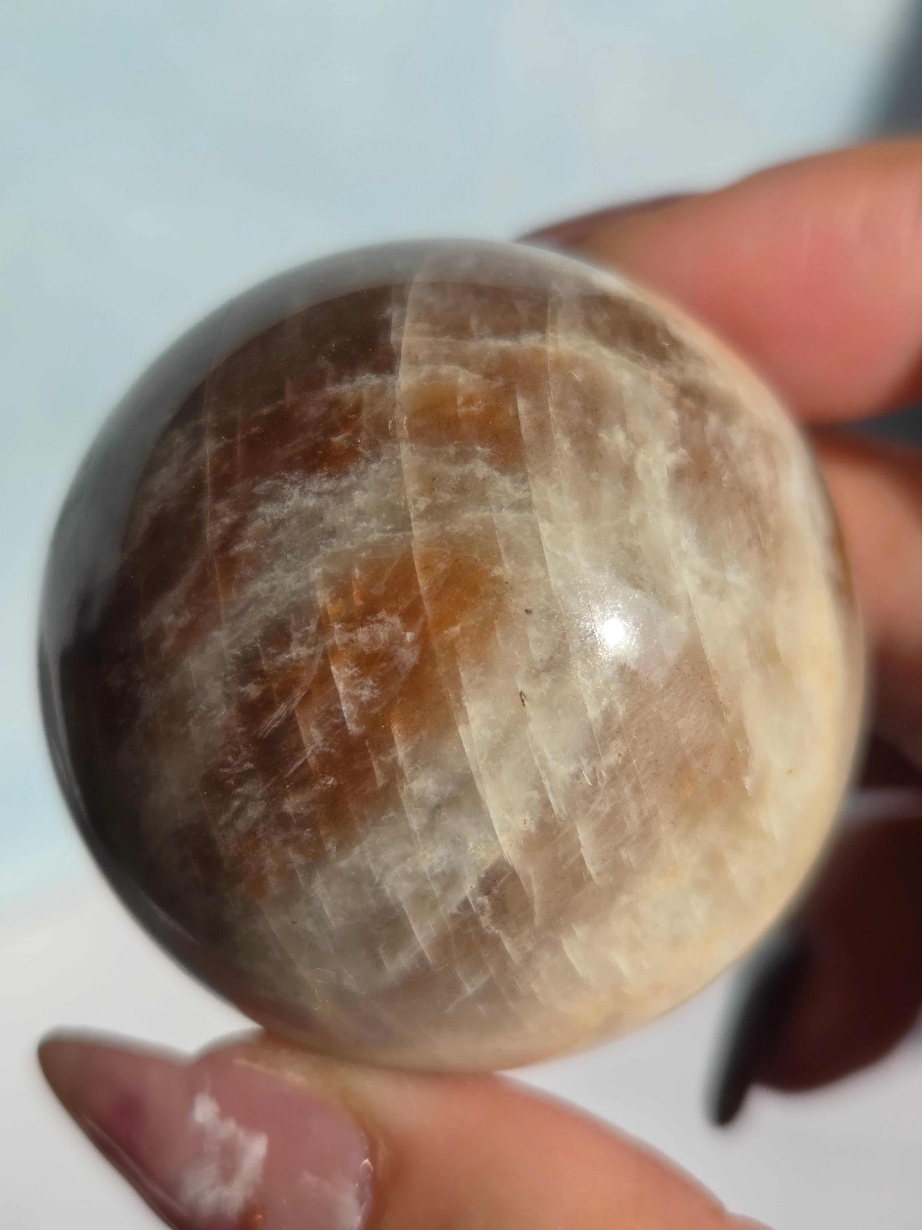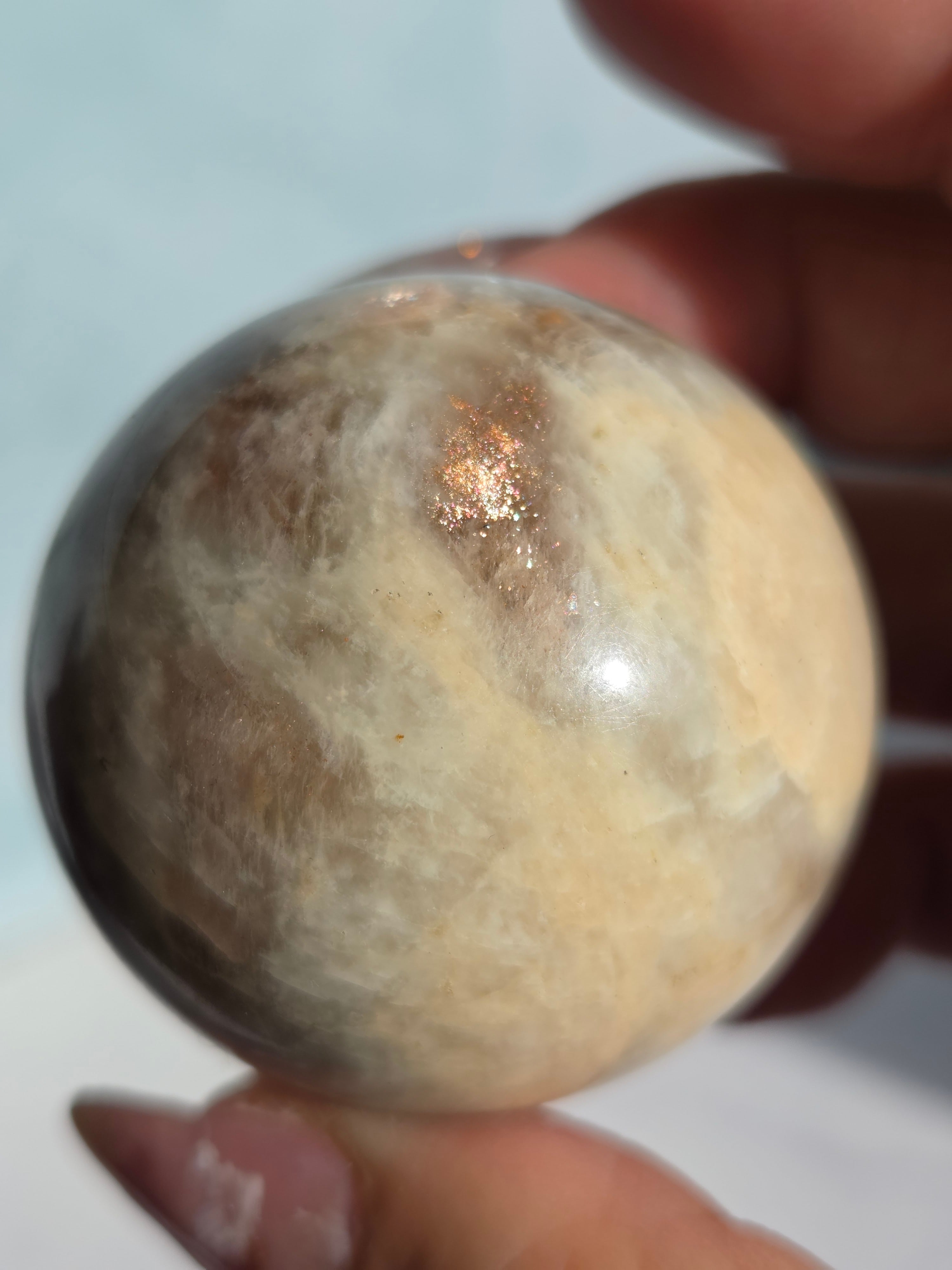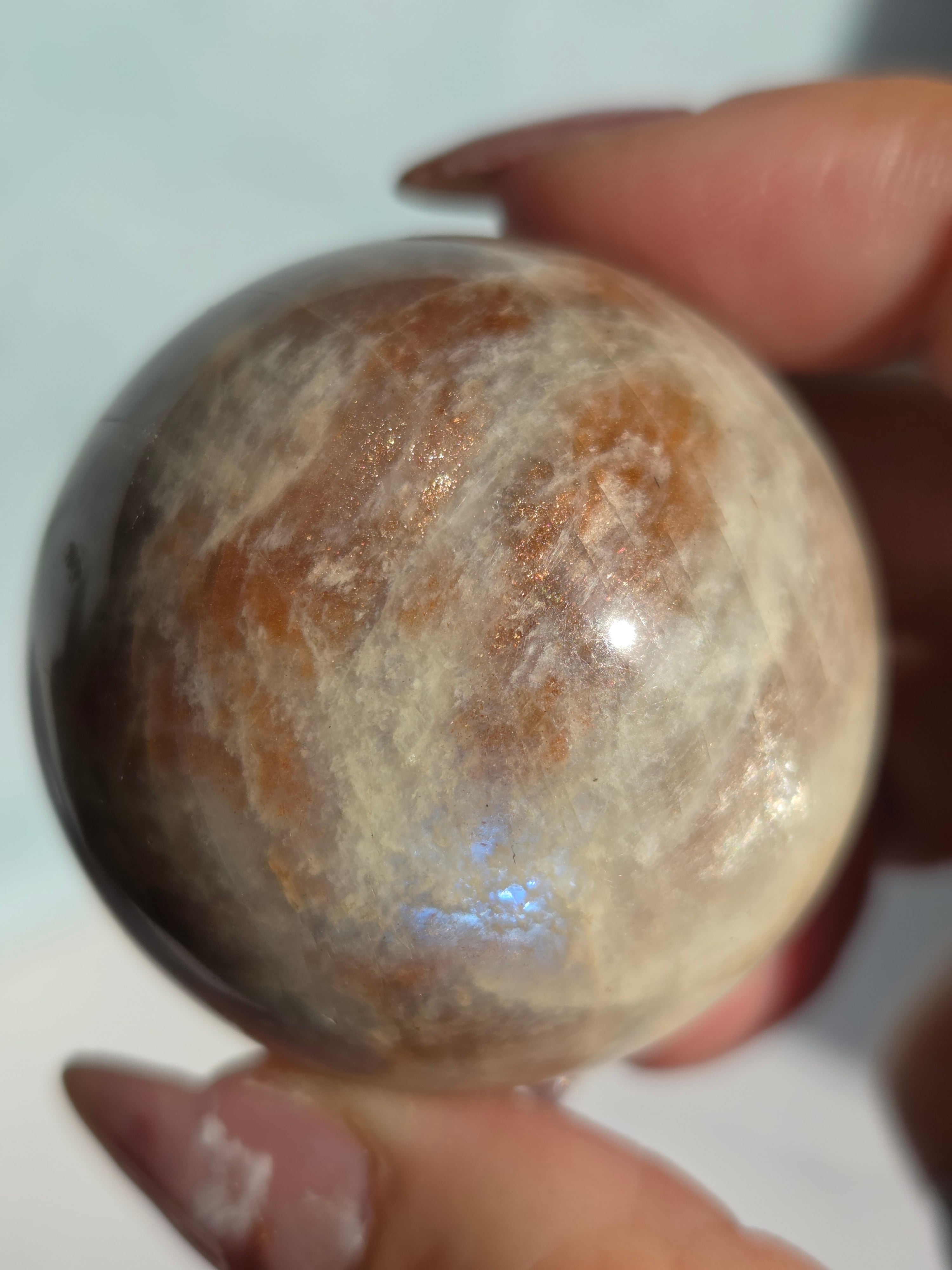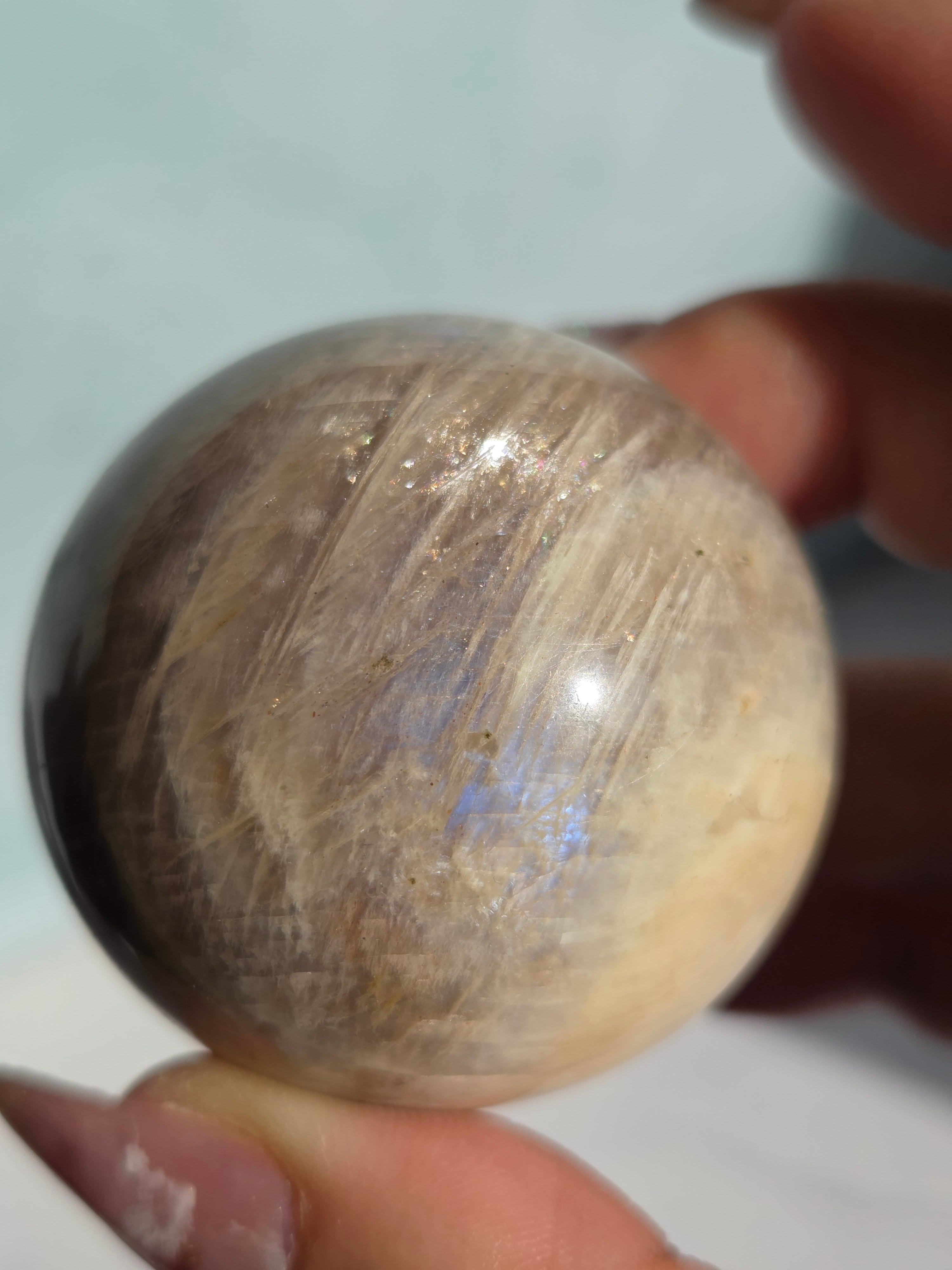 ブルームーンストーンのブルーシラー部分と、サンストーン部分のキラキラ部分とが共生しており、2つの石の魅力がひとつにつまったスペシャルなスフィアです。