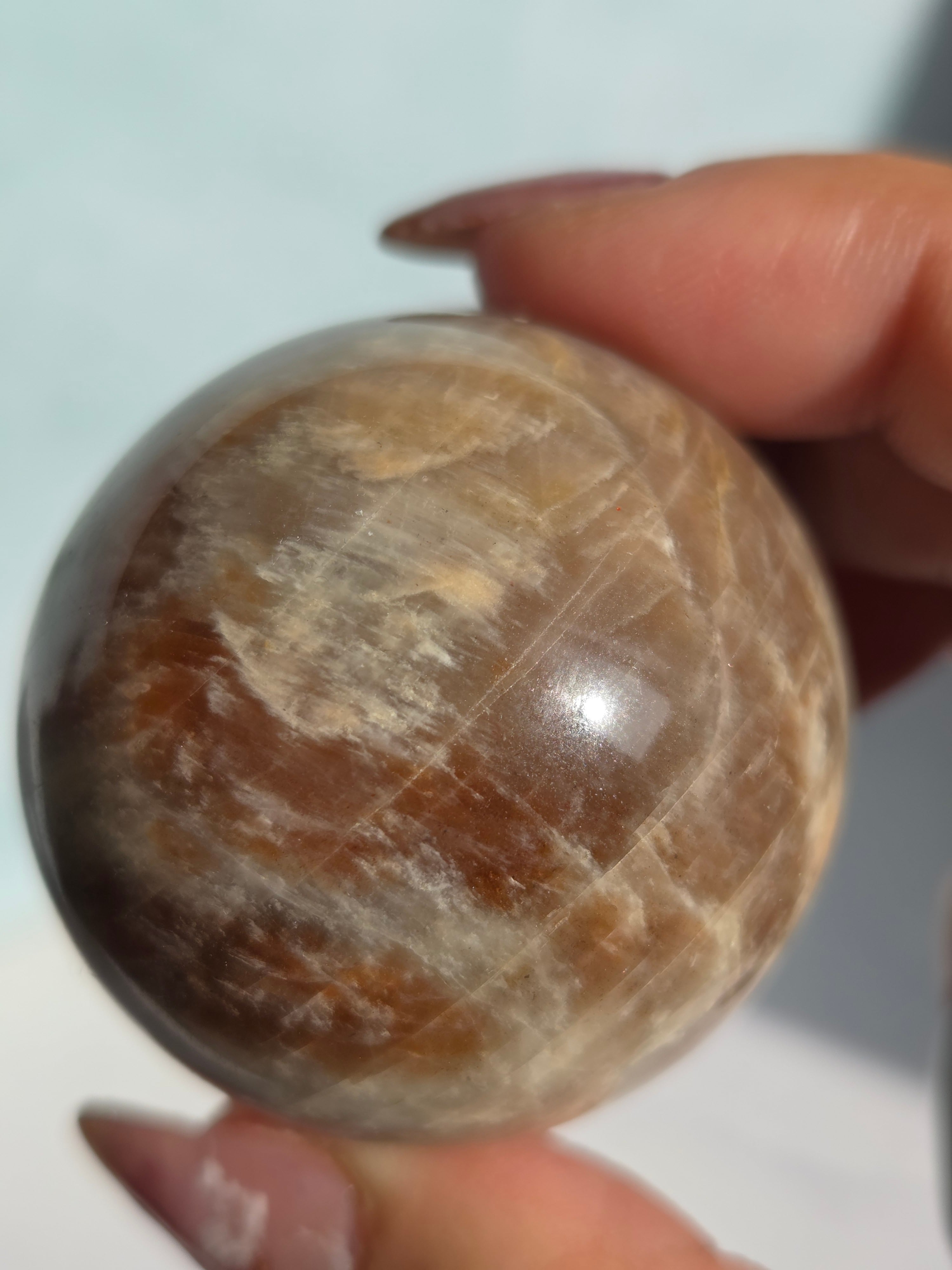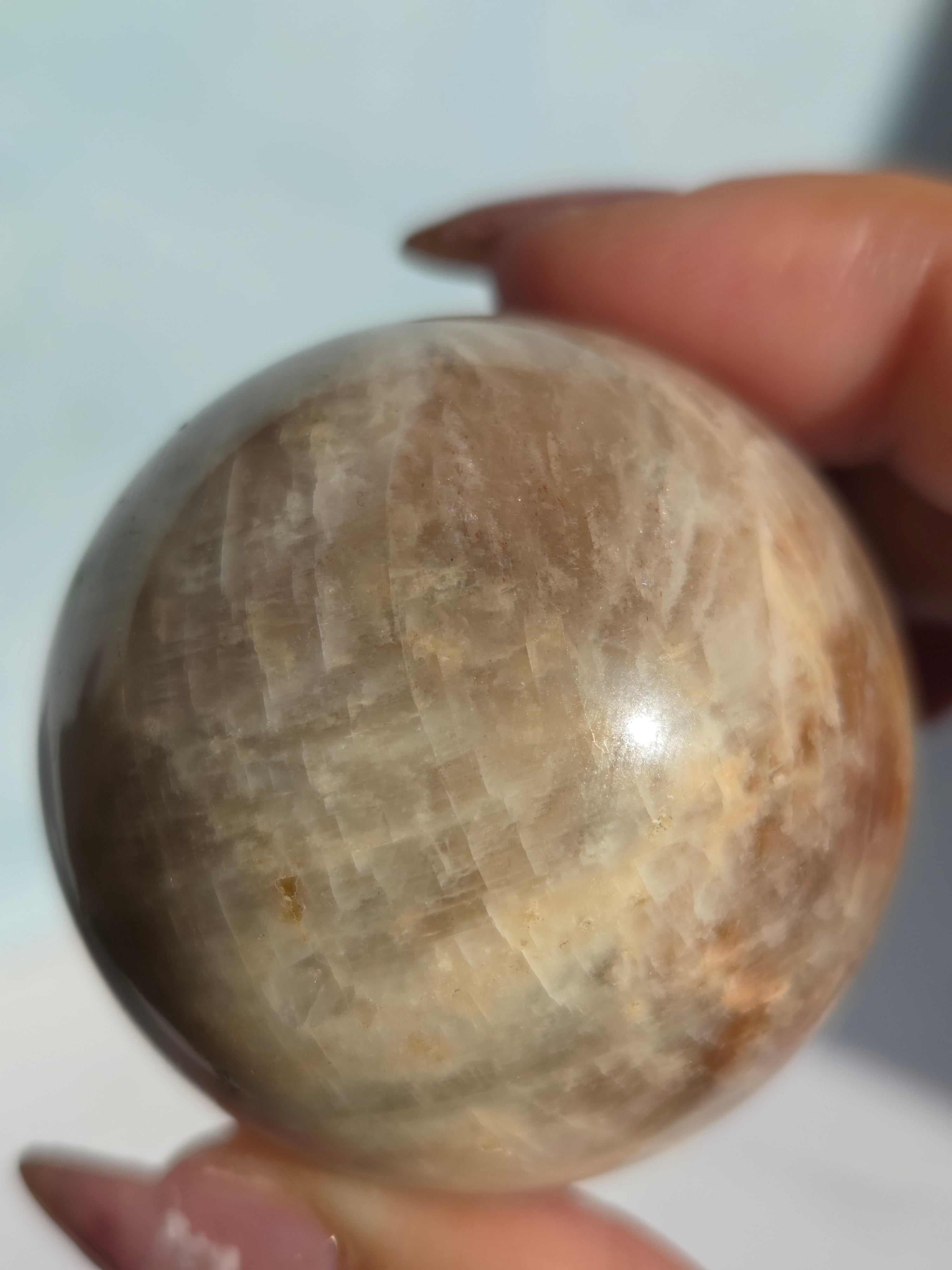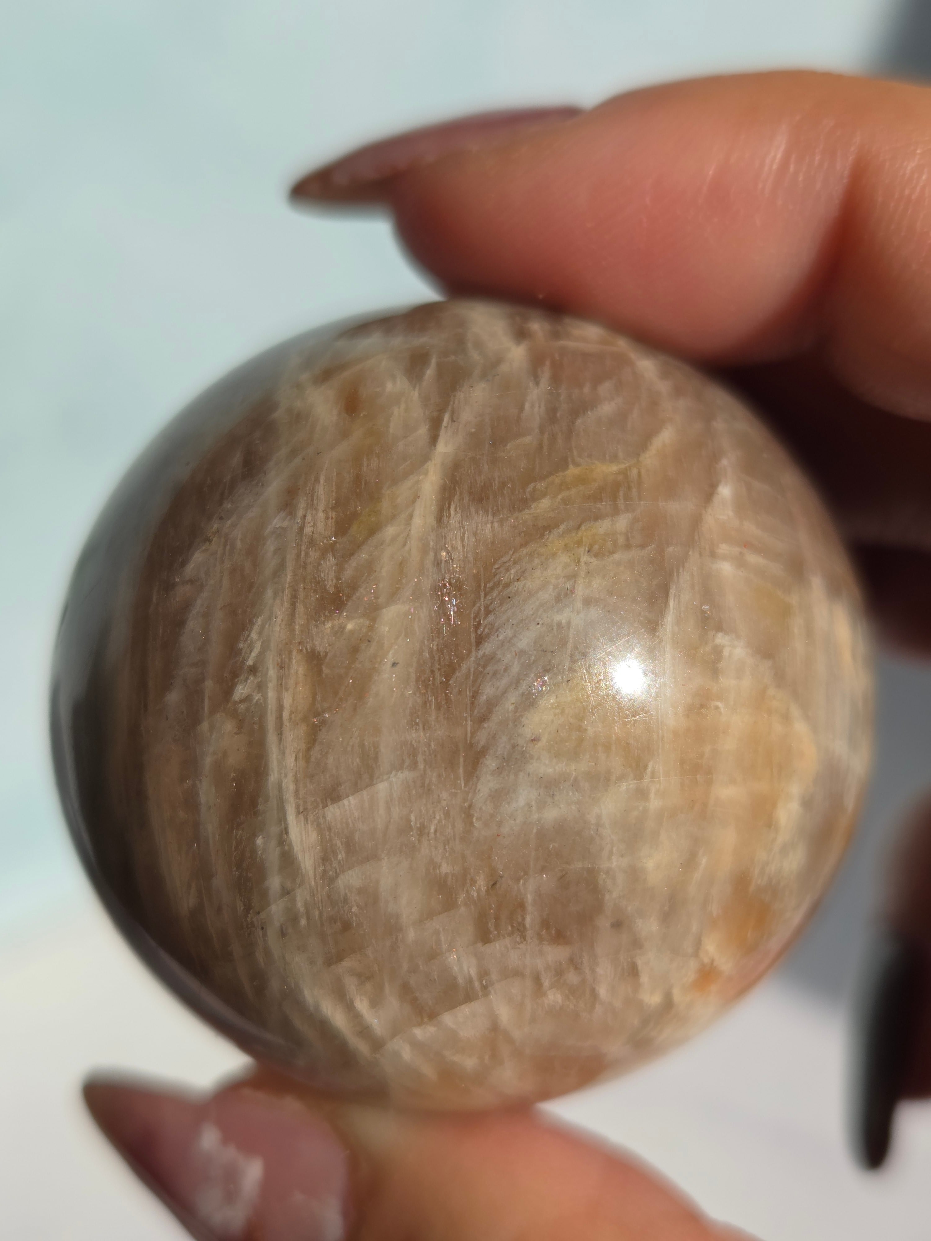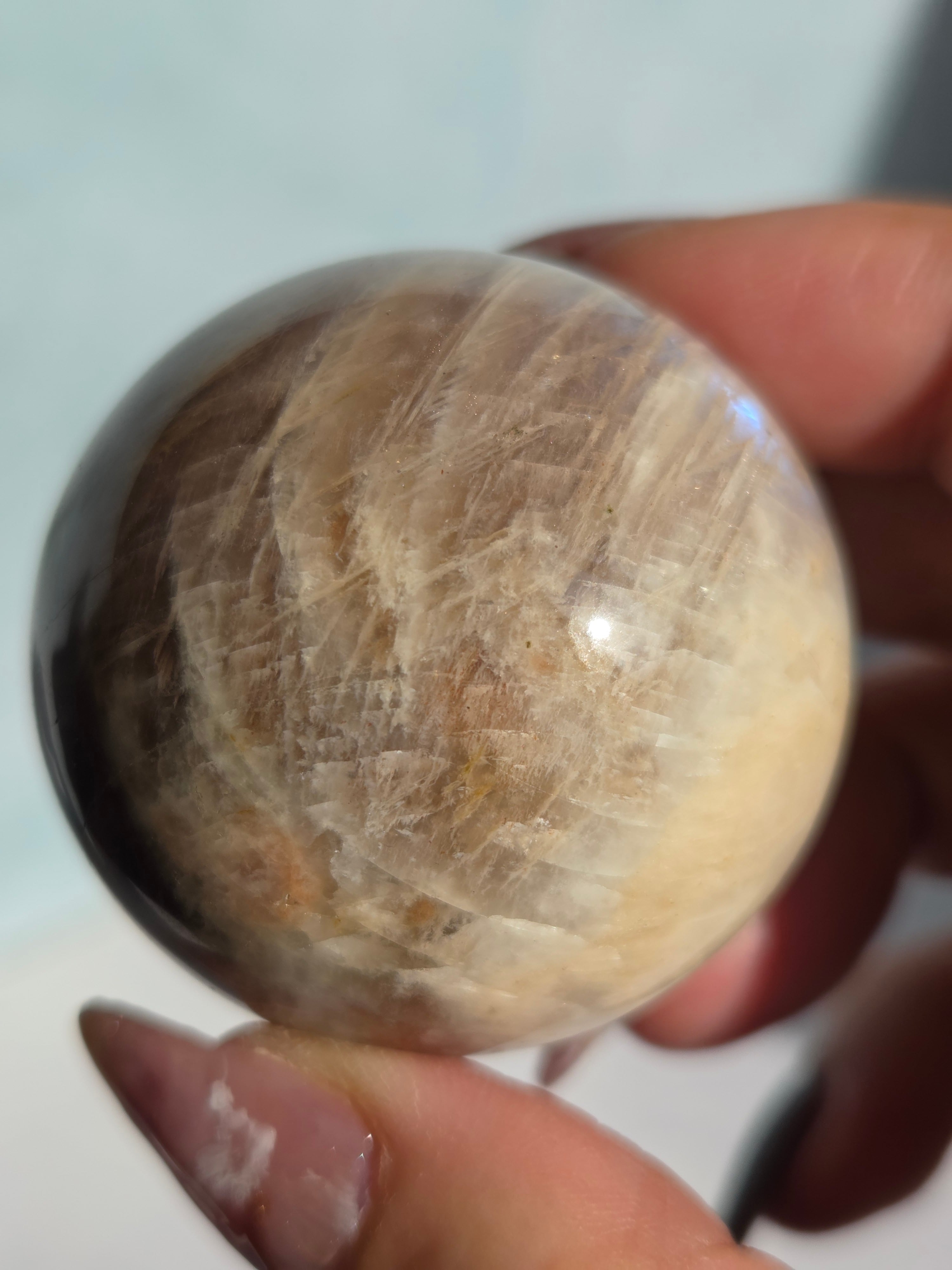 ブルームーンストーンのブルーシラー部分と、サンストーン部分のキラキラ部分とが共生しており、2つの石の魅力がひとつにつまったスペシャルなスフィアです。