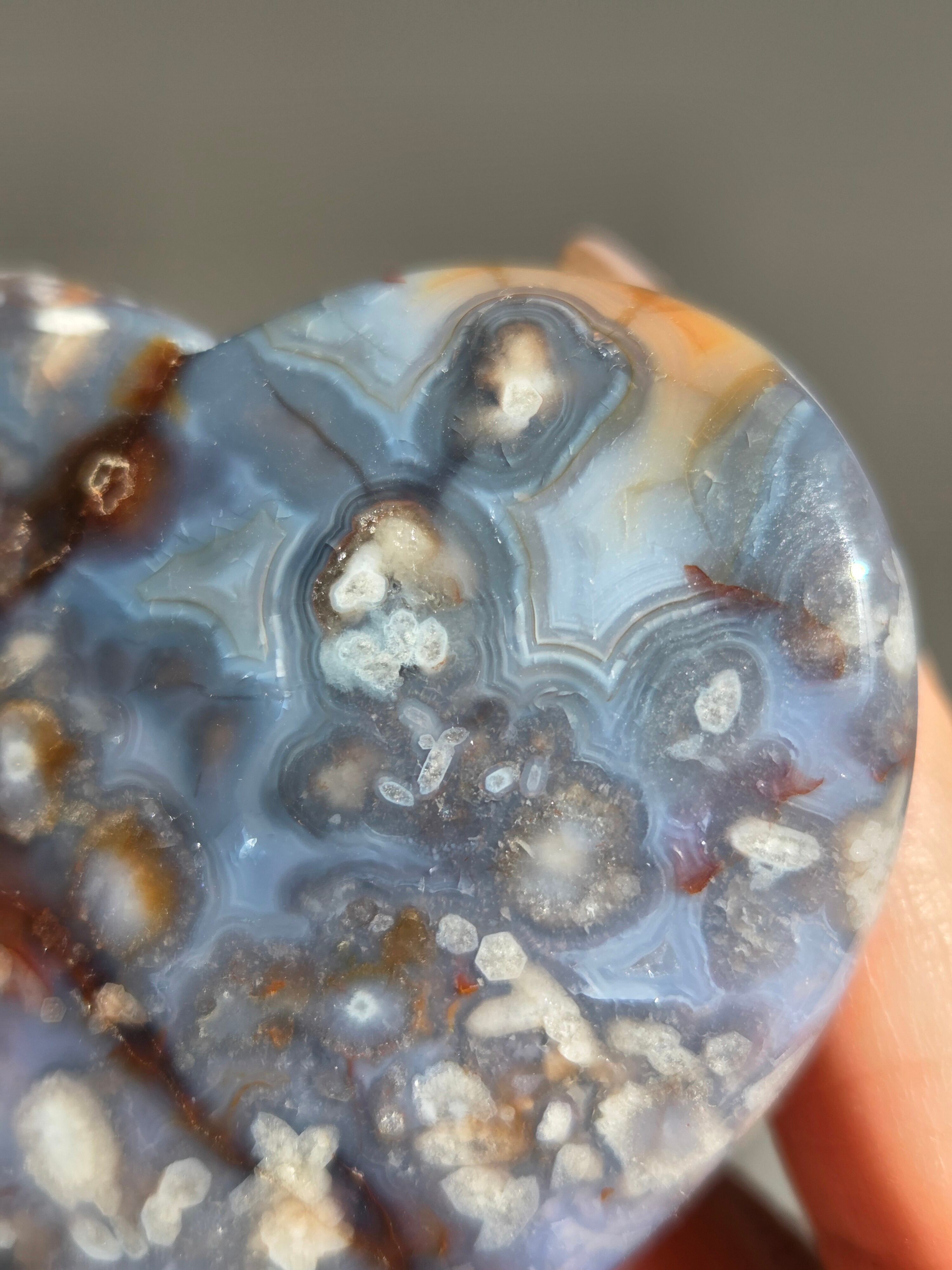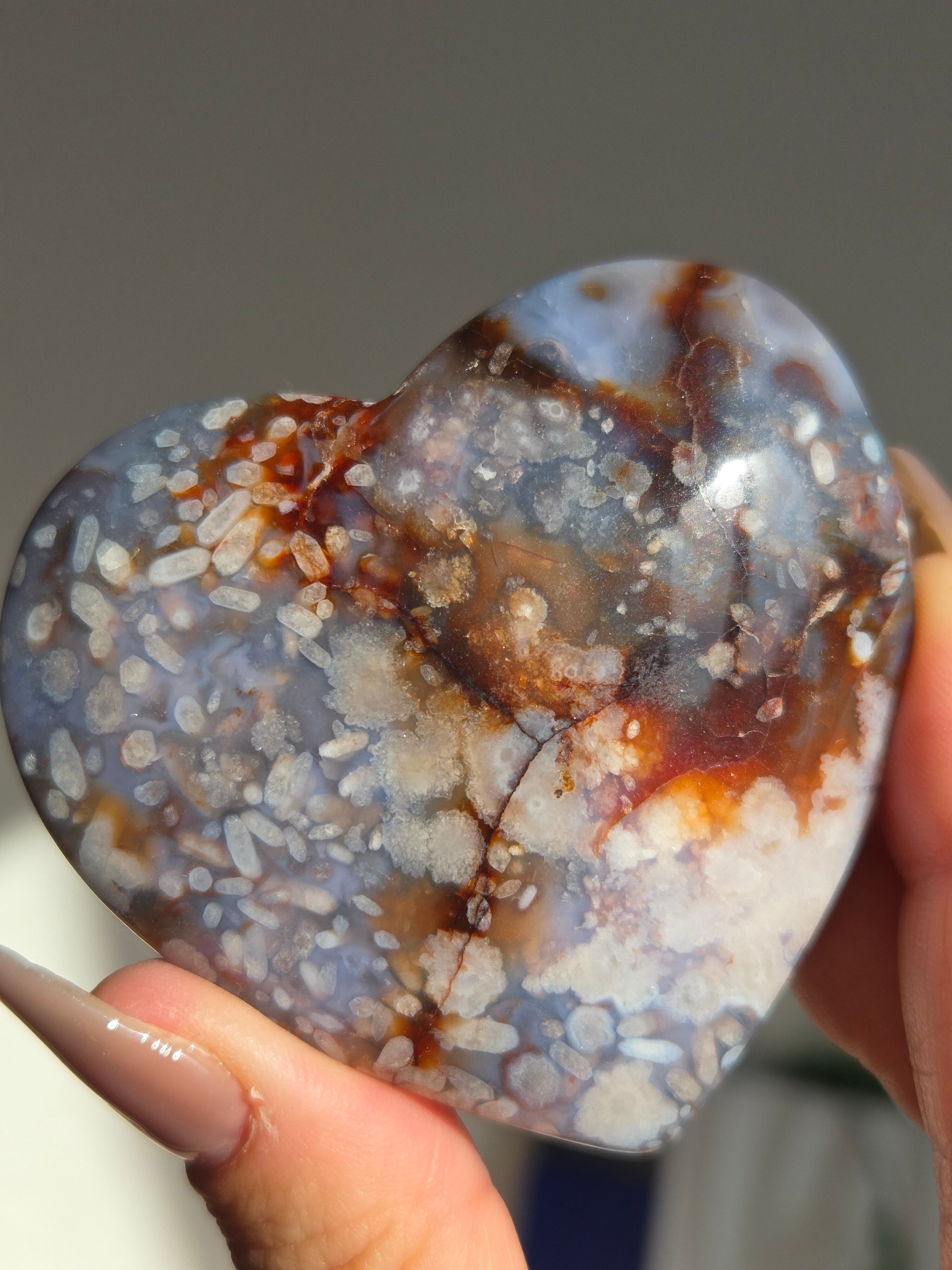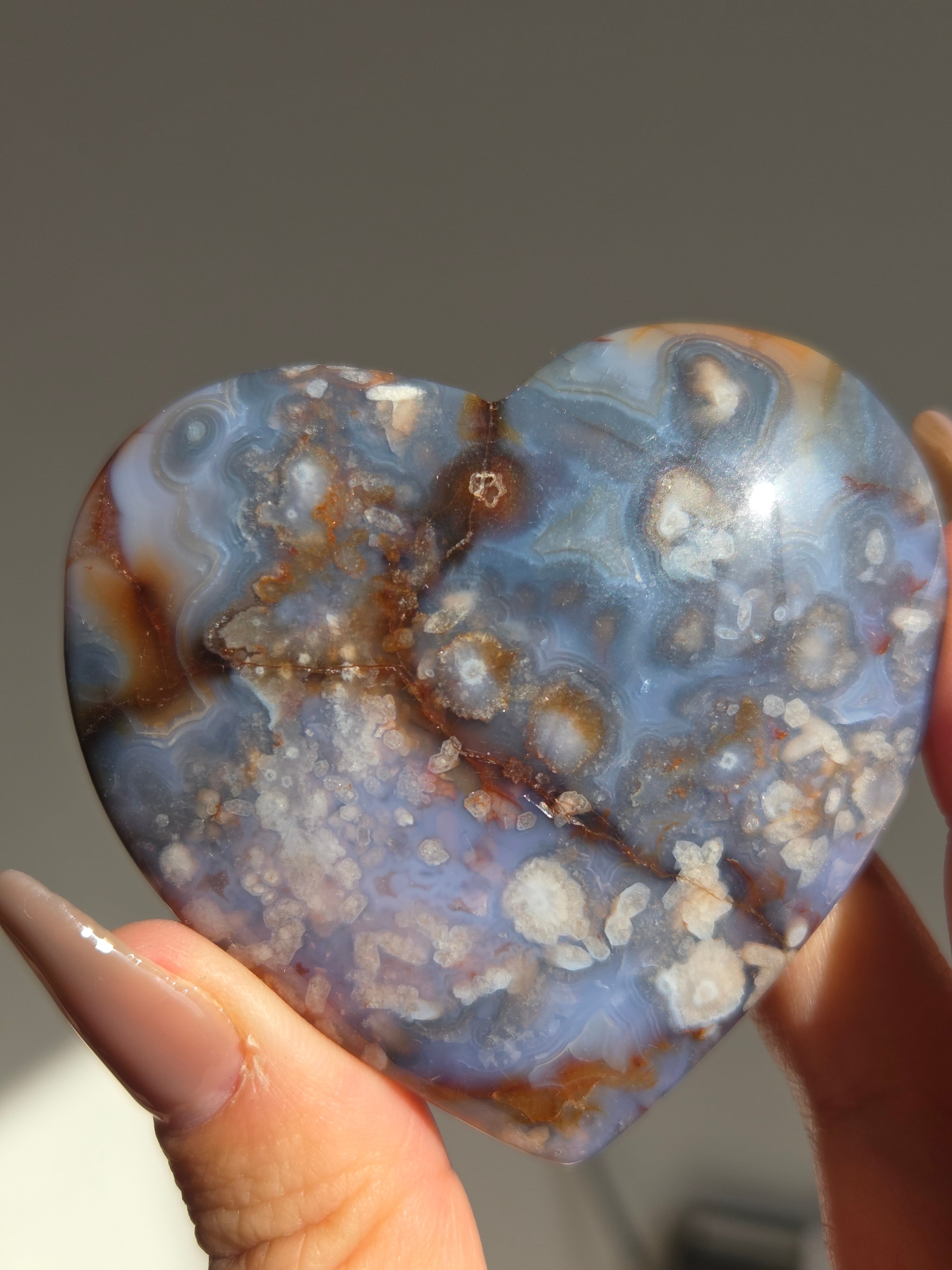 ブルーとホワイトのコントラストと小さなお花が大人可愛い!ブルーフラワーアゲートハートパームです。