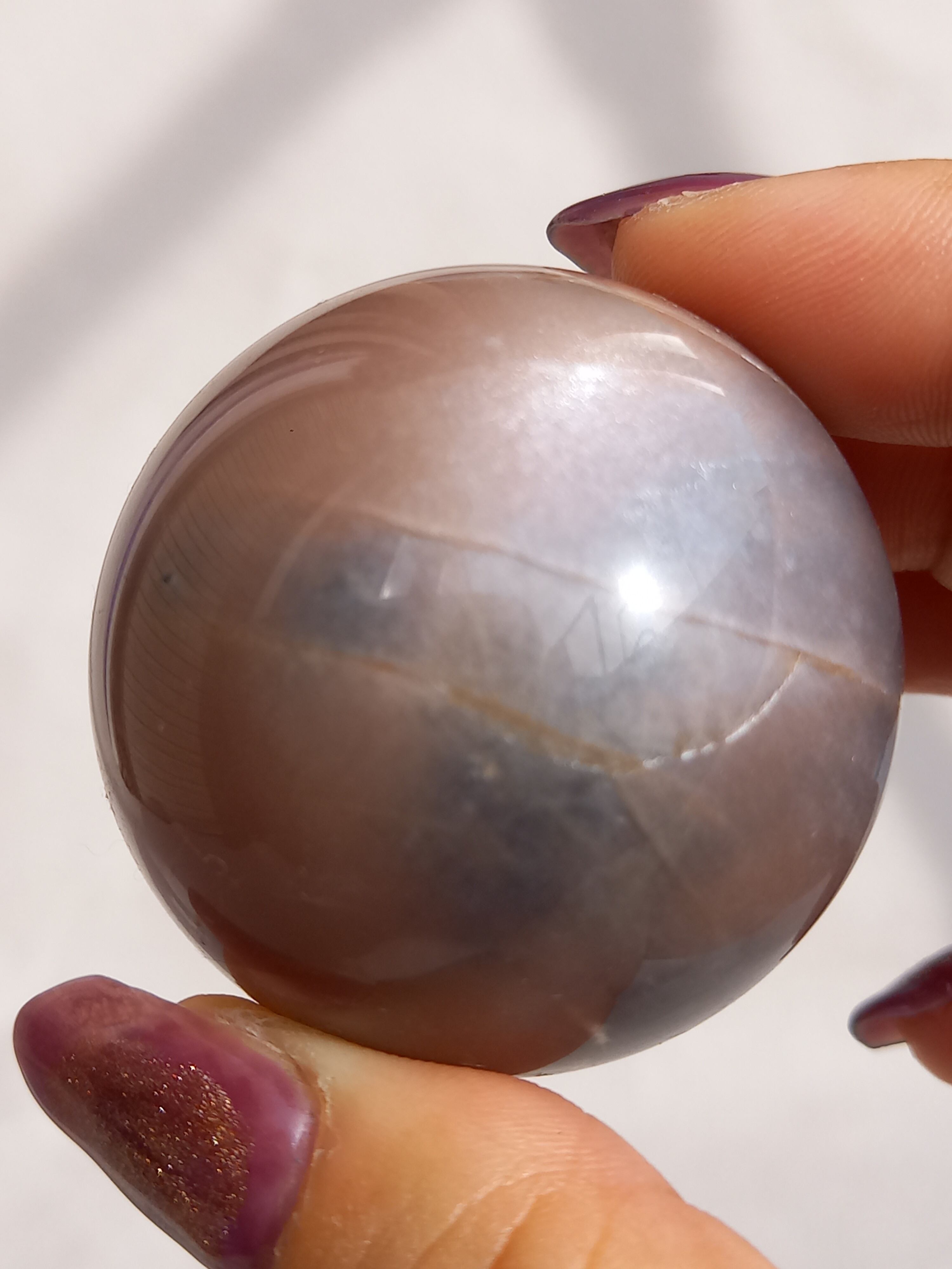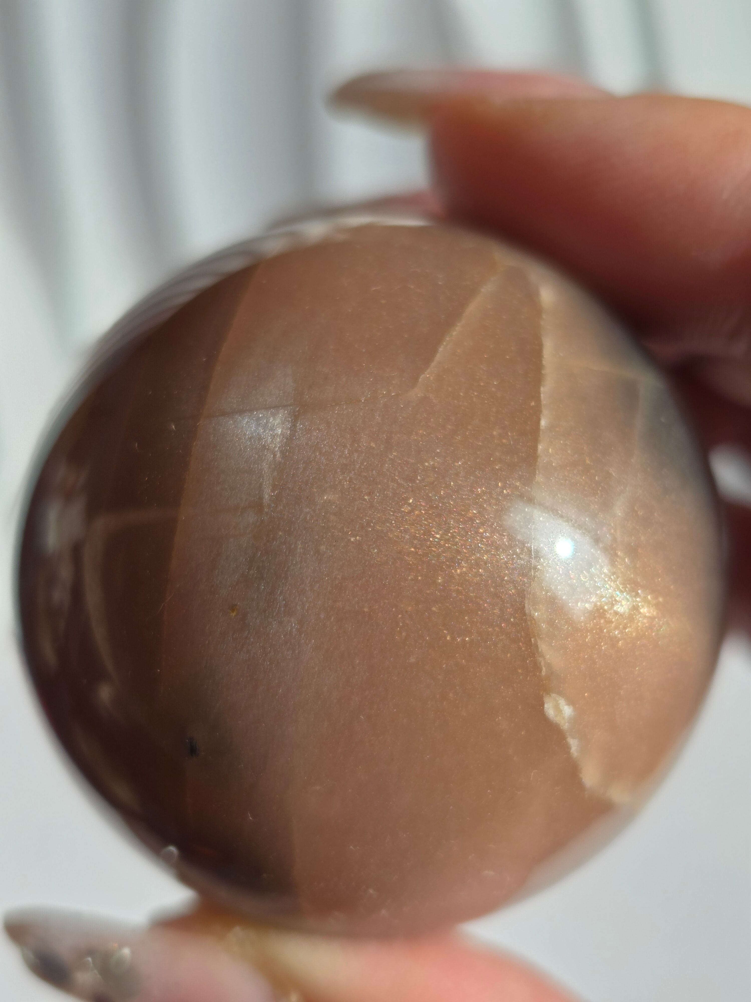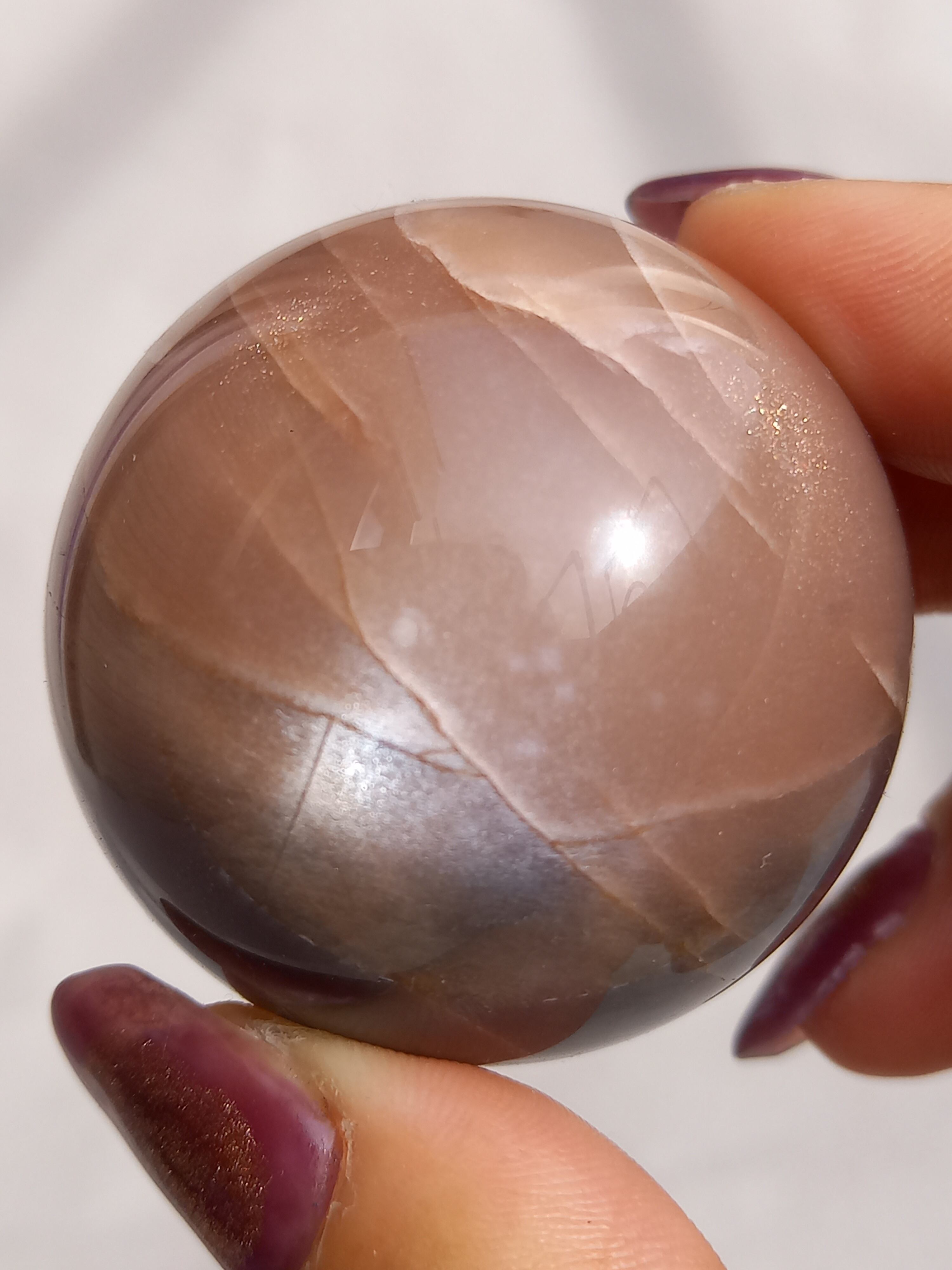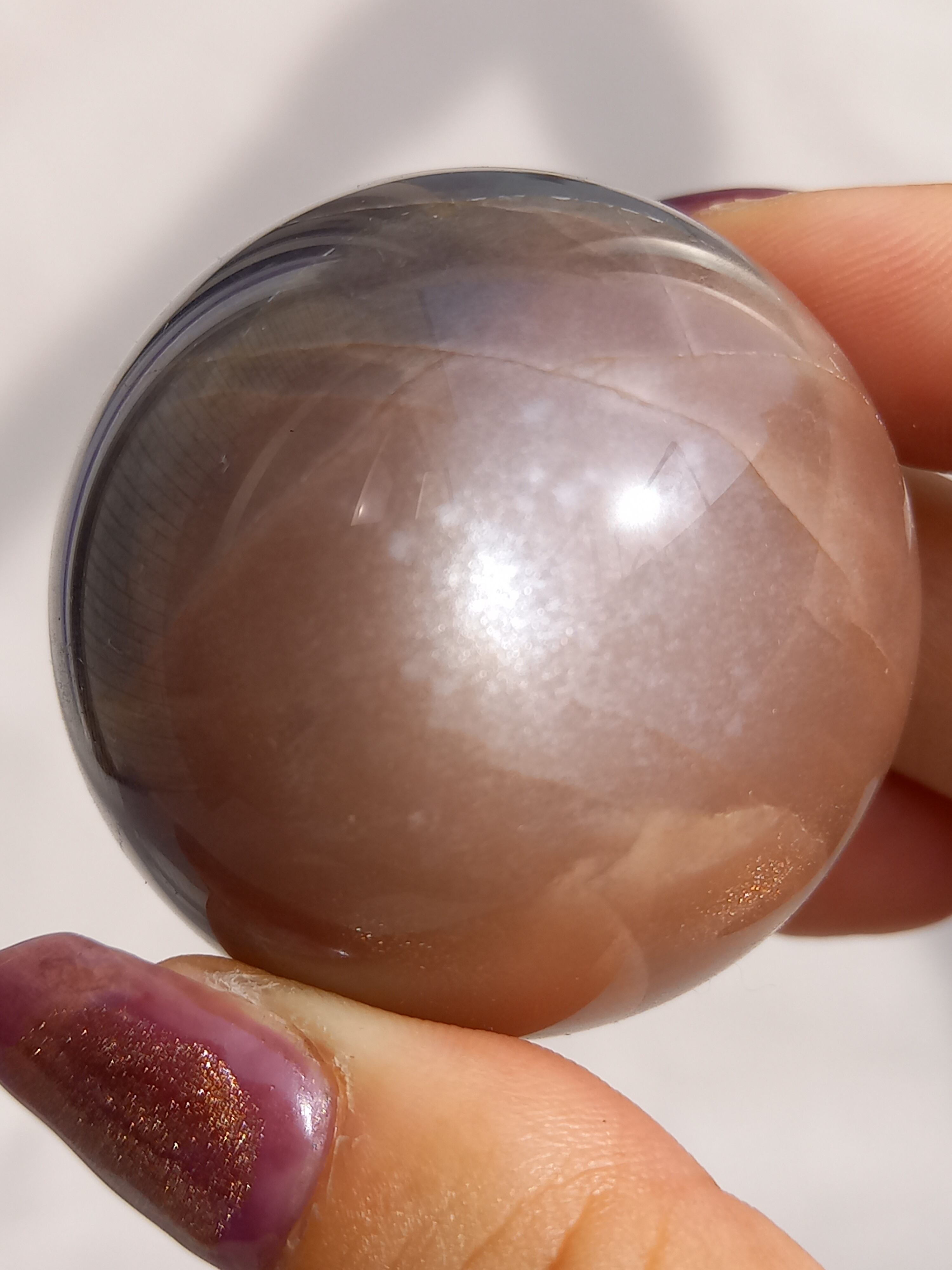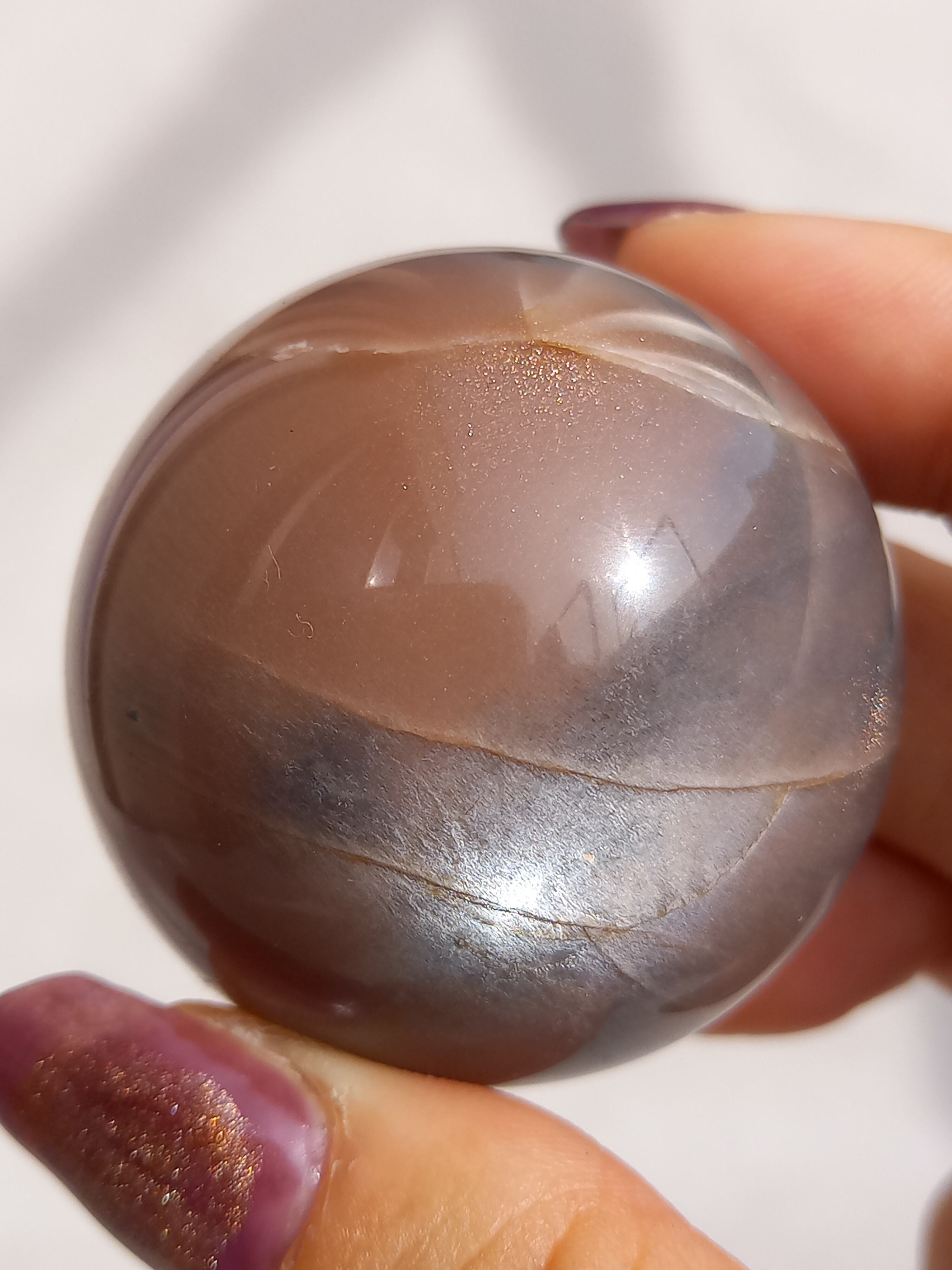 サンムーンストーンは、長石(フェルドスパー)という鉱物グループの一種で、ムーンストーンやサンストーンの仲間です。ムーンストーンのようなシラー効果と、サンストーンのようなアベンチュレッセンス(ラメのような輝き)を両方持ち合わせています