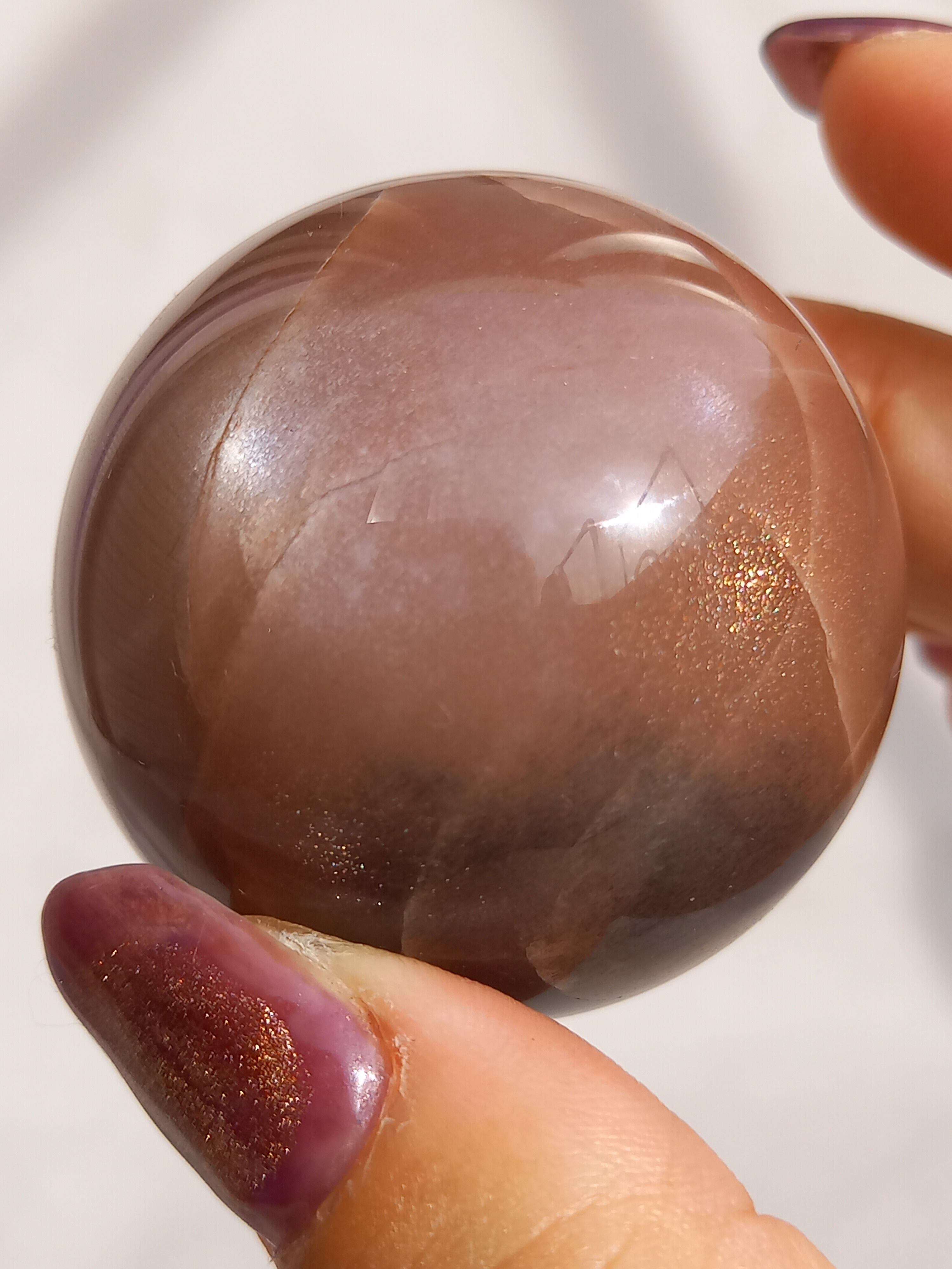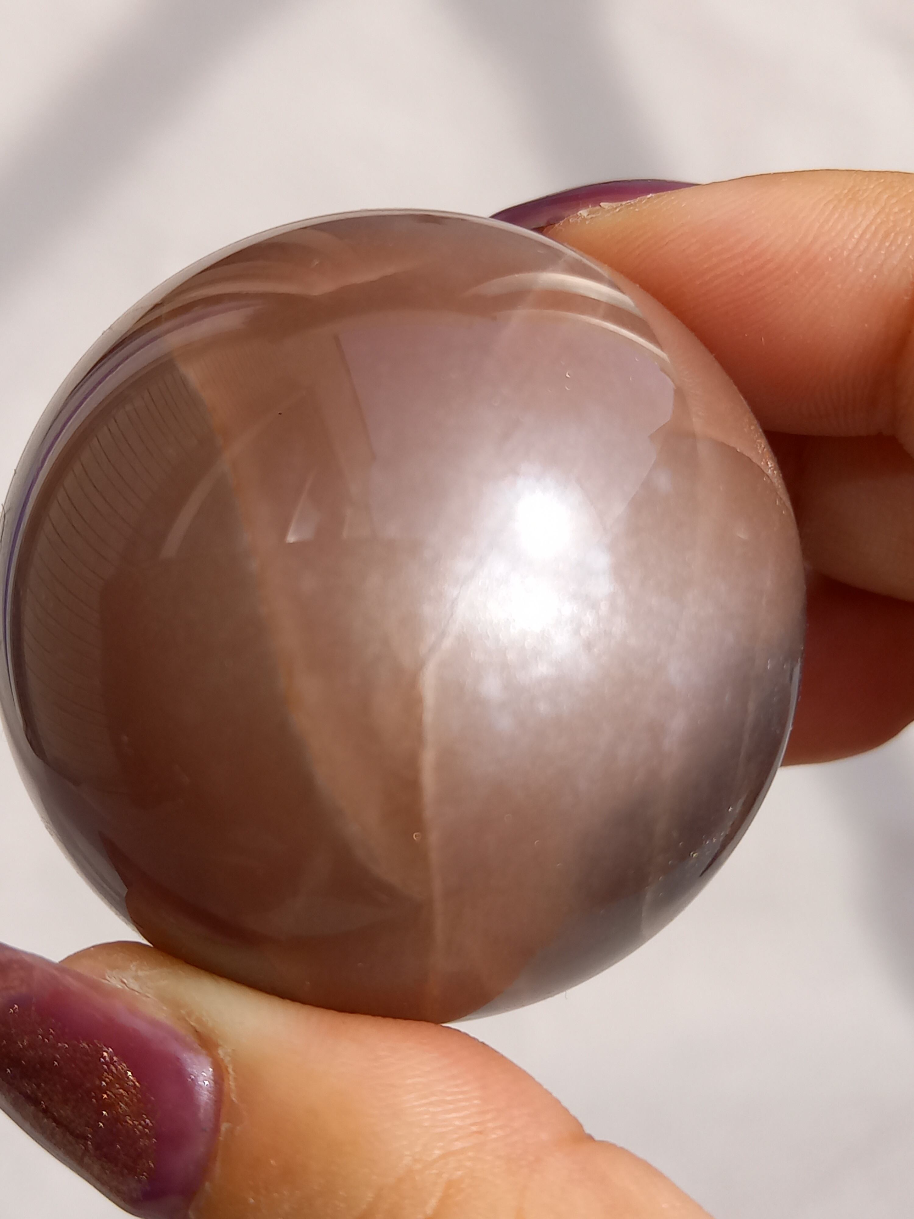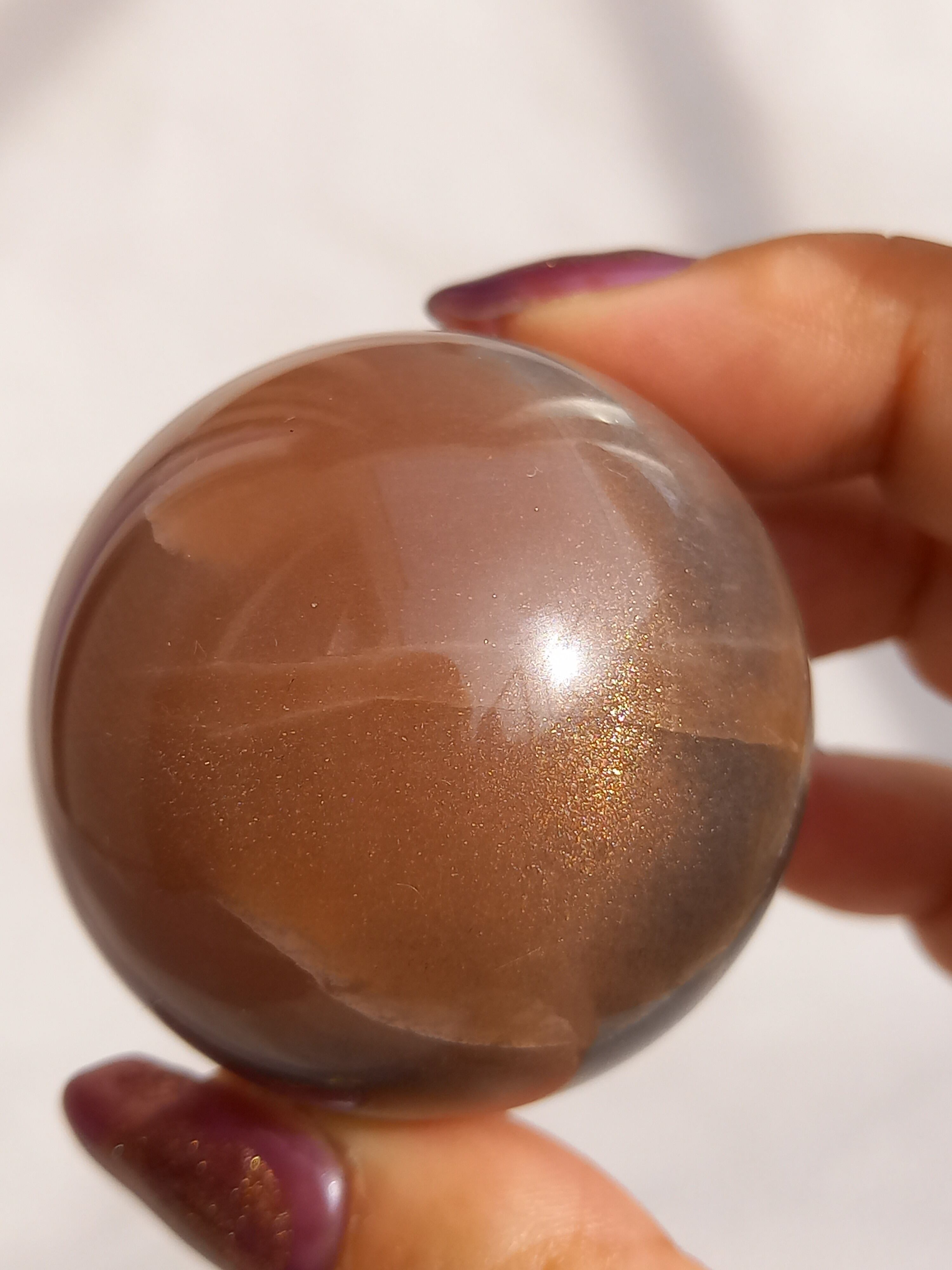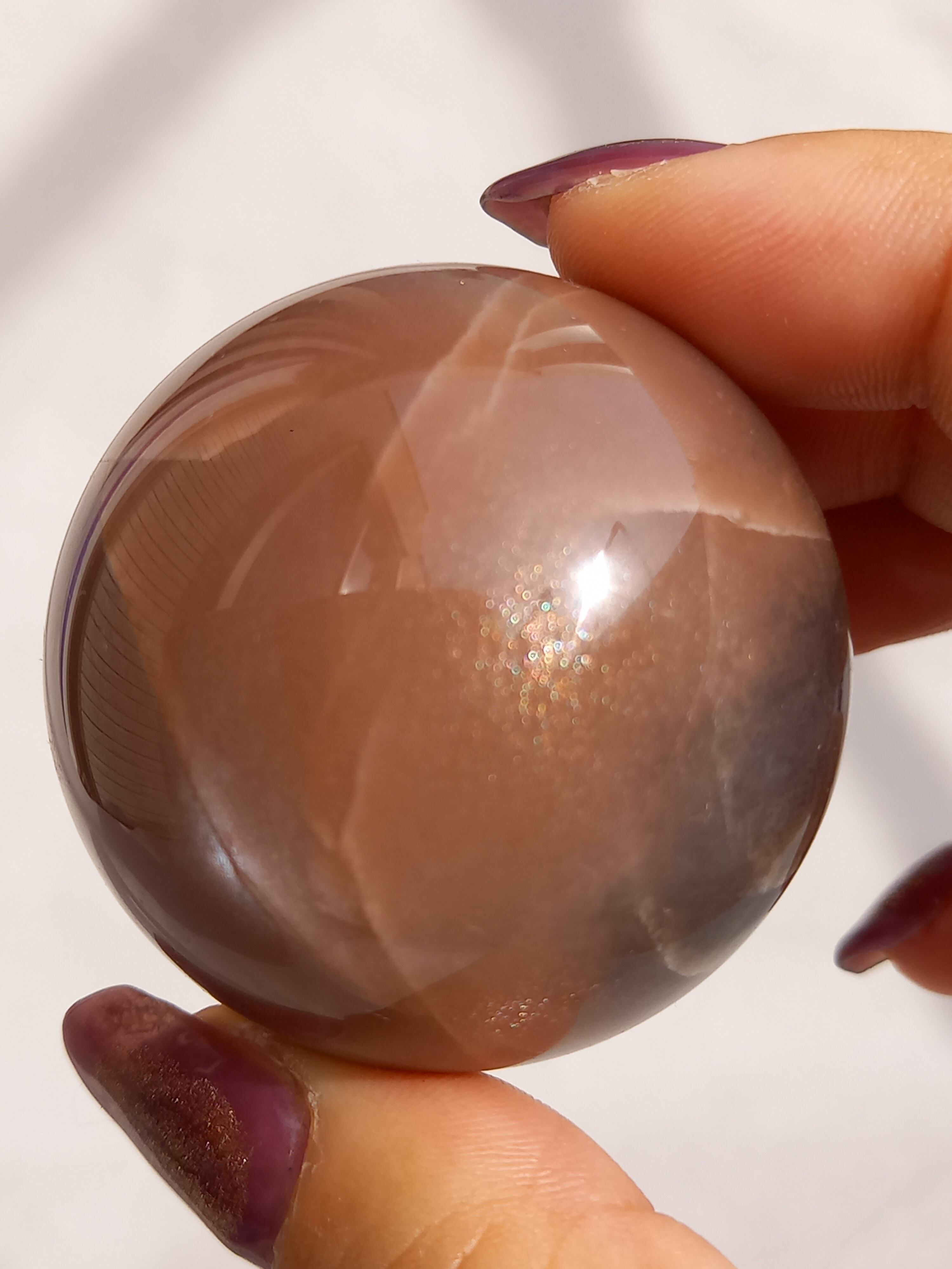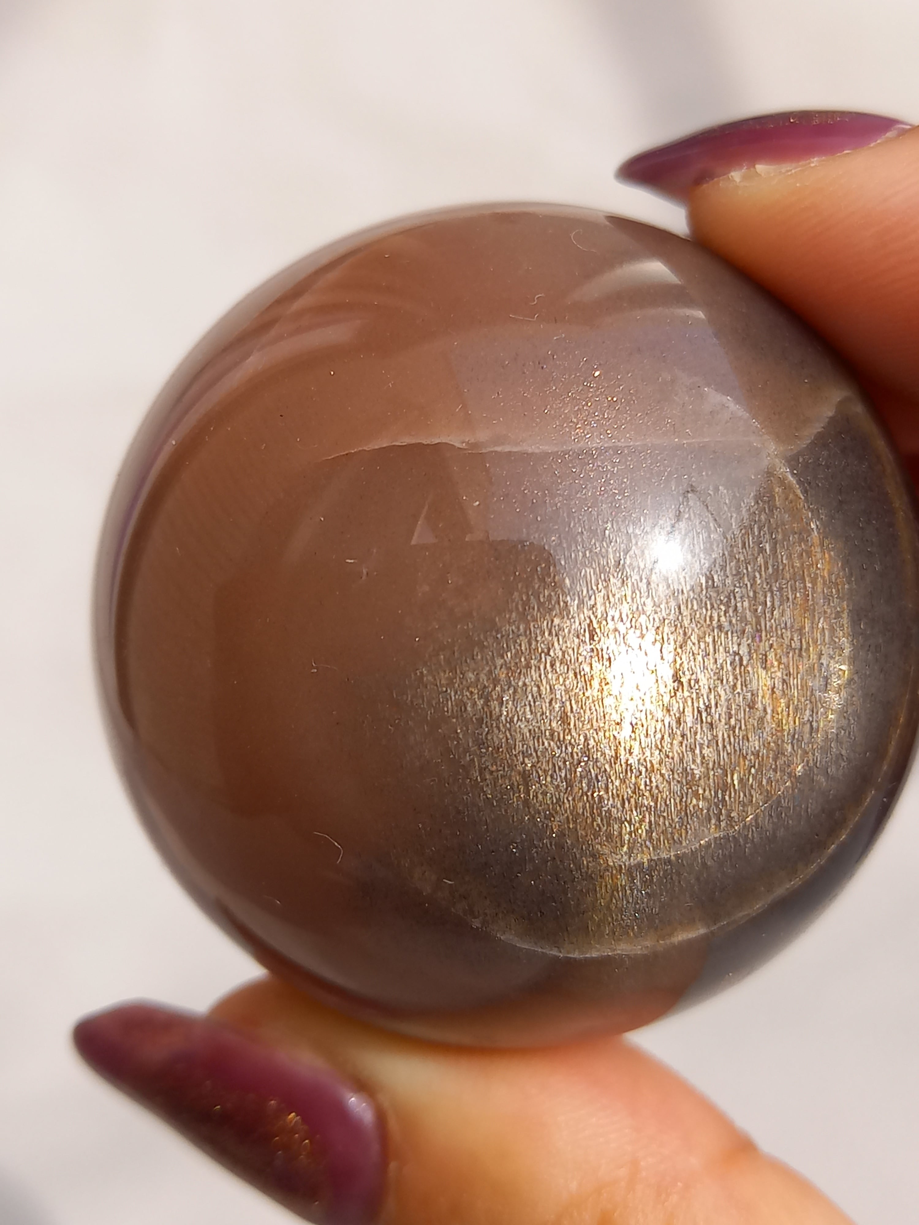 サンムーンストーンは、長石(フェルドスパー)という鉱物グループの一種で、ムーンストーンやサンストーンの仲間です。ムーンストーンのようなシラー効果と、サンストーンのようなアベンチュレッセンス(ラメのような輝き)を両方持ち合わせています