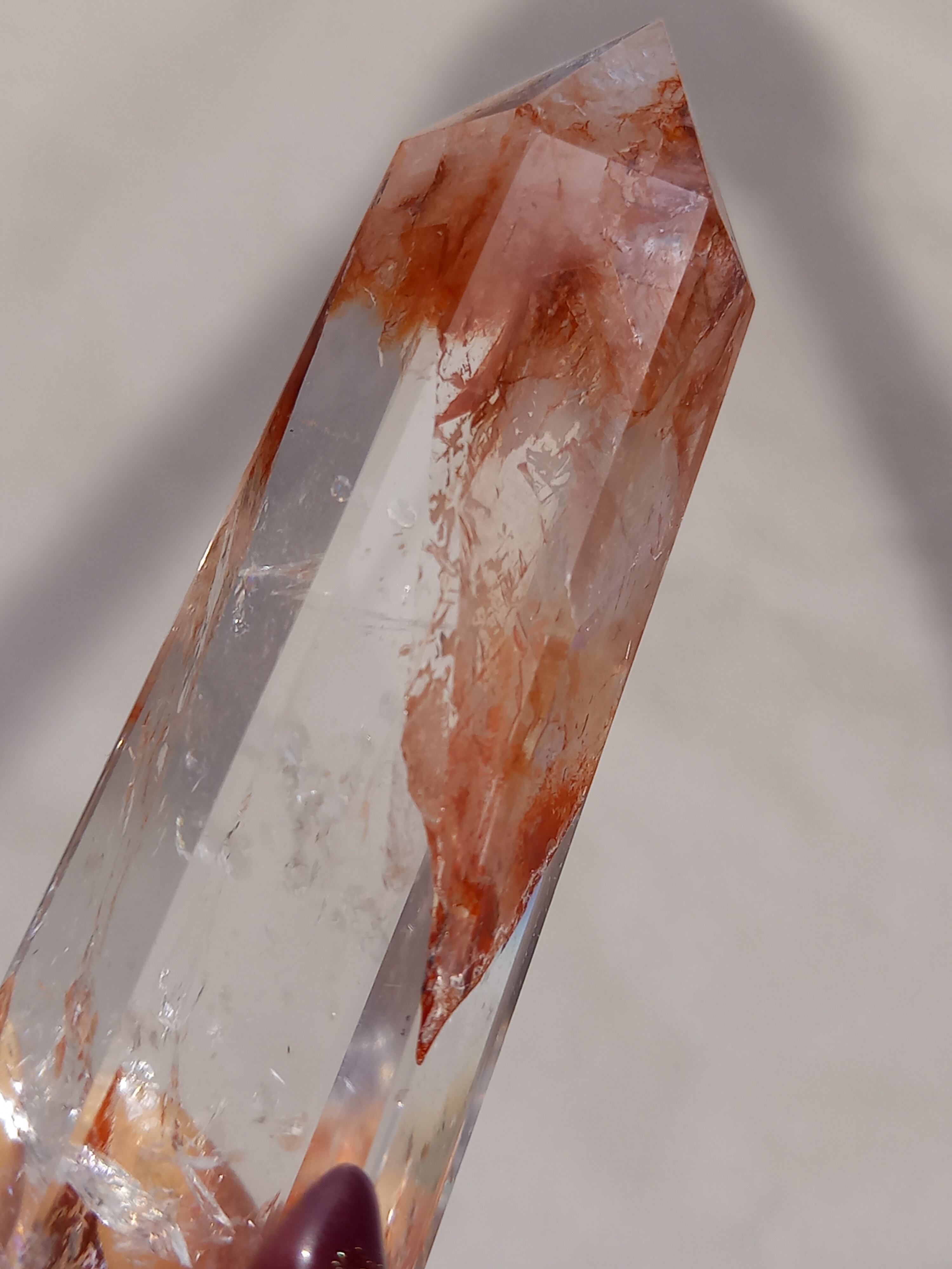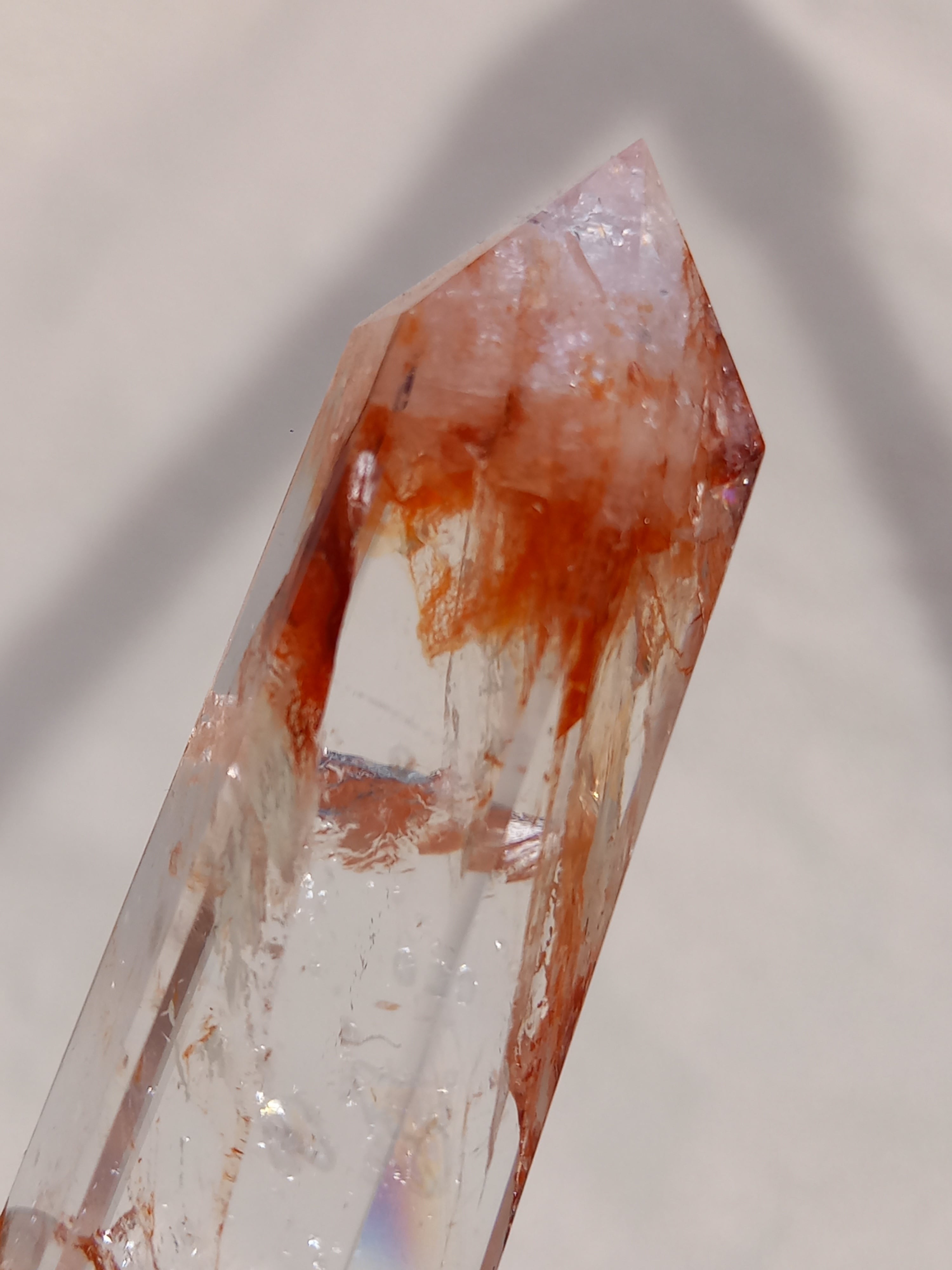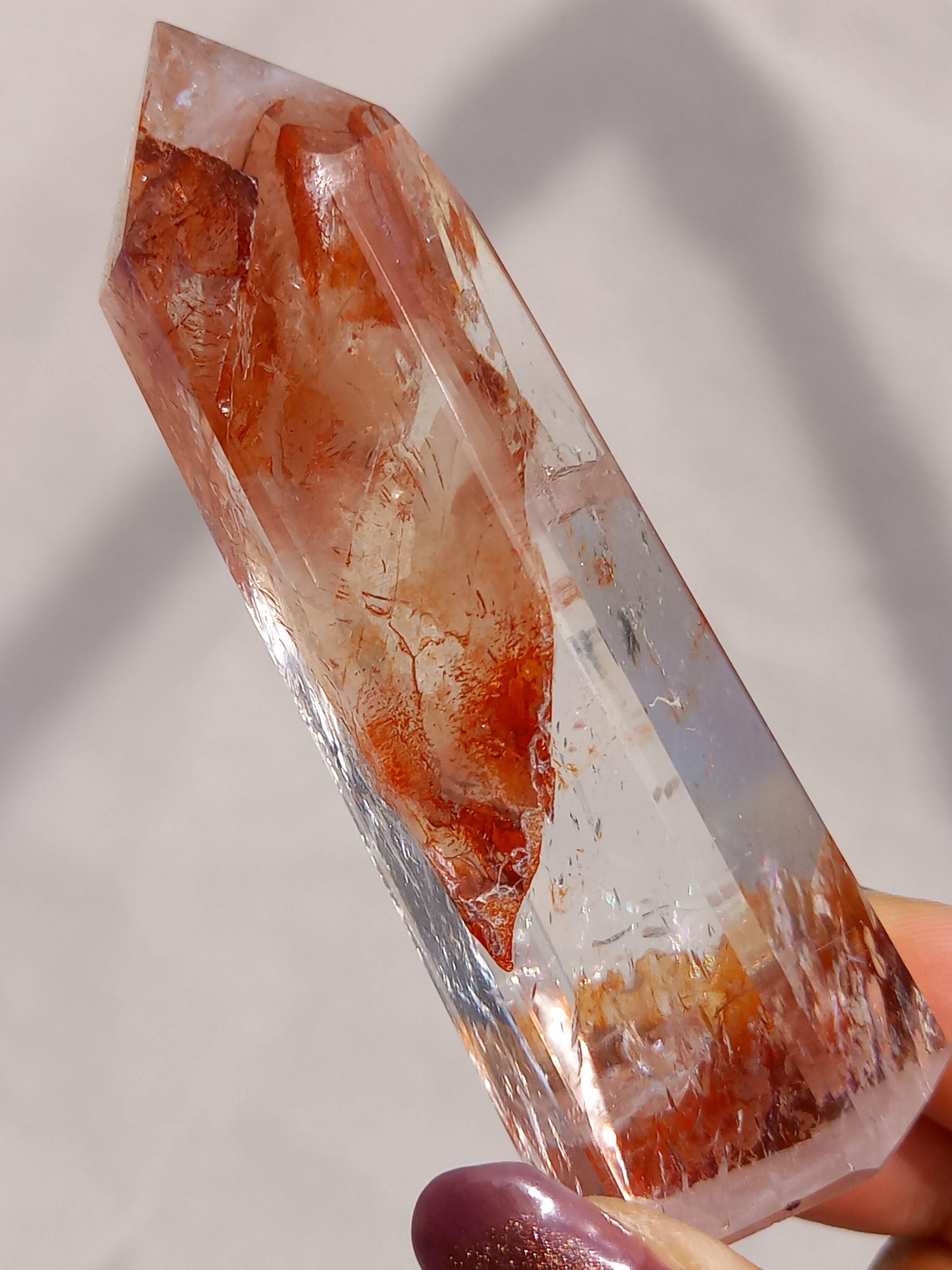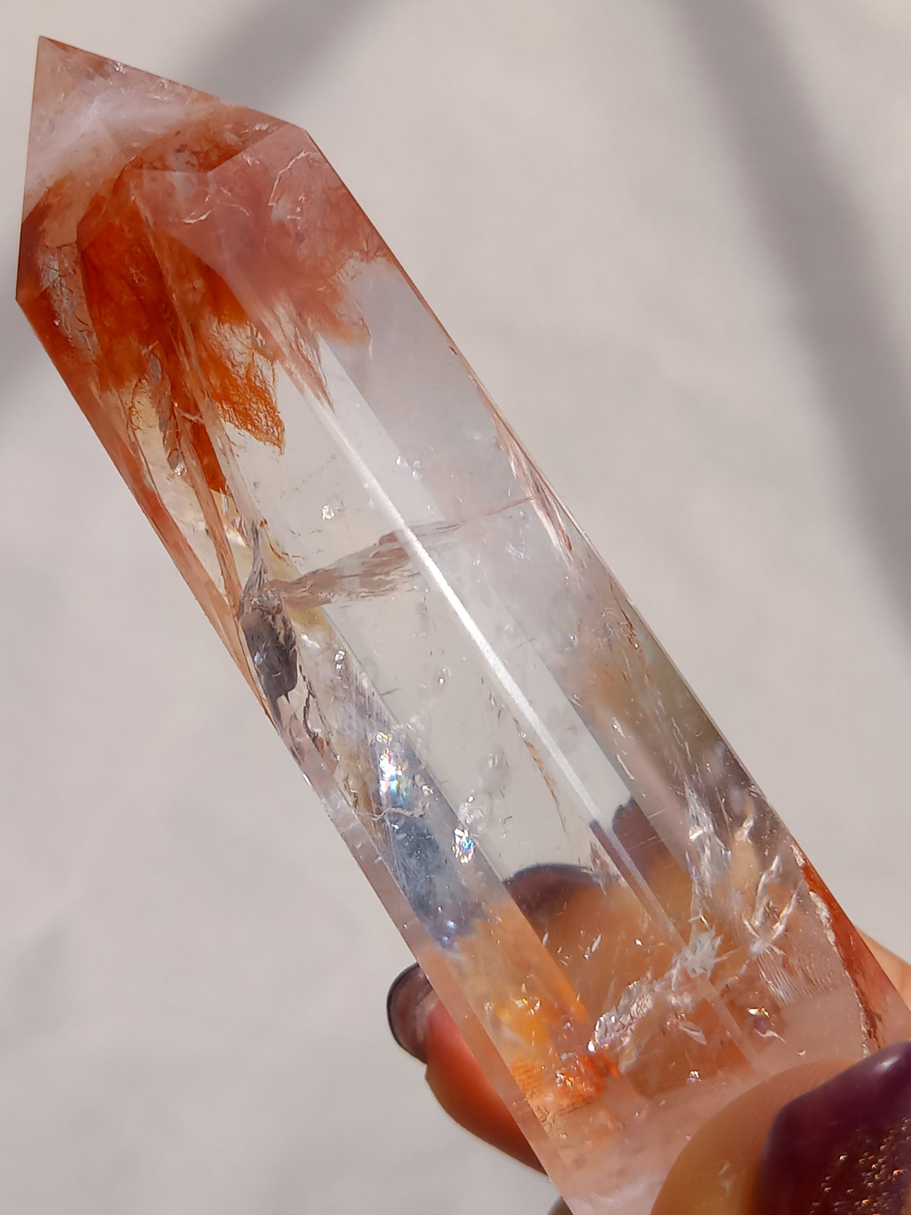 透明感抜群のクォーツ部分と鮮やかなレッドオレンジカラーに、虹が煌めき、とても素敵なポイントタワーです。