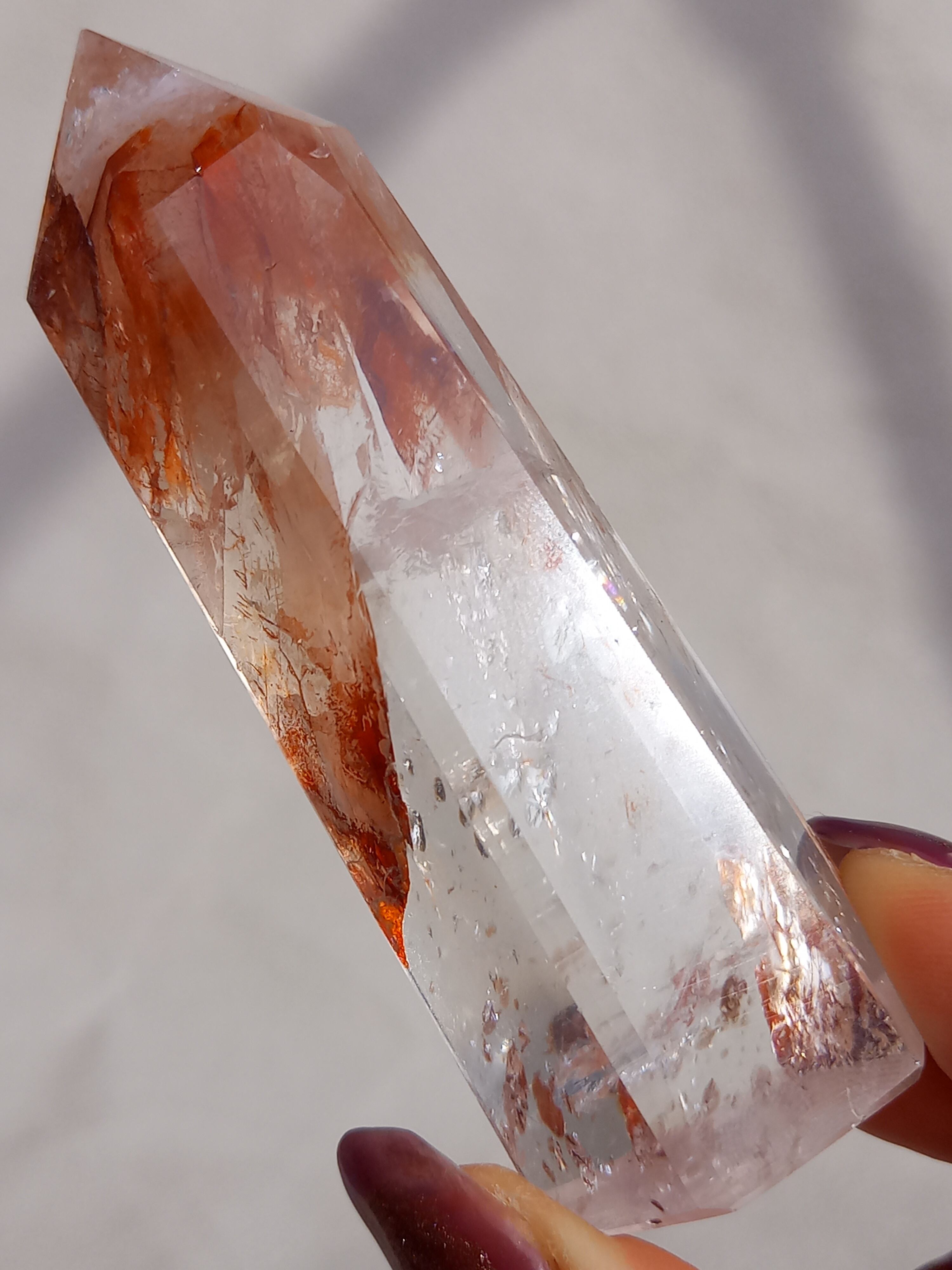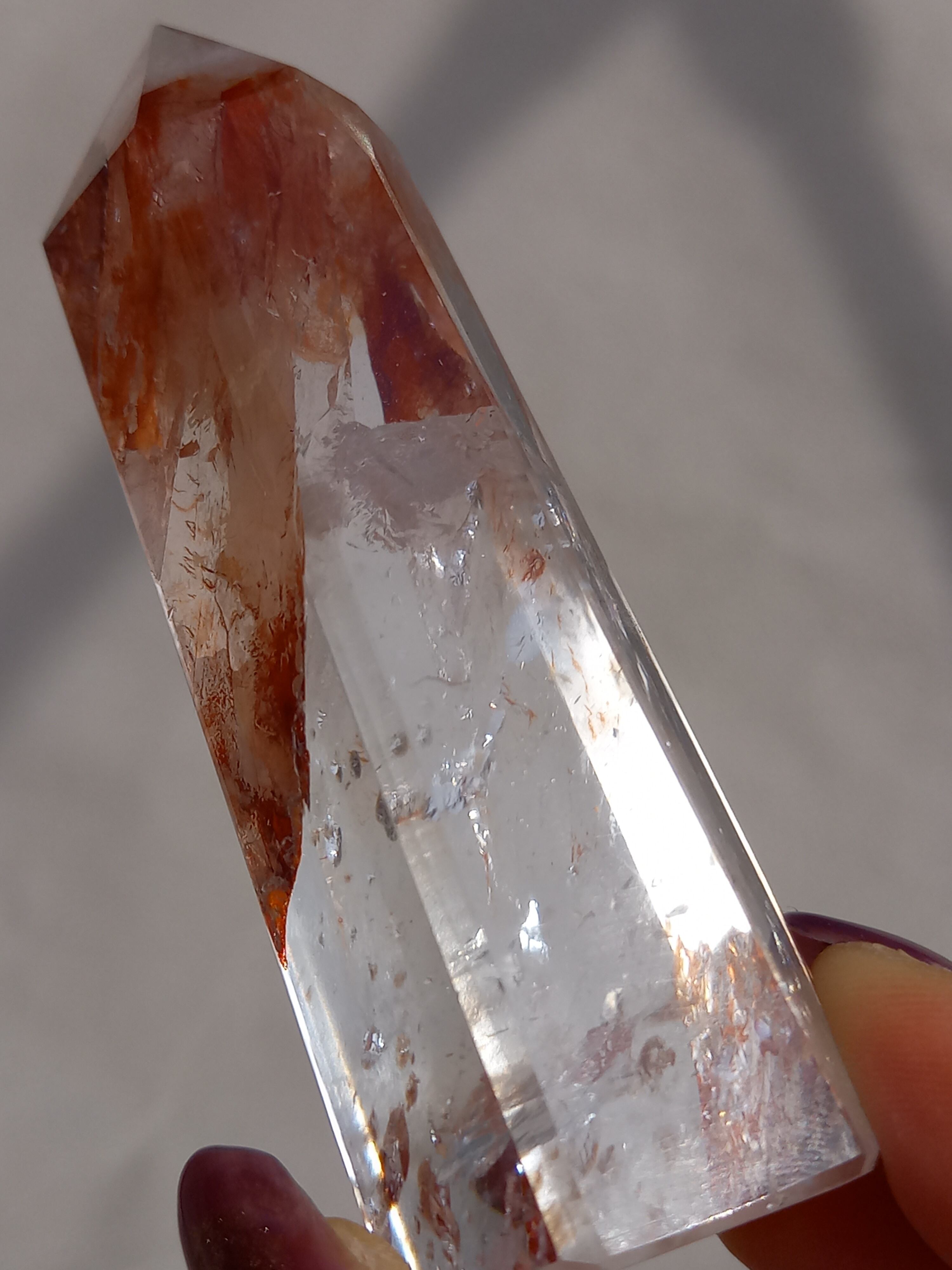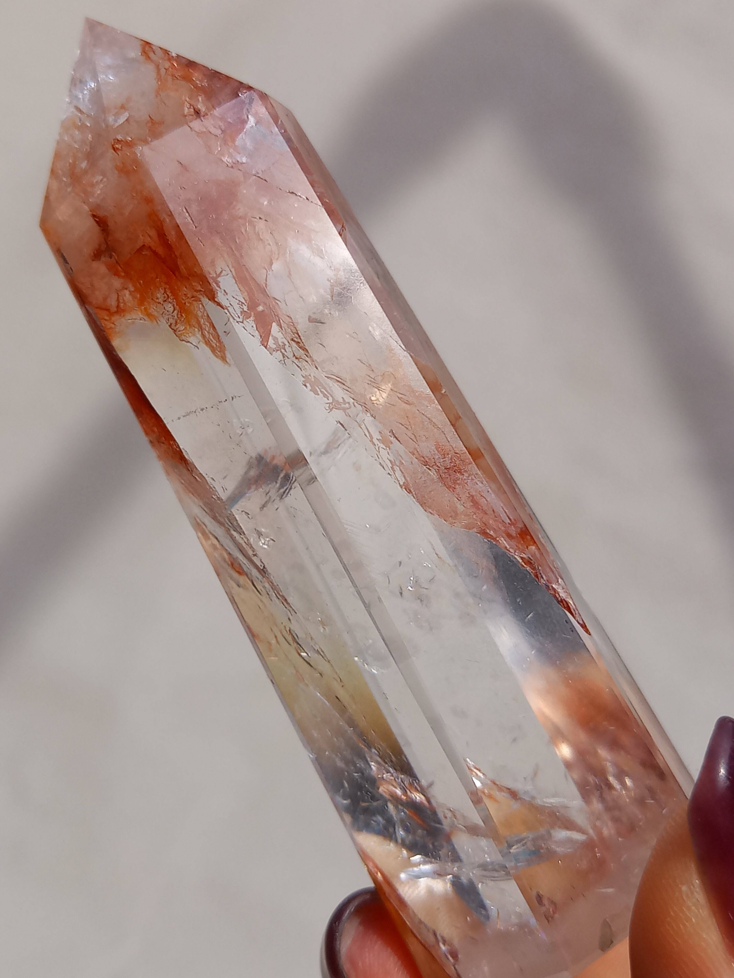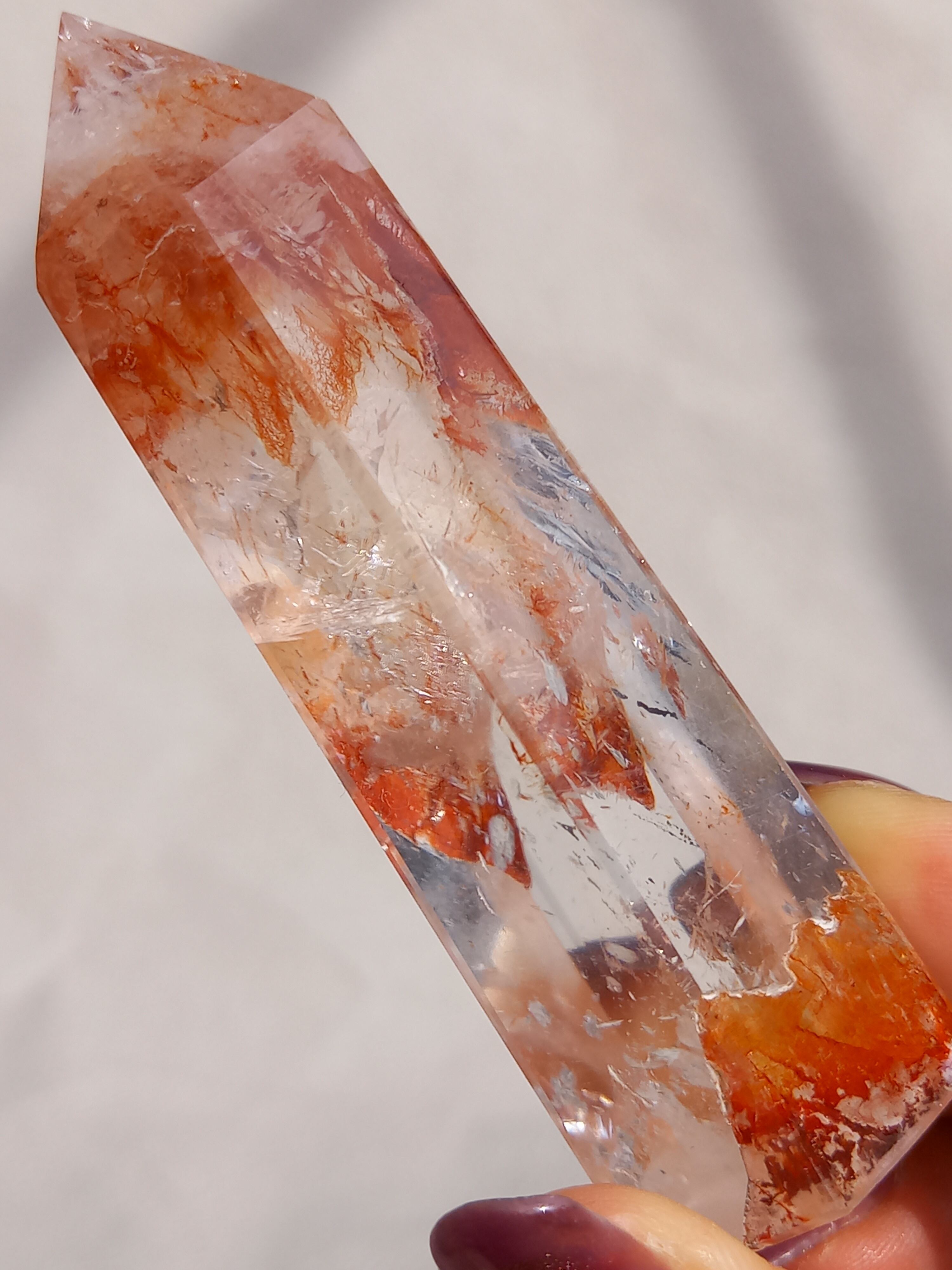透明感抜群のクォーツ部分と鮮やかなレッドオレンジカラーに、虹が煌めき、とても素敵なポイントタワーです。